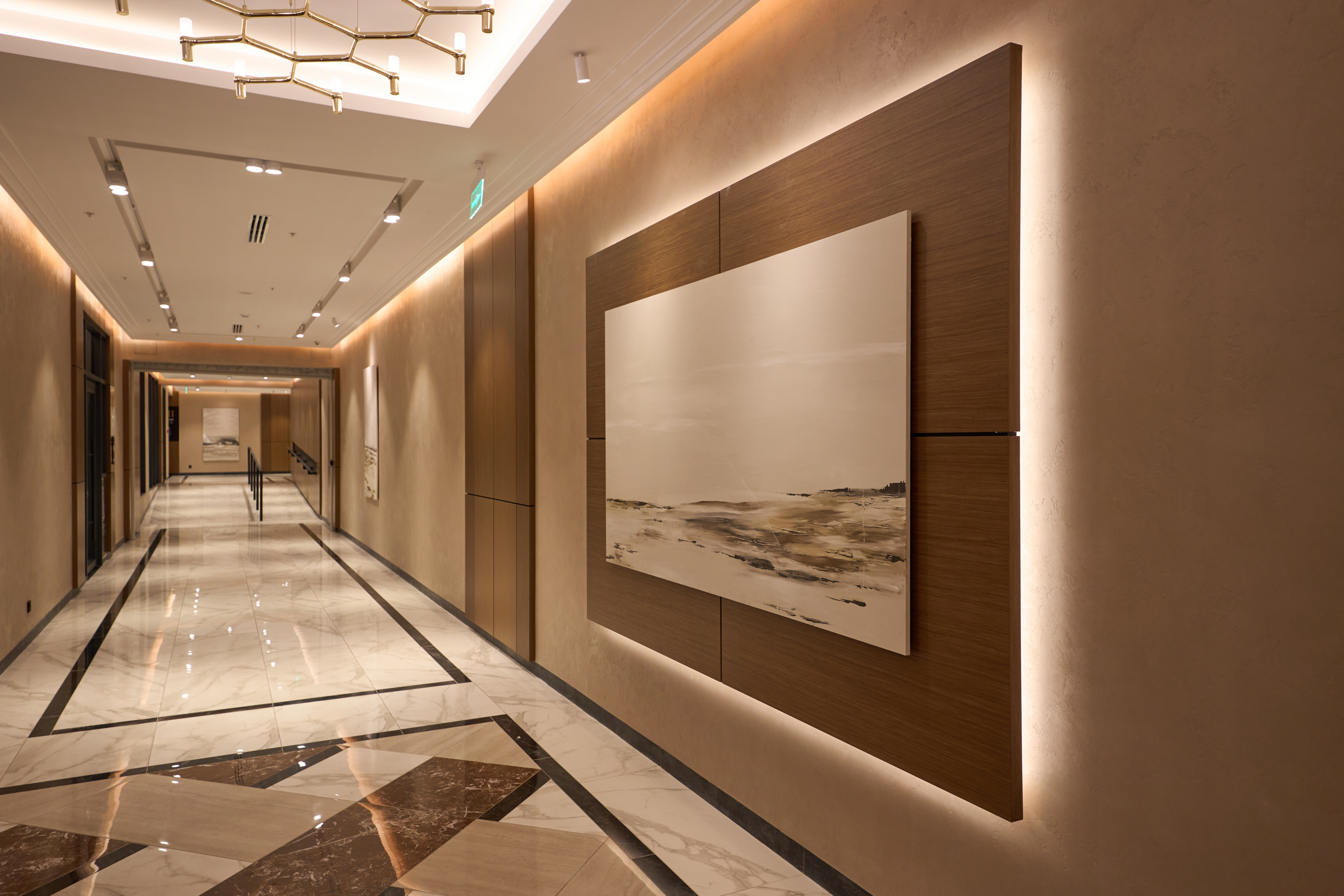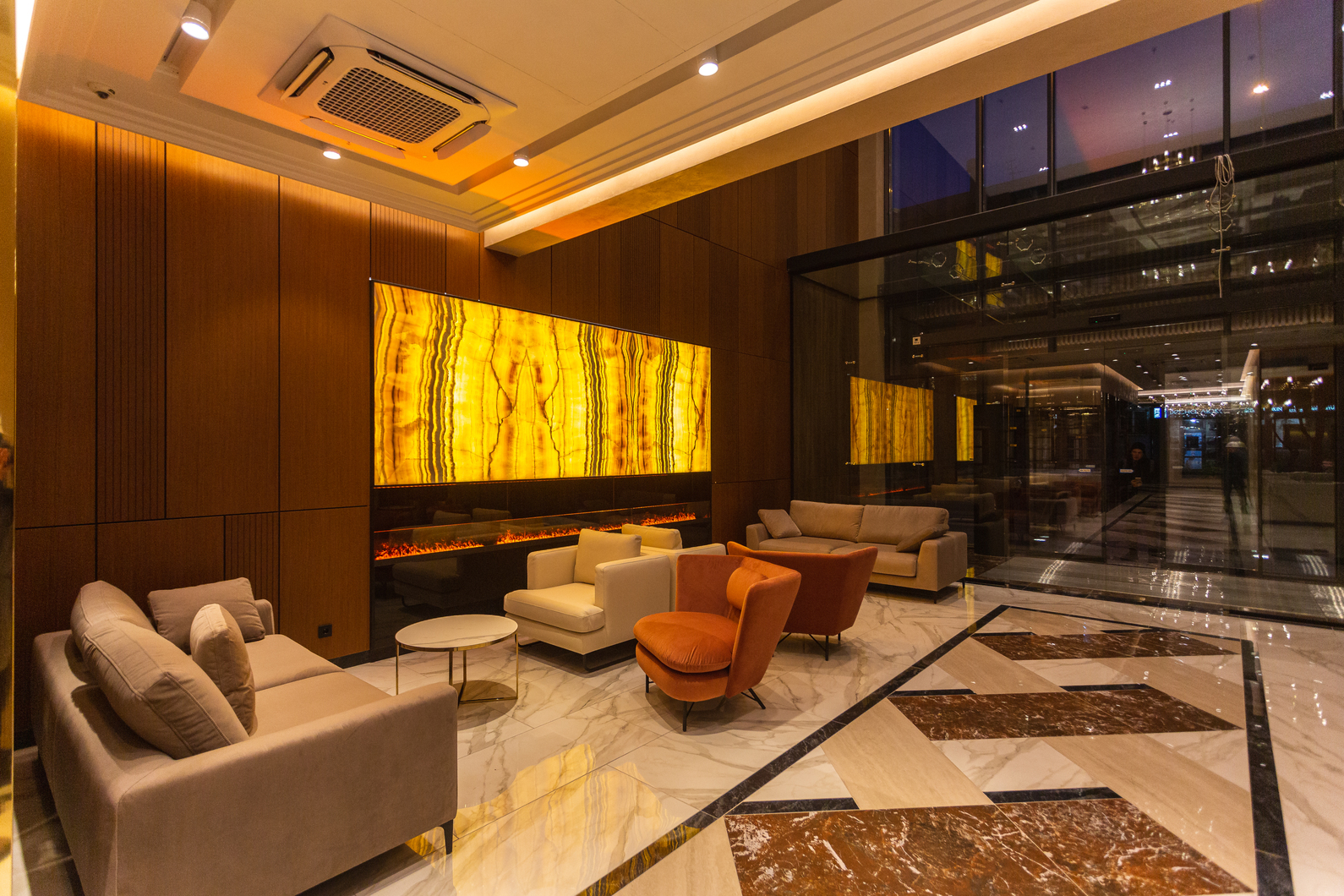 Попасть из торговой галереи в жилые секции можно через лобби. Здесь расположены зоны ожидания, стойка администратора, ящики для посылок и доставки.
