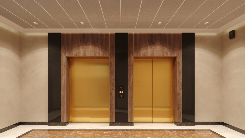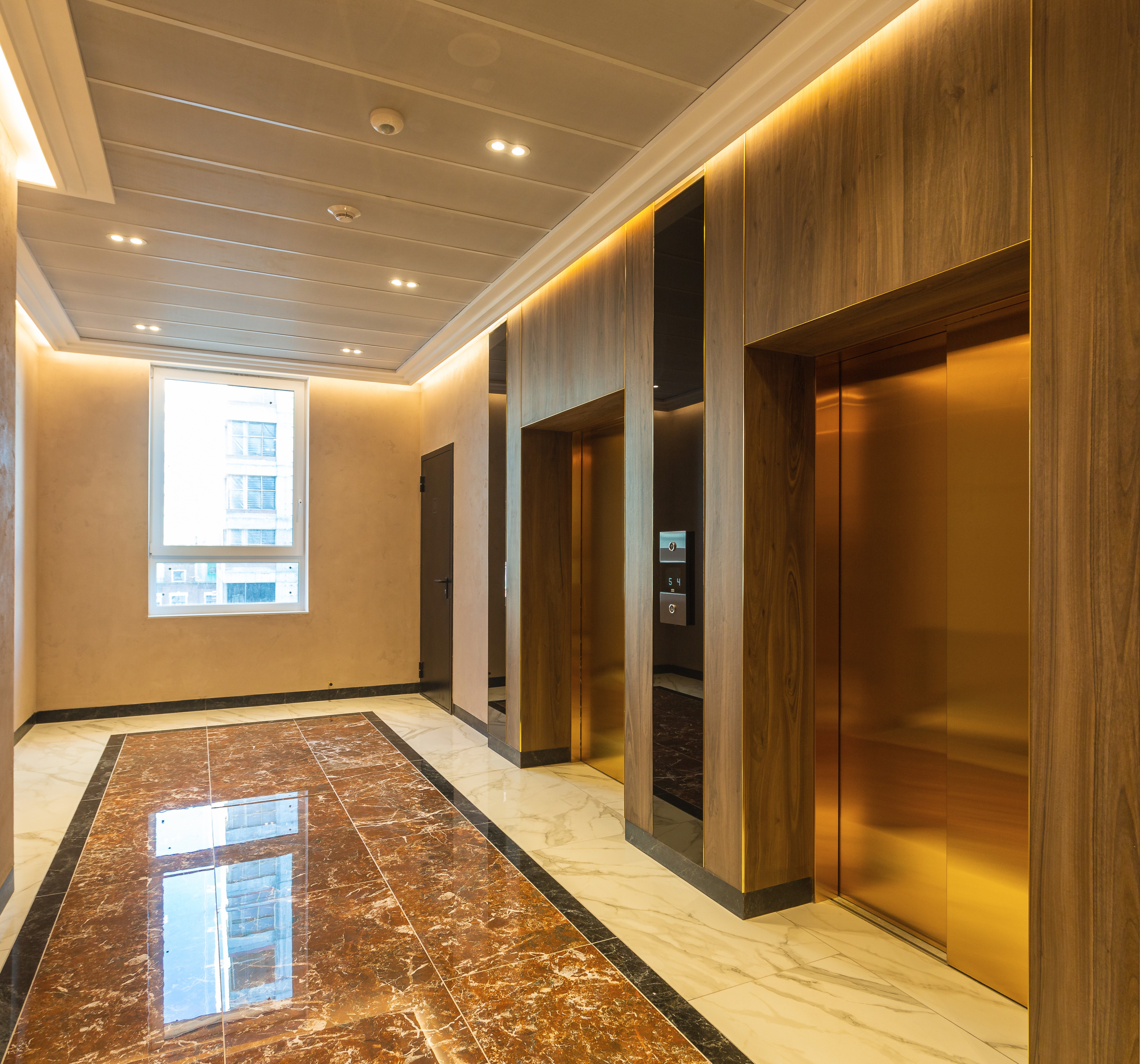 Кабины лифтов сделаны из нержавеющей шлифованной стали цвета бронзы, одна из стен — зеркало на всю длину и ширину кабины. В грузопассажирских лифтах расположены две панели с кнопками этажей с разных сторон кабины.
