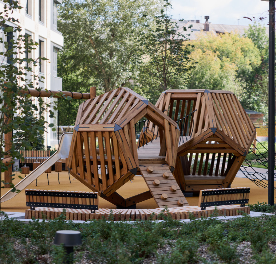 Во дворе мы сделали детские и спортивные площадки, лаунж-зоны для отдыха взрослых, разбили клумбы, посадили деревья и кустарники. Заказали и установили уличную мебель, детские горки, игровые комплексы и качели. Все элементы сделаны из дерева, так как оно экологичнее пластика и устойчиво к морозам.