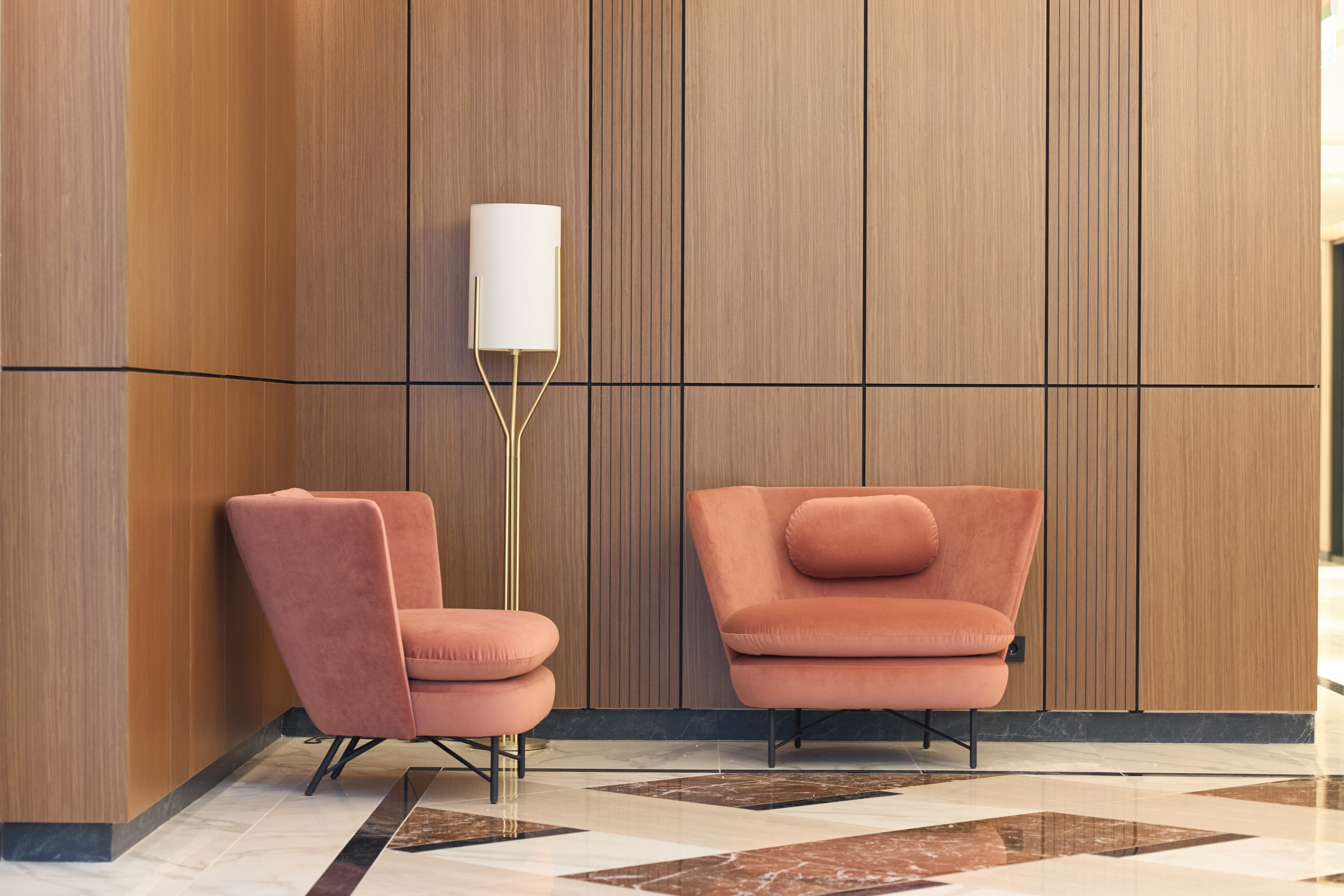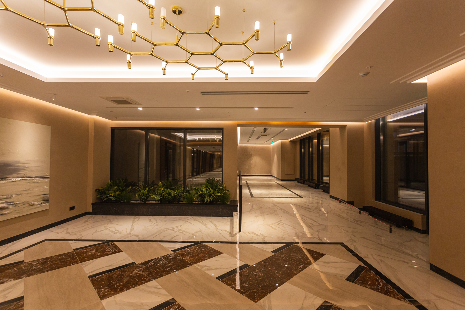 Попасть из торговой галереи в жилые секции можно через лобби. Здесь расположены зоны ожидания, стойка администратора, ящики для посылок и доставки.