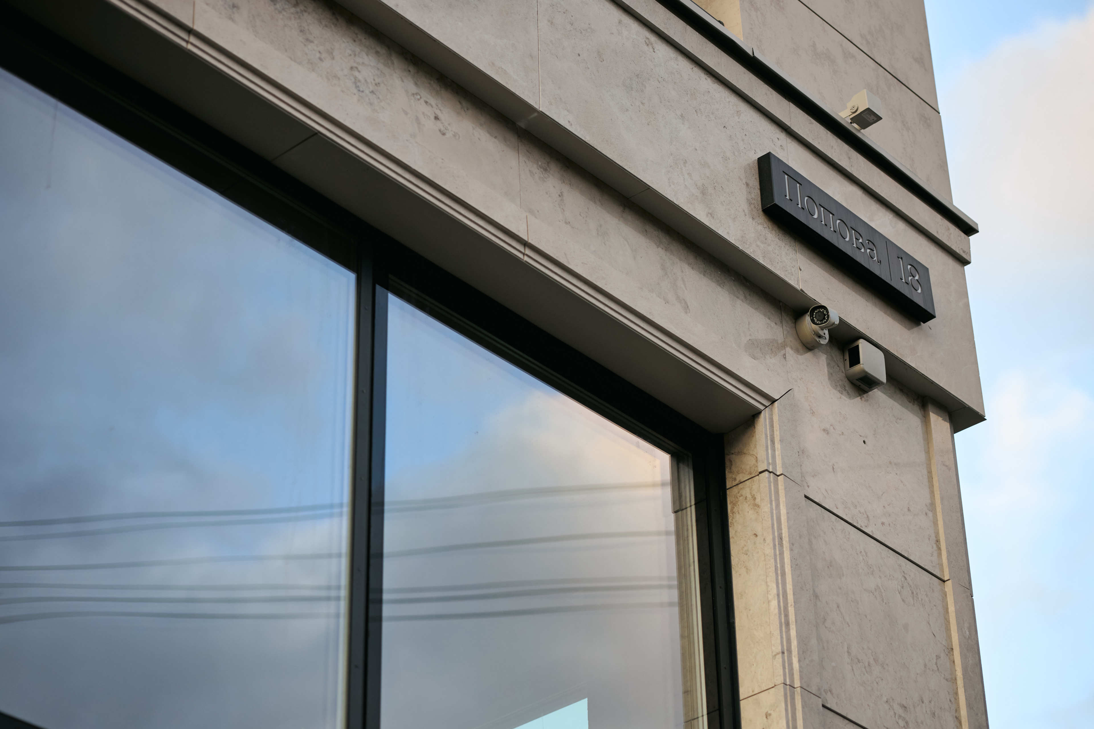 Отделку здания мы выполнили с использованием технологий вентилируемого фасада. Это комбинированная облицовка натуральным камнем и композитными панелями. Вентфасад делает здание более устойчивым к выгоранию от солнца и воздействиям ветра, дождя, снега. Благодаря этому дом всегда будет выглядеть как новый. Большие витражи между пилястрами на первом этаже создают впечатление галереи-колоннады.