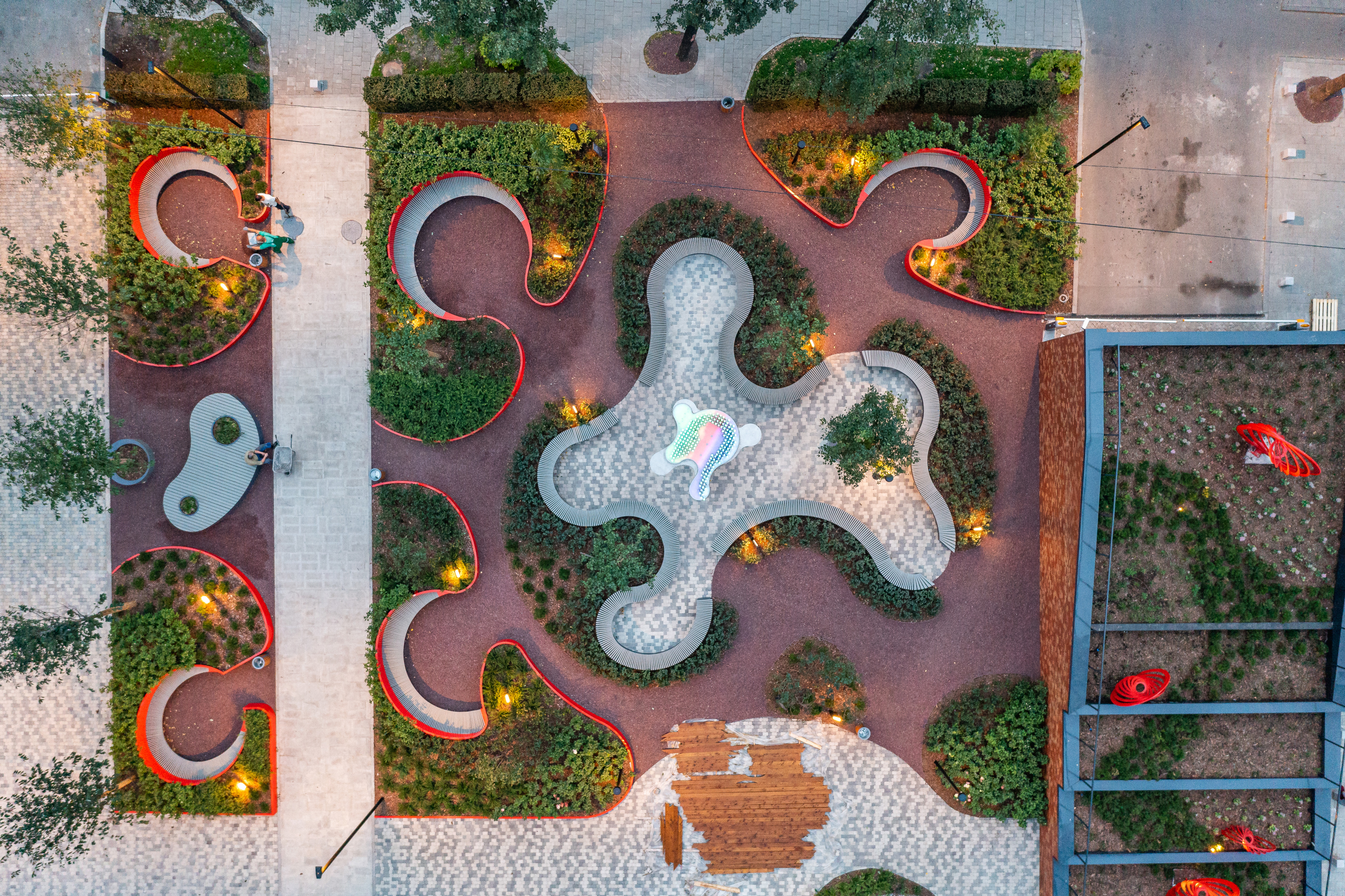 Детские площадки и места отдыха делаем из хвойных пород дерева и металла — они экологичнее пластика, надёжнее и долговечнее. Покрытие из мягкой резиновой крошки на игровых площадках убережёт от травм во время активностей.