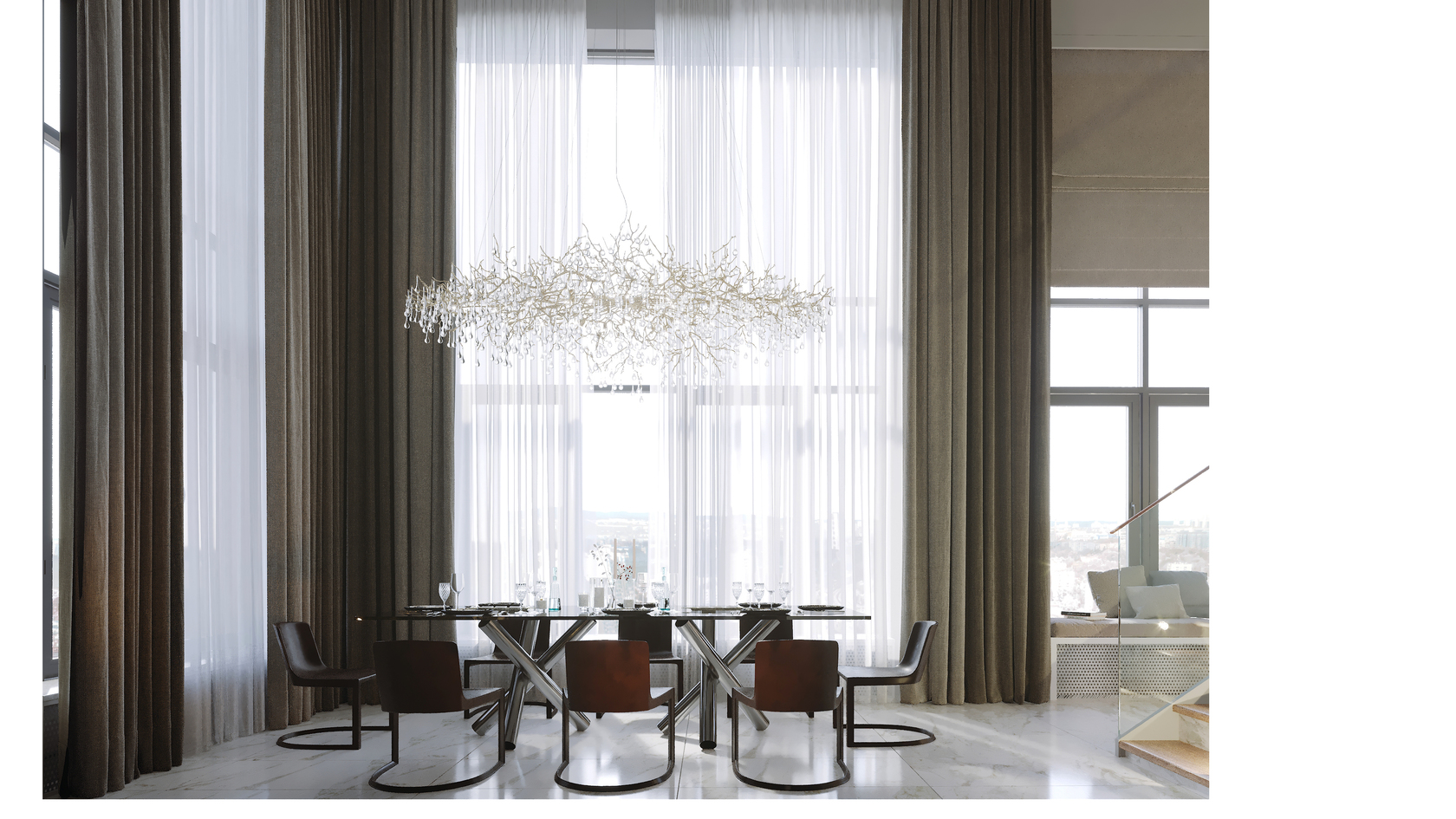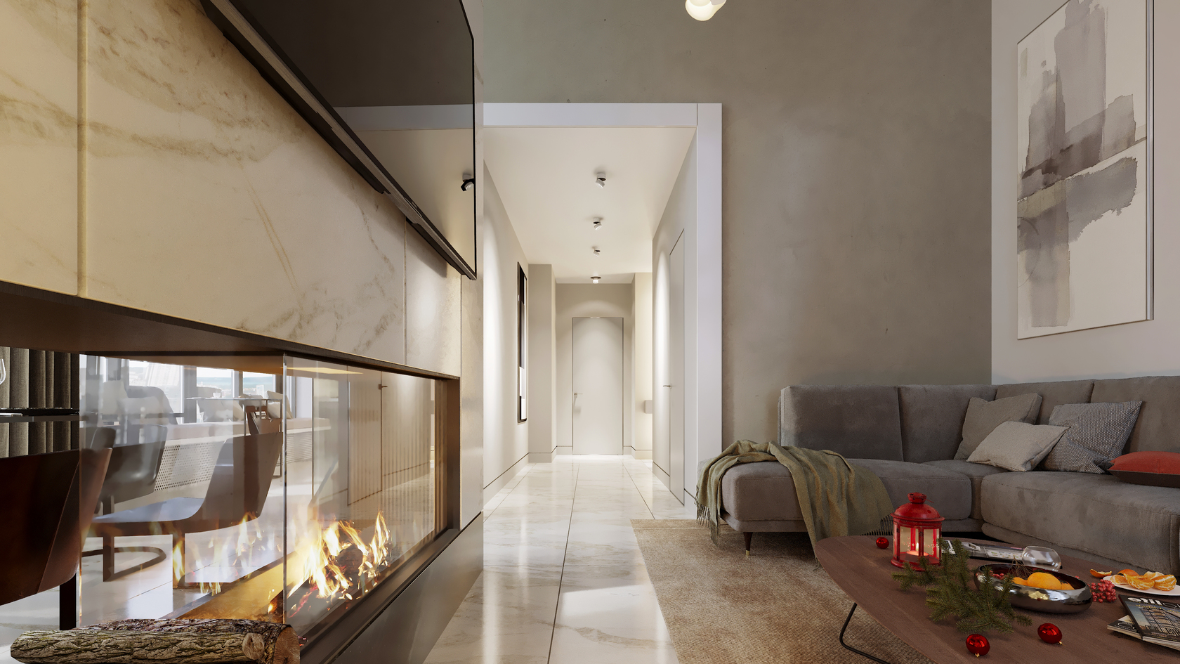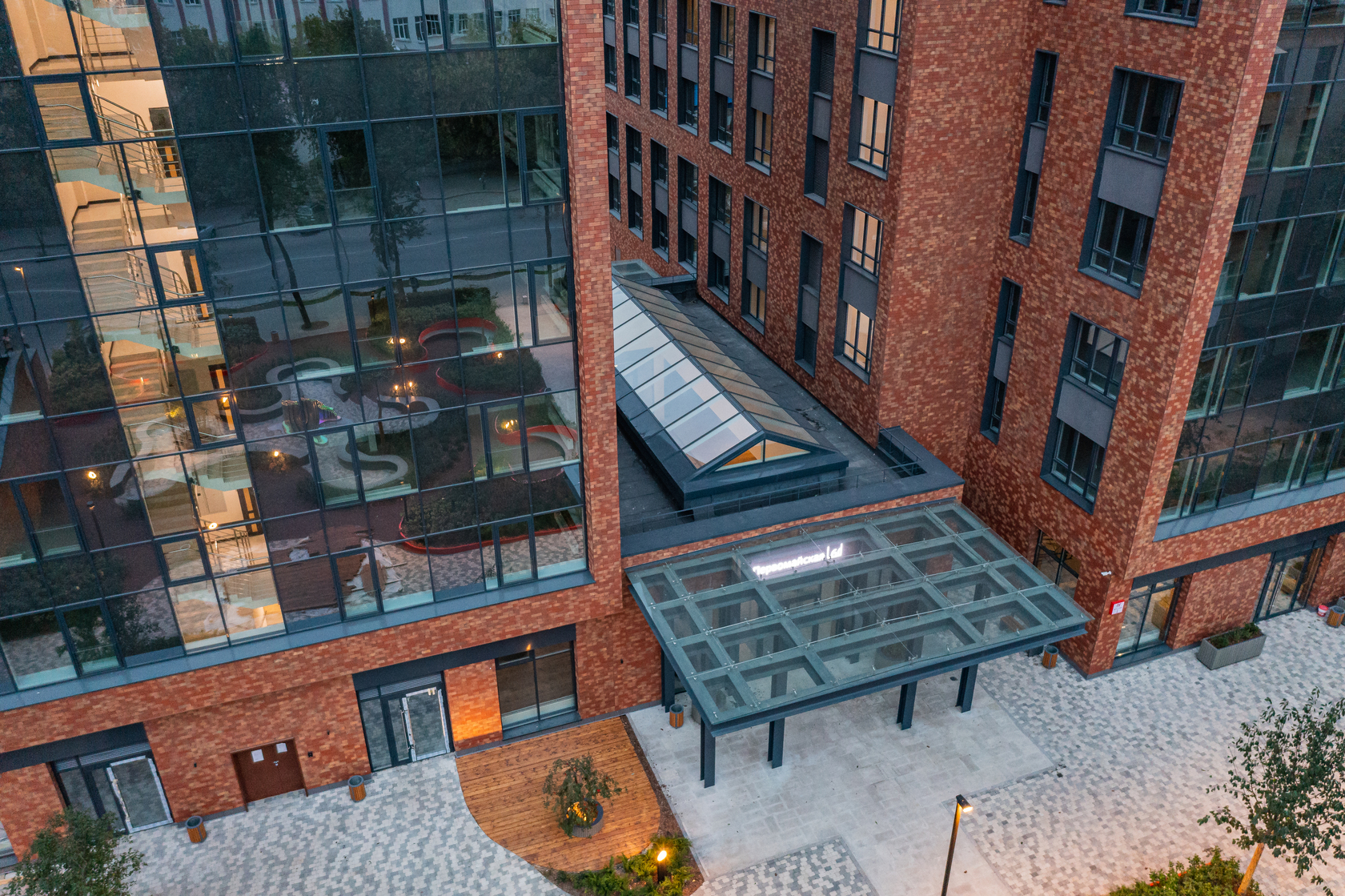 Высота потолка в холле — 4,5 м. На входе смонтирован панорамный витраж, а в потолке — световой фонарь. Днём лобби наполнено естественным светом, а вечером мягкое освещение создаст камерную атмосферу.