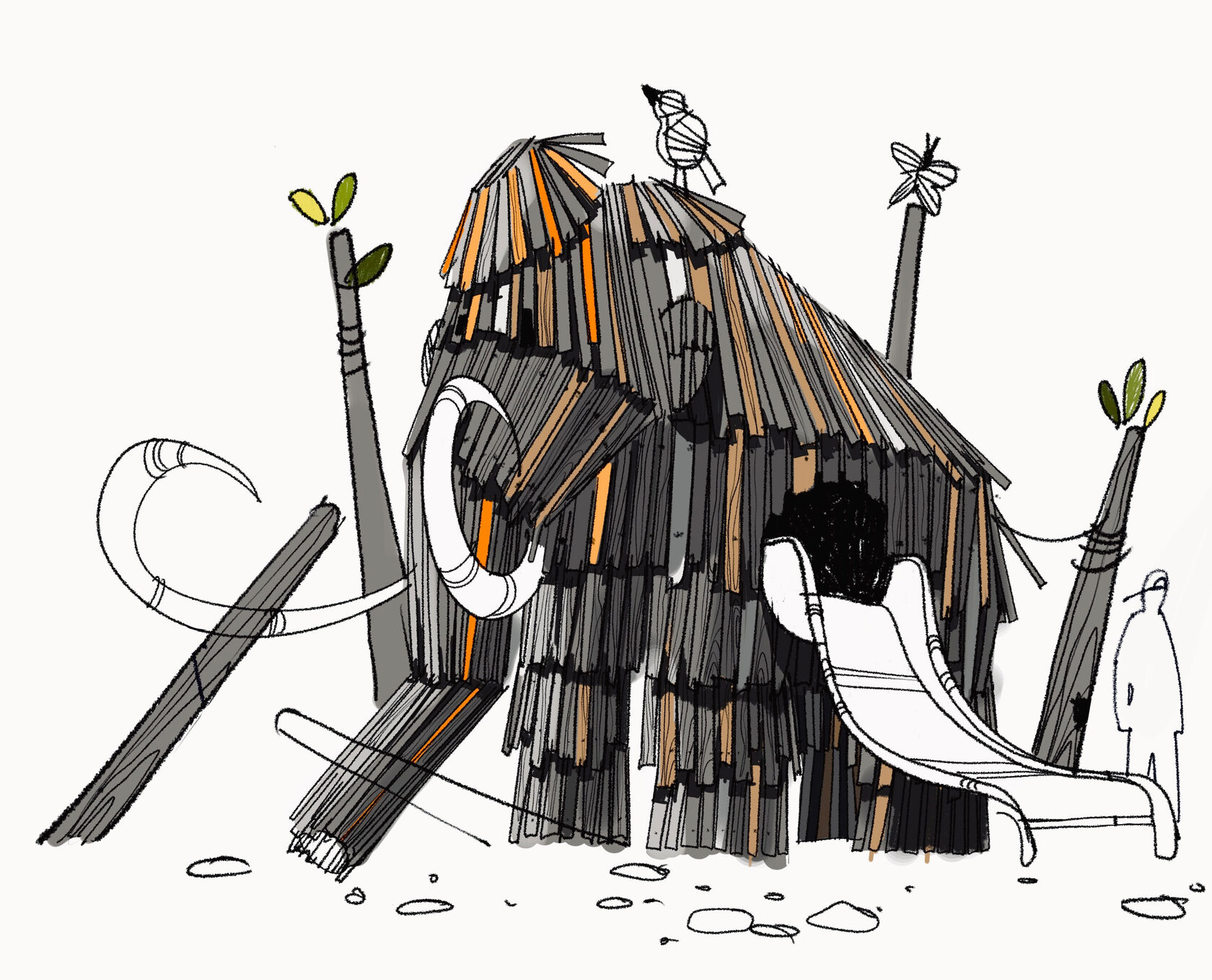 Акцентом двора станет огромная фигура мамонта — это детский игровой комплекс с лазалками и горками. В большой песочнице можно поиграть в палеонтолога и раскопать скелет доисторического животного, обитавшего когда-то на Урале.