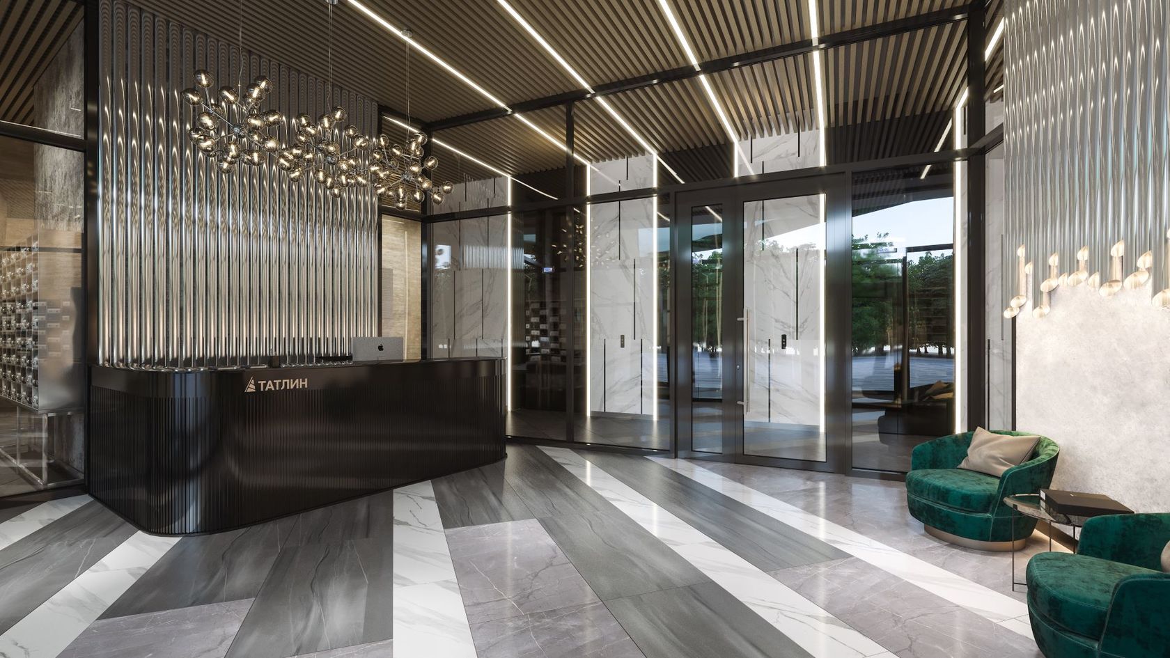 Холл на входе наполнен естественным светом. Здесь работает администратор — сотрудник управляющей компании, который встречает гостей и жителей дома, следит за порядком и помогает в решении бытовых вопросов.