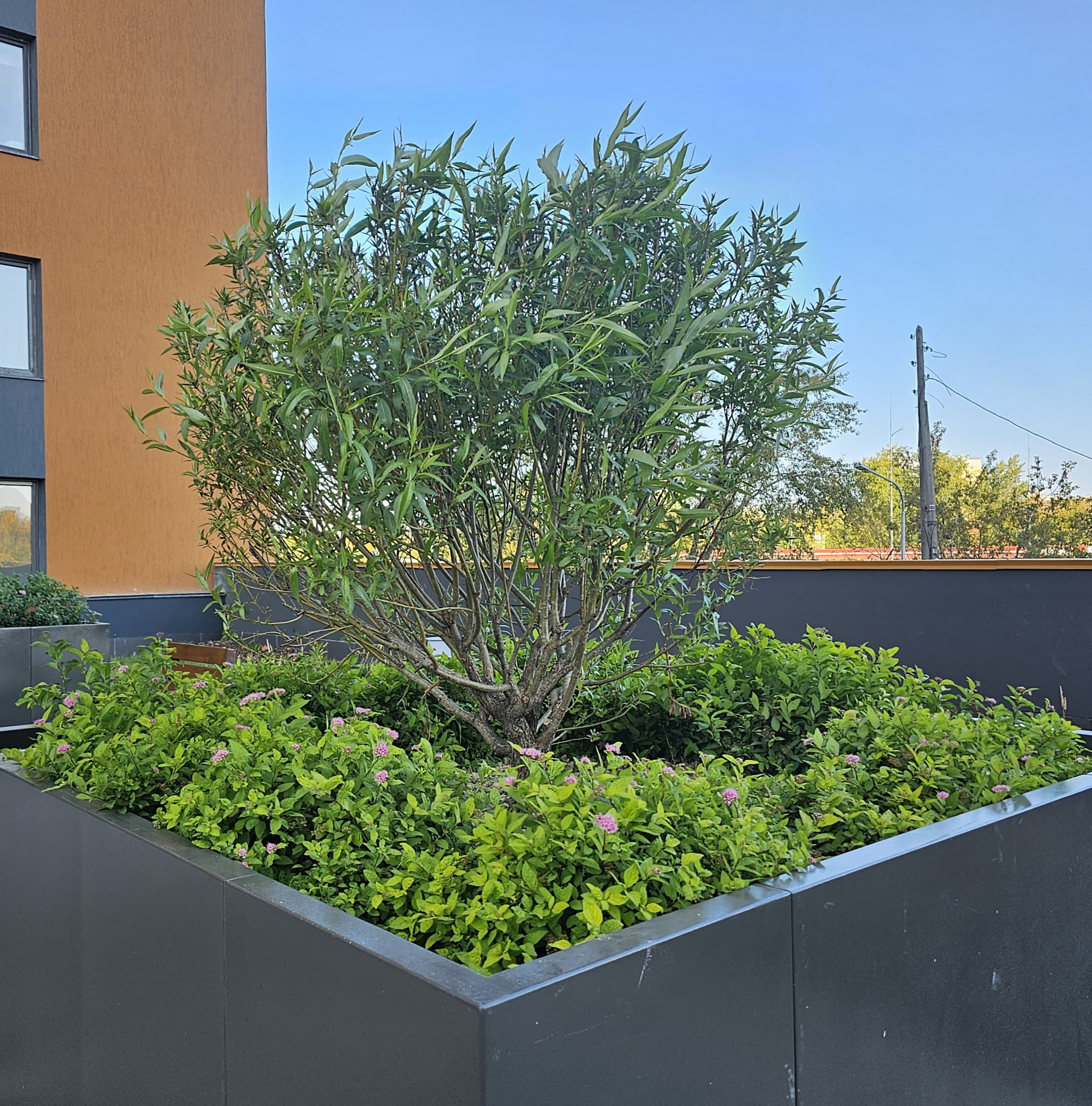 Во дворе высажены деревья, хвойные и лиственные кустарники, травы и злаки