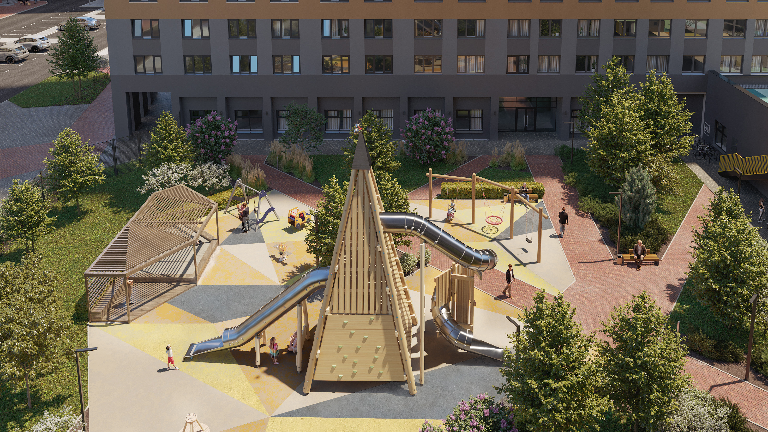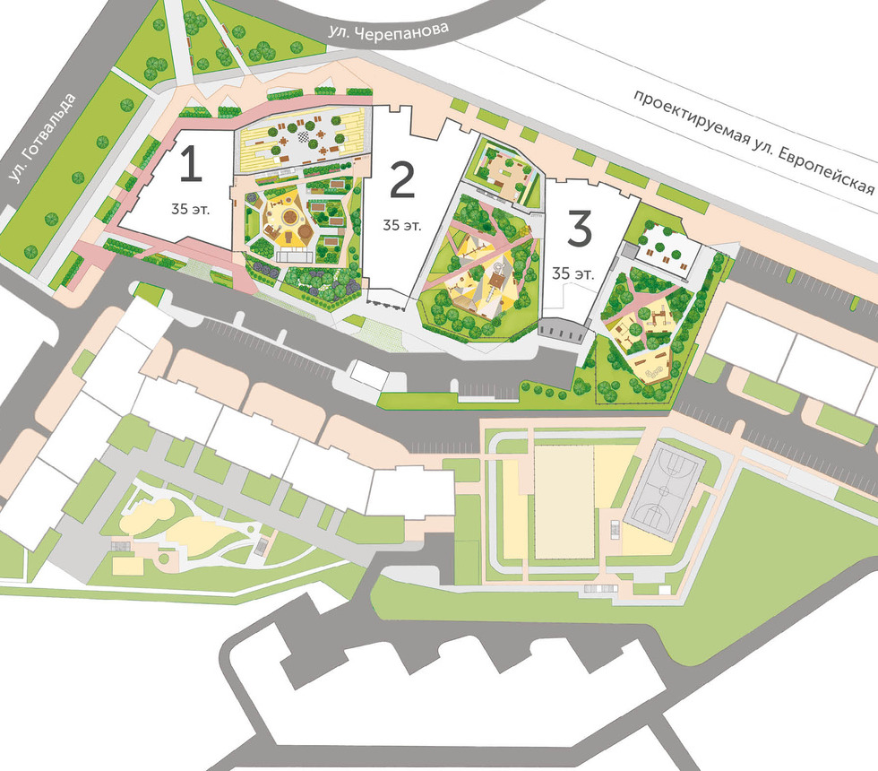 В квартале три двора для жителей — они расположены между башнями