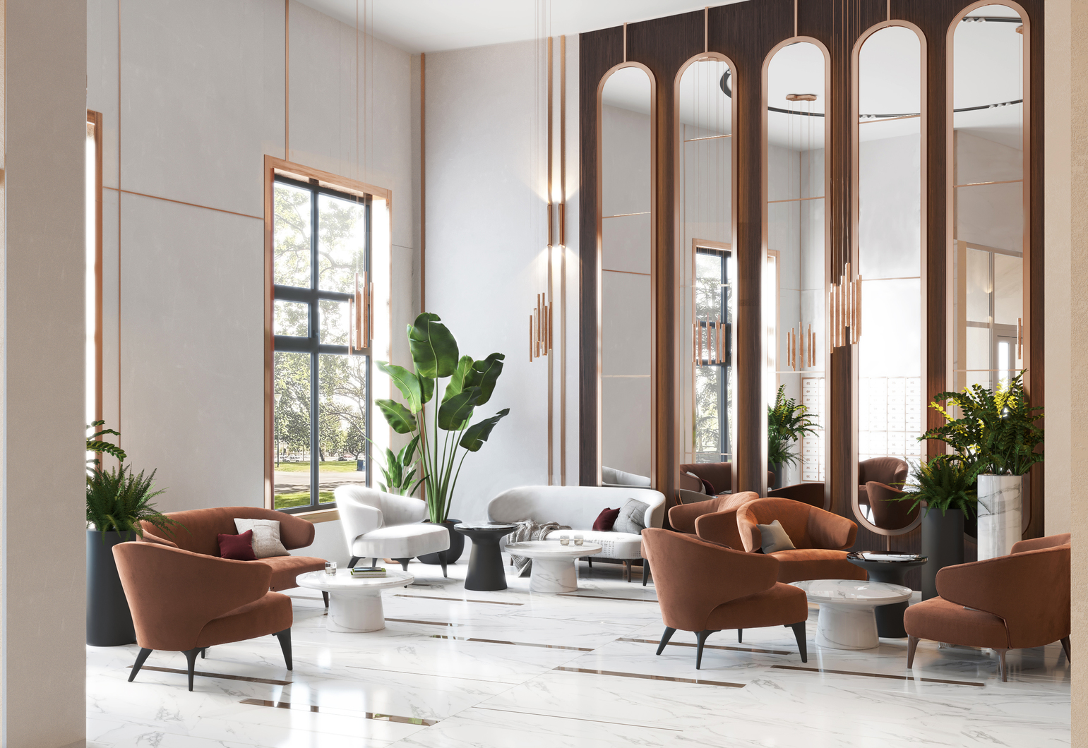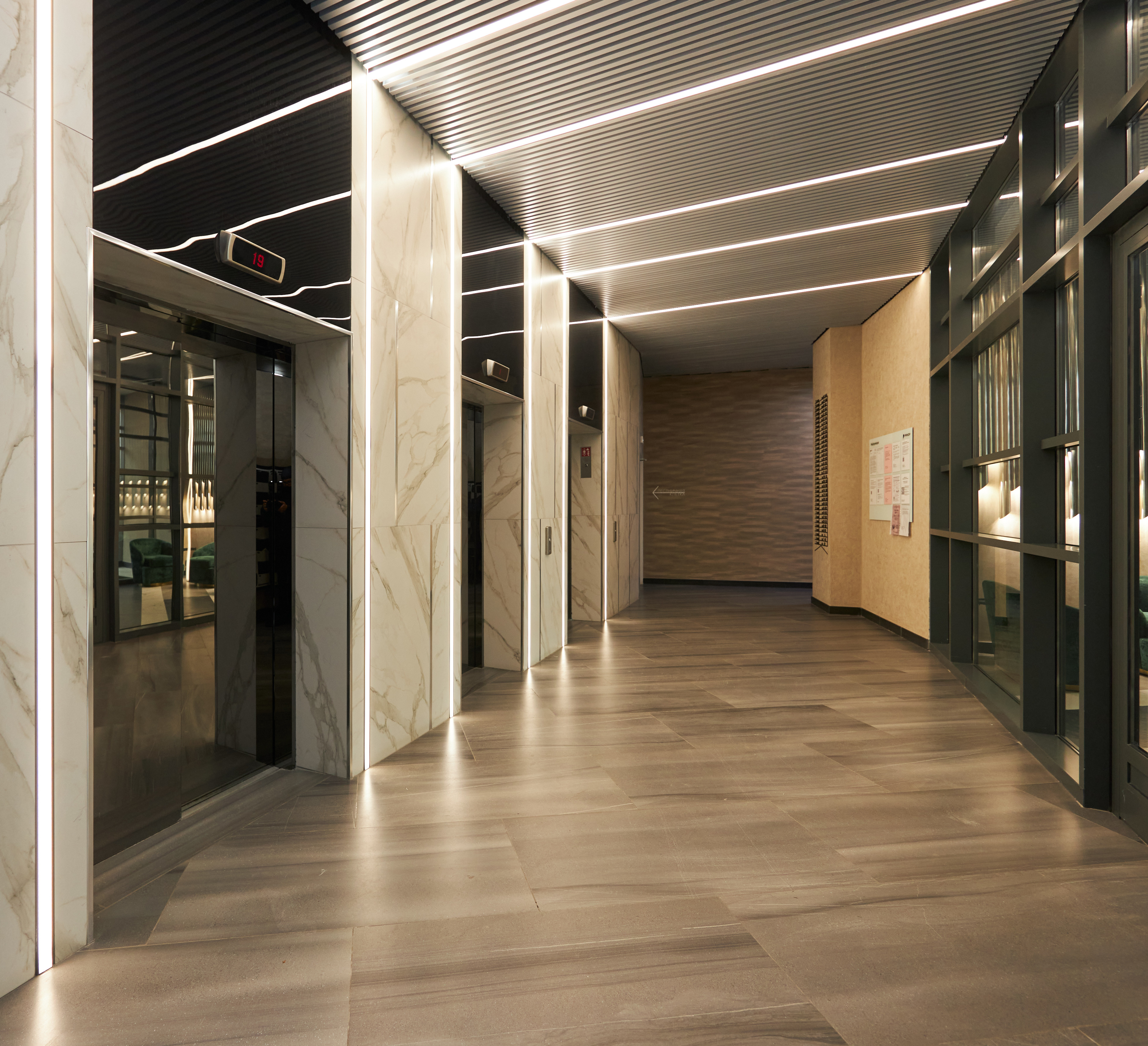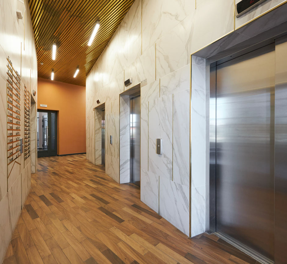 Холл на входе наполнен естественным светом. Здесь работает администратор — сотрудник управляющей компании, который встречает гостей и жителей дома, следит за порядком и помогает в решении бытовых вопросов.