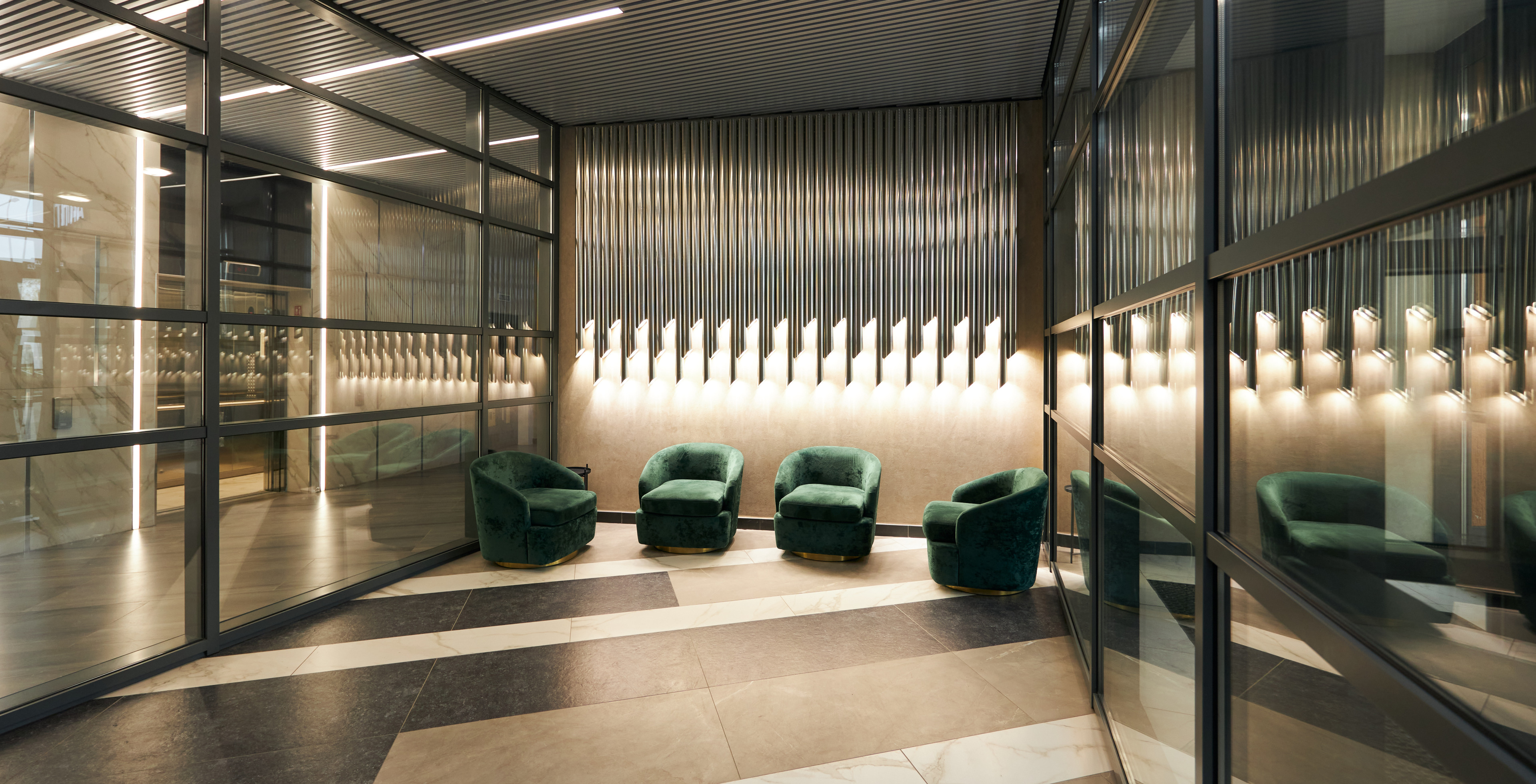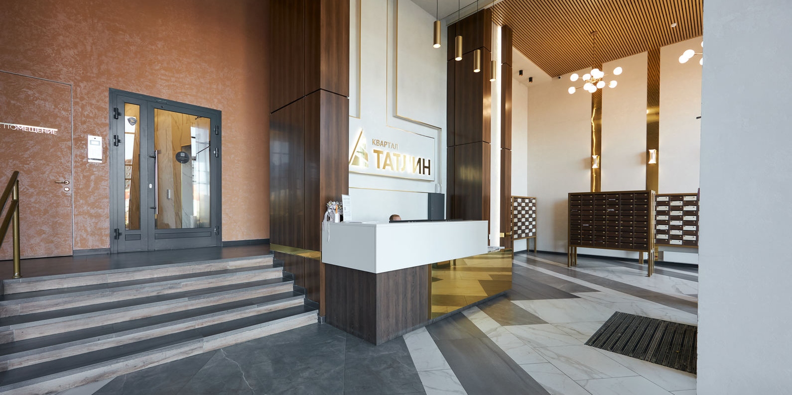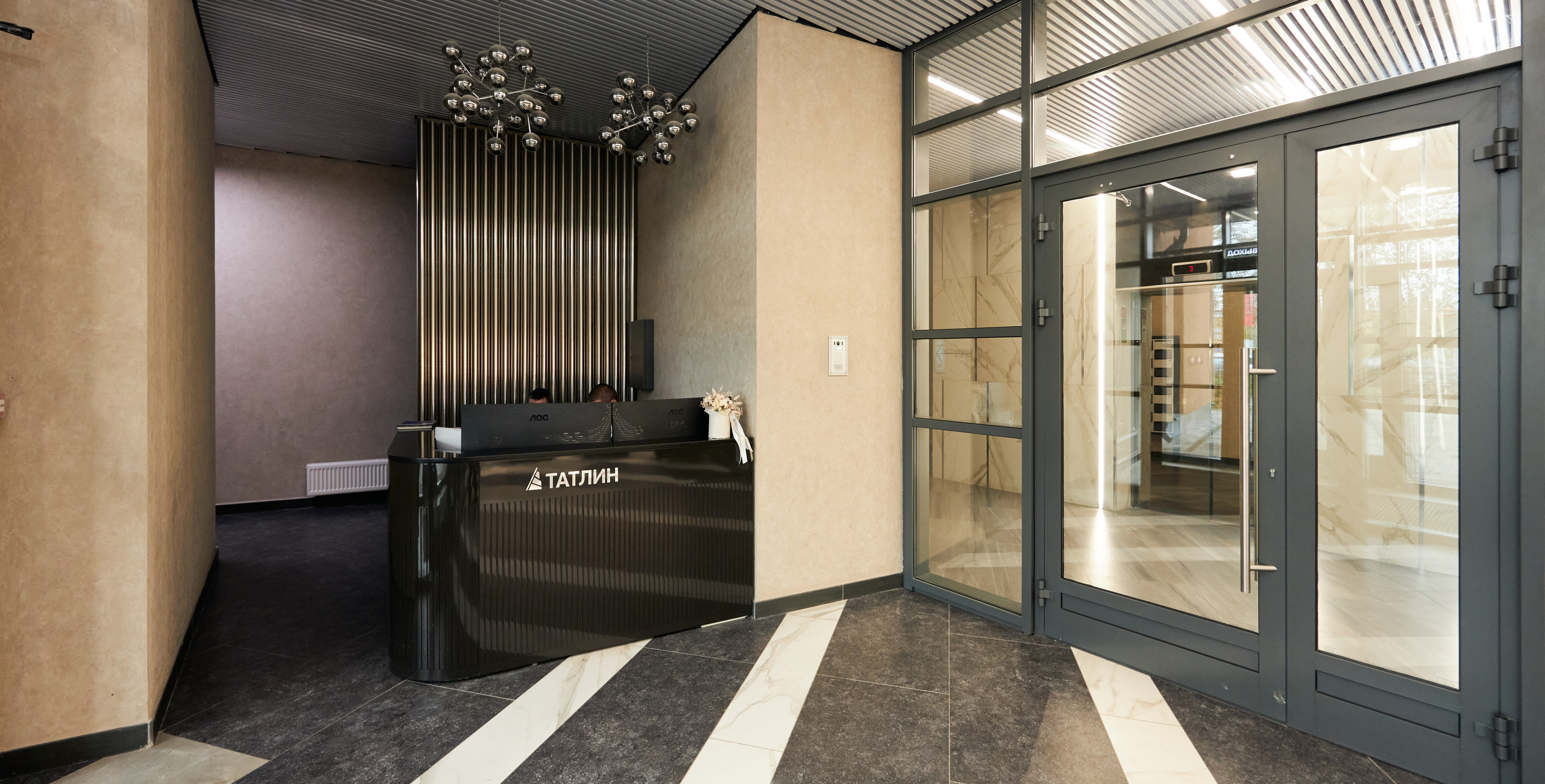 Холл на входе наполнен естественным светом. Здесь работает администратор — сотрудник управляющей компании, который встречает гостей и жителей дома, следит за порядком и помогает в решении бытовых вопросов.