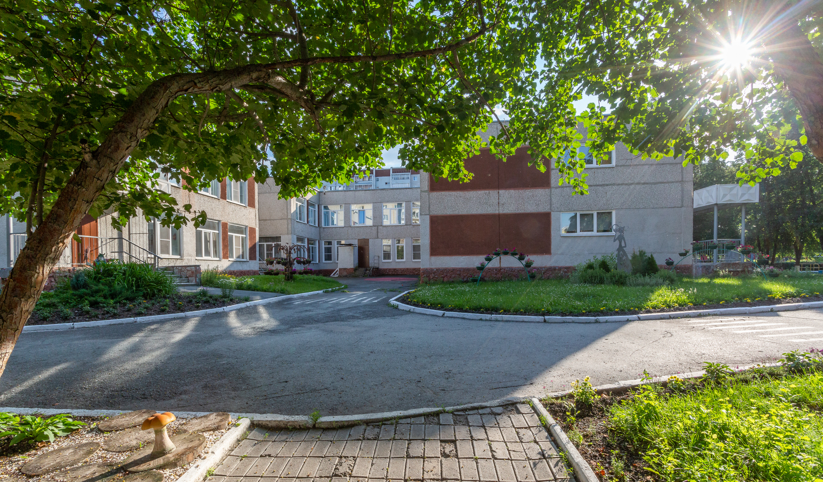Во дворе высажены деревья, хвойные и лиственные кустарники, травы и злаки