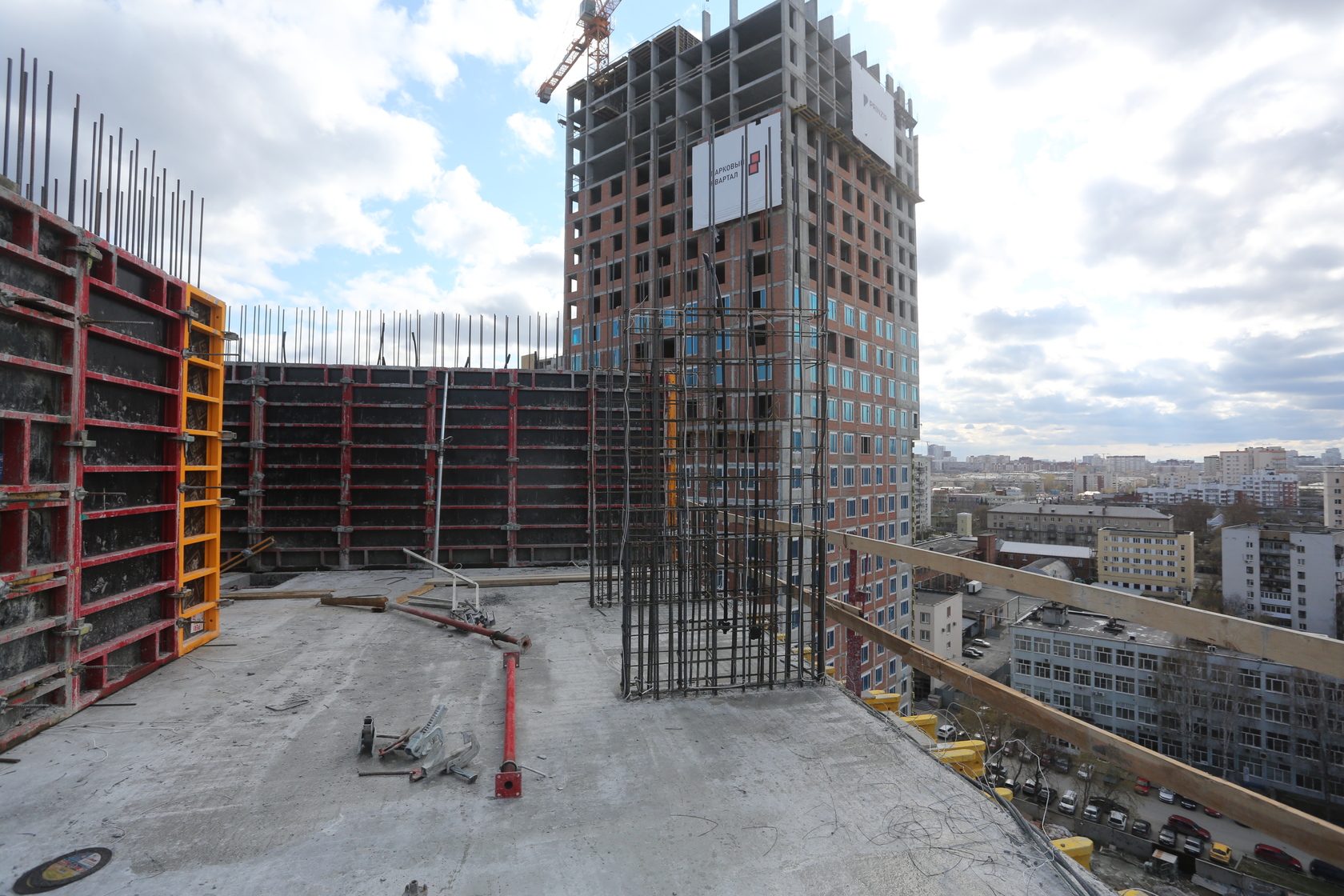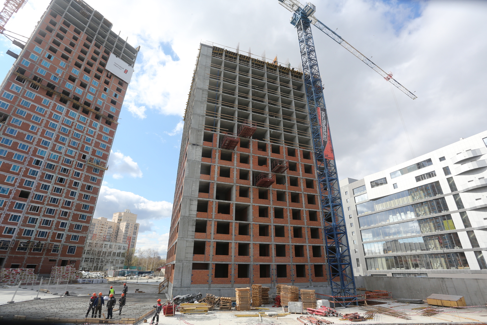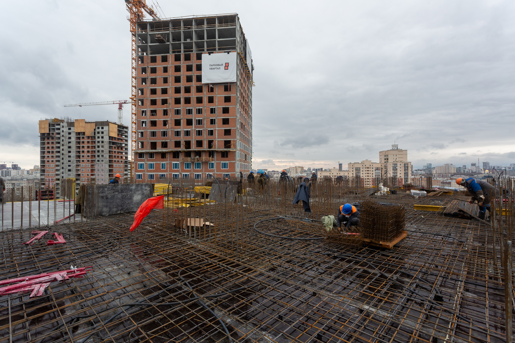 Выполняем кирпичную кладку стен на 11–13 этажах. Возводим монолитные конструкции стен подземной части дома и паркинга.