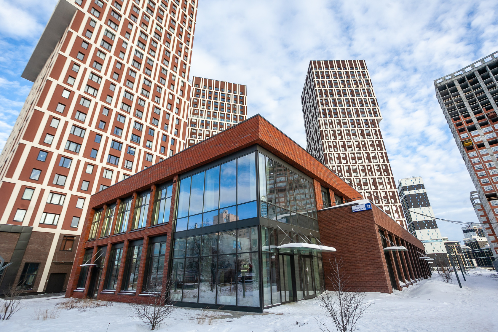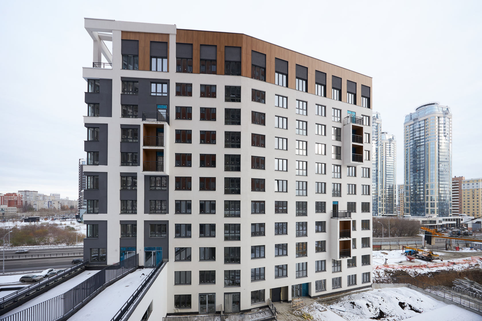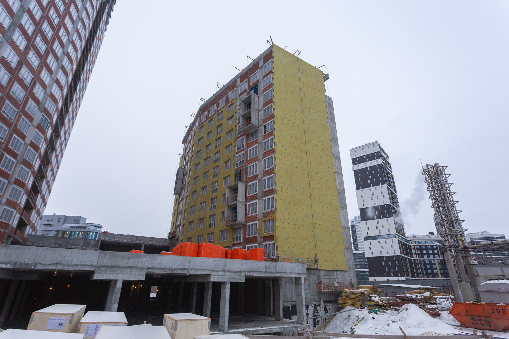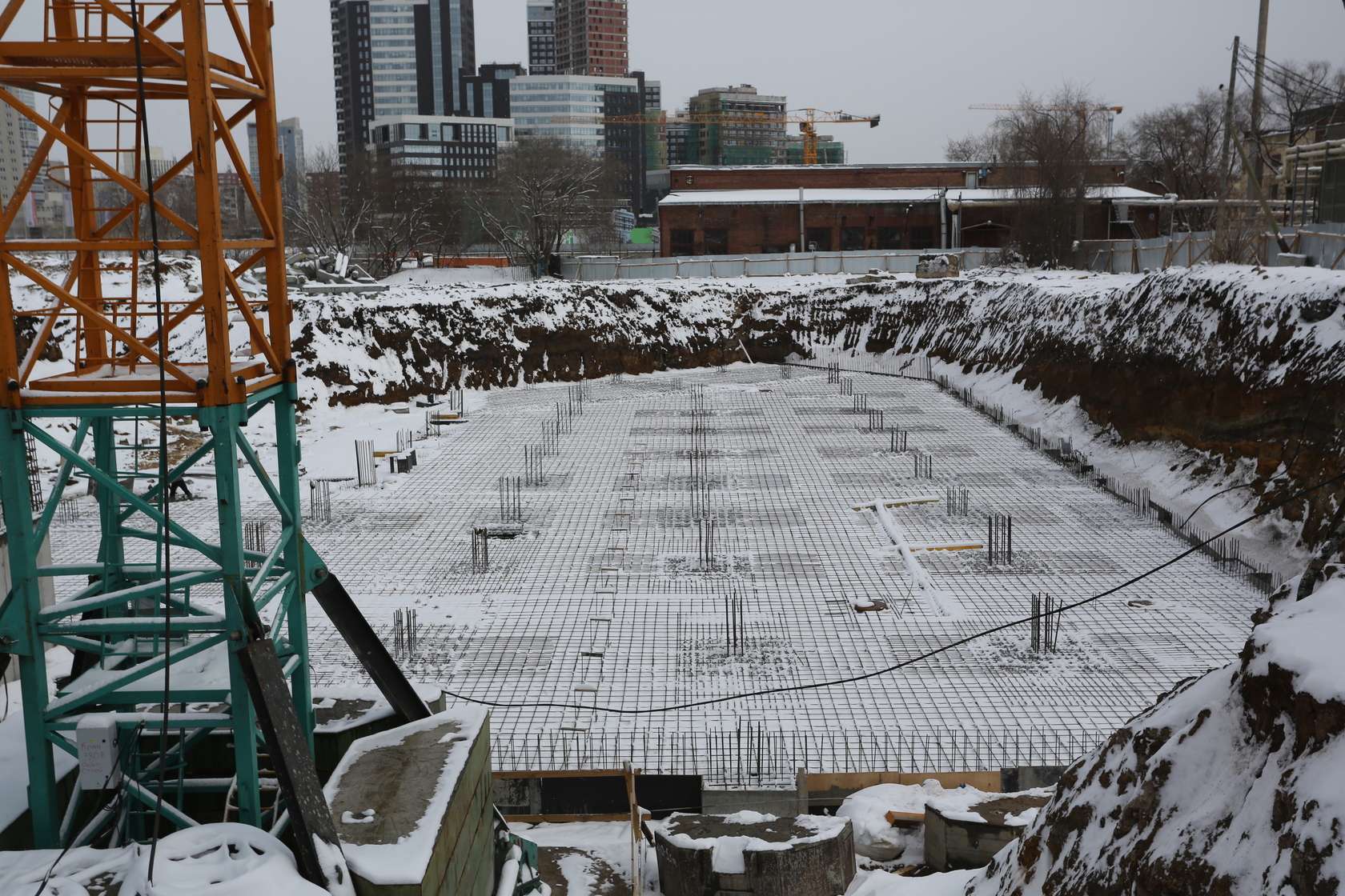 Выполняем кирпичную кладку стен на 11–13 этажах. Возводим монолитные конструкции стен подземной части дома и паркинга.