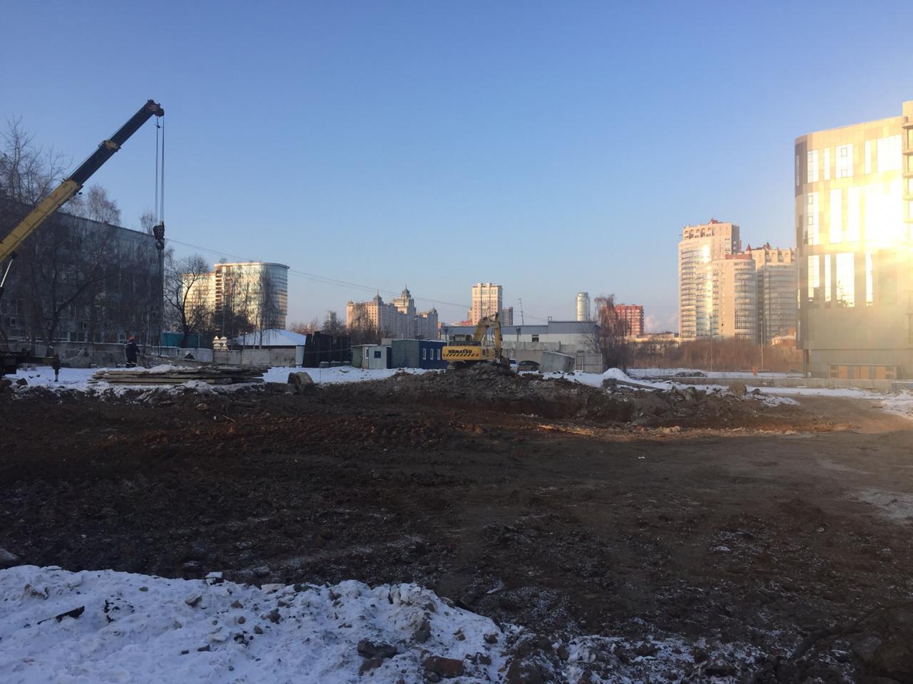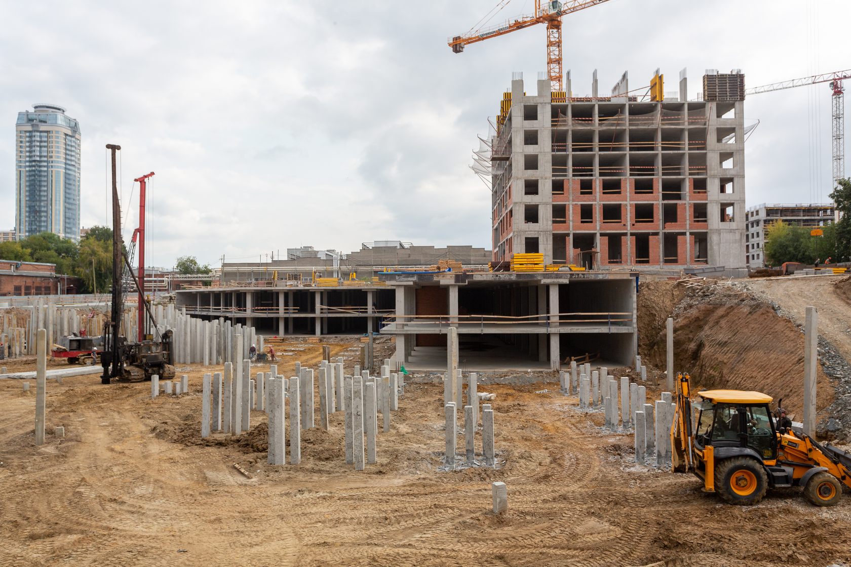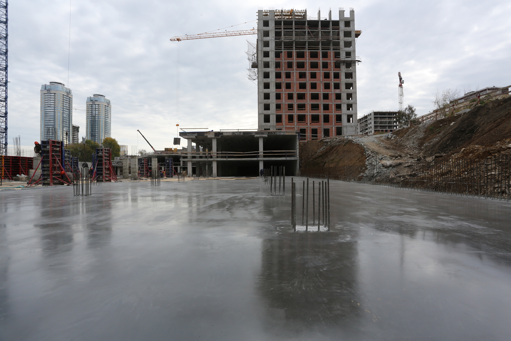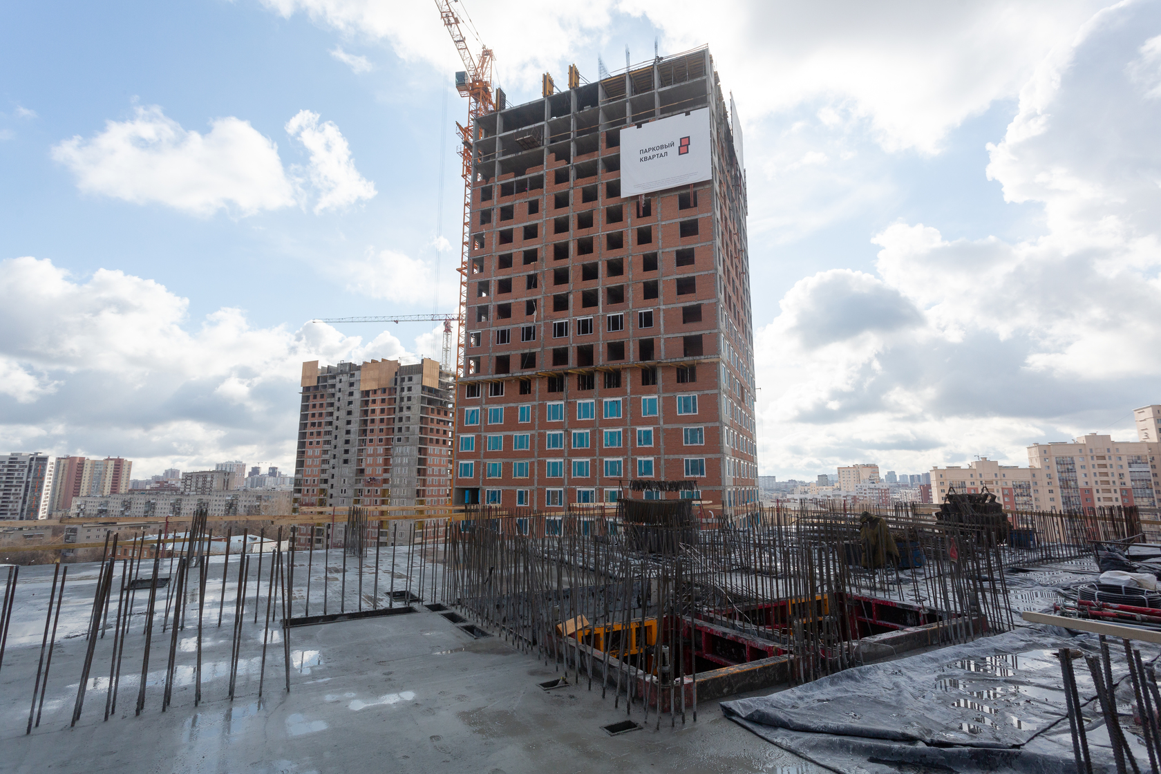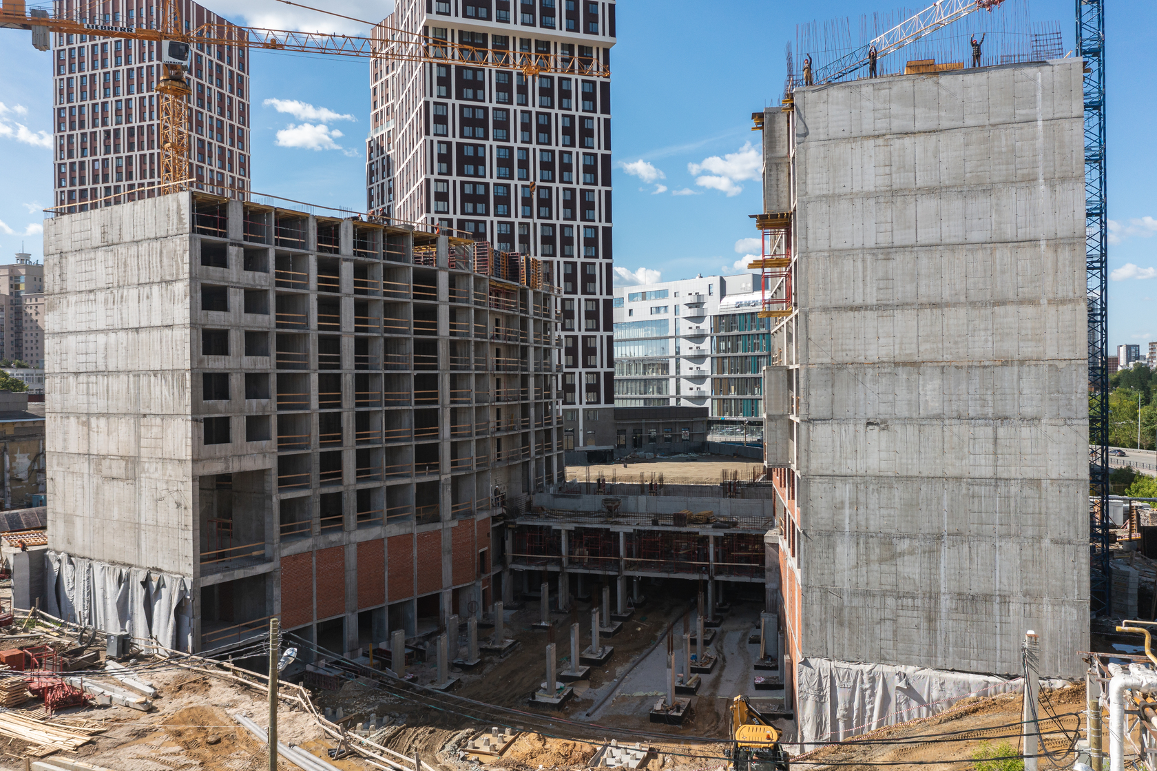Возводим монолитные конструкции 15 этажа первого дома. Выполняем кирпичную кладку стен на 9–11 этажах. Возводим монолитные конструкции стен подземной части дома и паркинга. Выполнили котлован третьего жилого дома. Забиваем сваи третьего дома.