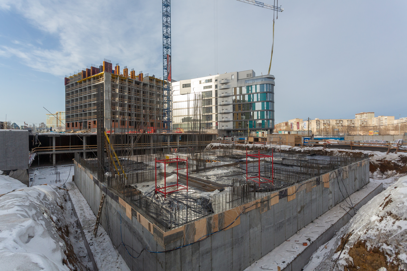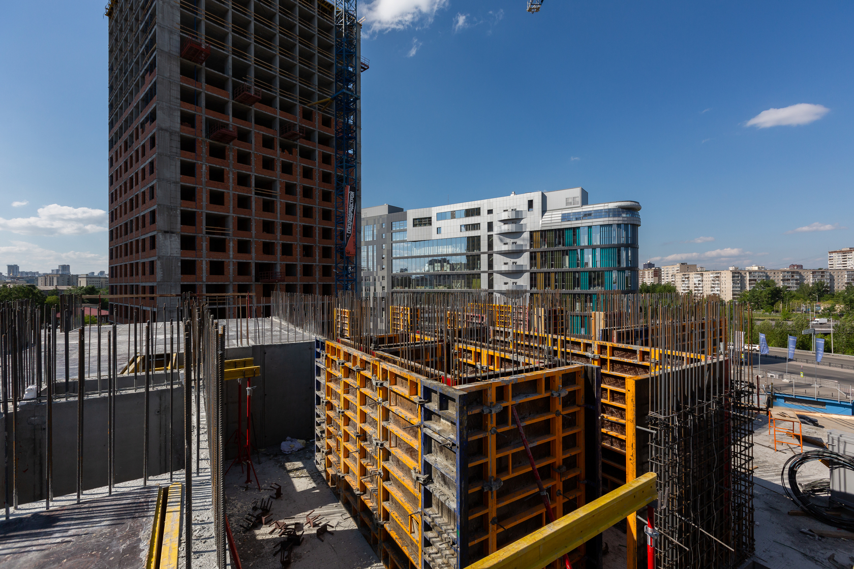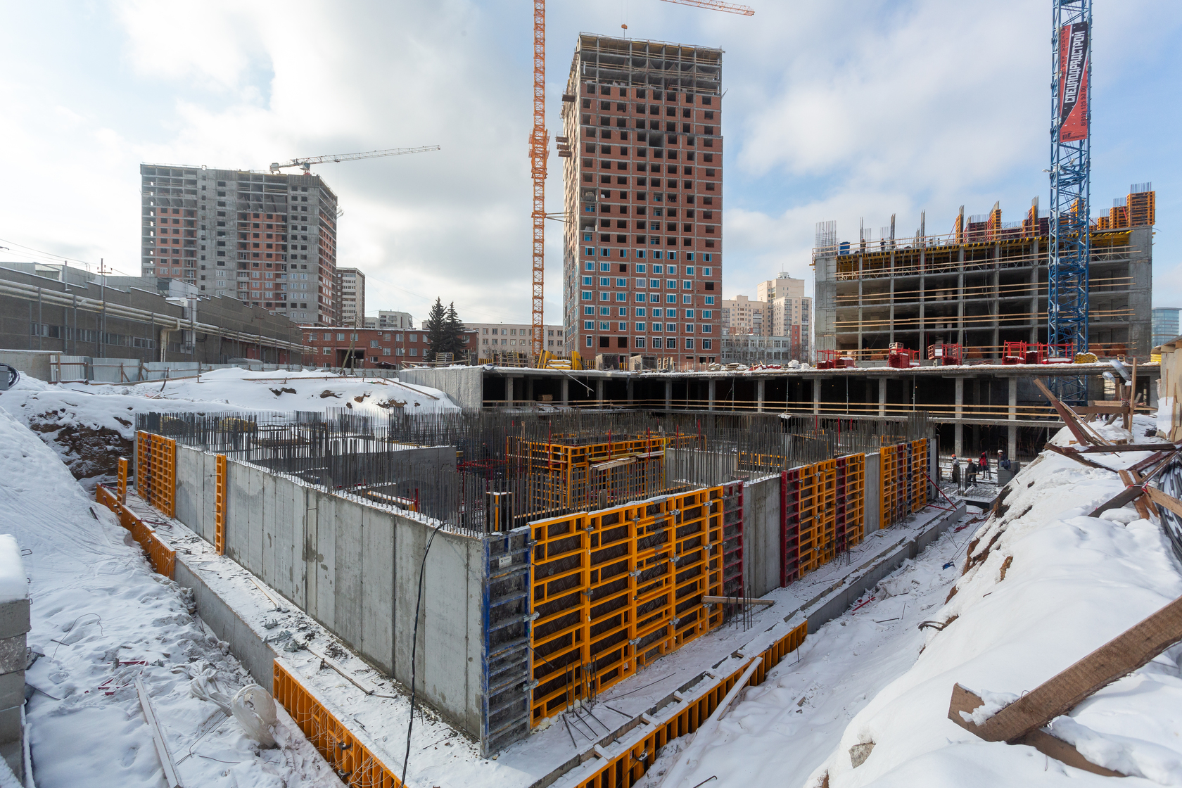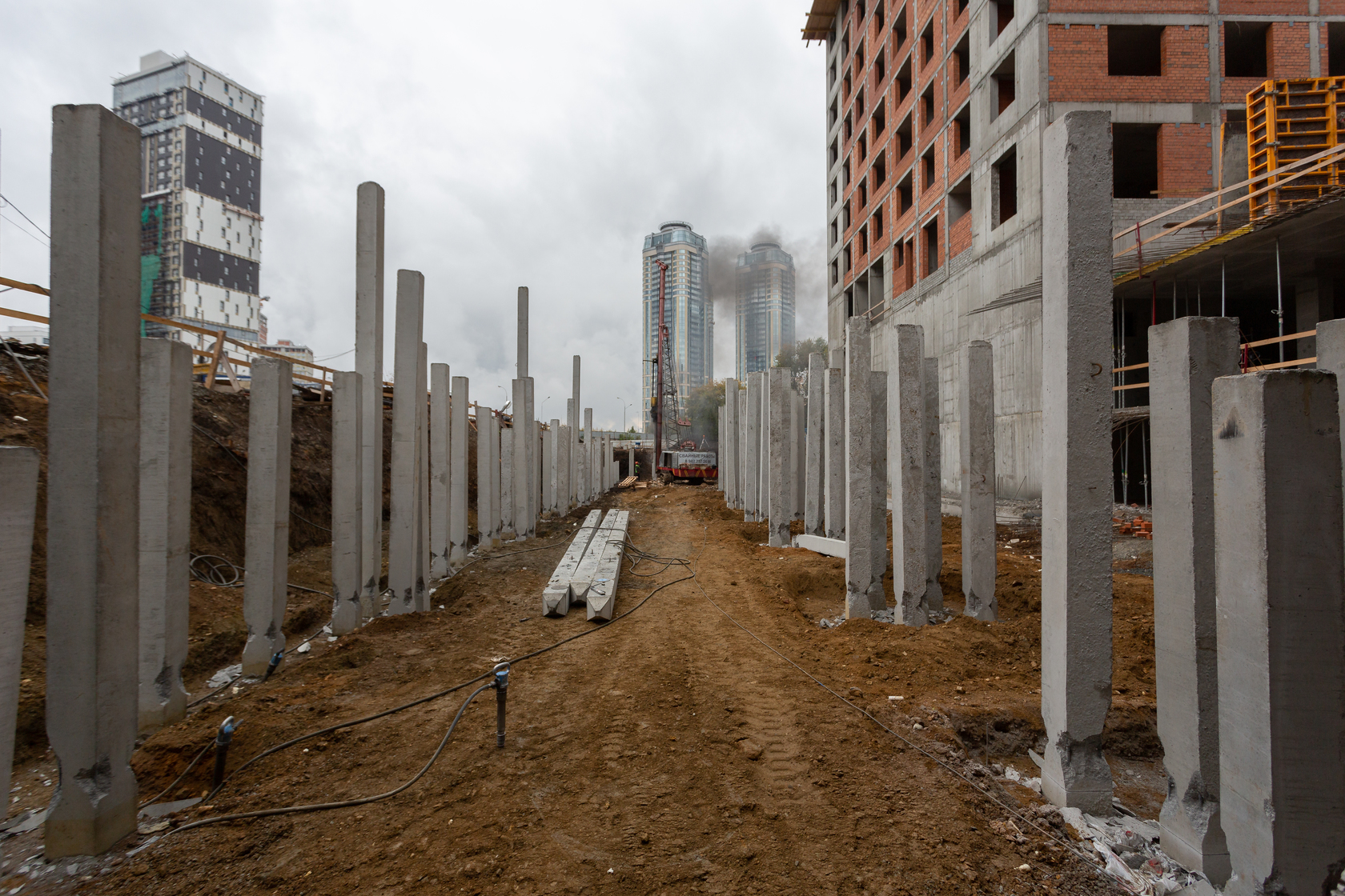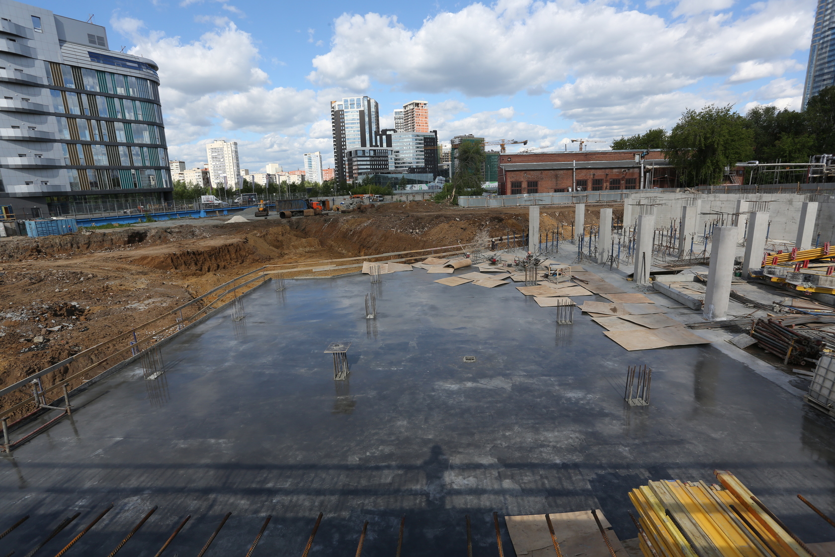 Возводим монолитные конструкции 15 этажа первого дома. Выполняем кирпичную кладку стен на 9–11 этажах. Возводим монолитные конструкции стен подземной части дома и паркинга. Выполнили котлован третьего жилого дома. Забиваем сваи третьего дома.