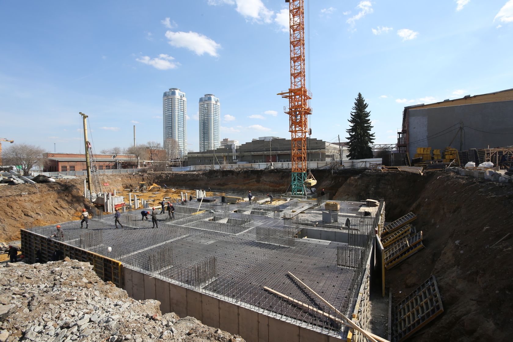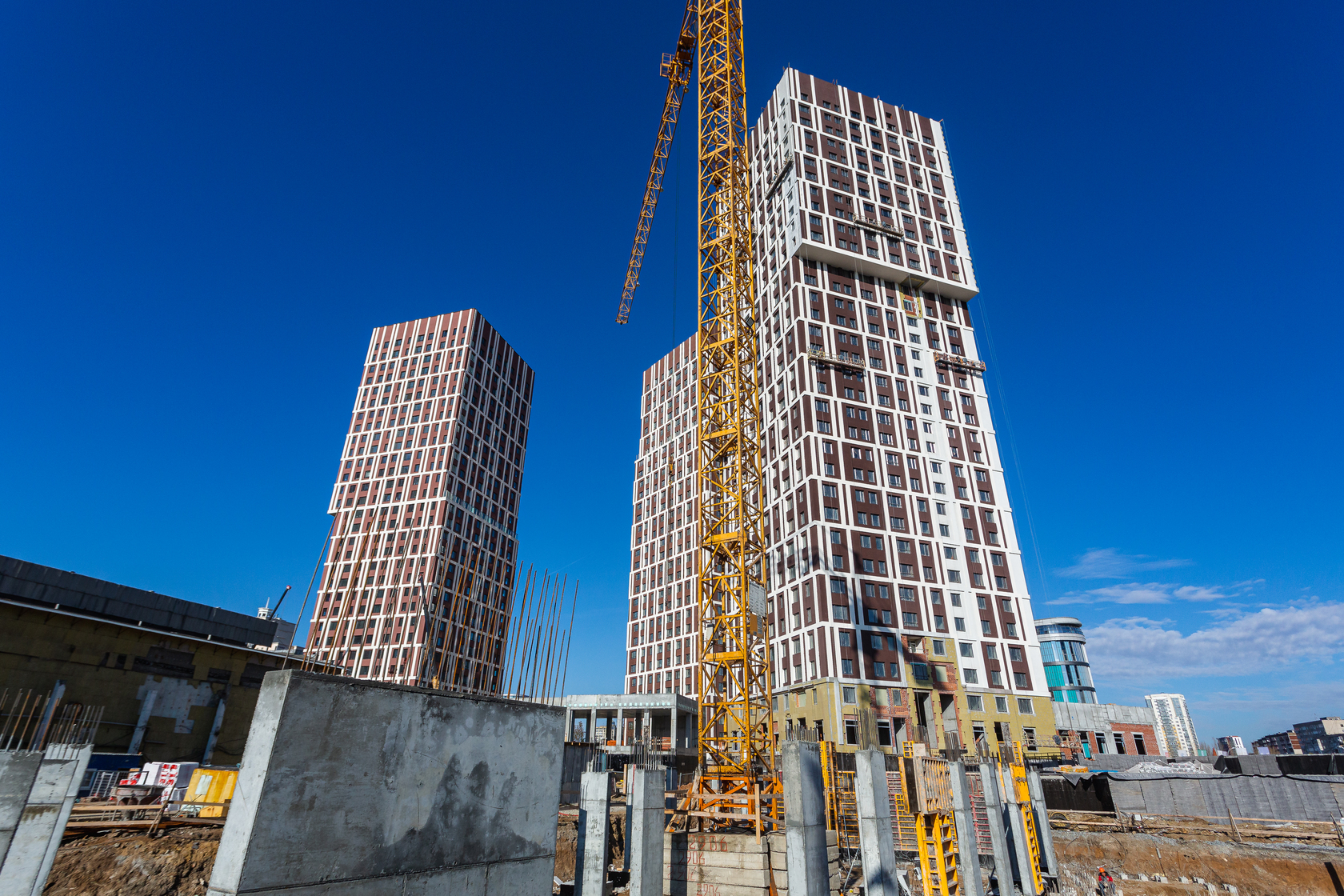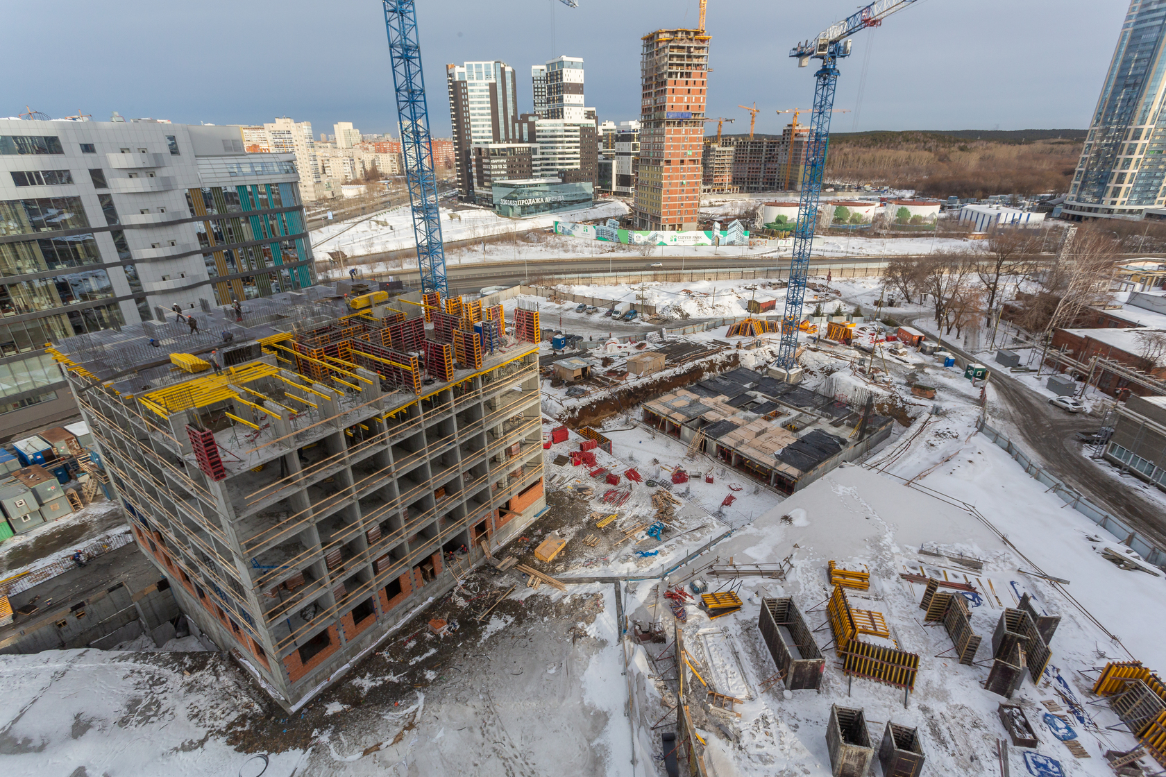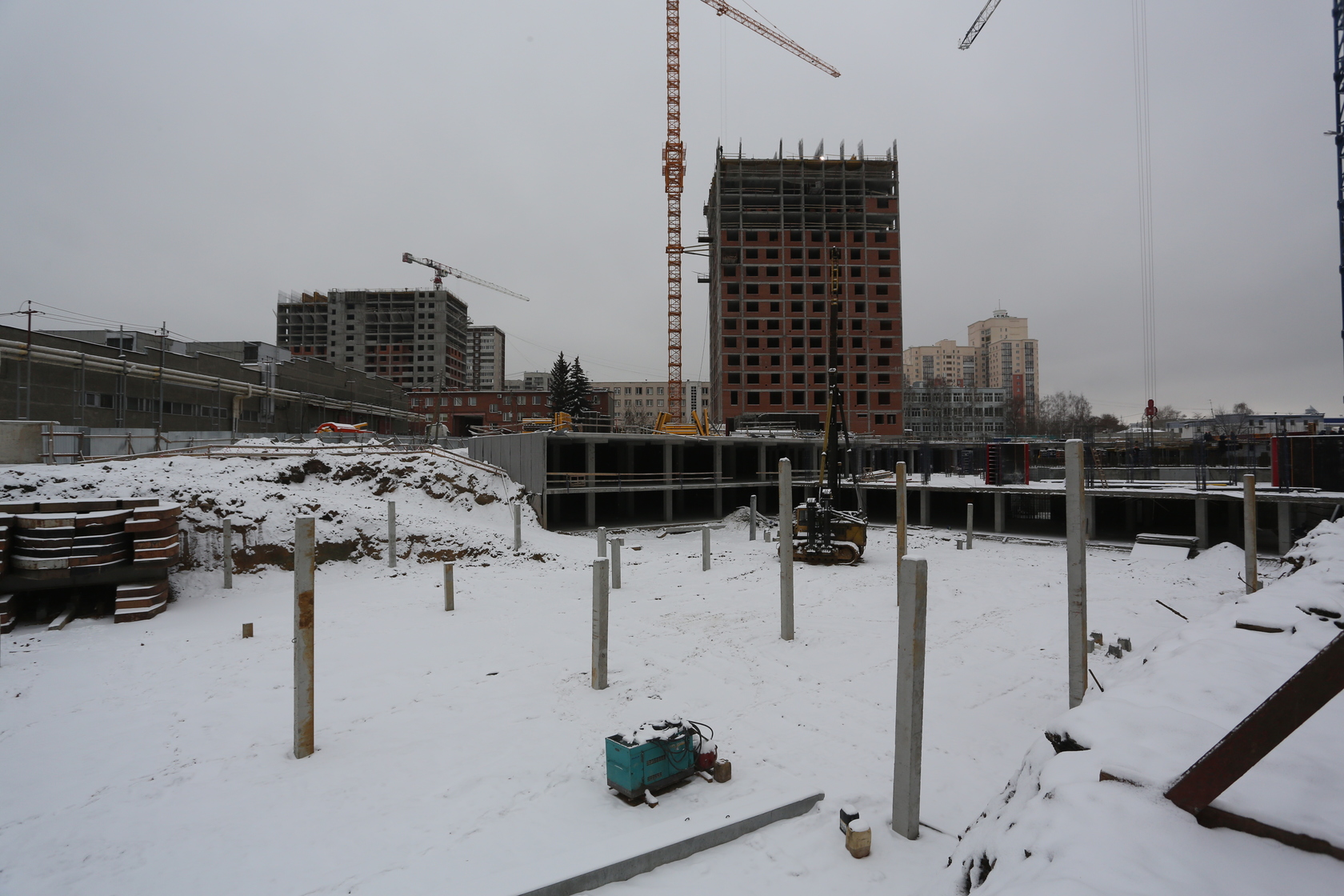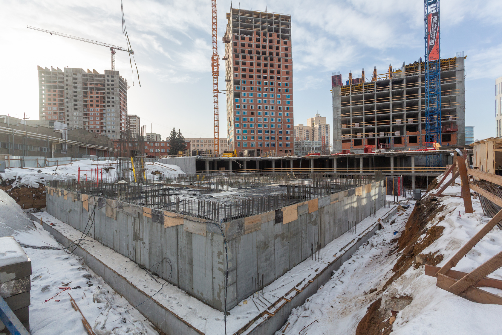 Возводим монолитные конструкции 15 этажа первого дома. Выполняем кирпичную кладку стен на 9–11 этажах. Возводим монолитные конструкции стен подземной части дома и паркинга. Выполнили котлован третьего жилого дома. Забиваем сваи третьего дома.
