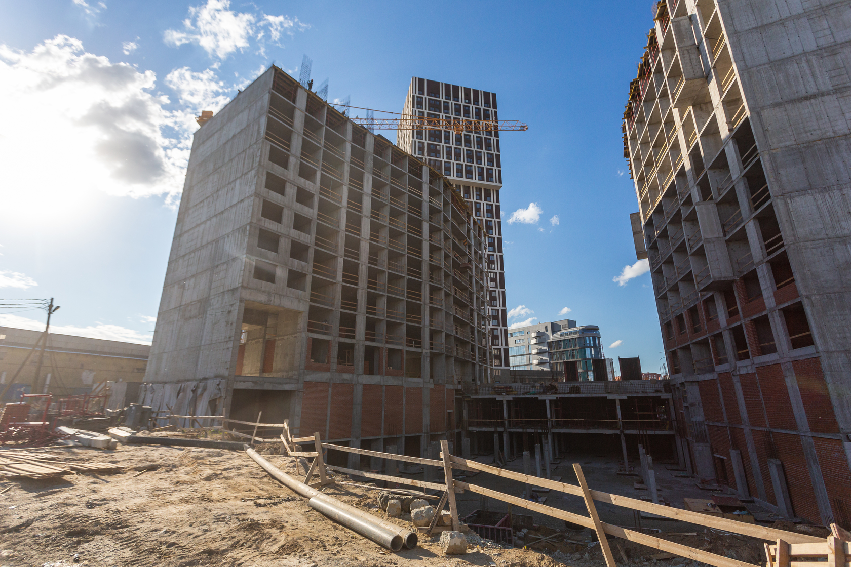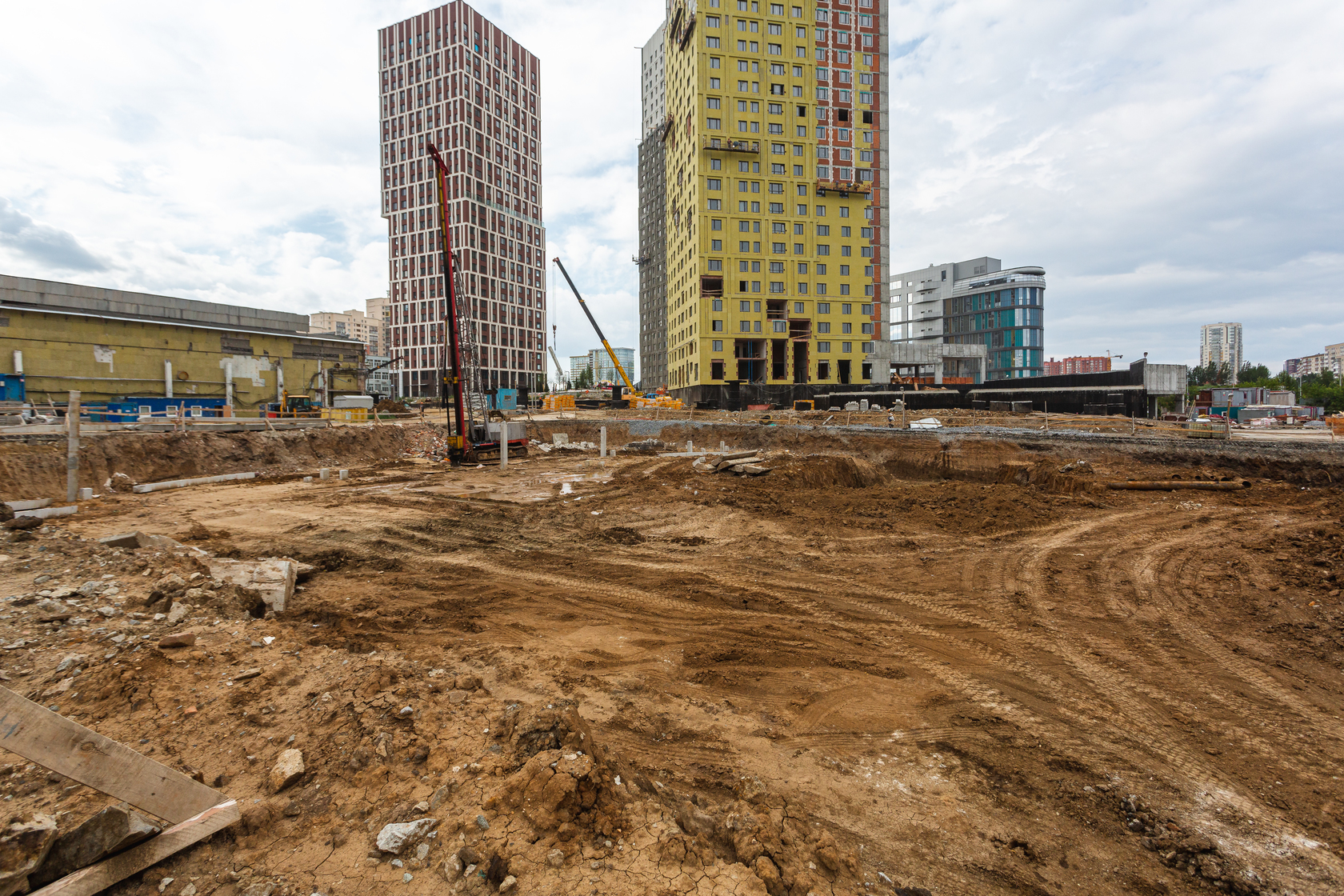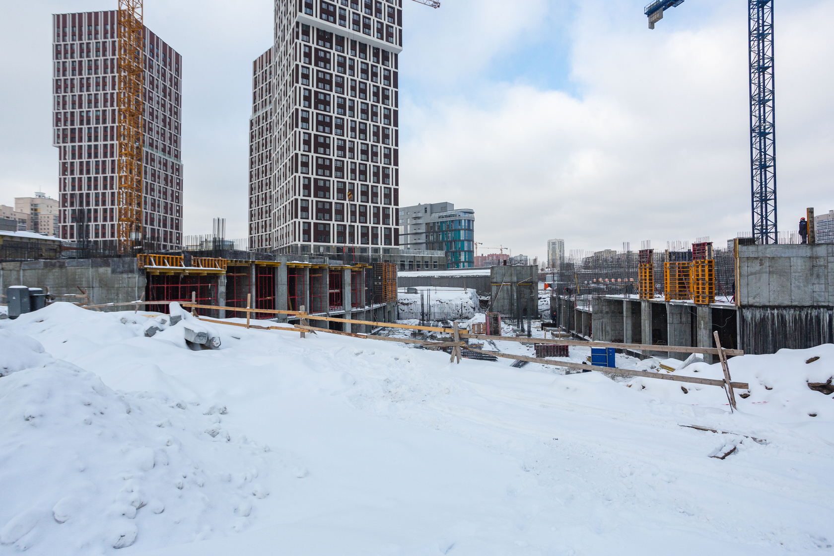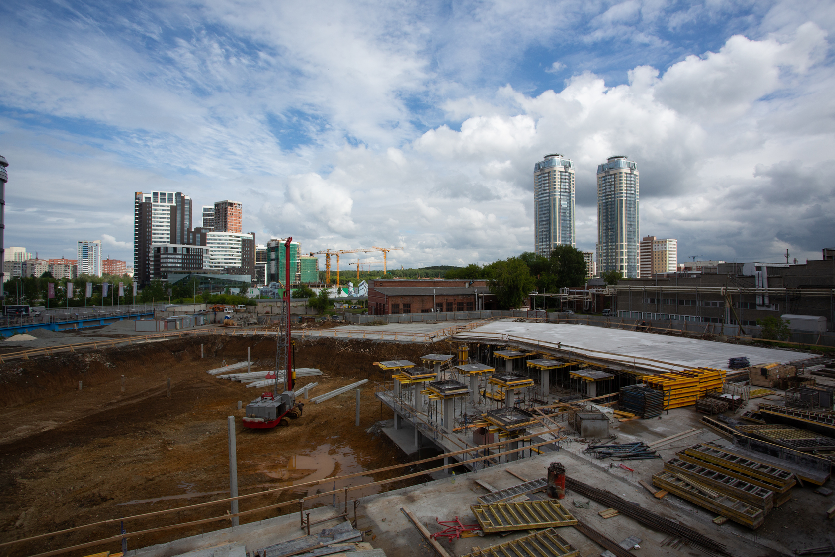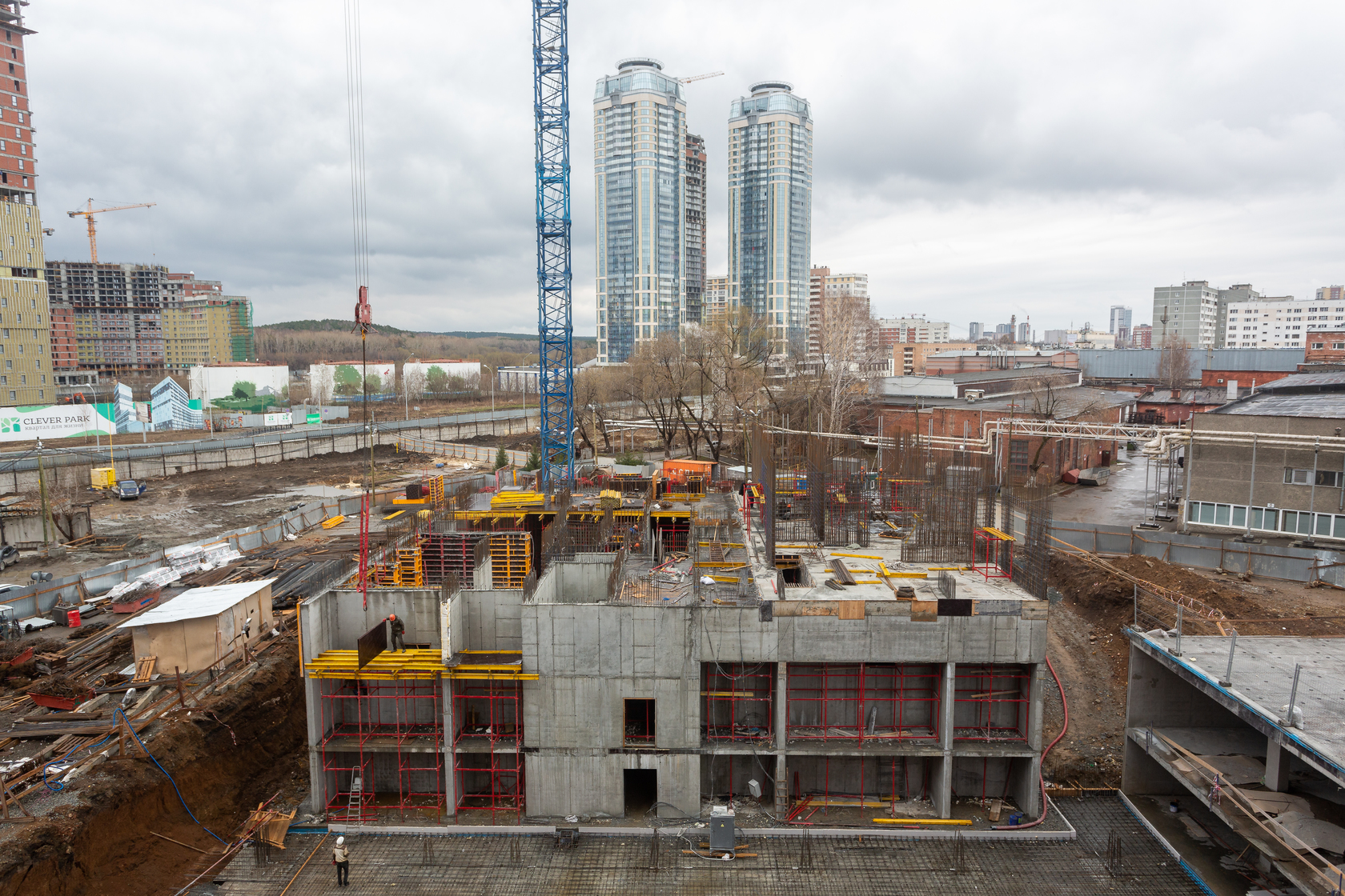 Возводим монолитные конструкции 15 этажа первого дома. Выполняем кирпичную кладку стен на 9–11 этажах. Возводим монолитные конструкции стен подземной части дома и паркинга. Выполнили котлован третьего жилого дома. Забиваем сваи третьего дома.