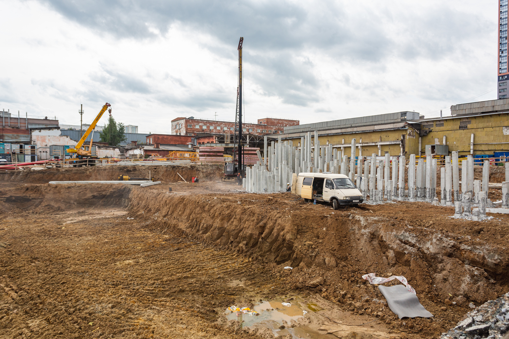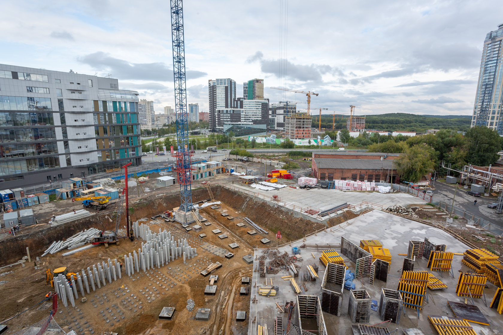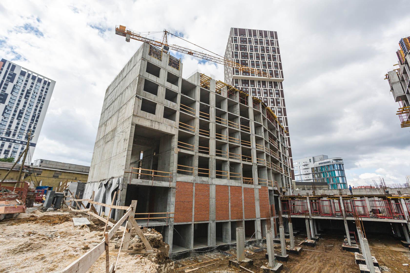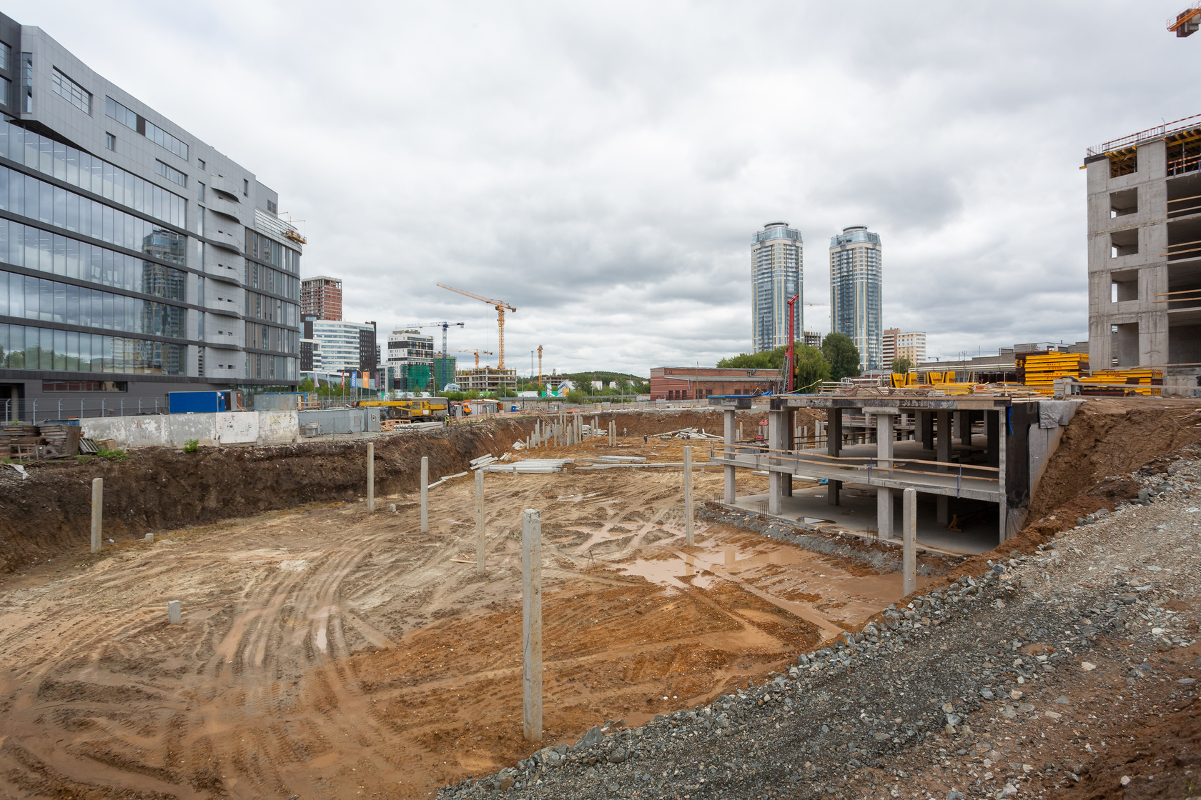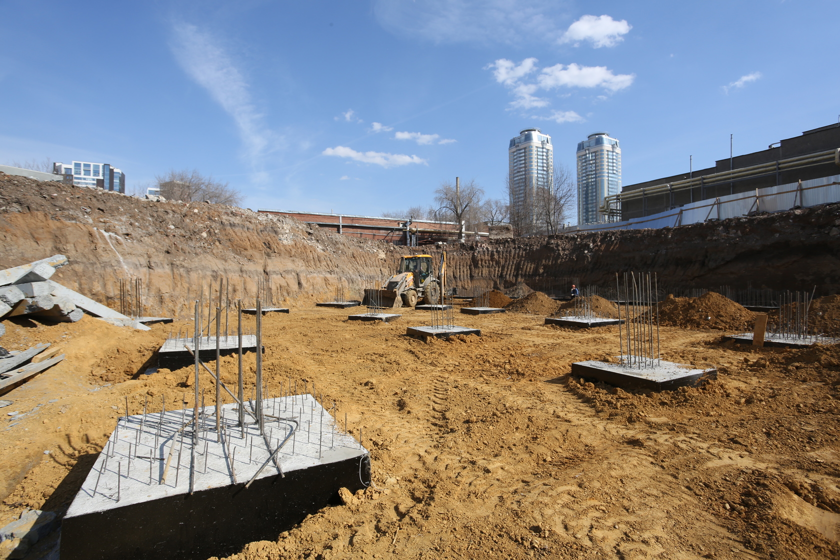Возводим монолитные конструкции 15 этажа первого дома. Выполняем кирпичную кладку стен на 9–11 этажах. Возводим монолитные конструкции стен подземной части дома и паркинга. Выполнили котлован третьего жилого дома. Забиваем сваи третьего дома.