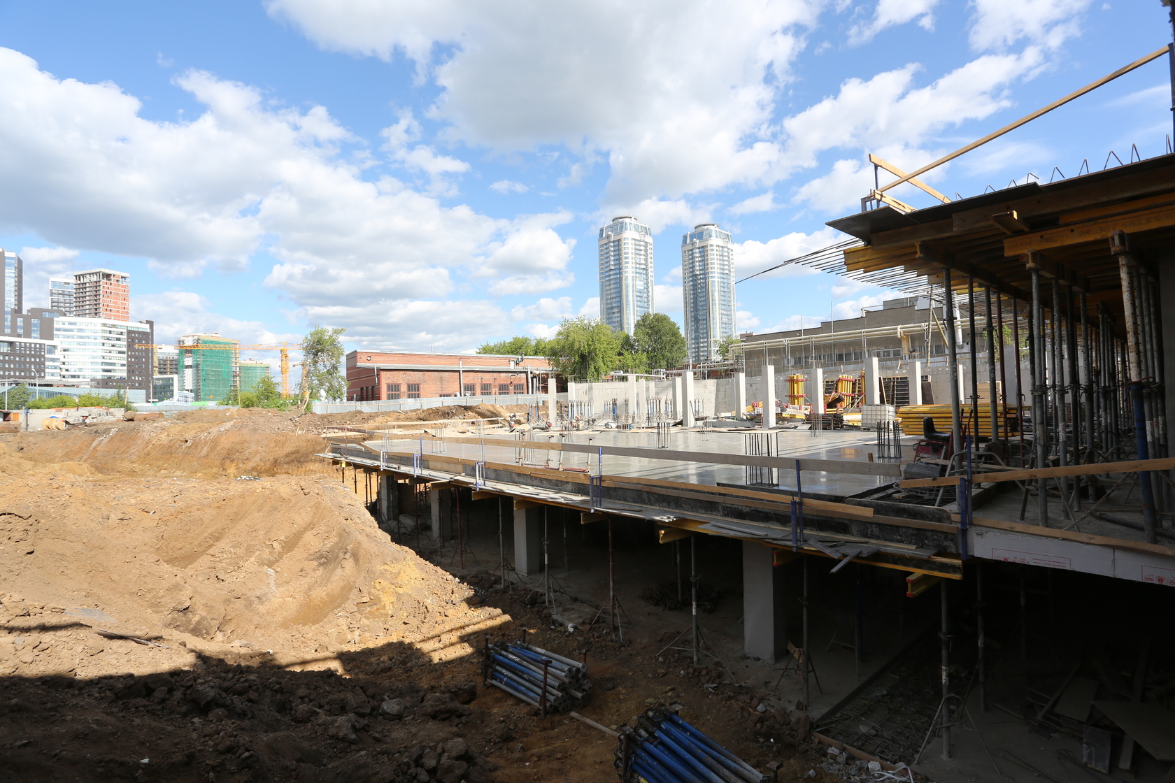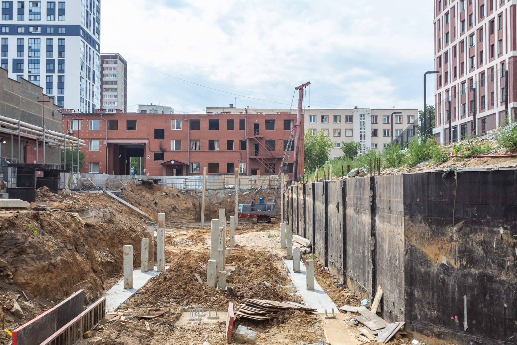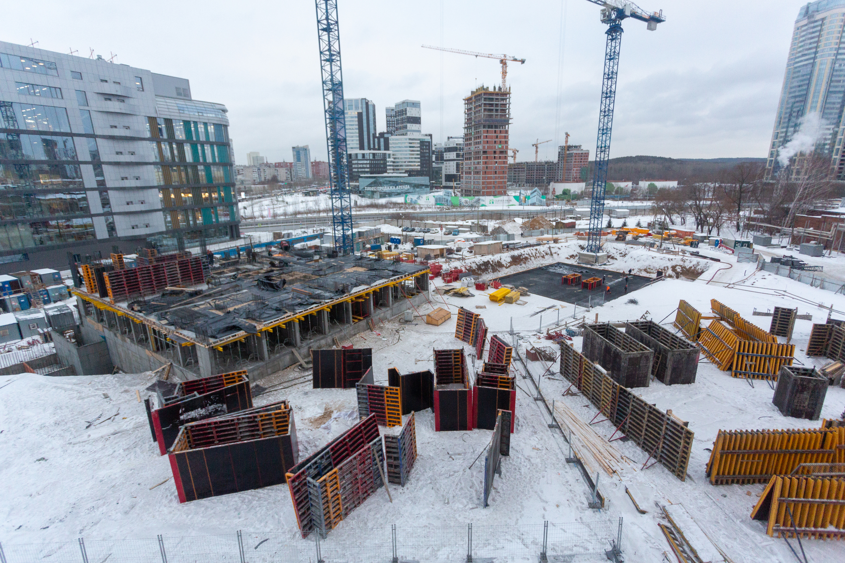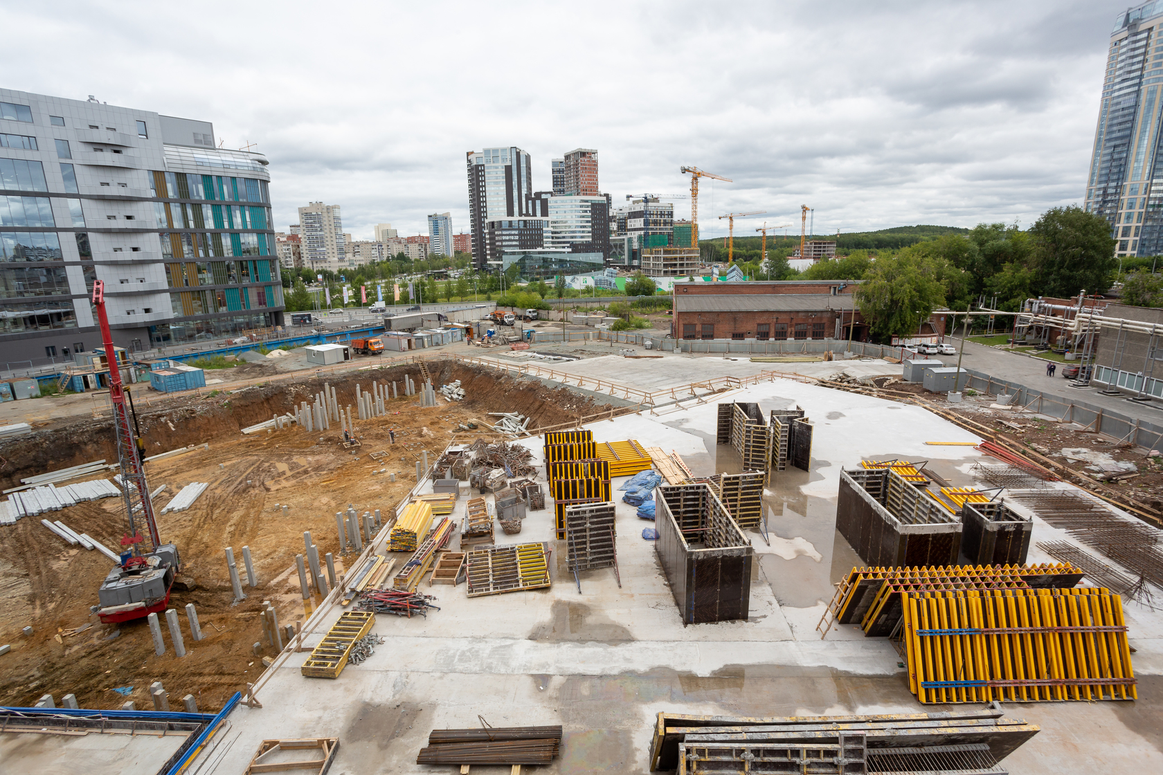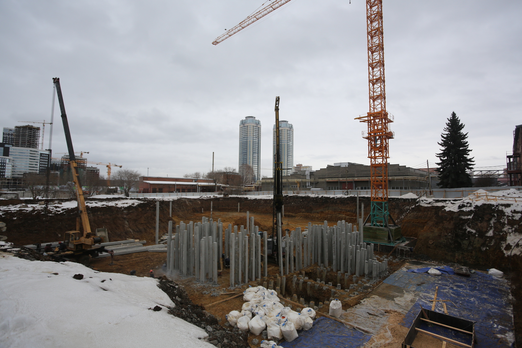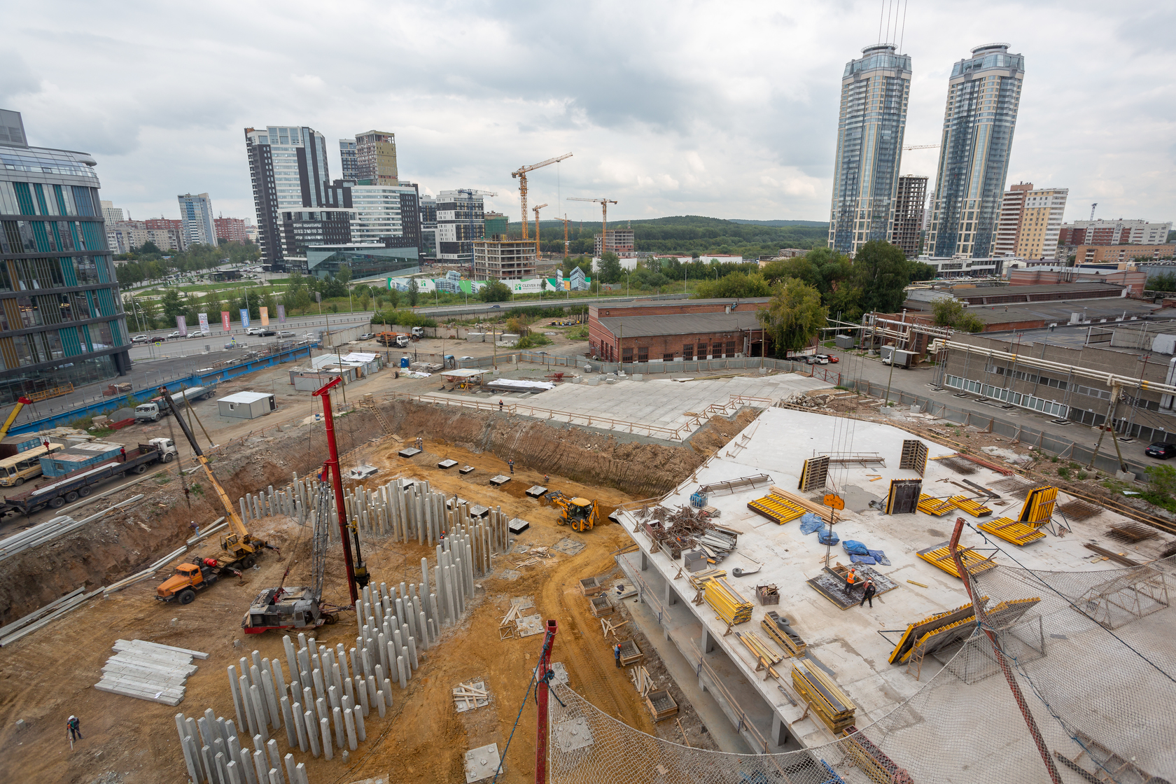 Возводим монолитные конструкции 15 этажа первого дома. Выполняем кирпичную кладку стен на 9–11 этажах. Возводим монолитные конструкции стен подземной части дома и паркинга. Выполнили котлован третьего жилого дома. Забиваем сваи третьего дома.