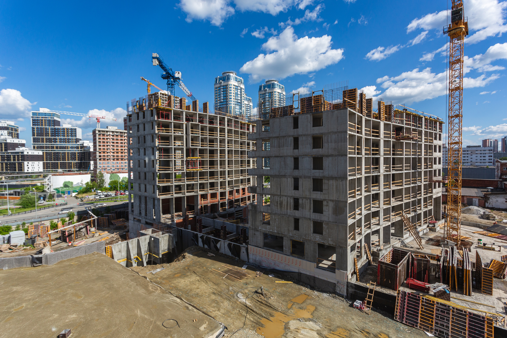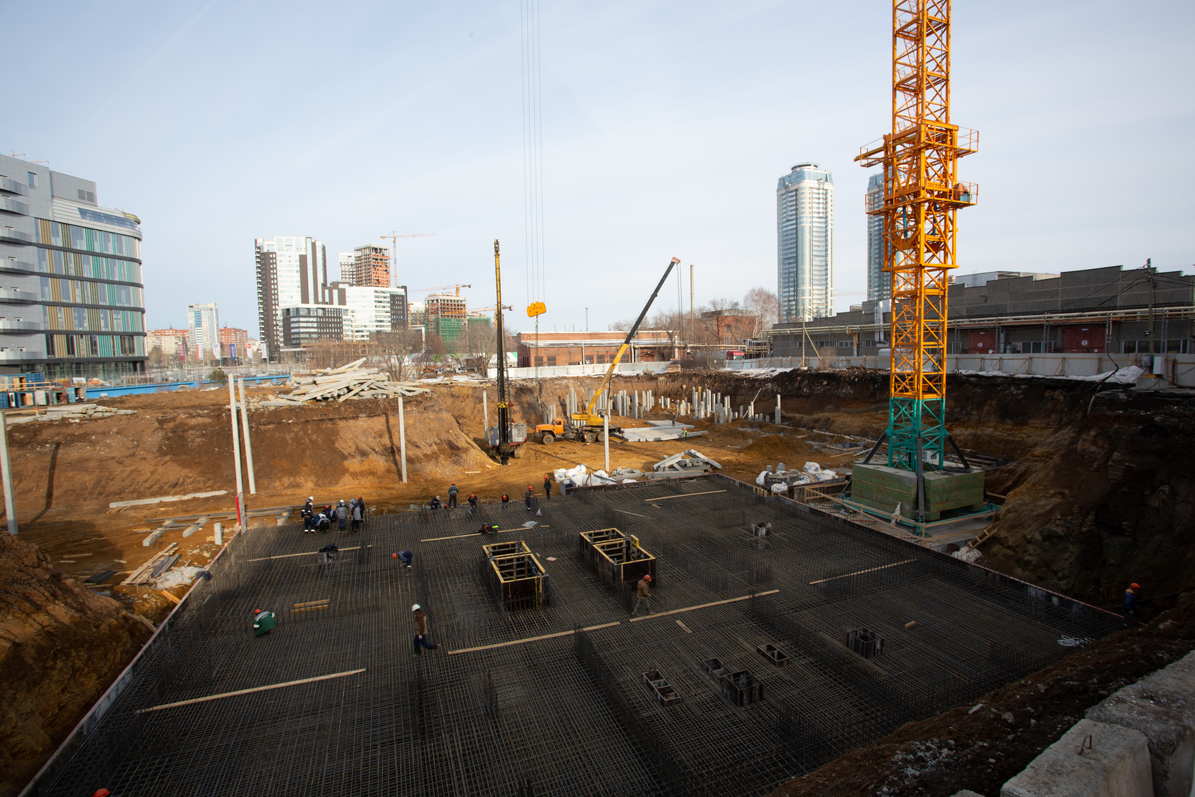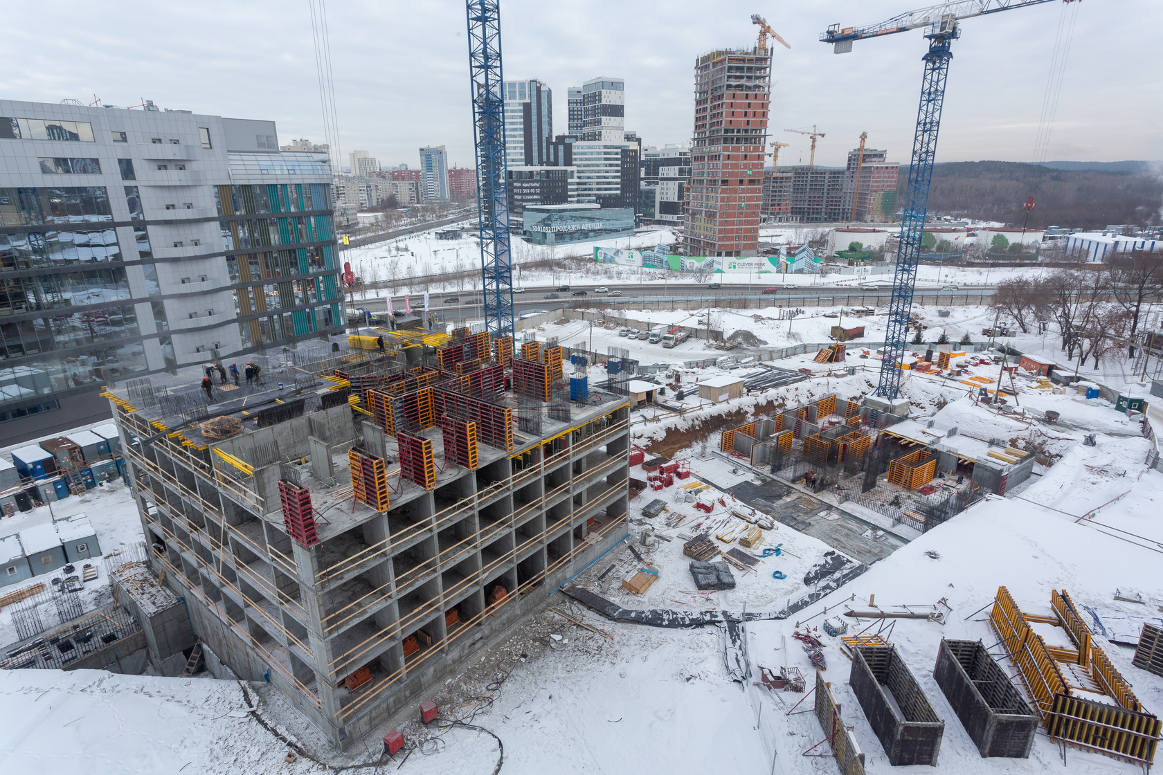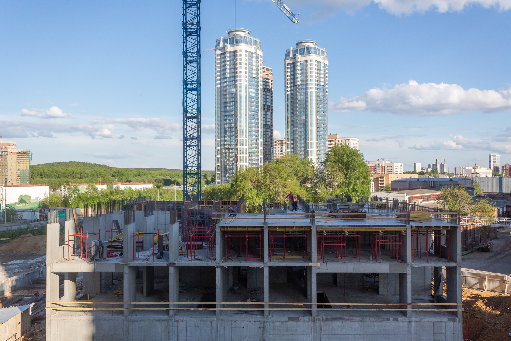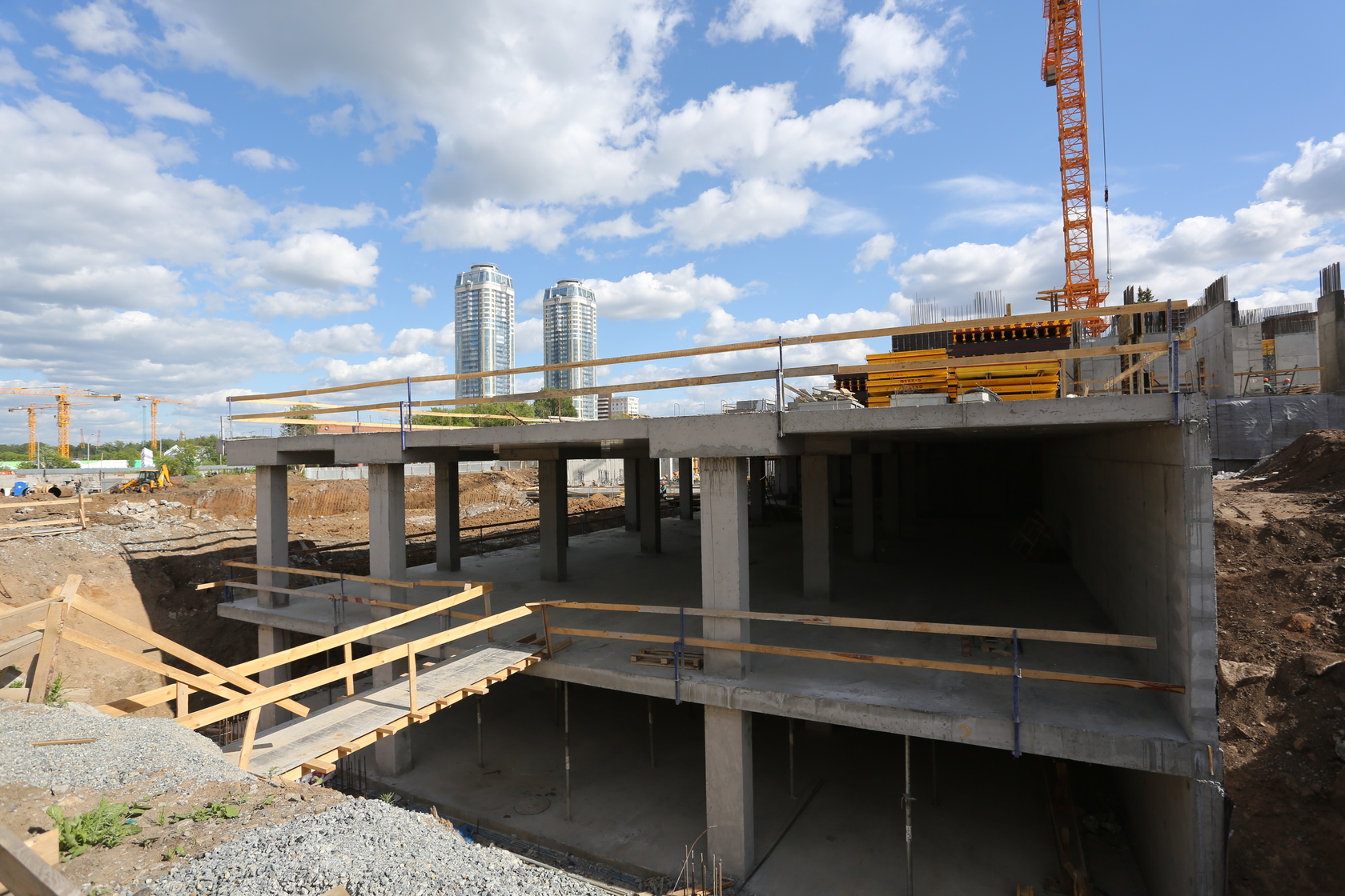 Возводим монолитные конструкции 15 этажа первого дома. Выполняем кирпичную кладку стен на 9–11 этажах. Возводим монолитные конструкции стен подземной части дома и паркинга. Выполнили котлован третьего жилого дома. Забиваем сваи третьего дома.