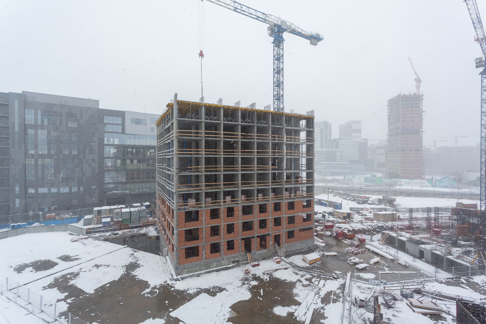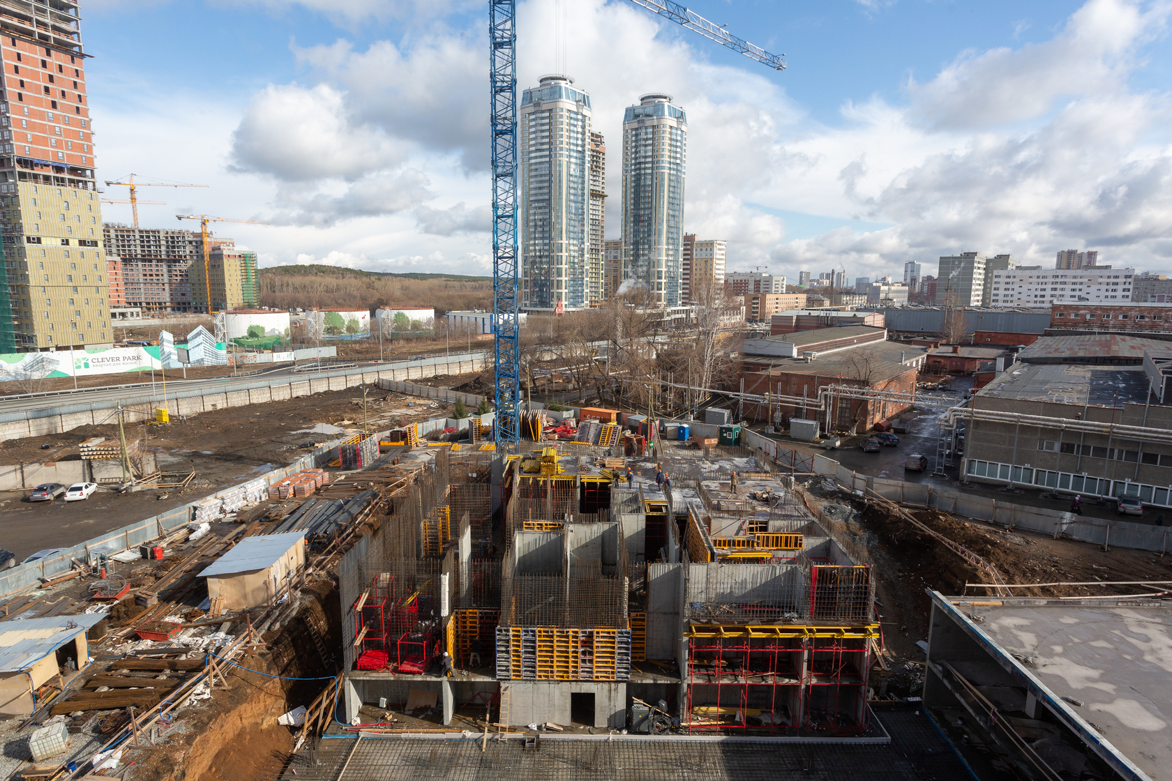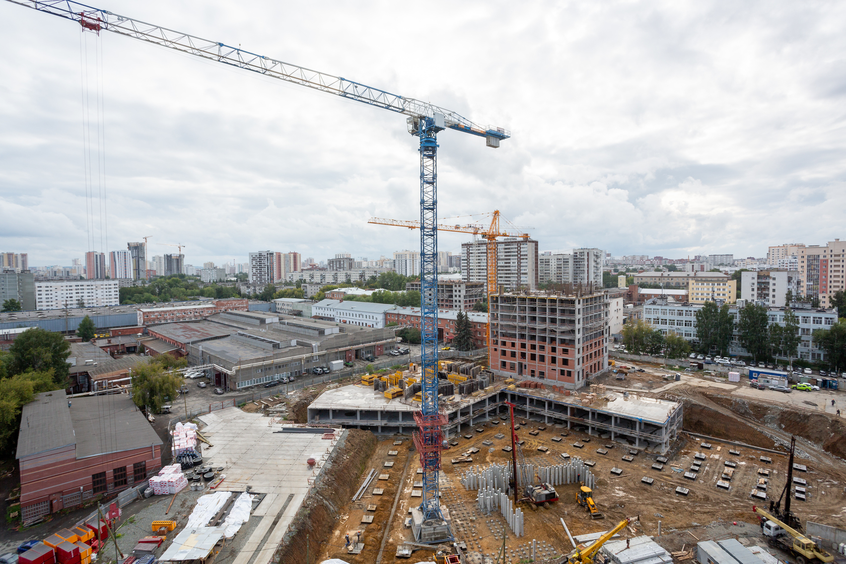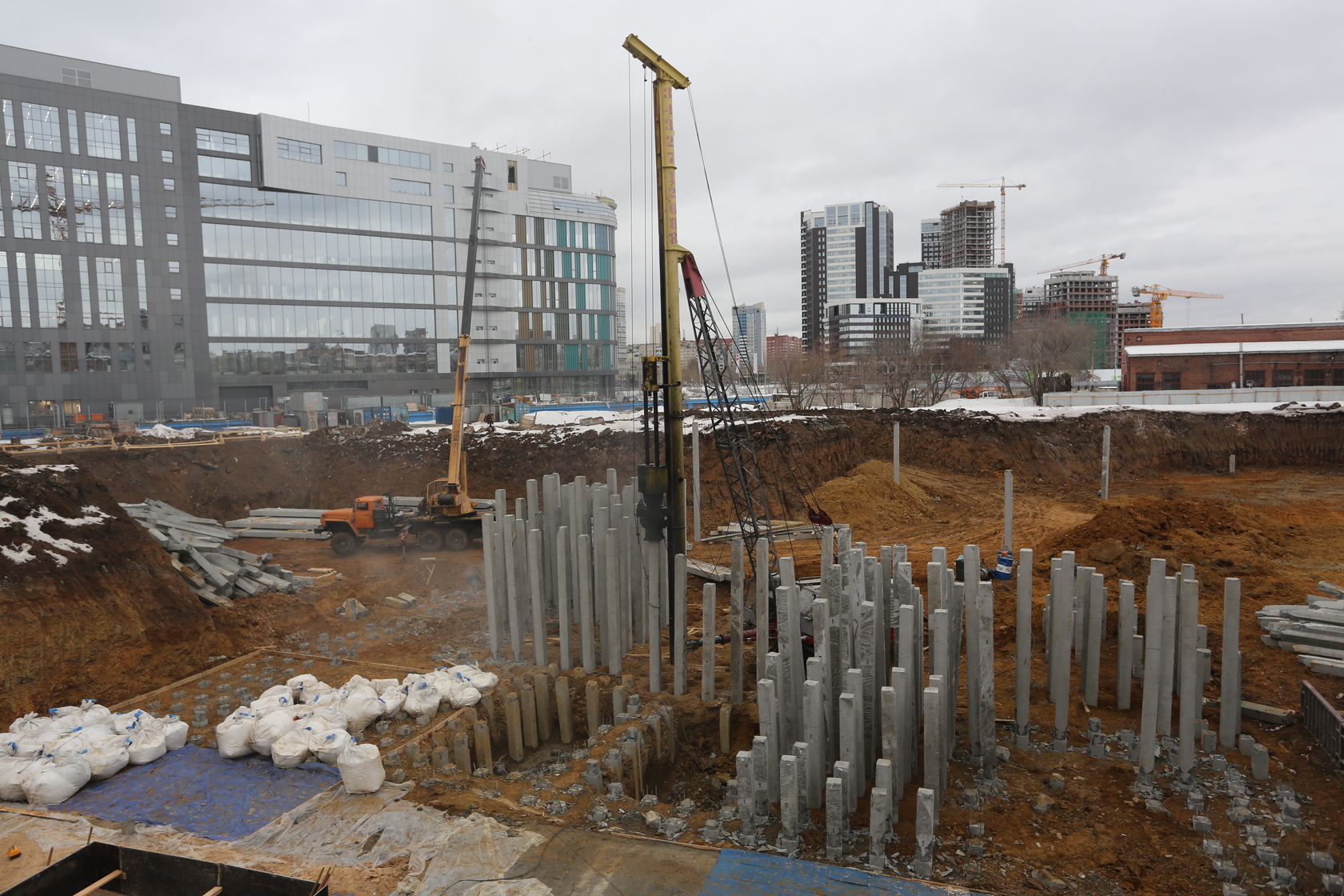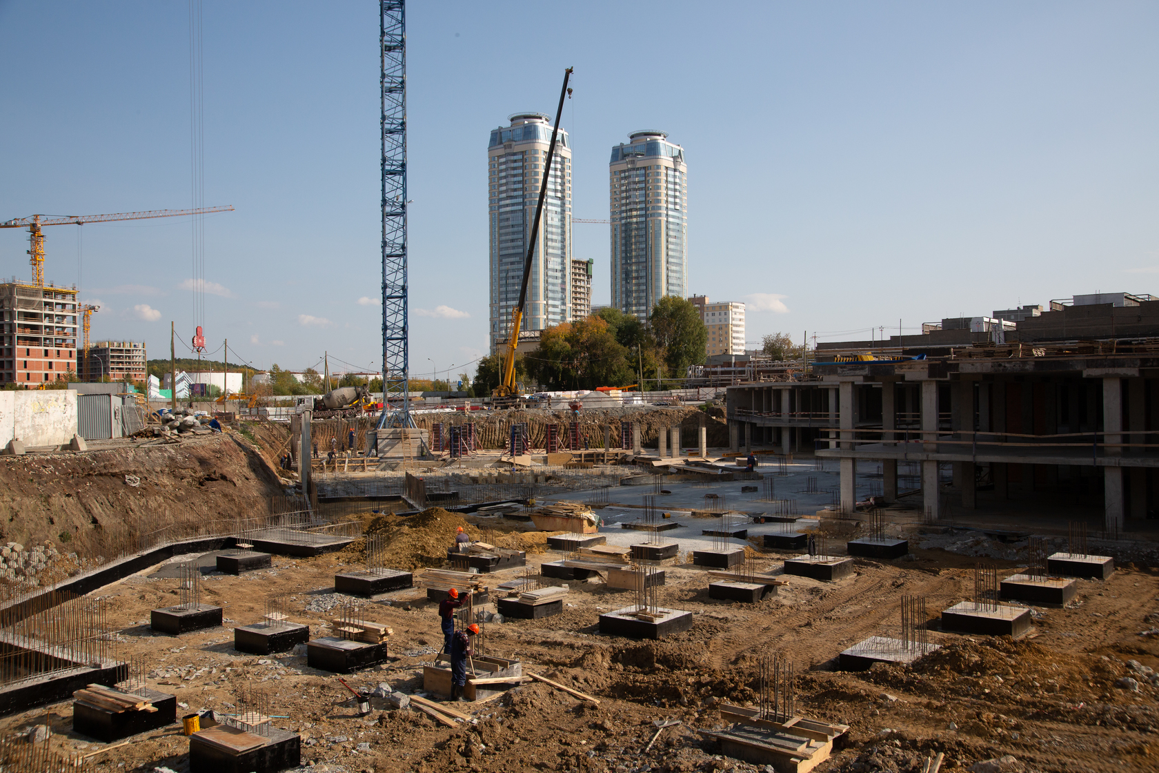 Возводим монолитные конструкции 15 этажа первого дома. Выполняем кирпичную кладку стен на 9–11 этажах. Возводим монолитные конструкции стен подземной части дома и паркинга. Выполнили котлован третьего жилого дома. Забиваем сваи третьего дома.