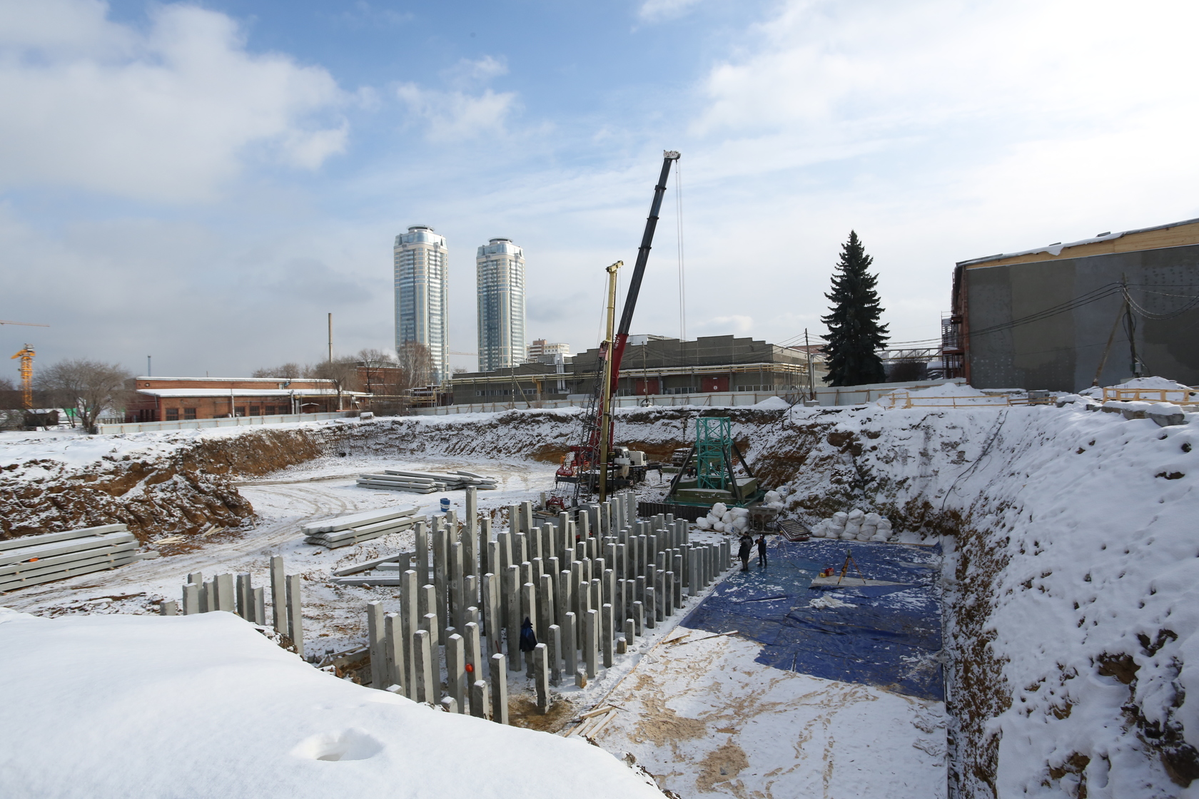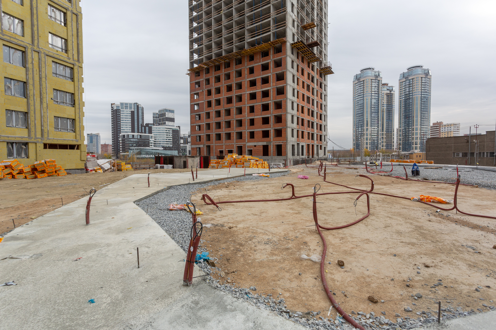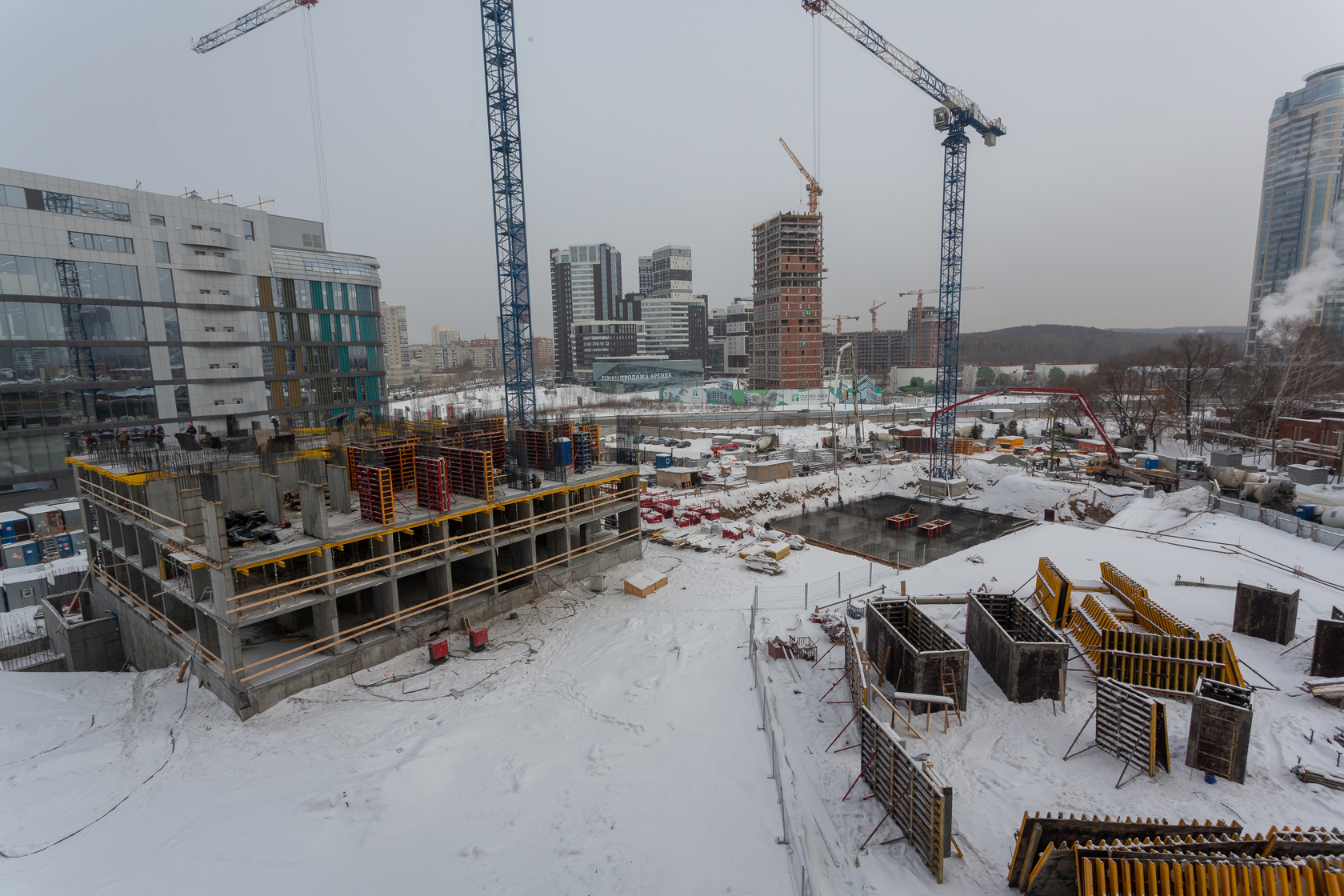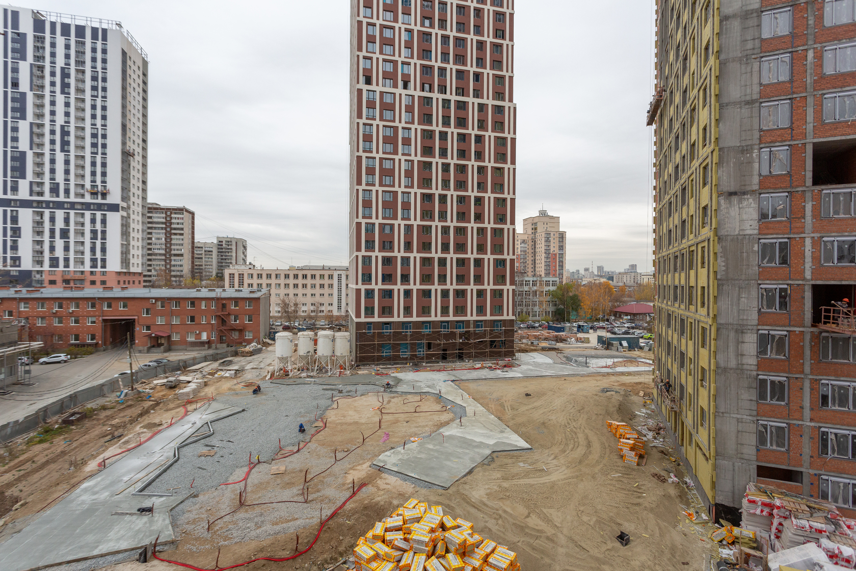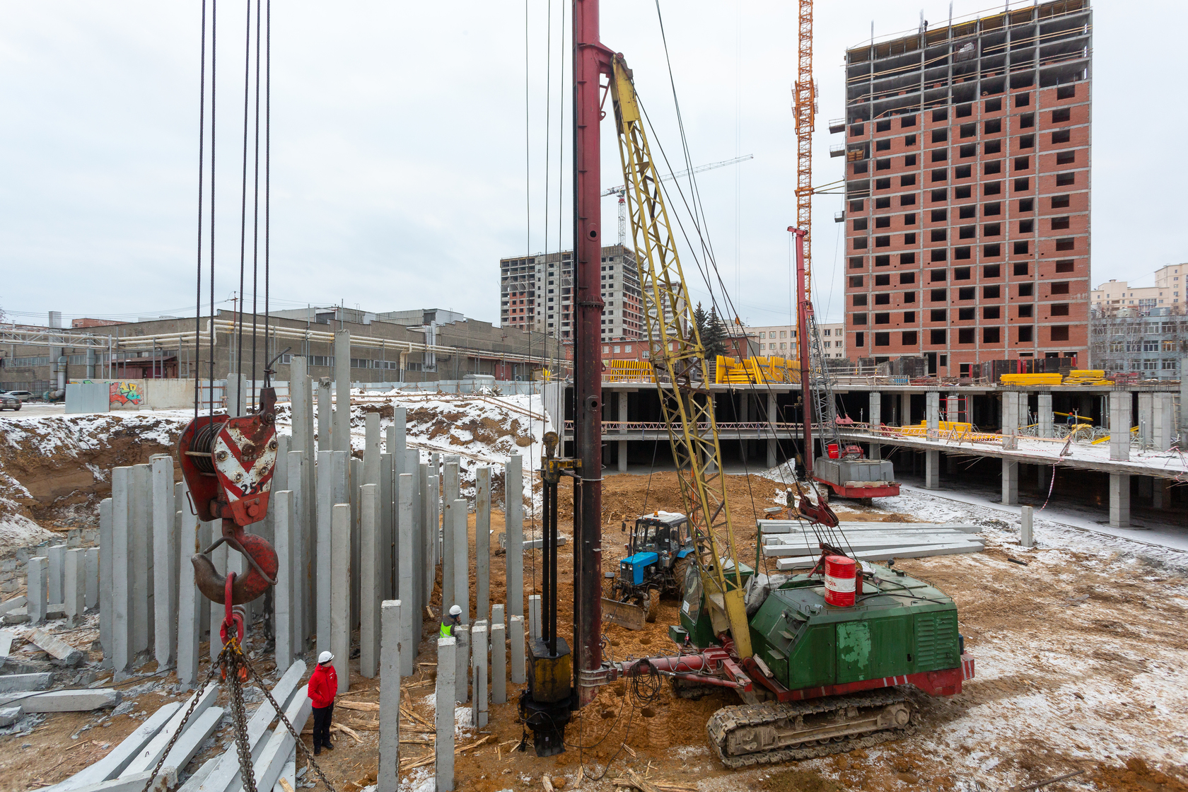 Возводим монолитные конструкции 15 этажа первого дома. Выполняем кирпичную кладку стен на 9–11 этажах. Возводим монолитные конструкции стен подземной части дома и паркинга. Выполнили котлован третьего жилого дома. Забиваем сваи третьего дома.