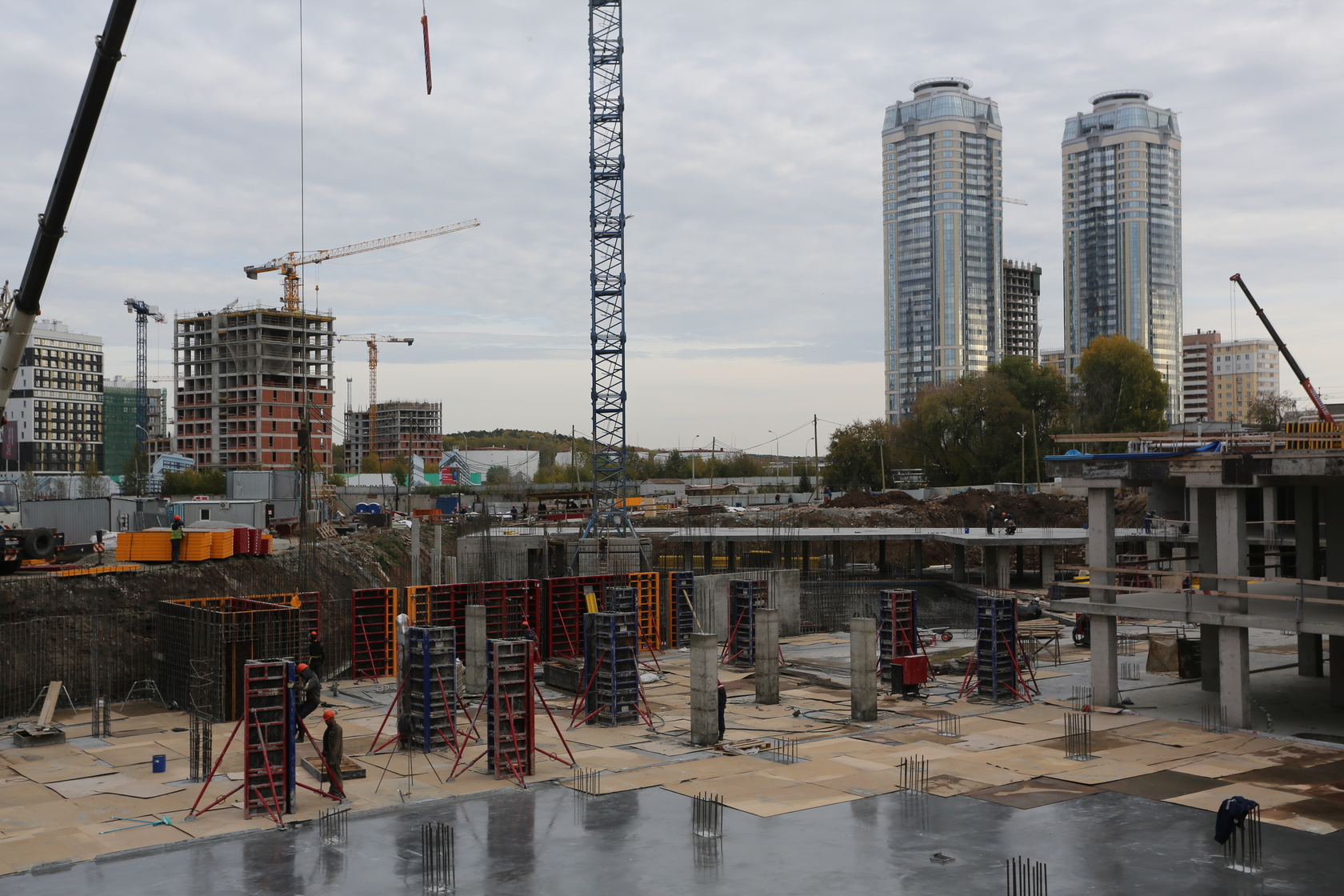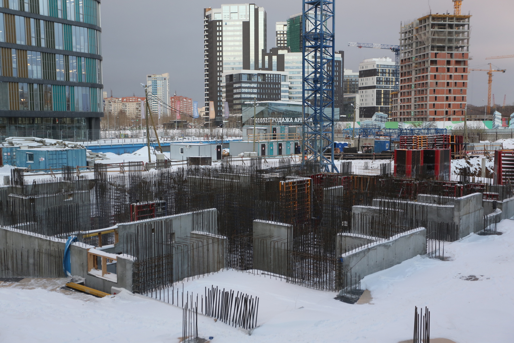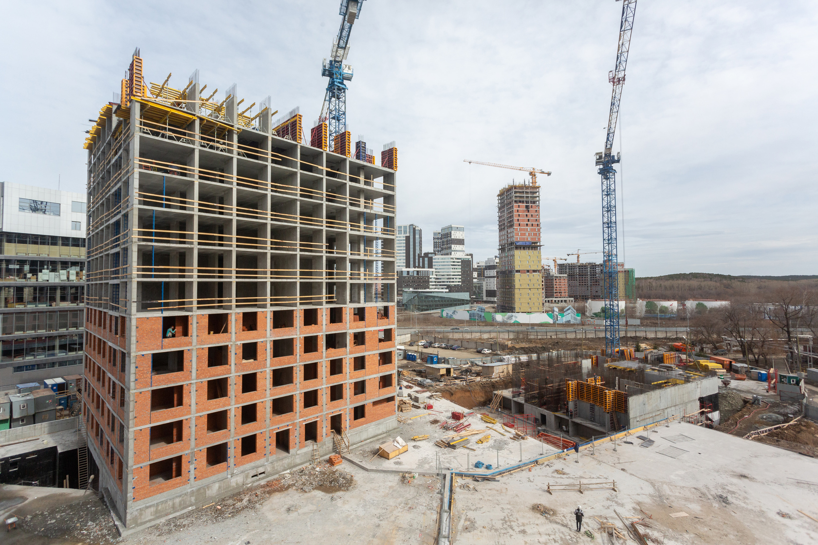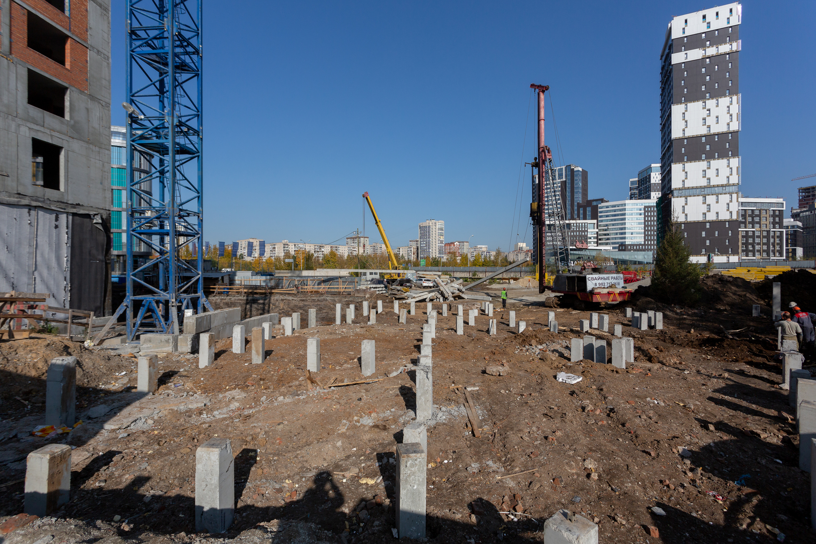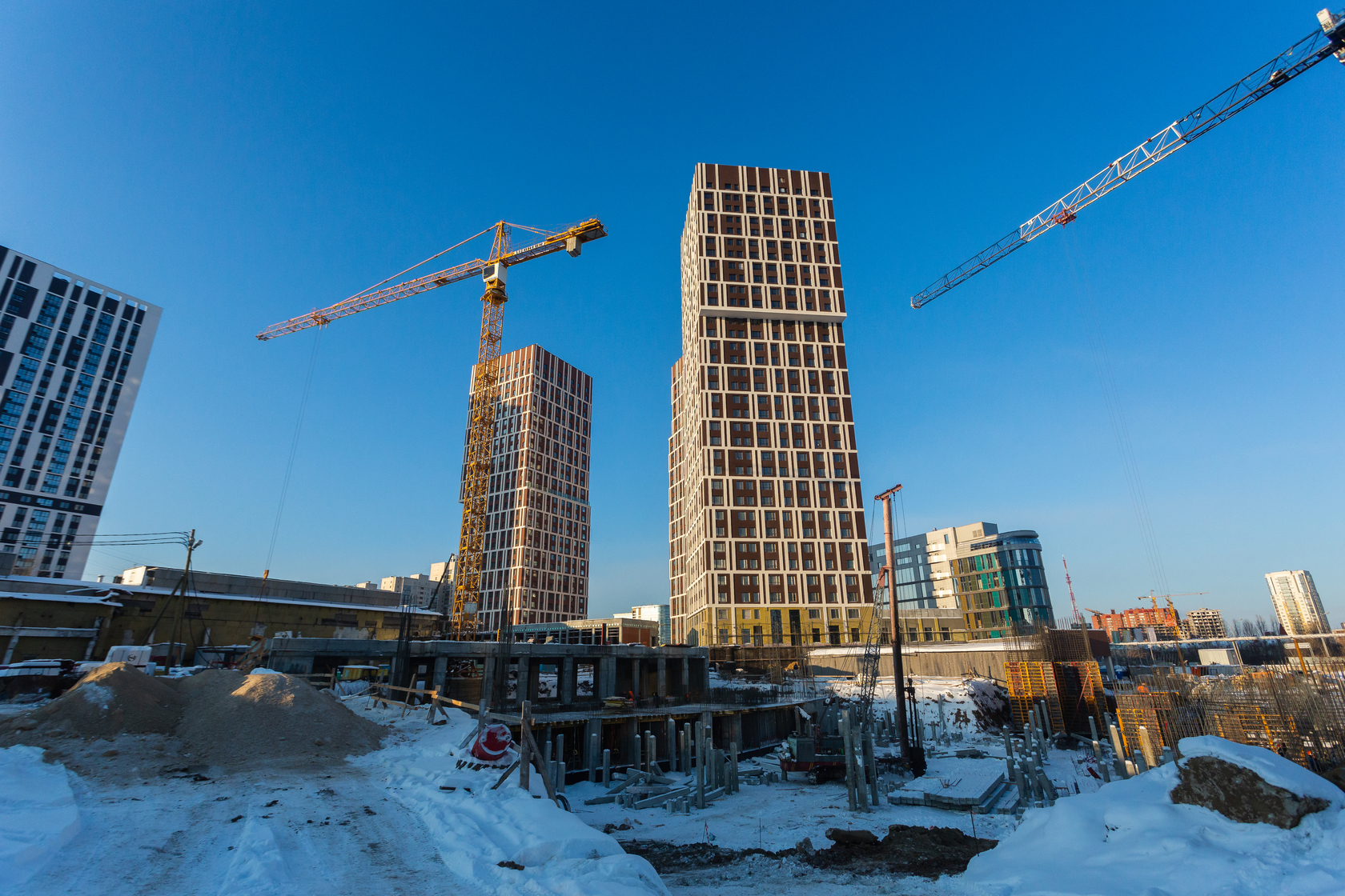 Возводим монолитные конструкции 15 этажа первого дома. Выполняем кирпичную кладку стен на 9–11 этажах. Возводим монолитные конструкции стен подземной части дома и паркинга. Выполнили котлован третьего жилого дома. Забиваем сваи третьего дома.