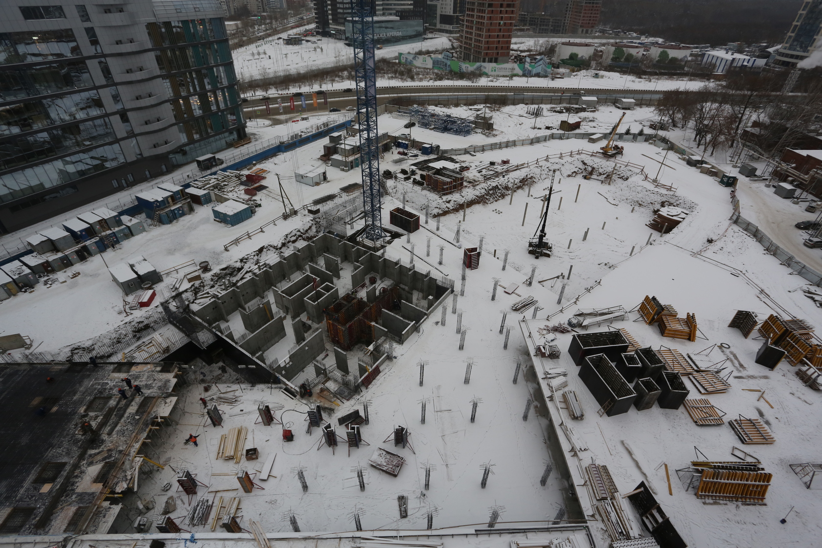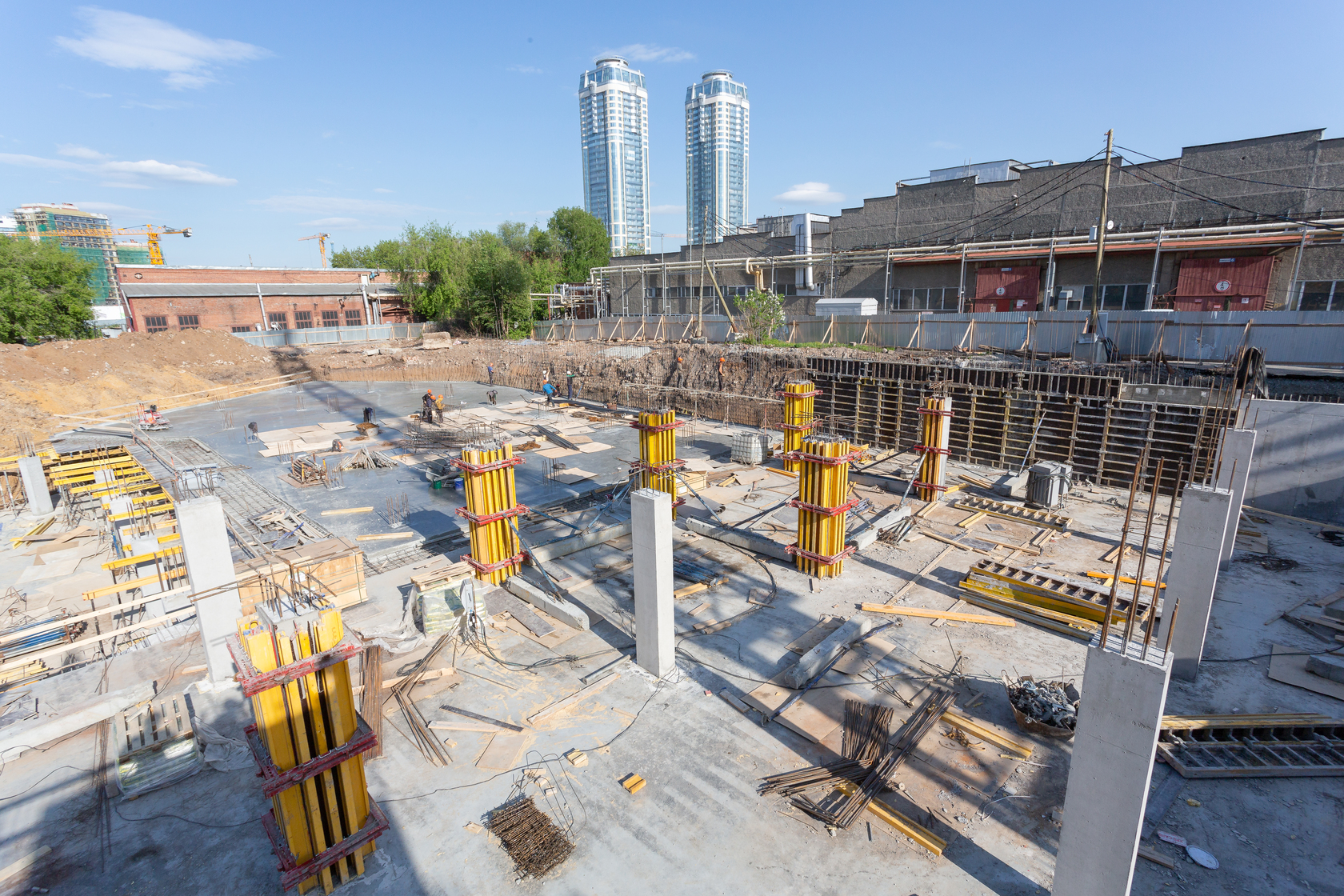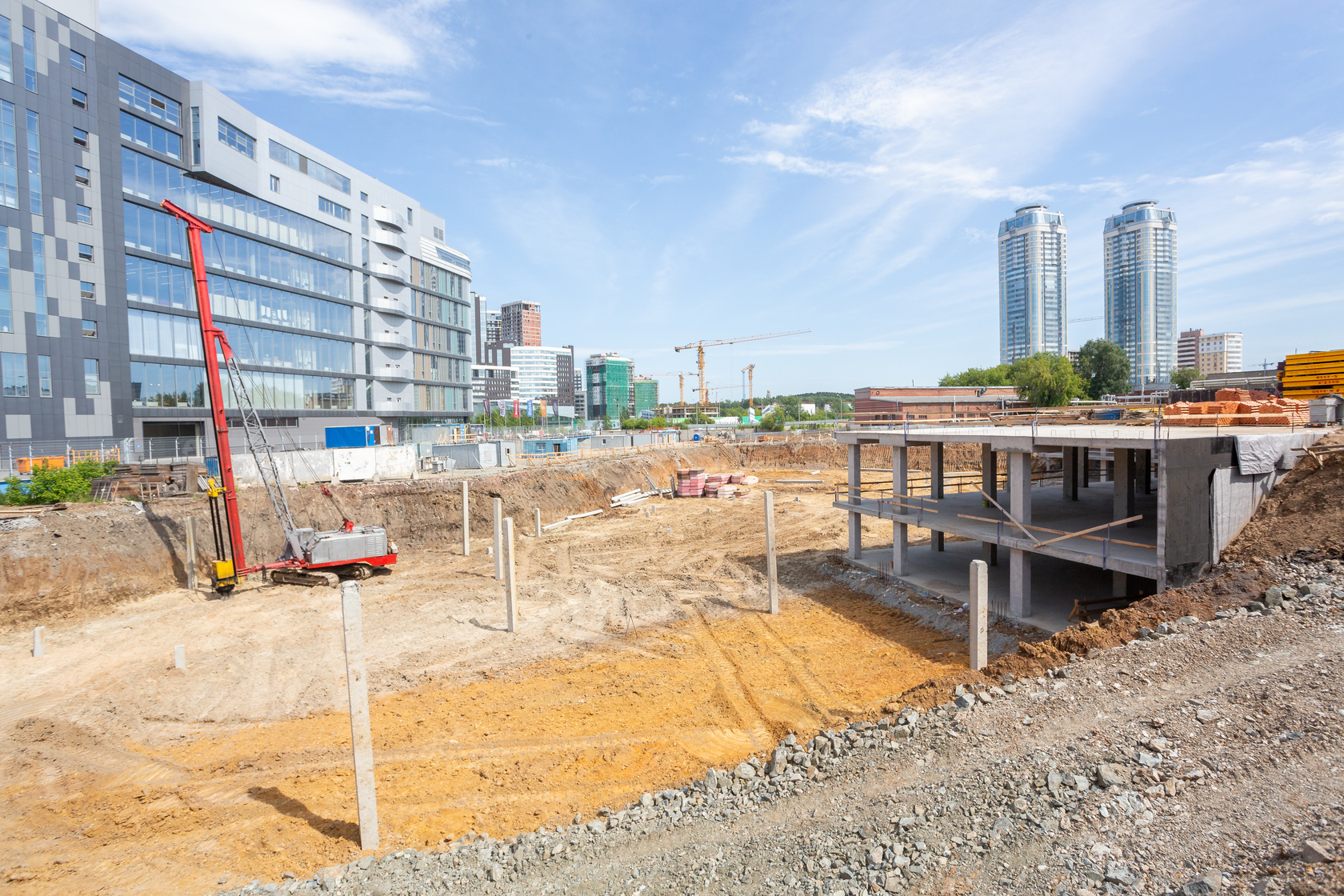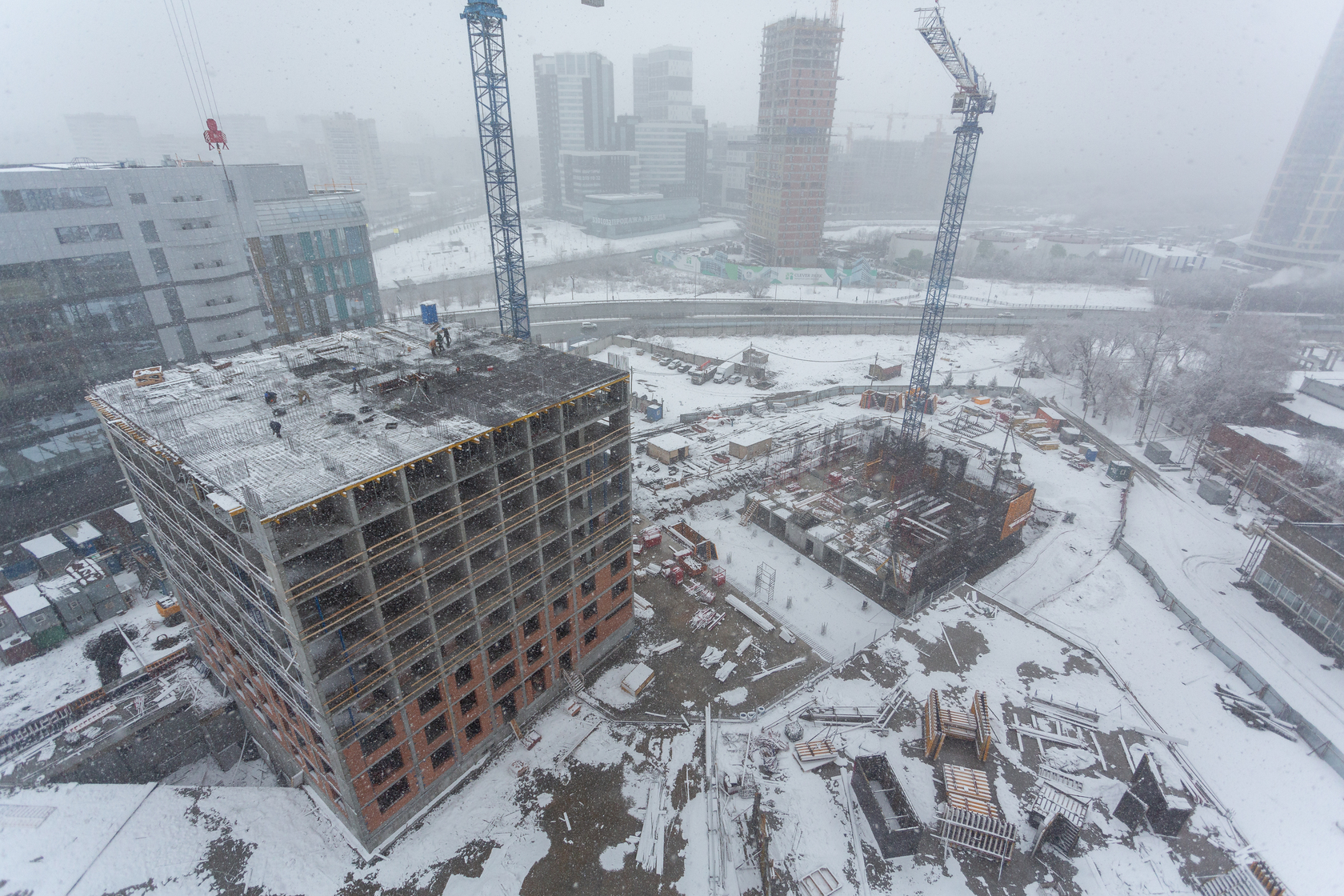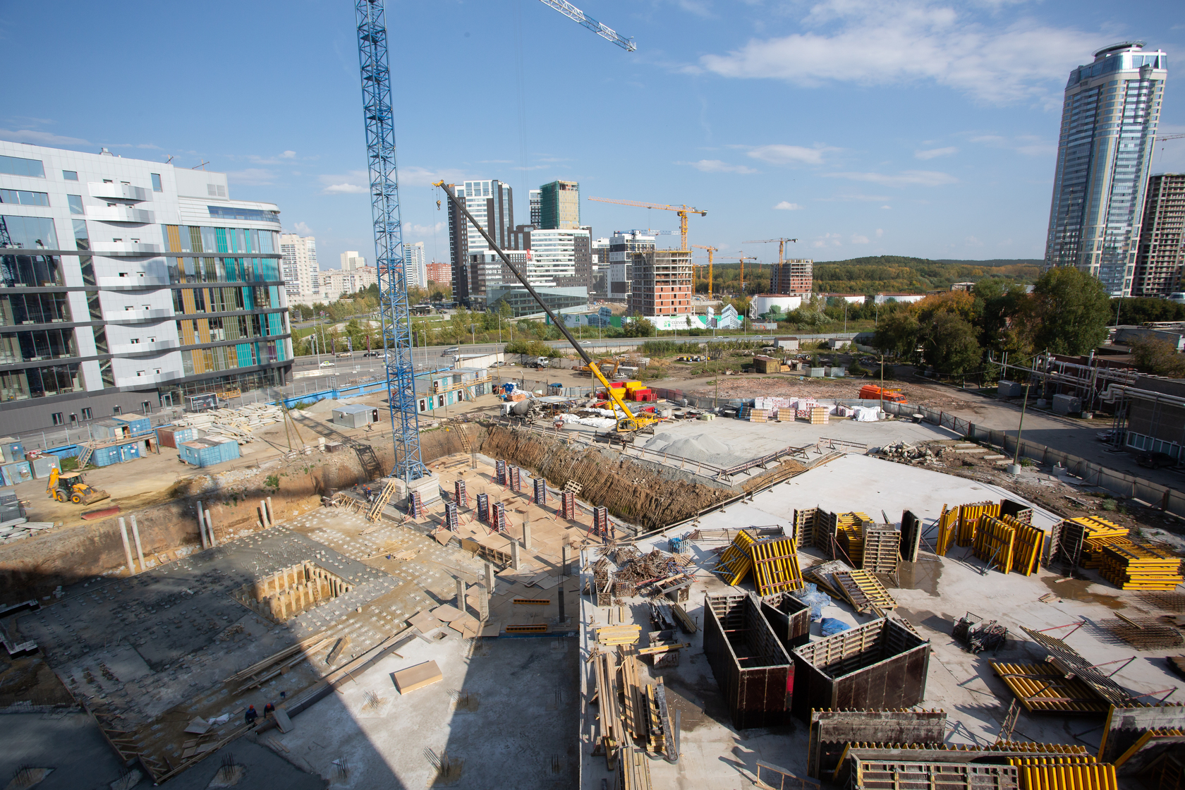 Возводим монолитные конструкции 15 этажа первого дома. Выполняем кирпичную кладку стен на 9–11 этажах. Возводим монолитные конструкции стен подземной части дома и паркинга. Выполнили котлован третьего жилого дома. Забиваем сваи третьего дома.