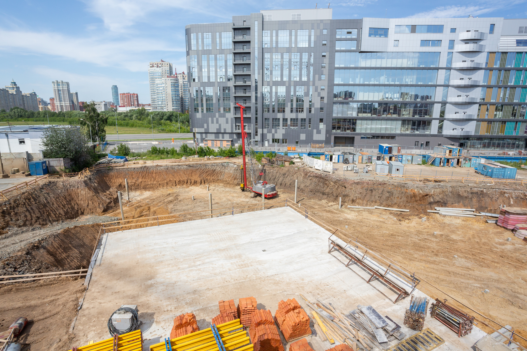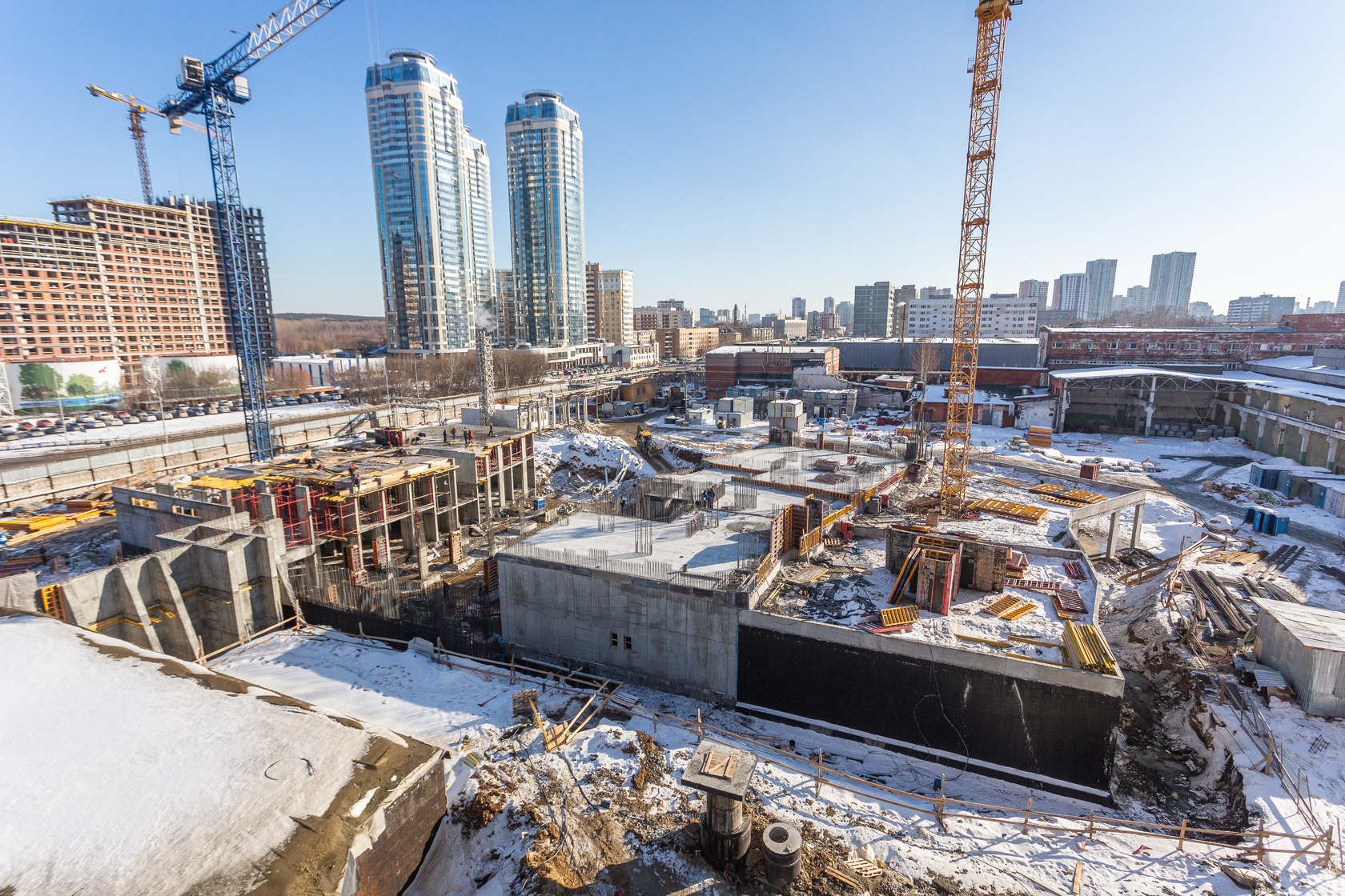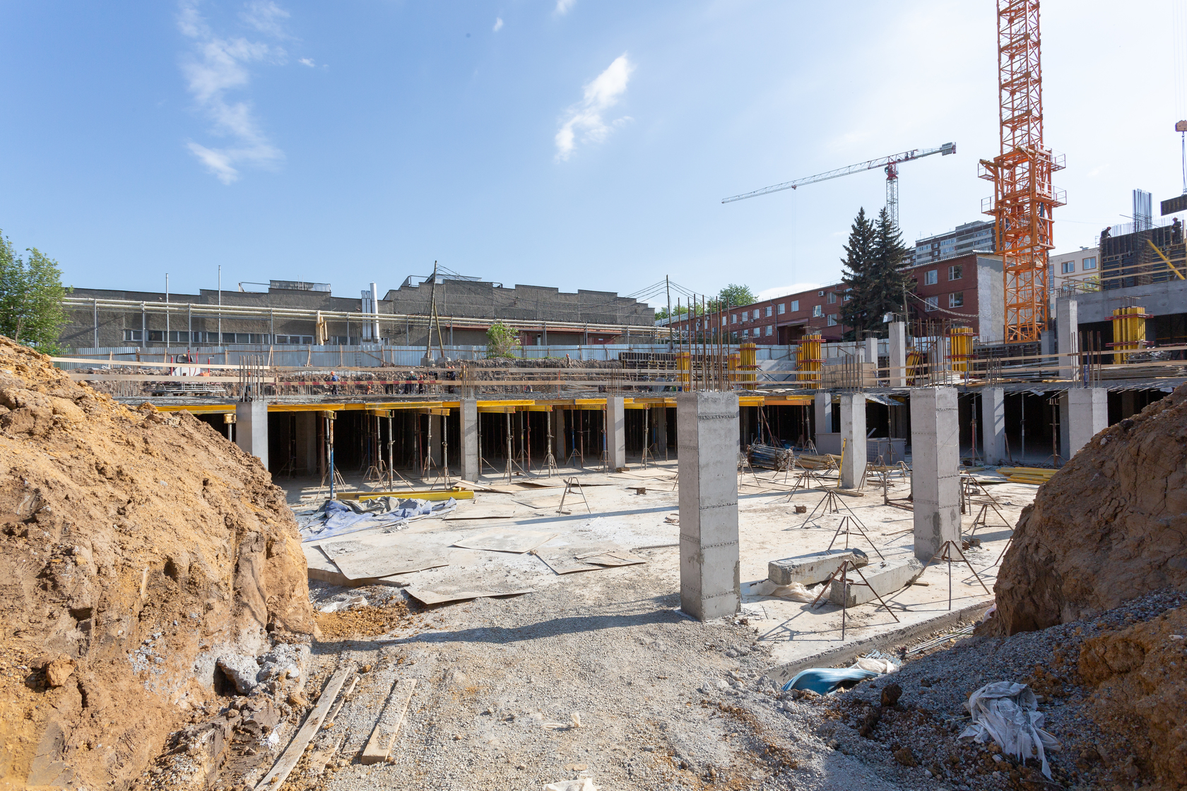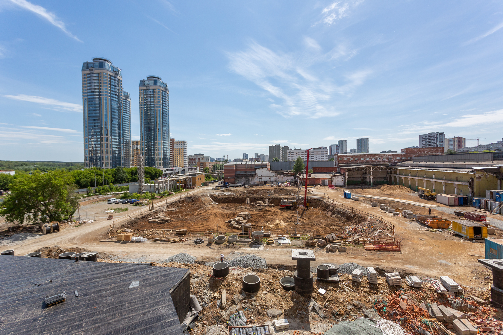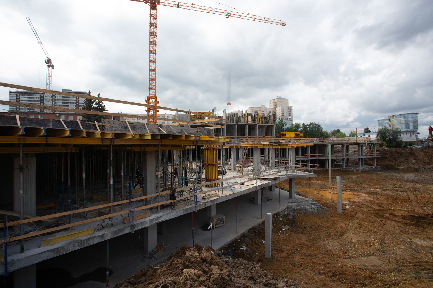 Возводим монолитные конструкции 15 этажа первого дома. Выполняем кирпичную кладку стен на 9–11 этажах. Возводим монолитные конструкции стен подземной части дома и паркинга. Выполнили котлован третьего жилого дома. Забиваем сваи третьего дома.