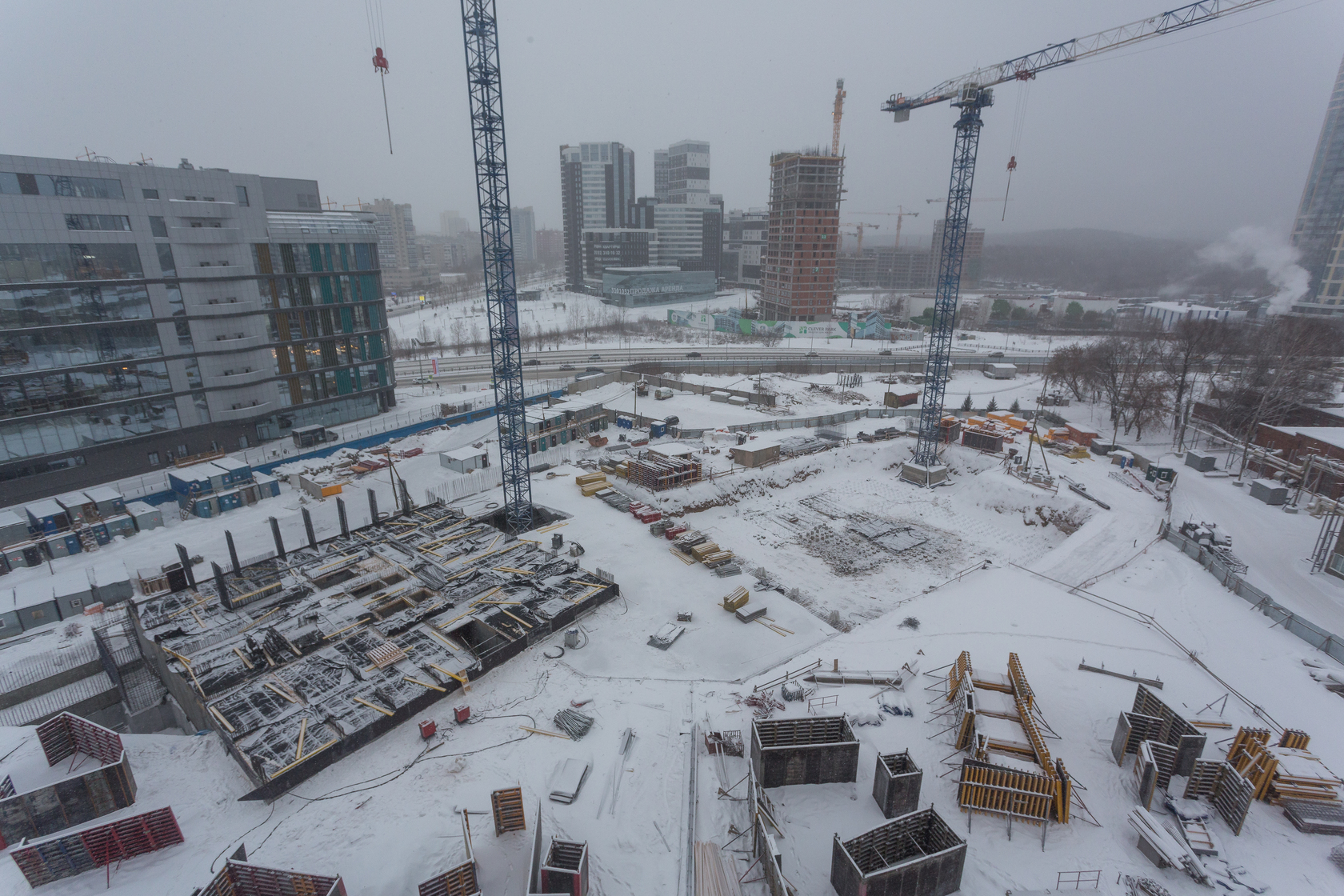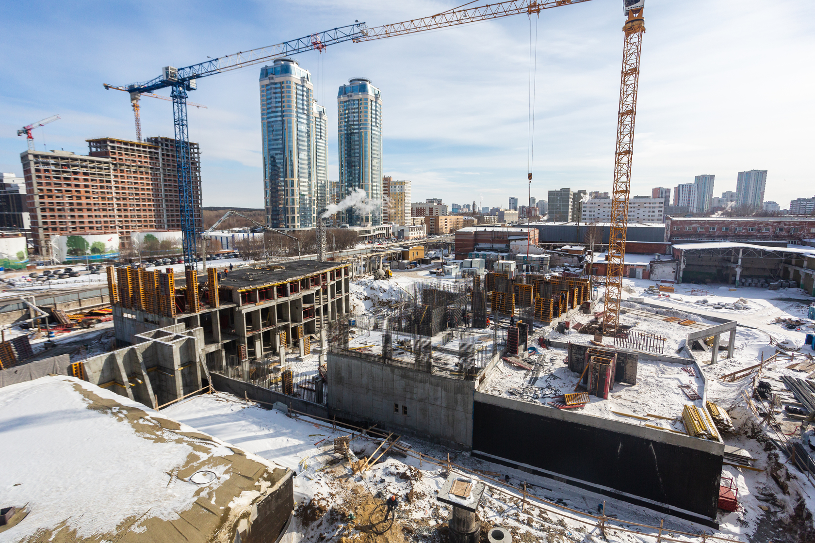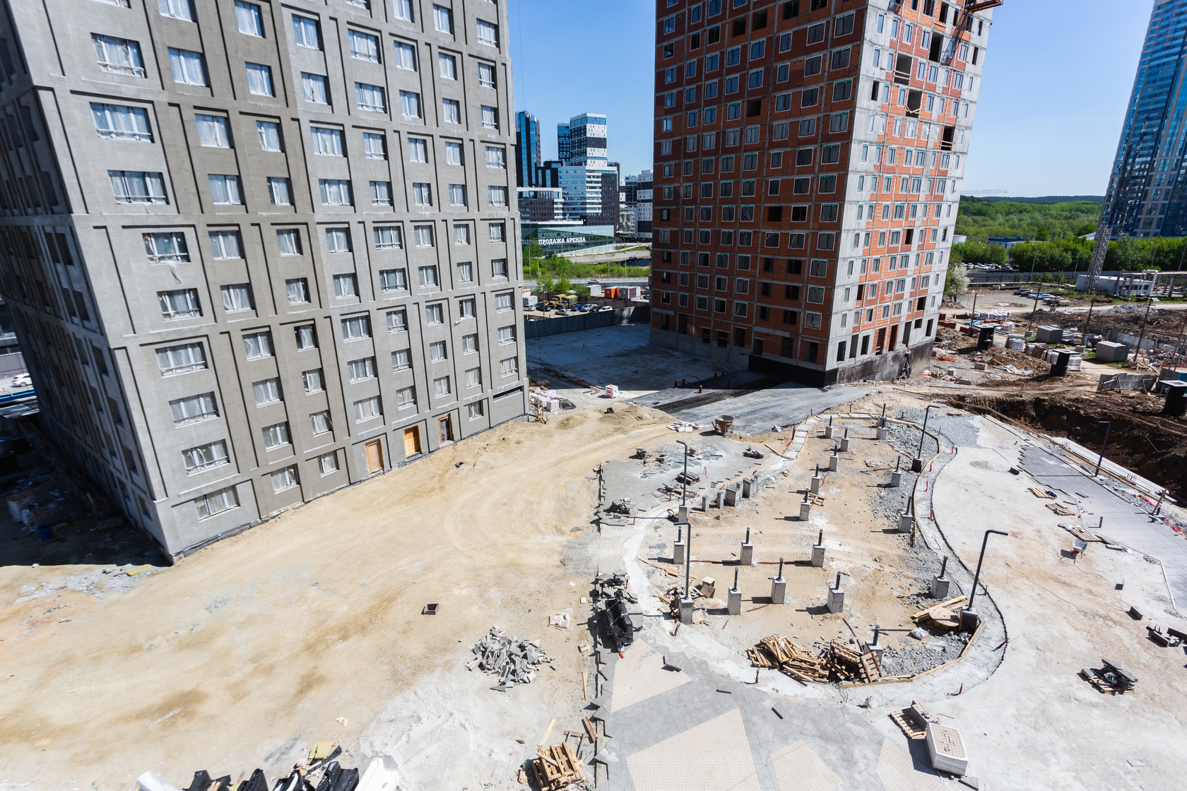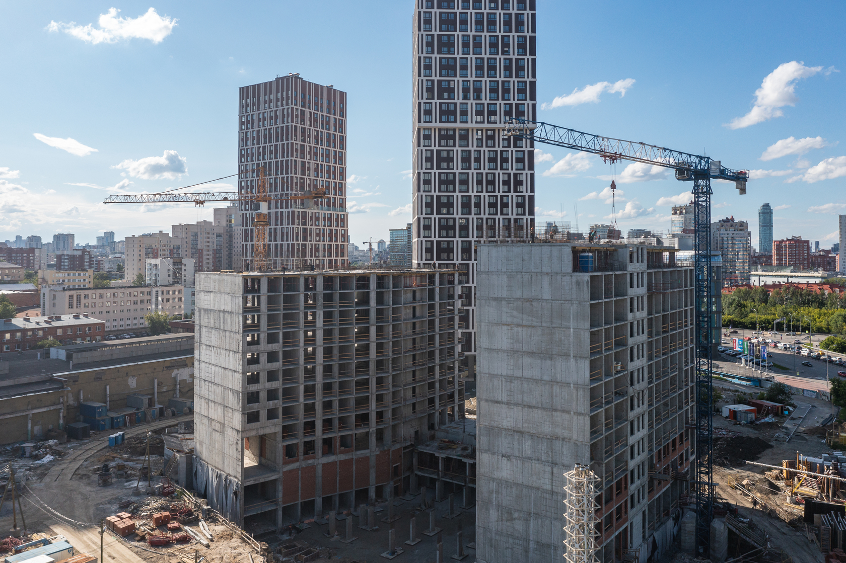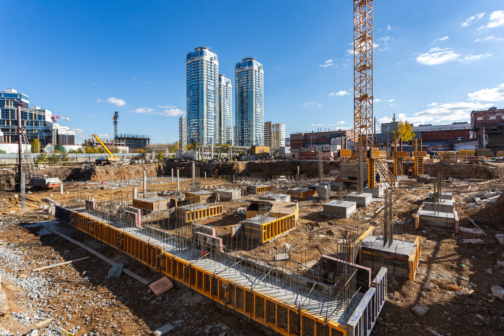 Возводим монолитные конструкции 15 этажа первого дома. Выполняем кирпичную кладку стен на 9–11 этажах. Возводим монолитные конструкции стен подземной части дома и паркинга. Выполнили котлован третьего жилого дома. Забиваем сваи третьего дома.