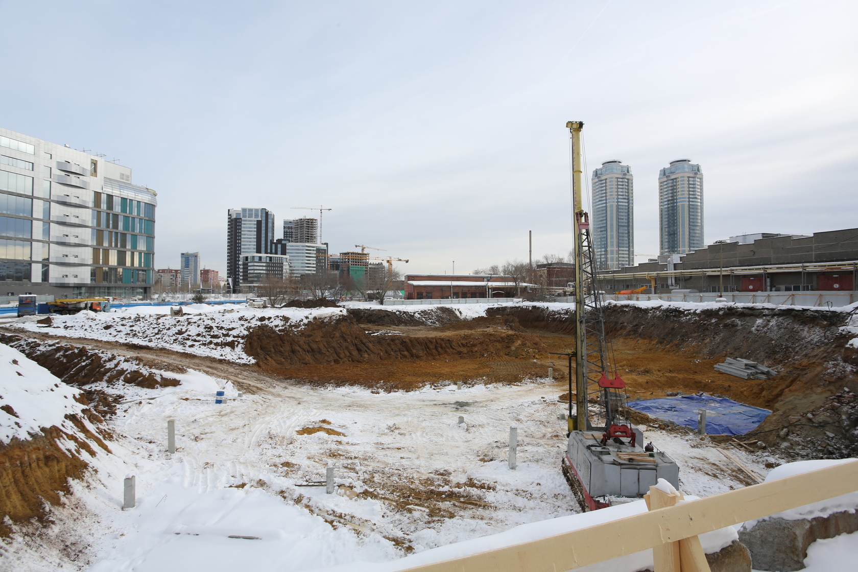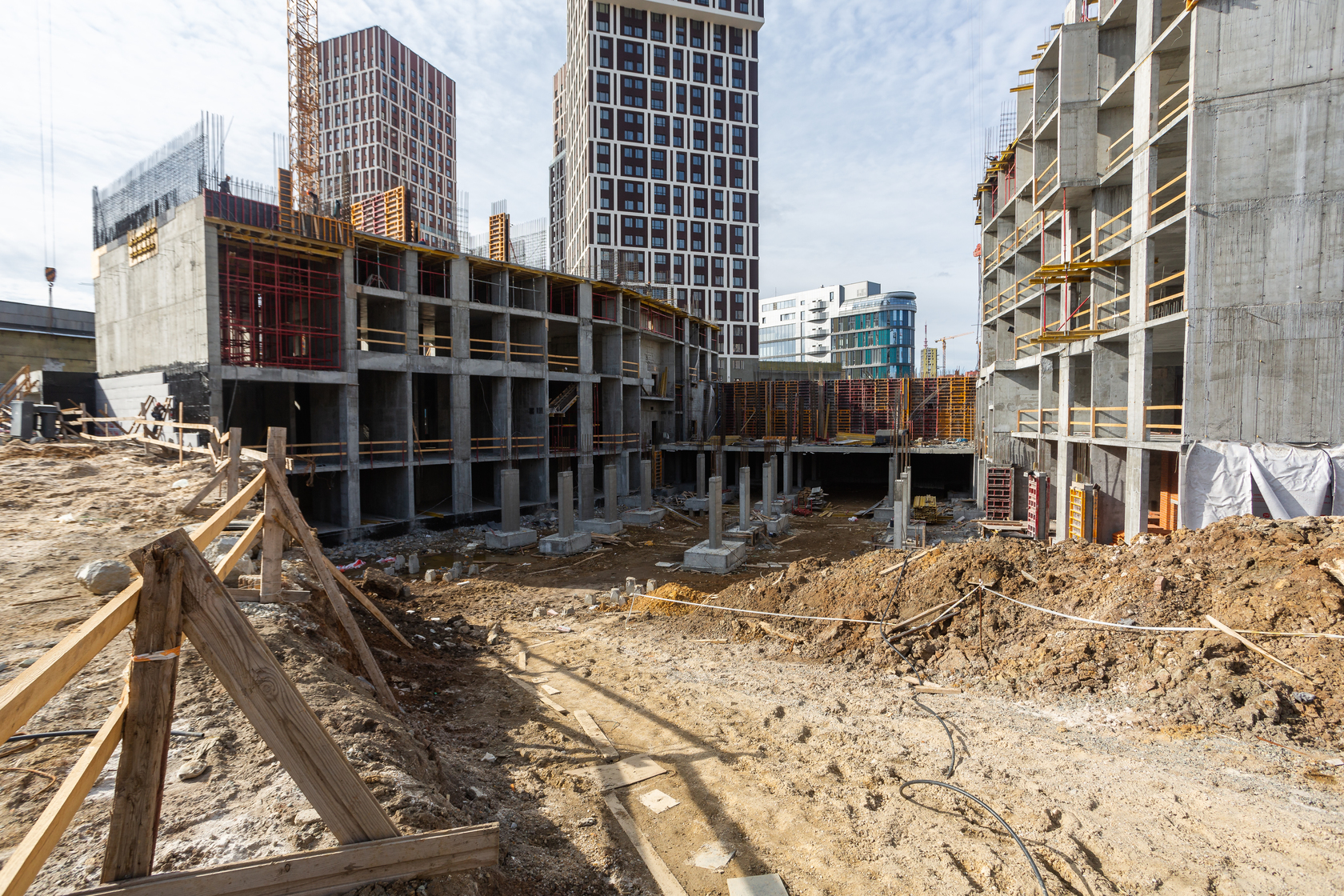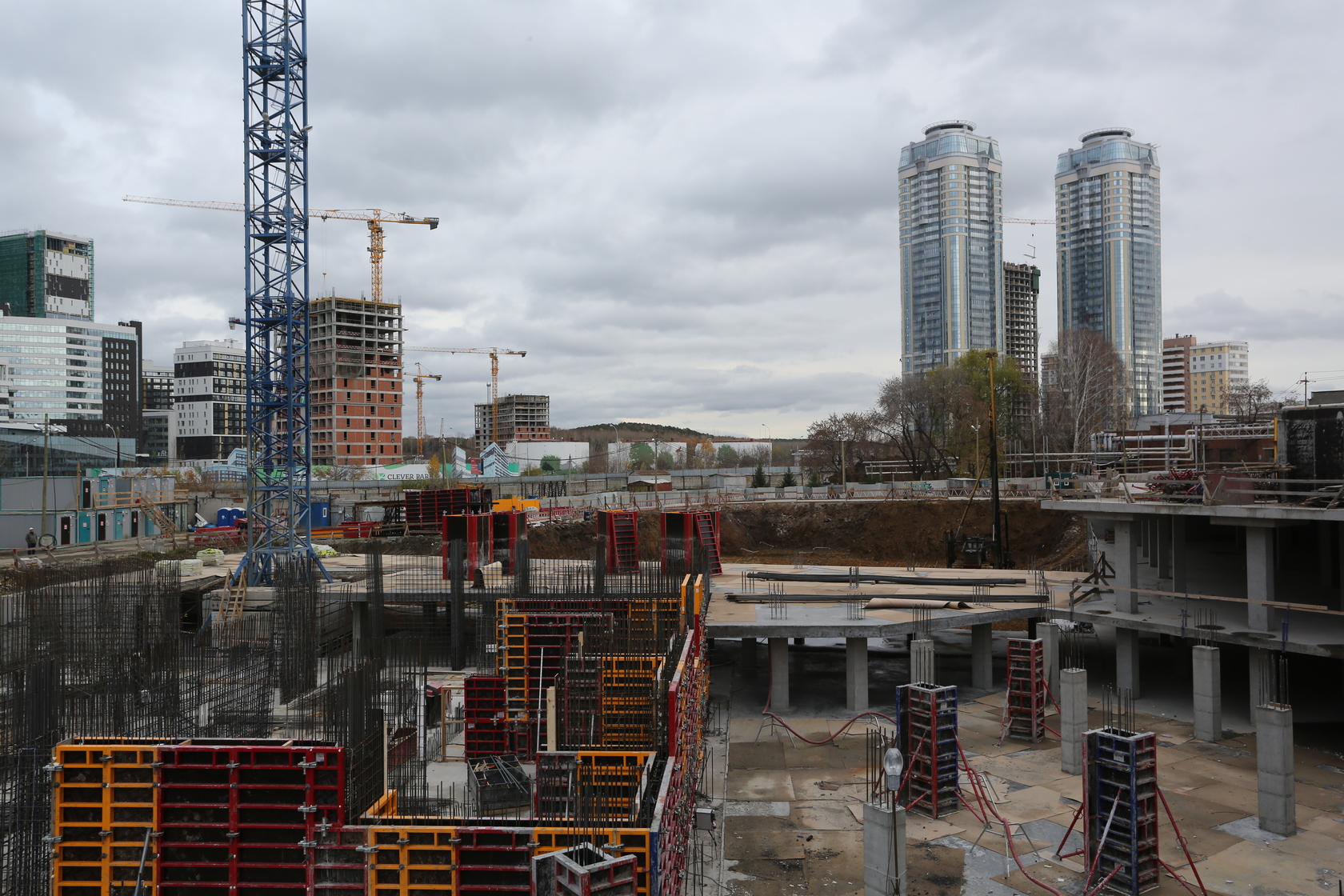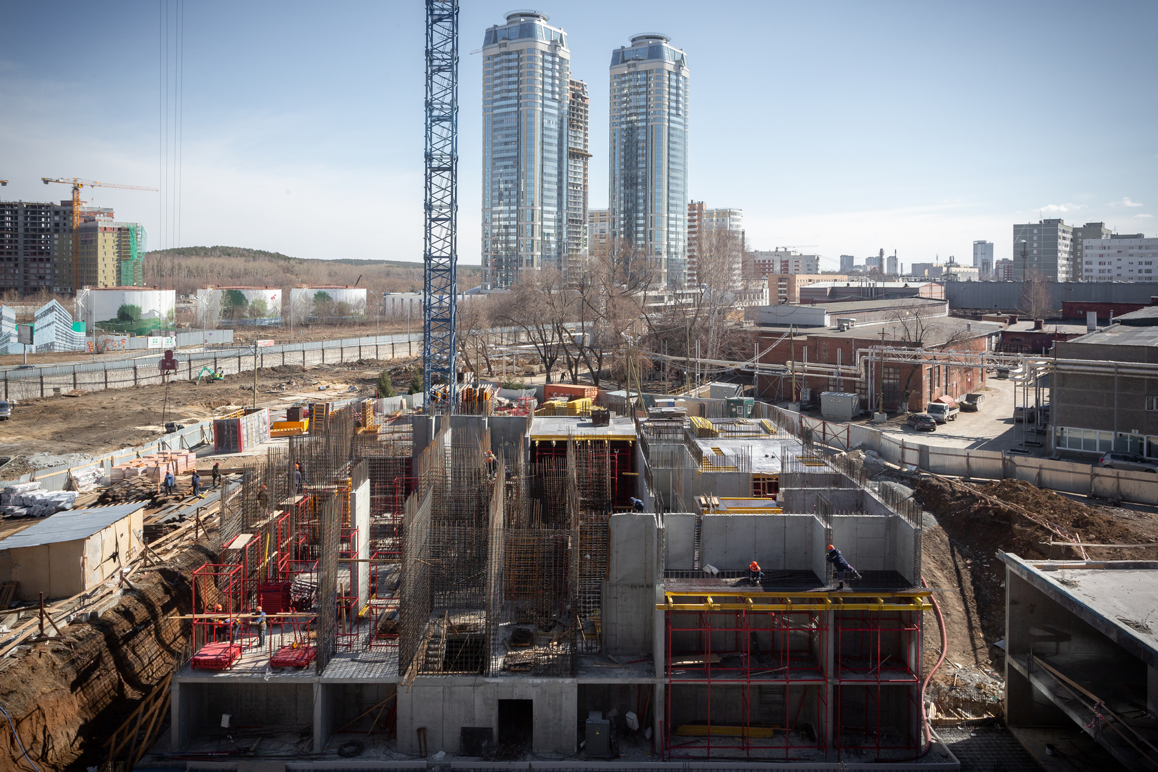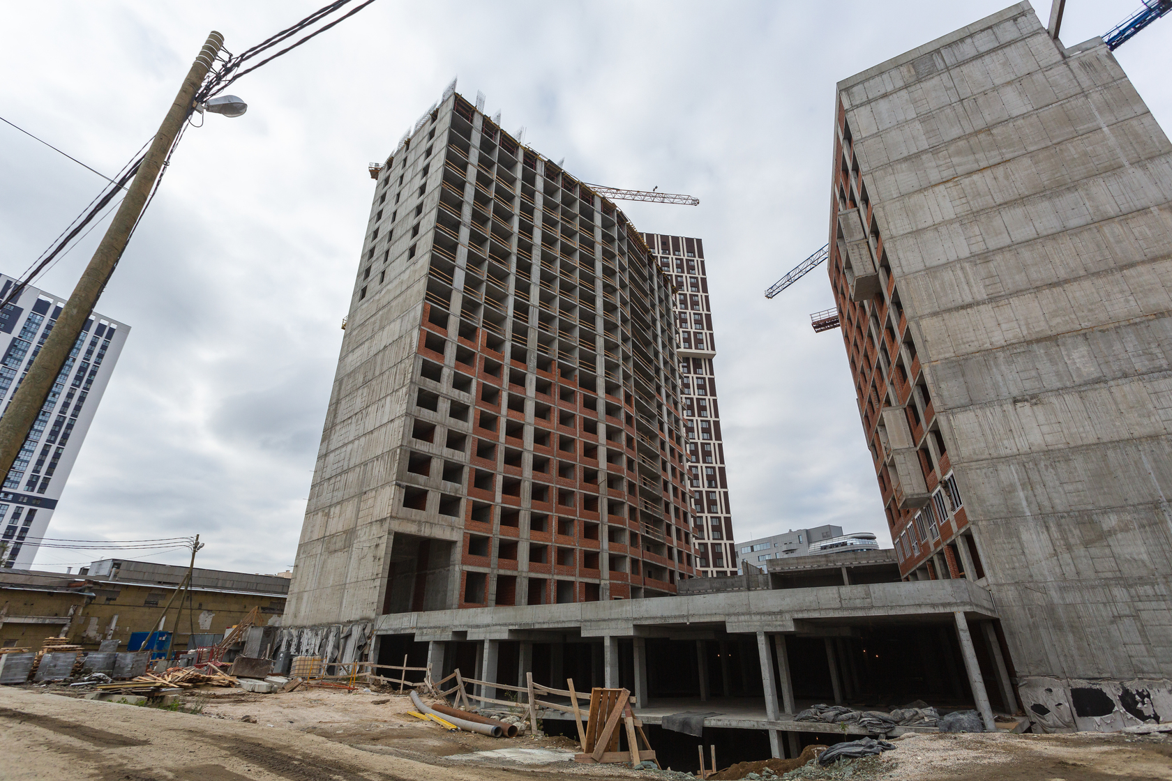 Возводим монолитные конструкции 15 этажа первого дома. Выполняем кирпичную кладку стен на 9–11 этажах. Возводим монолитные конструкции стен подземной части дома и паркинга. Выполнили котлован третьего жилого дома. Забиваем сваи третьего дома.