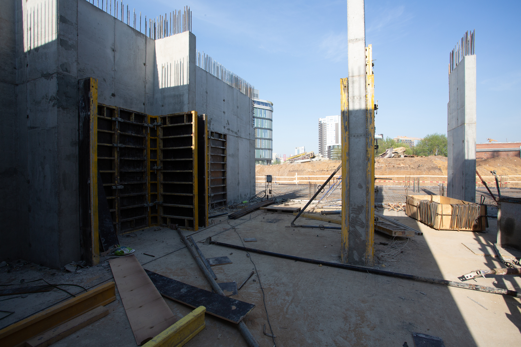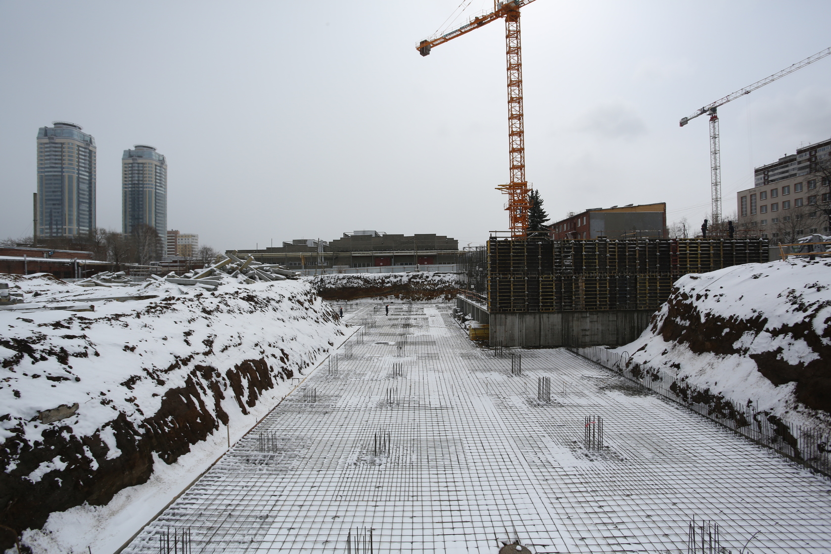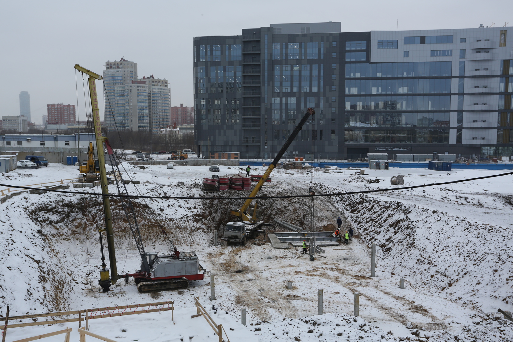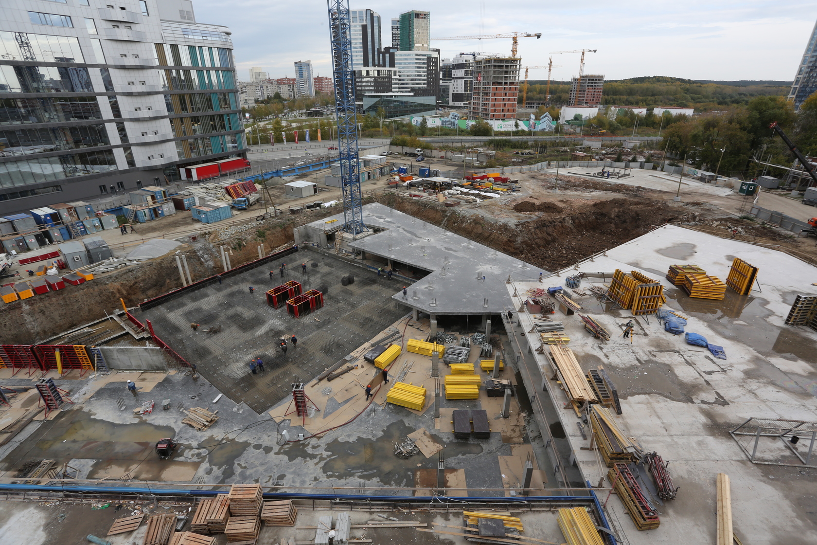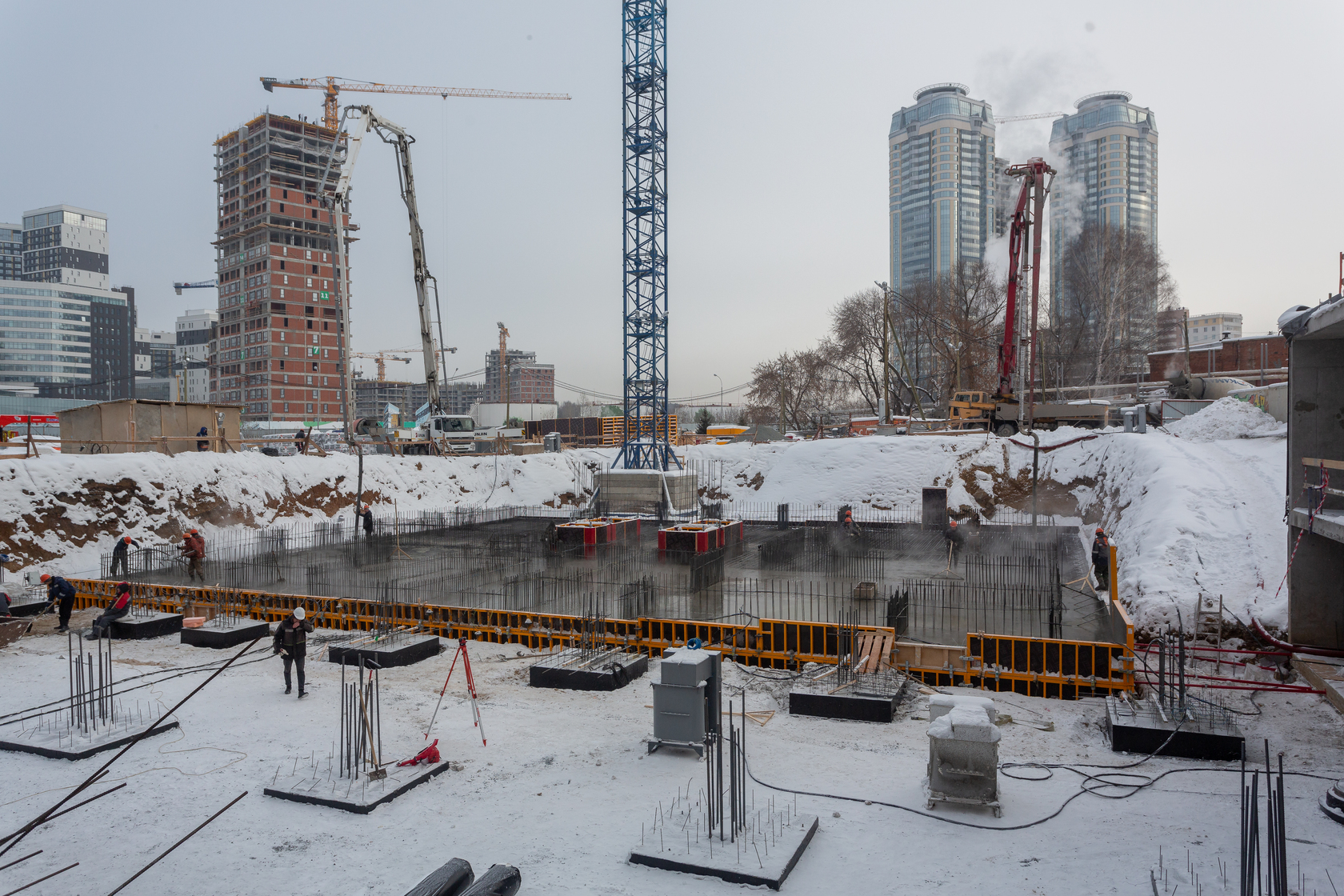 Возводим монолитные конструкции 15 этажа первого дома. Выполняем кирпичную кладку стен на 9–11 этажах. Возводим монолитные конструкции стен подземной части дома и паркинга. Выполнили котлован третьего жилого дома. Забиваем сваи третьего дома.