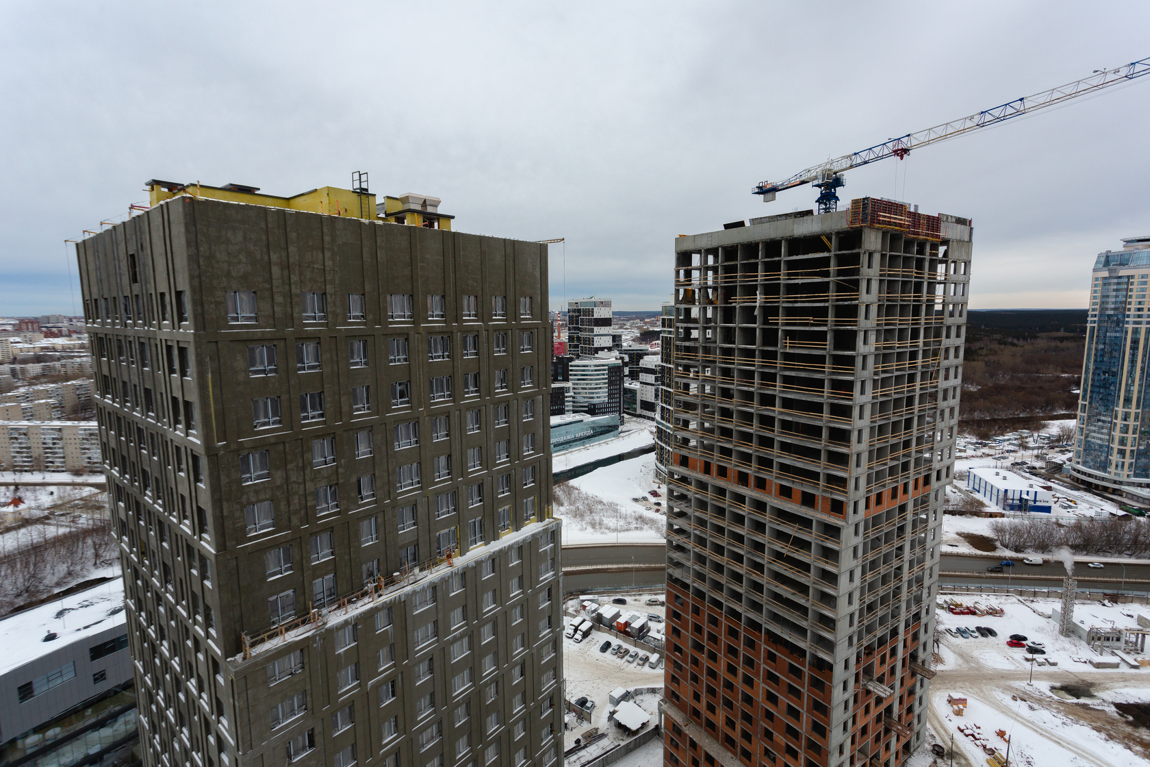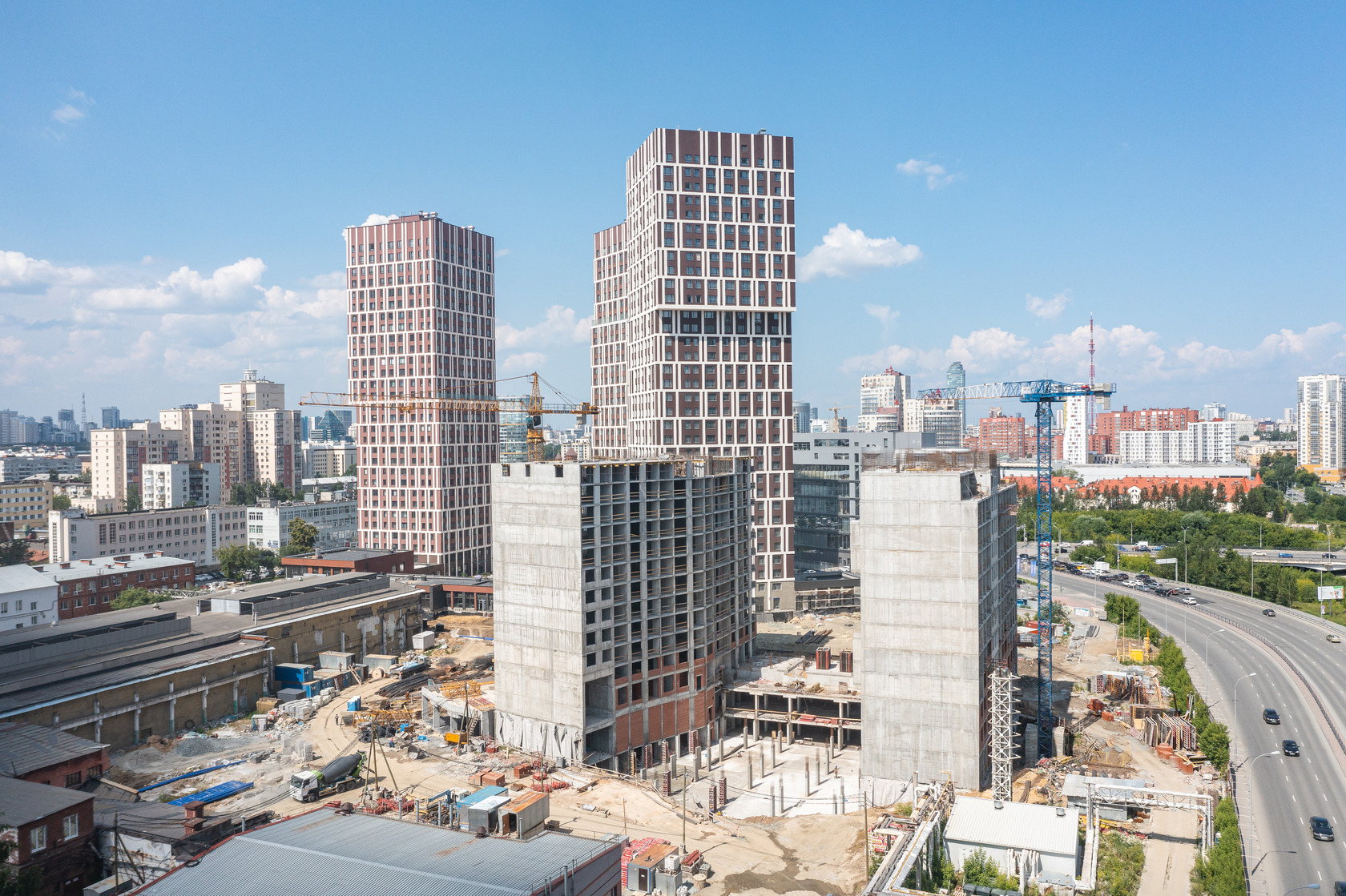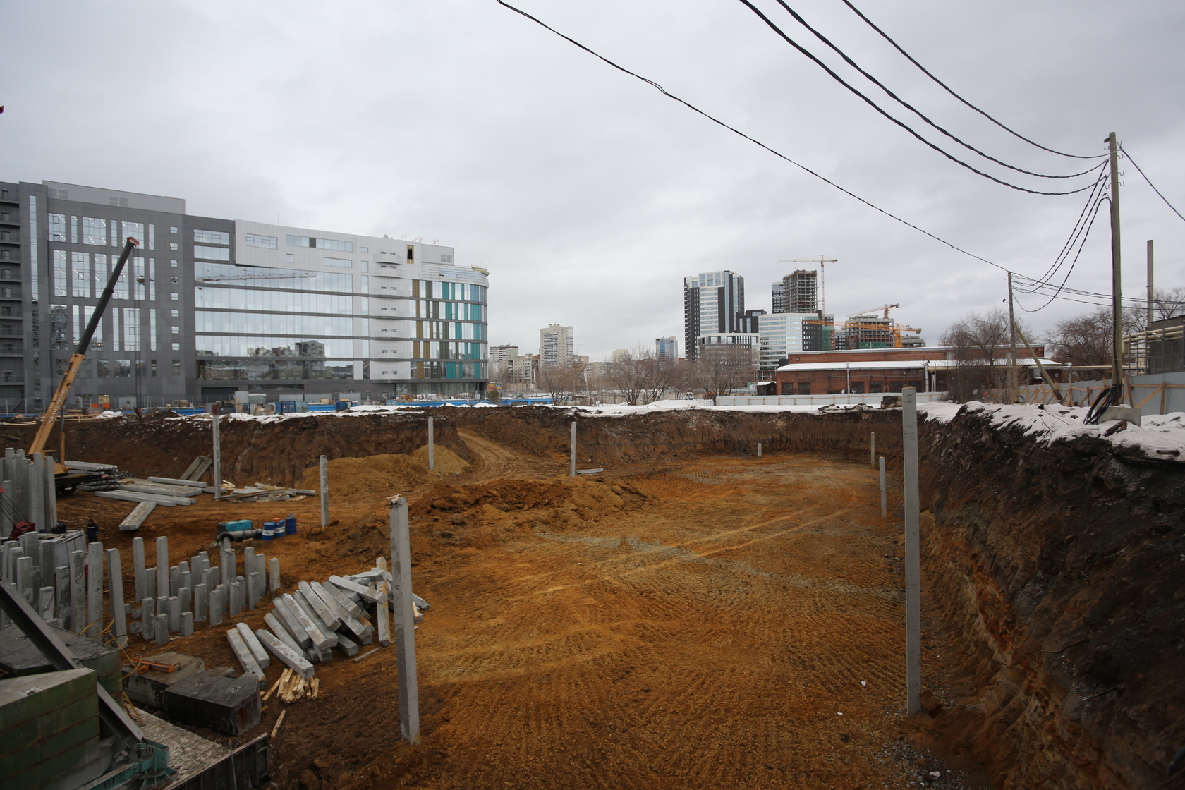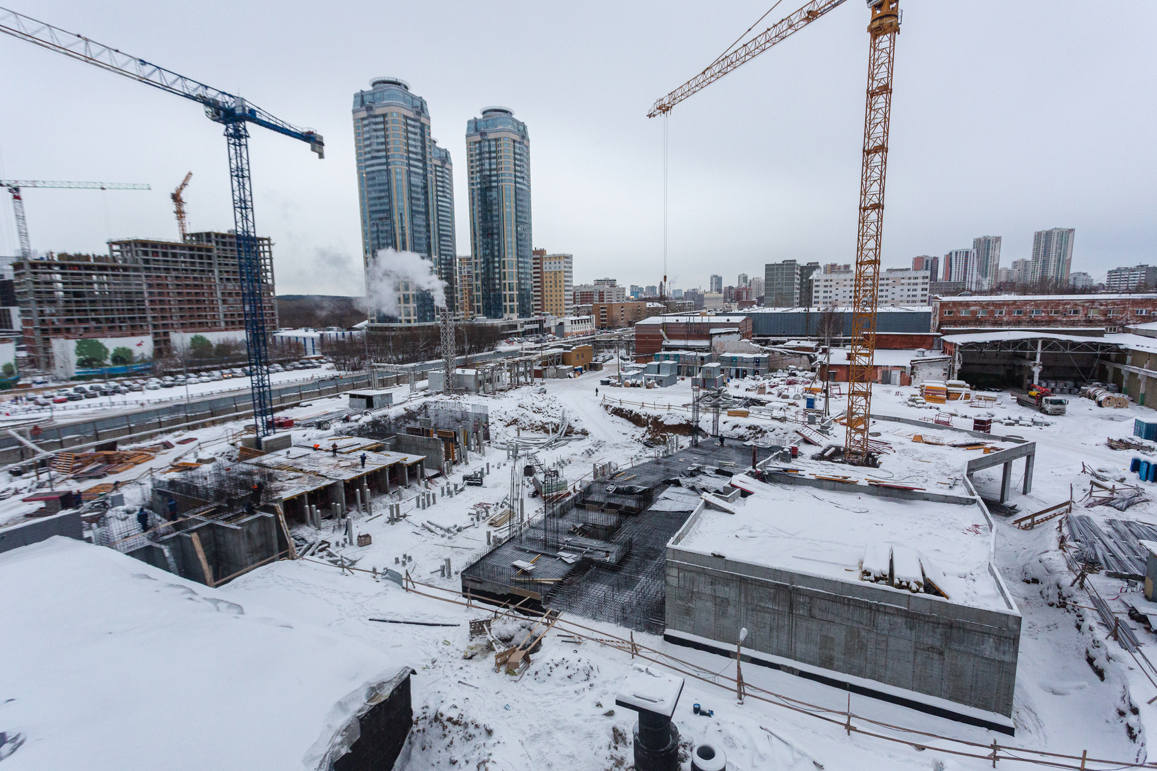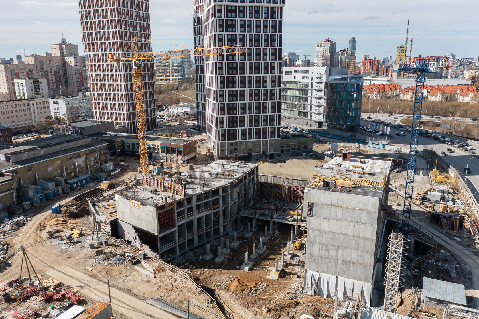 Возводим монолитные конструкции 15 этажа первого дома. Выполняем кирпичную кладку стен на 9–11 этажах. Возводим монолитные конструкции стен подземной части дома и паркинга. Выполнили котлован третьего жилого дома. Забиваем сваи третьего дома.