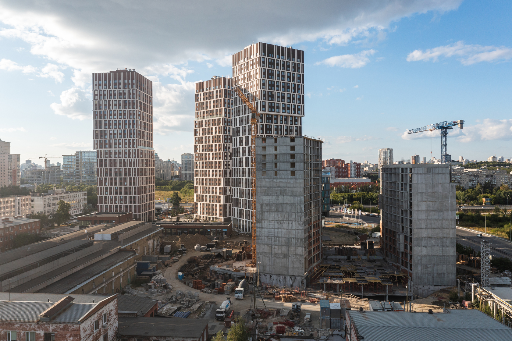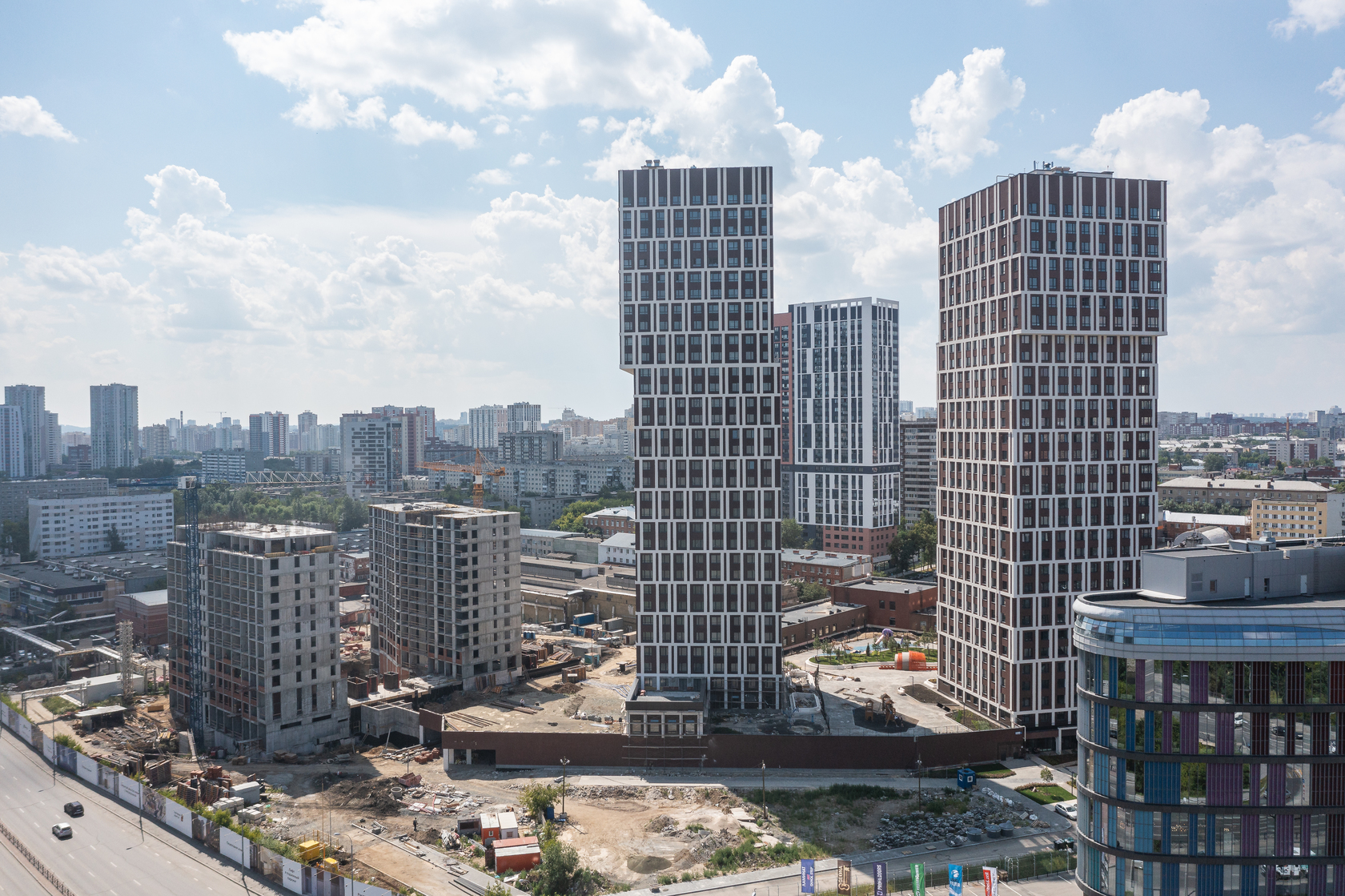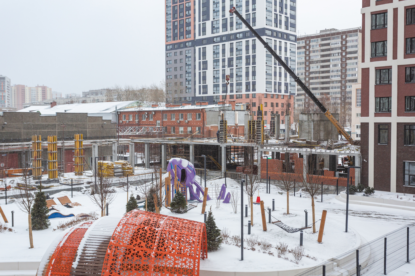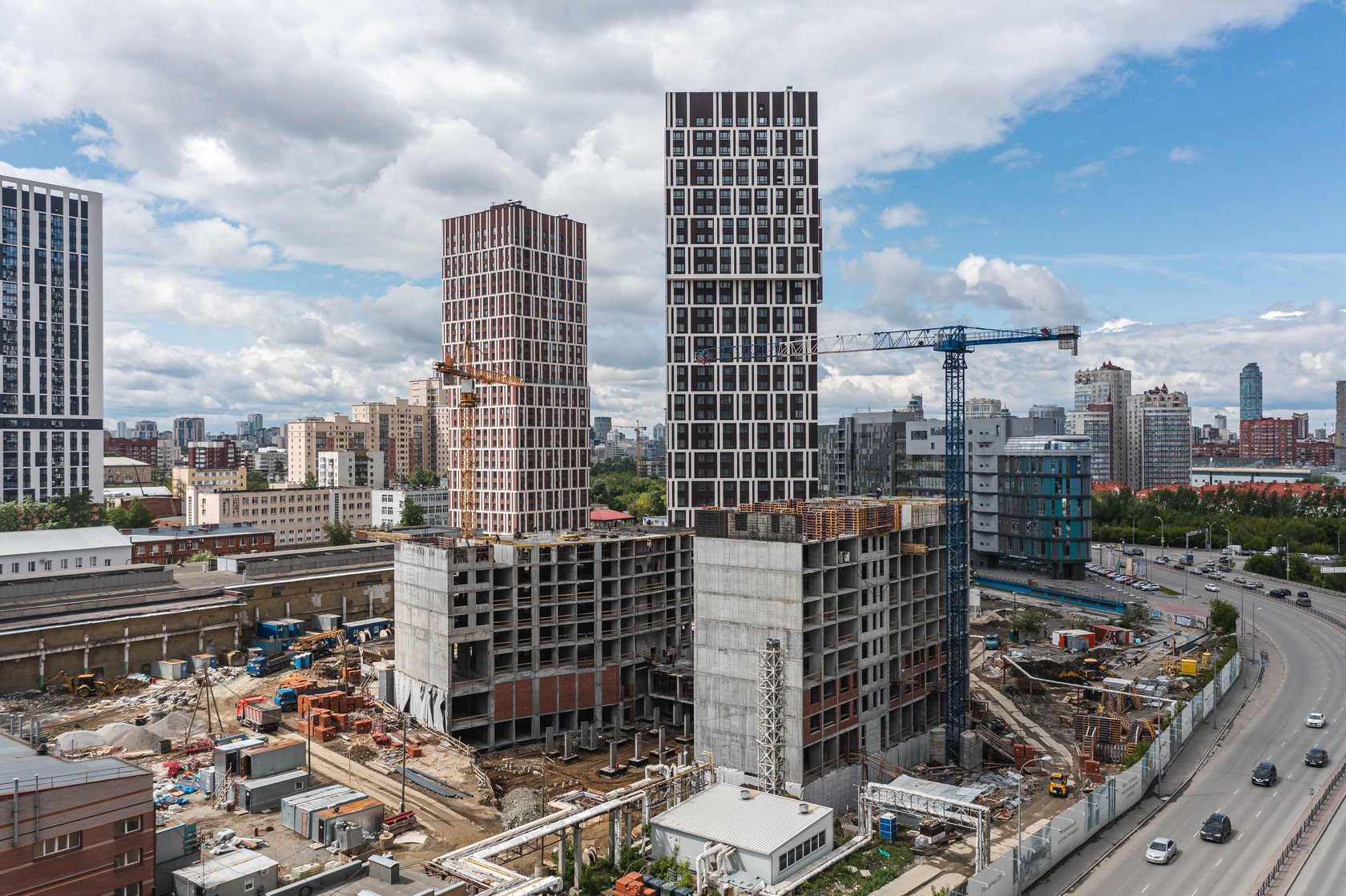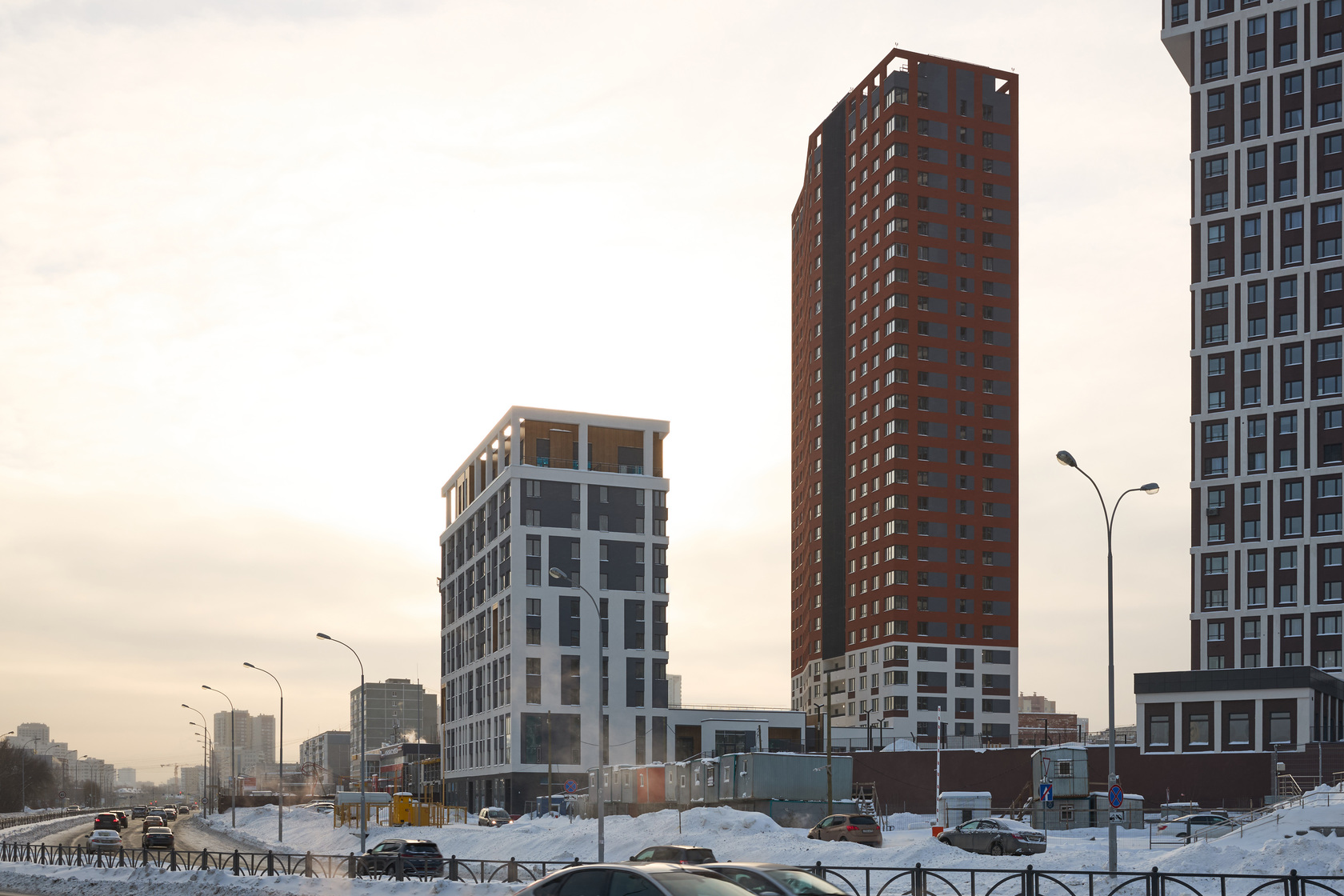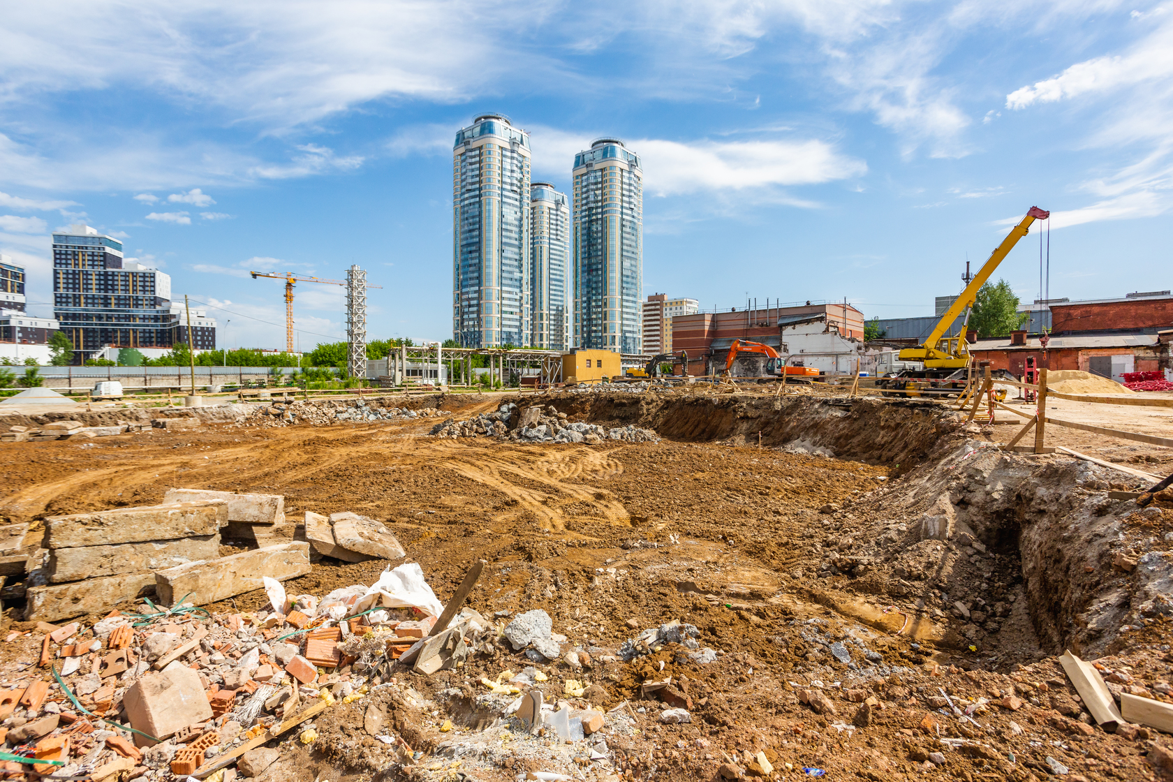 Возводим монолитные конструкции 15 этажа первого дома. Выполняем кирпичную кладку стен на 9–11 этажах. Возводим монолитные конструкции стен подземной части дома и паркинга. Выполнили котлован третьего жилого дома. Забиваем сваи третьего дома.