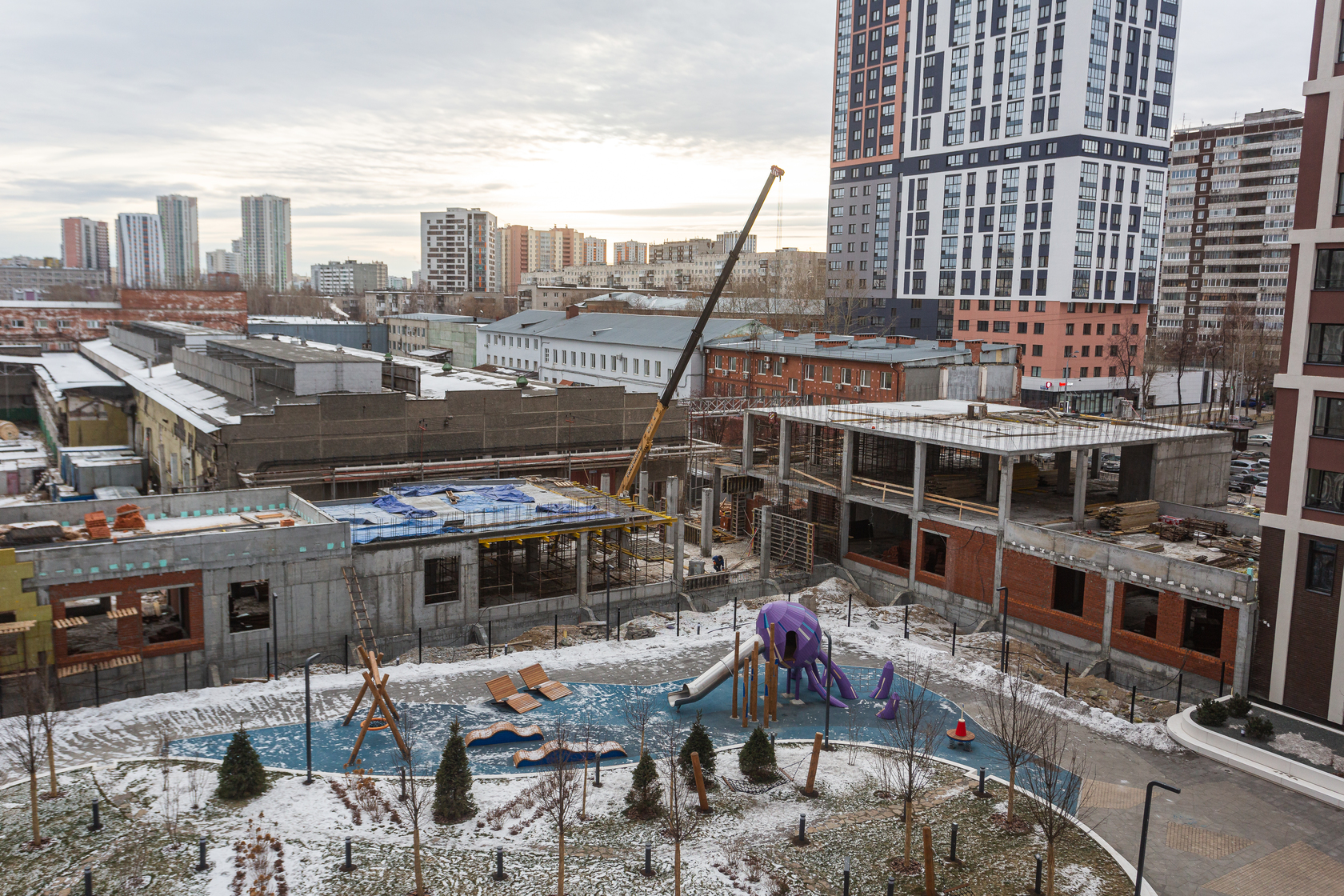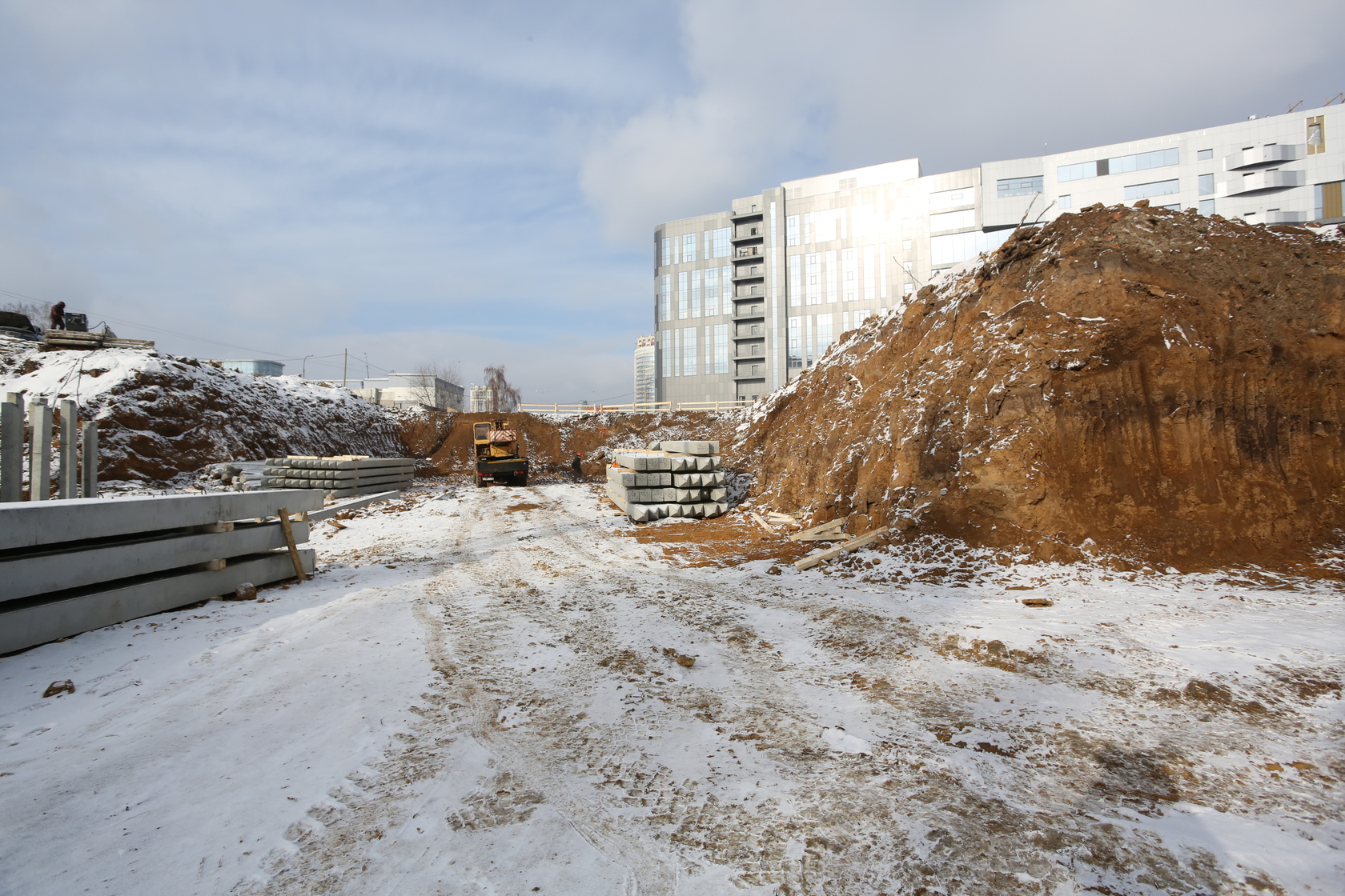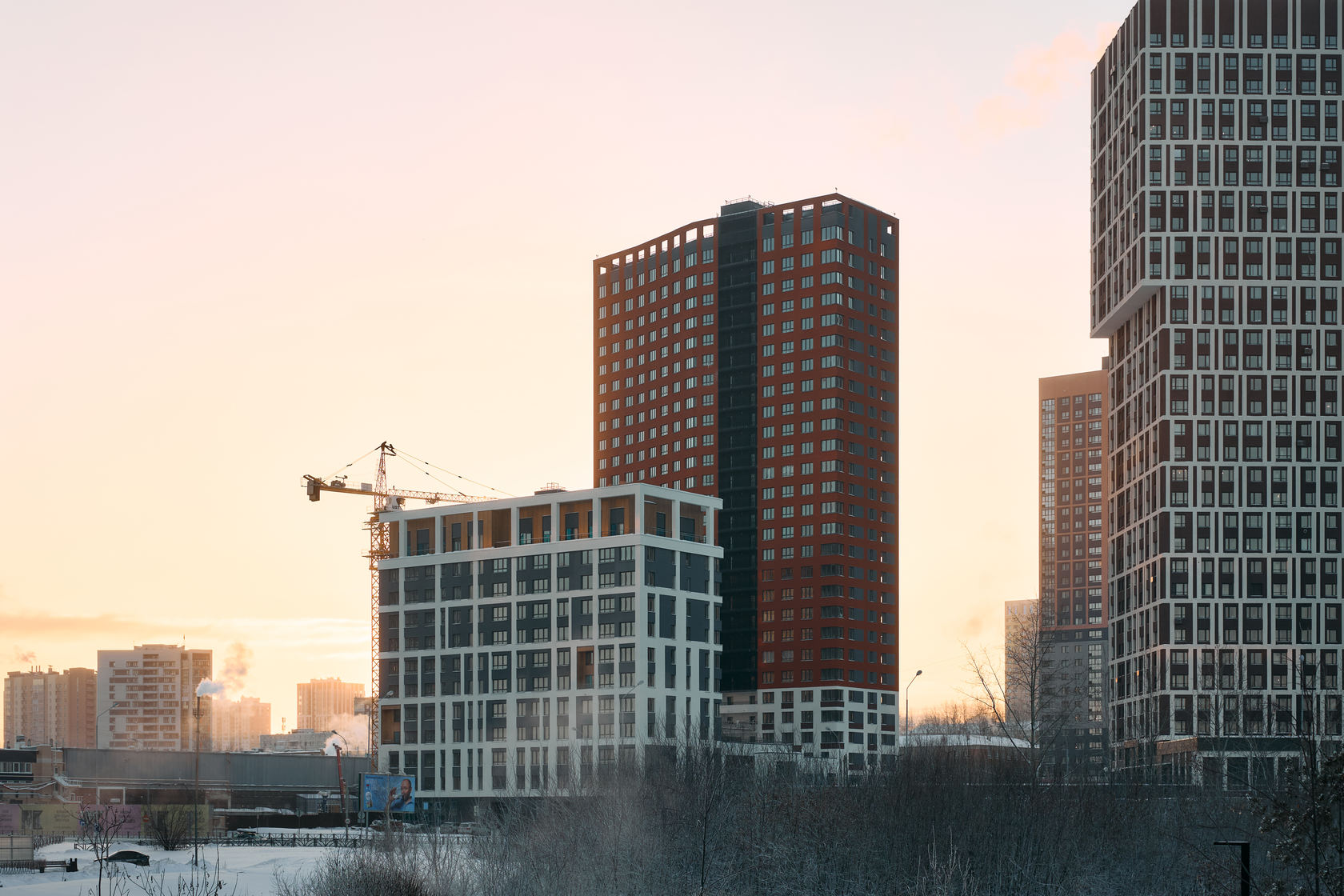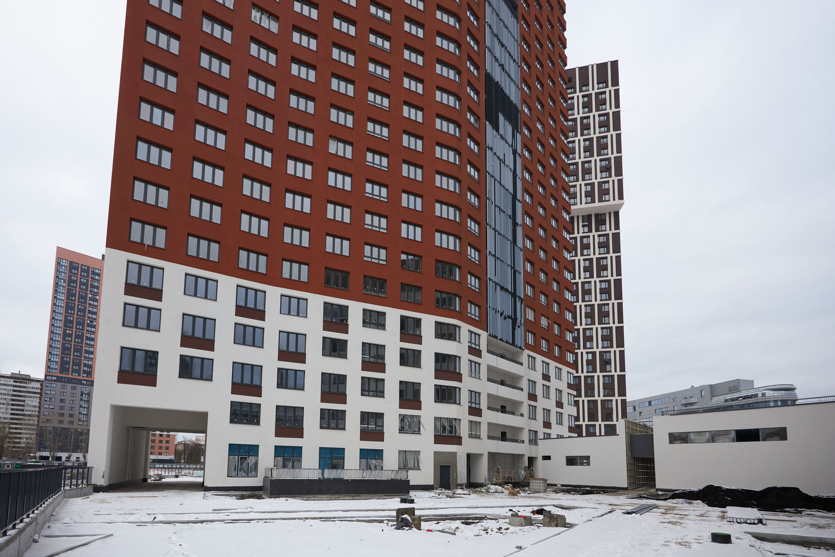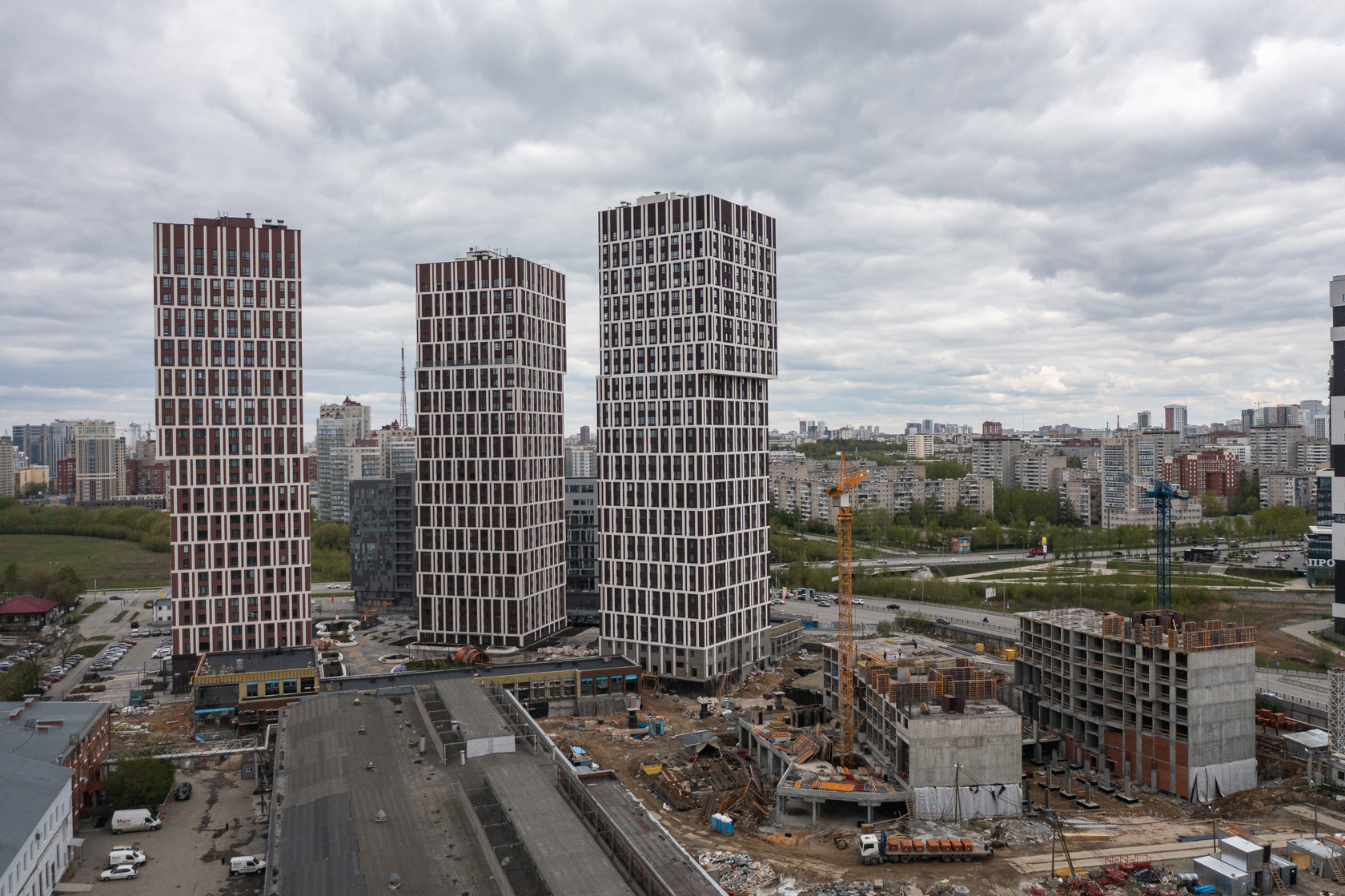 Возводим монолитные конструкции 15 этажа первого дома. Выполняем кирпичную кладку стен на 9–11 этажах. Возводим монолитные конструкции стен подземной части дома и паркинга. Выполнили котлован третьего жилого дома. Забиваем сваи третьего дома.