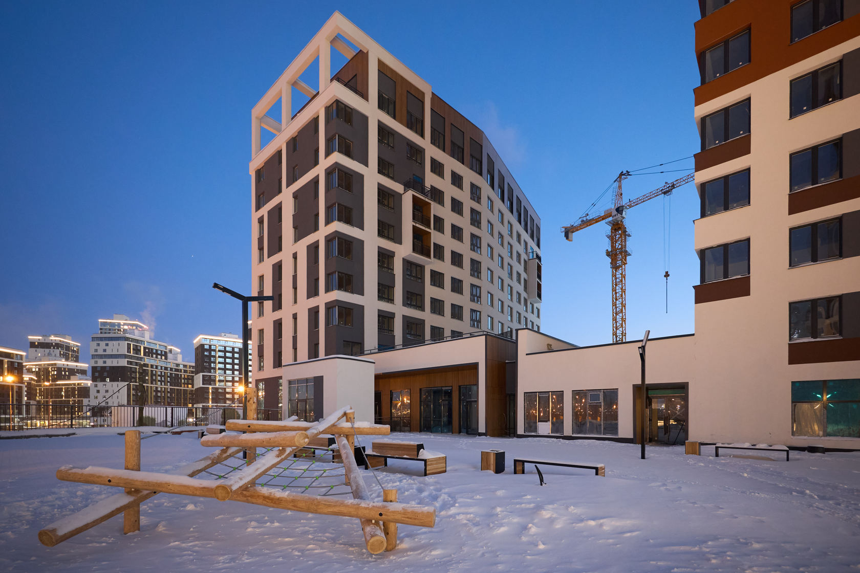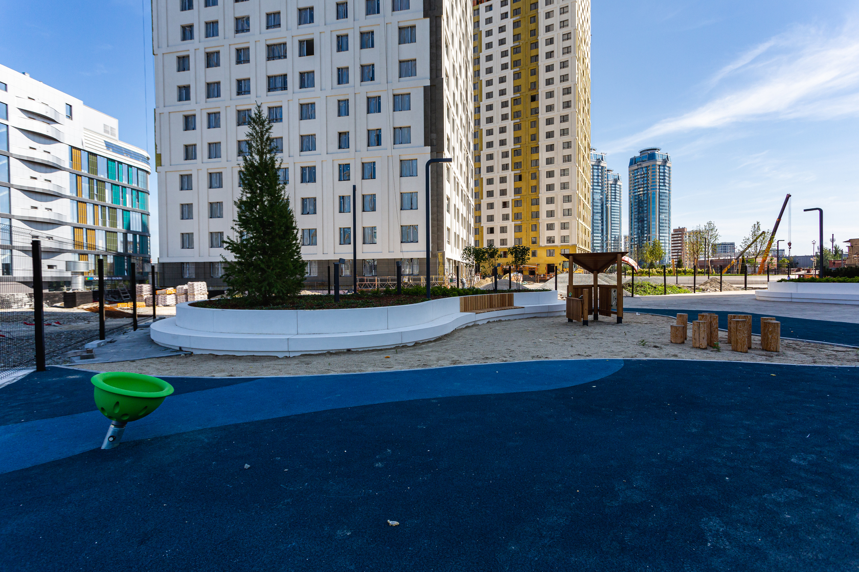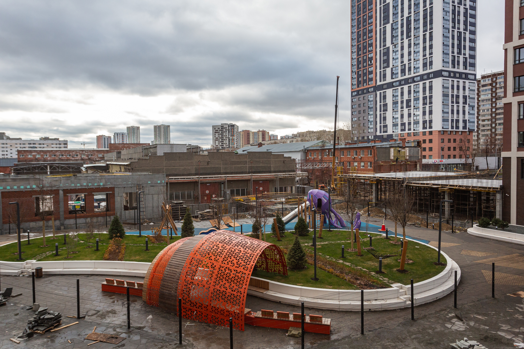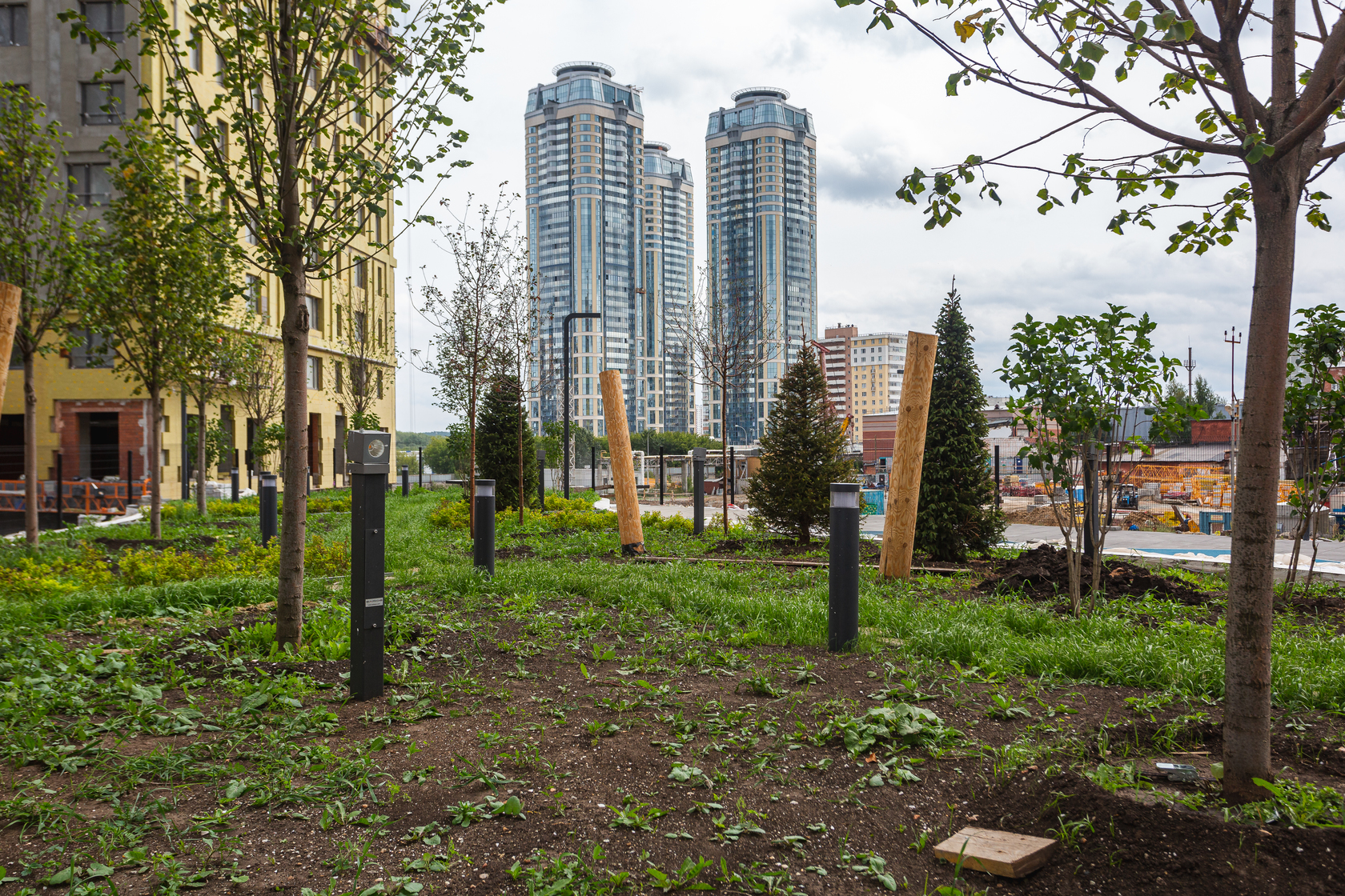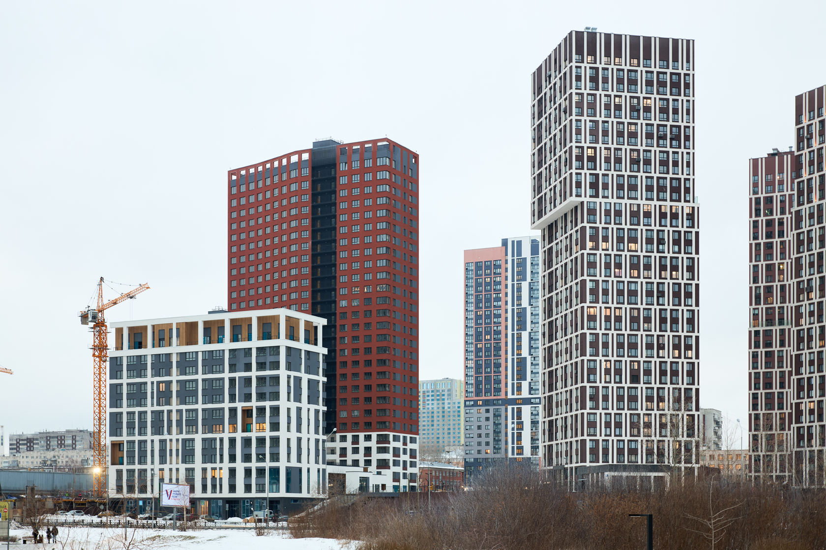 Возводим монолитные конструкции 15 этажа первого дома. Выполняем кирпичную кладку стен на 9–11 этажах. Возводим монолитные конструкции стен подземной части дома и паркинга. Выполнили котлован третьего жилого дома. Забиваем сваи третьего дома.