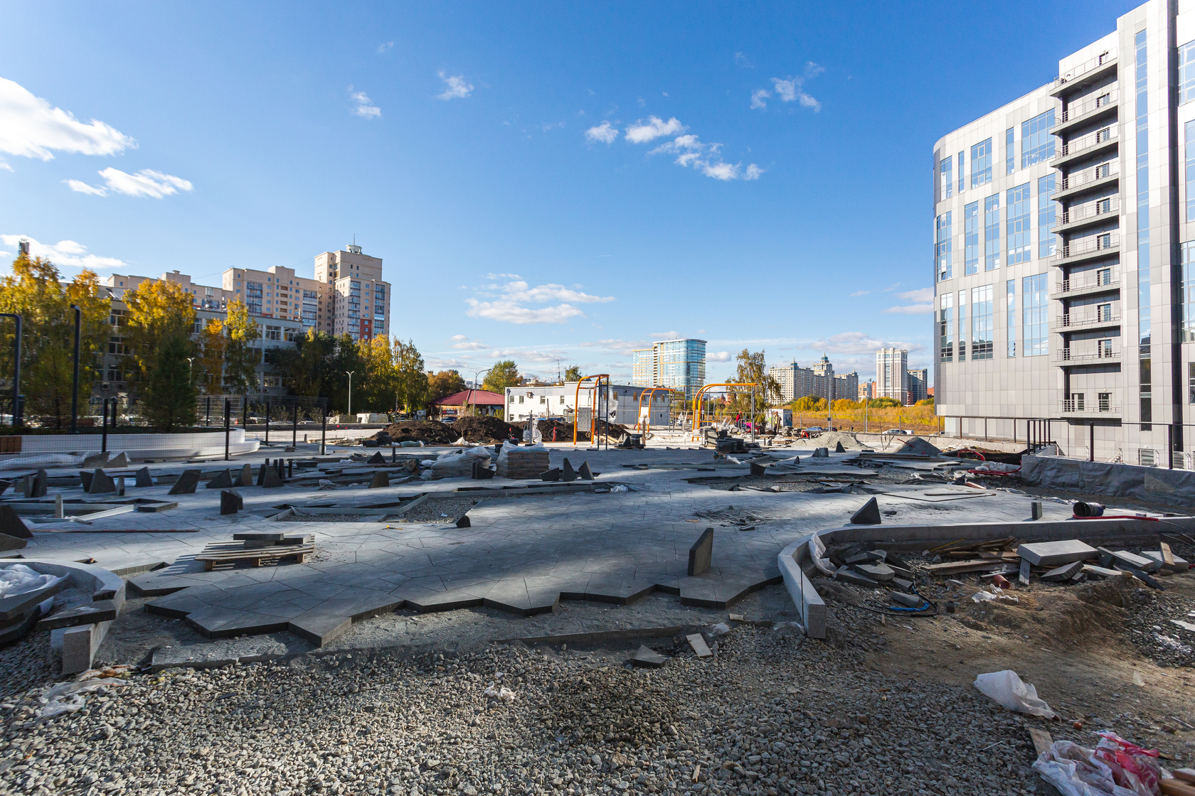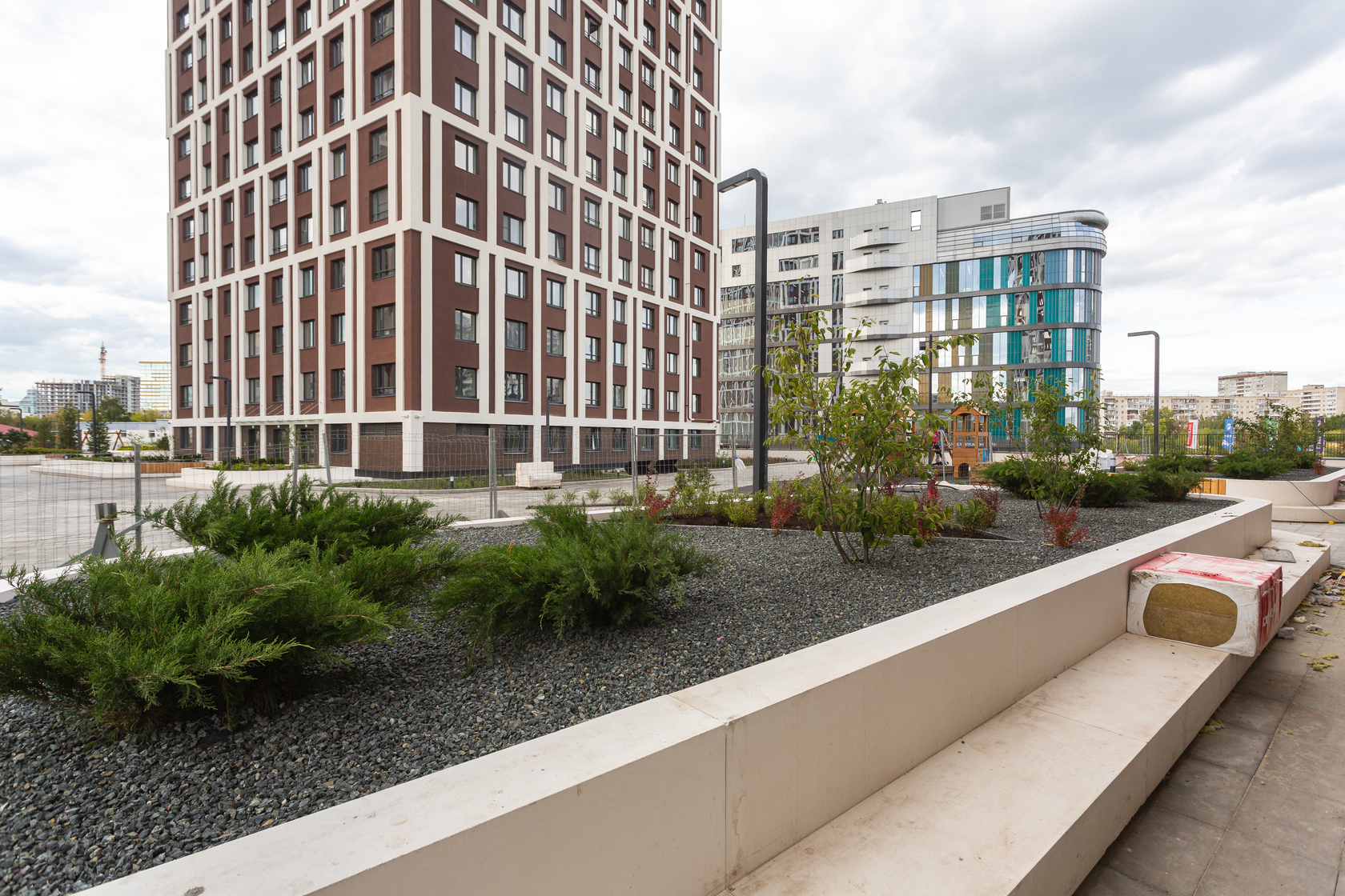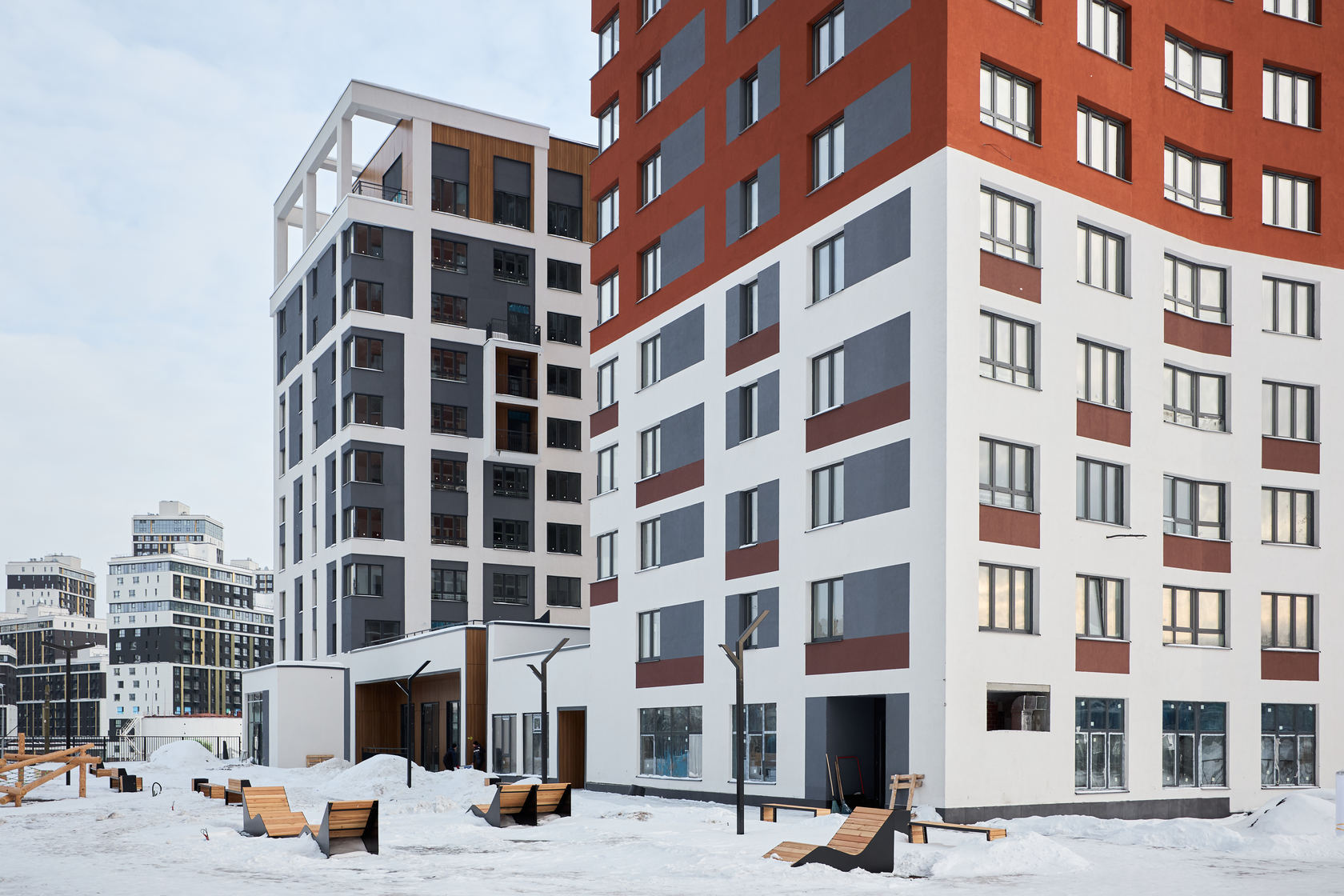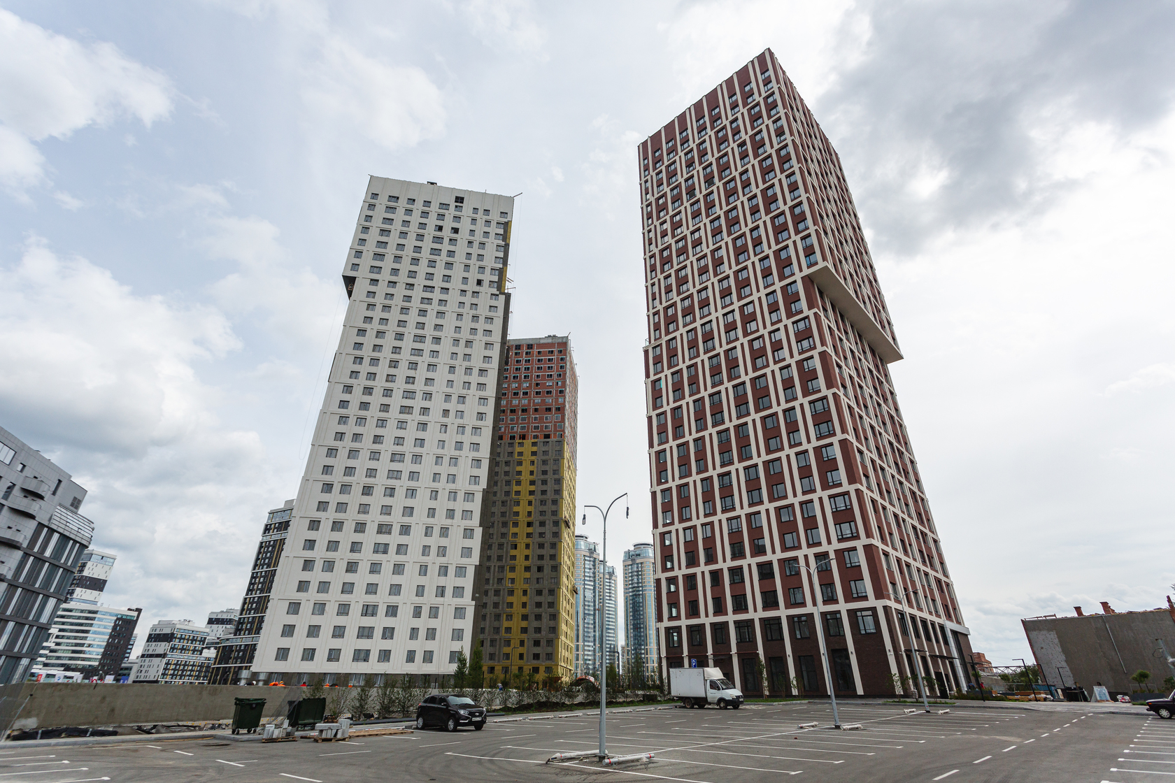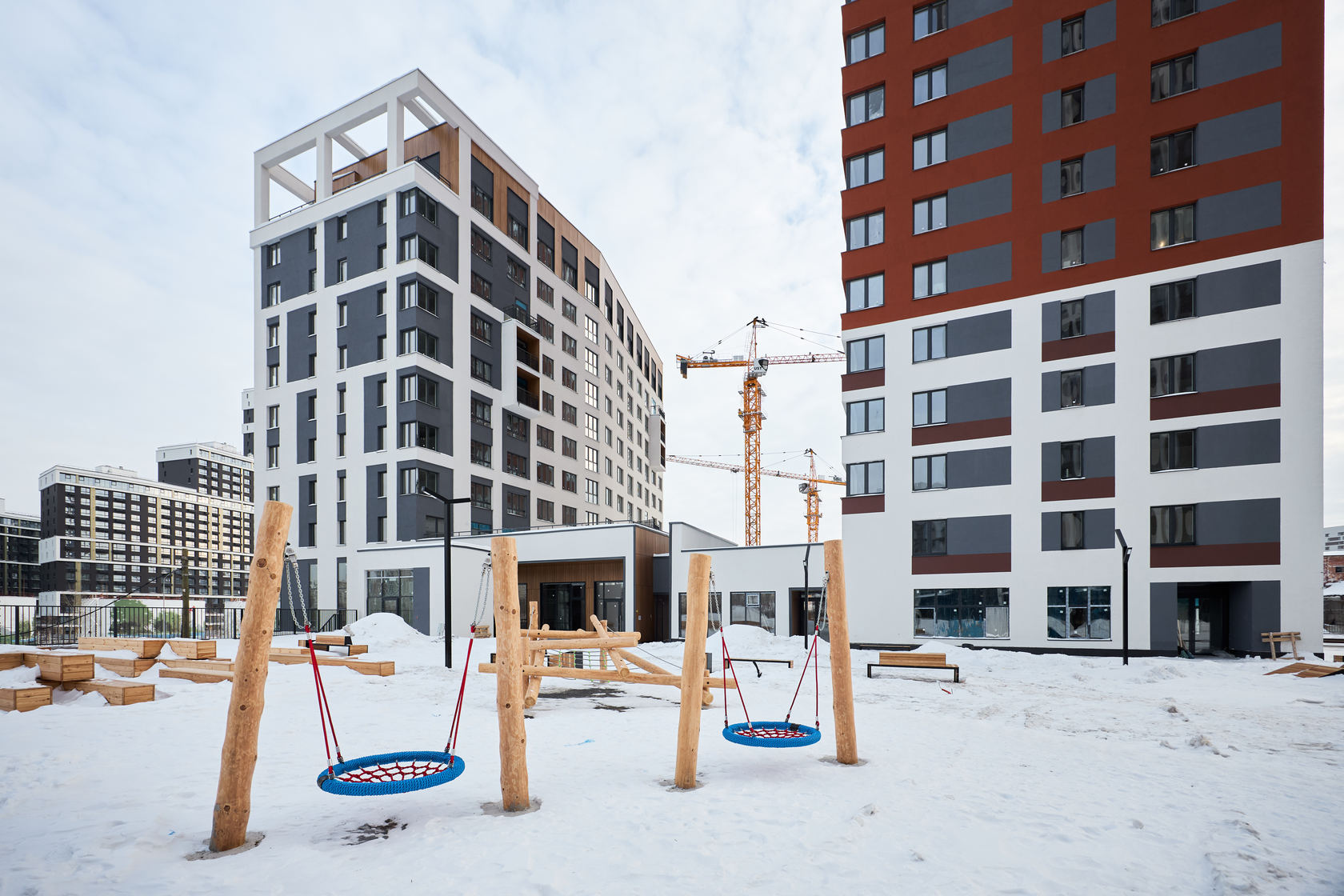 Возводим монолитные конструкции 15 этажа первого дома. Выполняем кирпичную кладку стен на 9–11 этажах. Возводим монолитные конструкции стен подземной части дома и паркинга. Выполнили котлован третьего жилого дома. Забиваем сваи третьего дома.