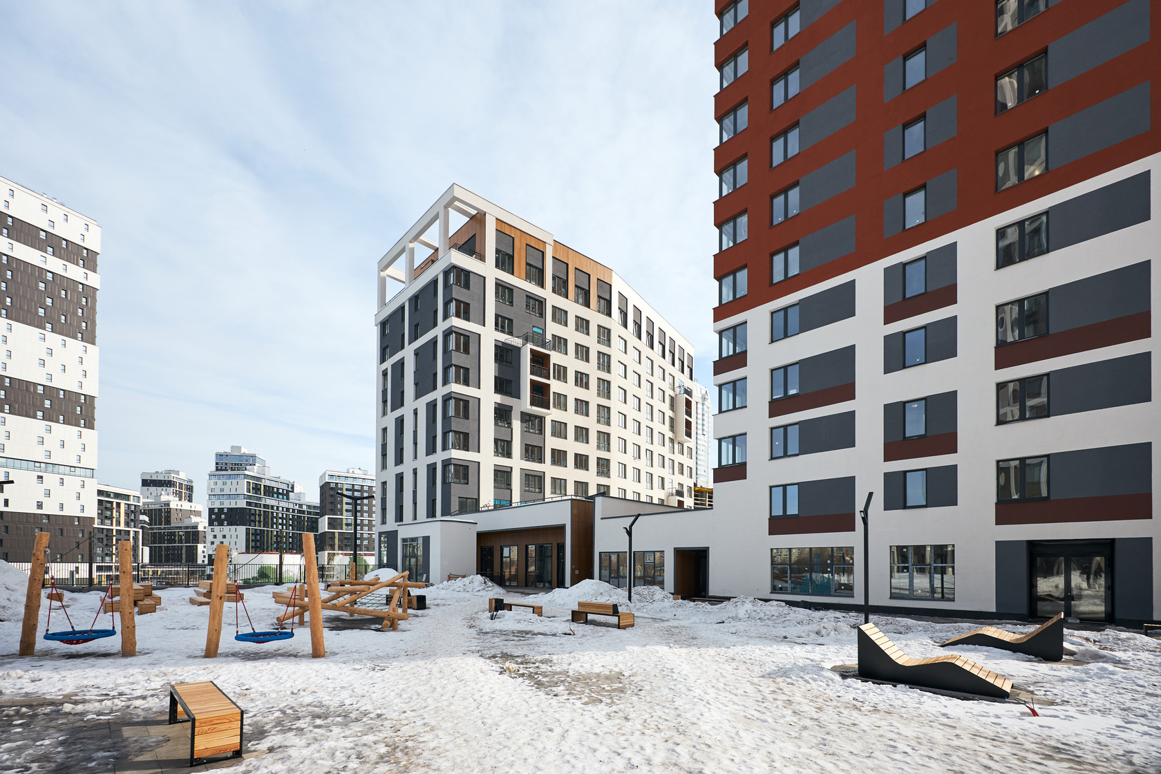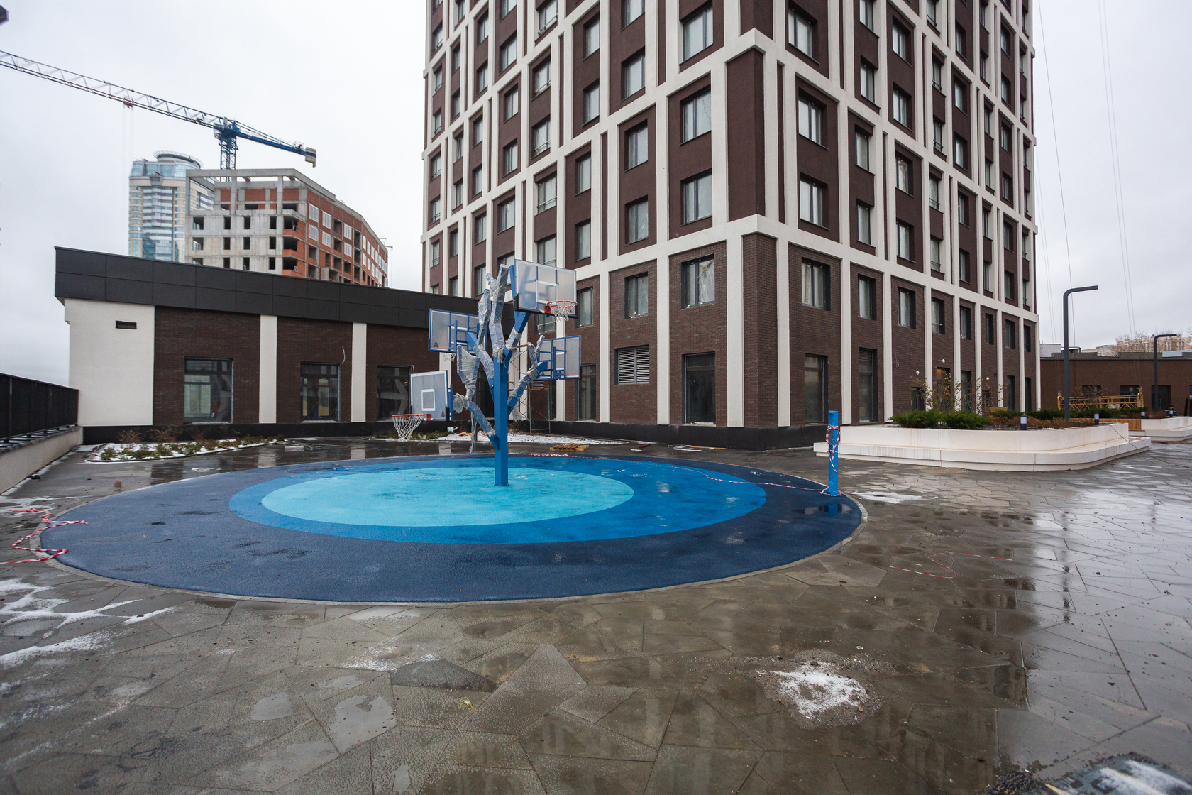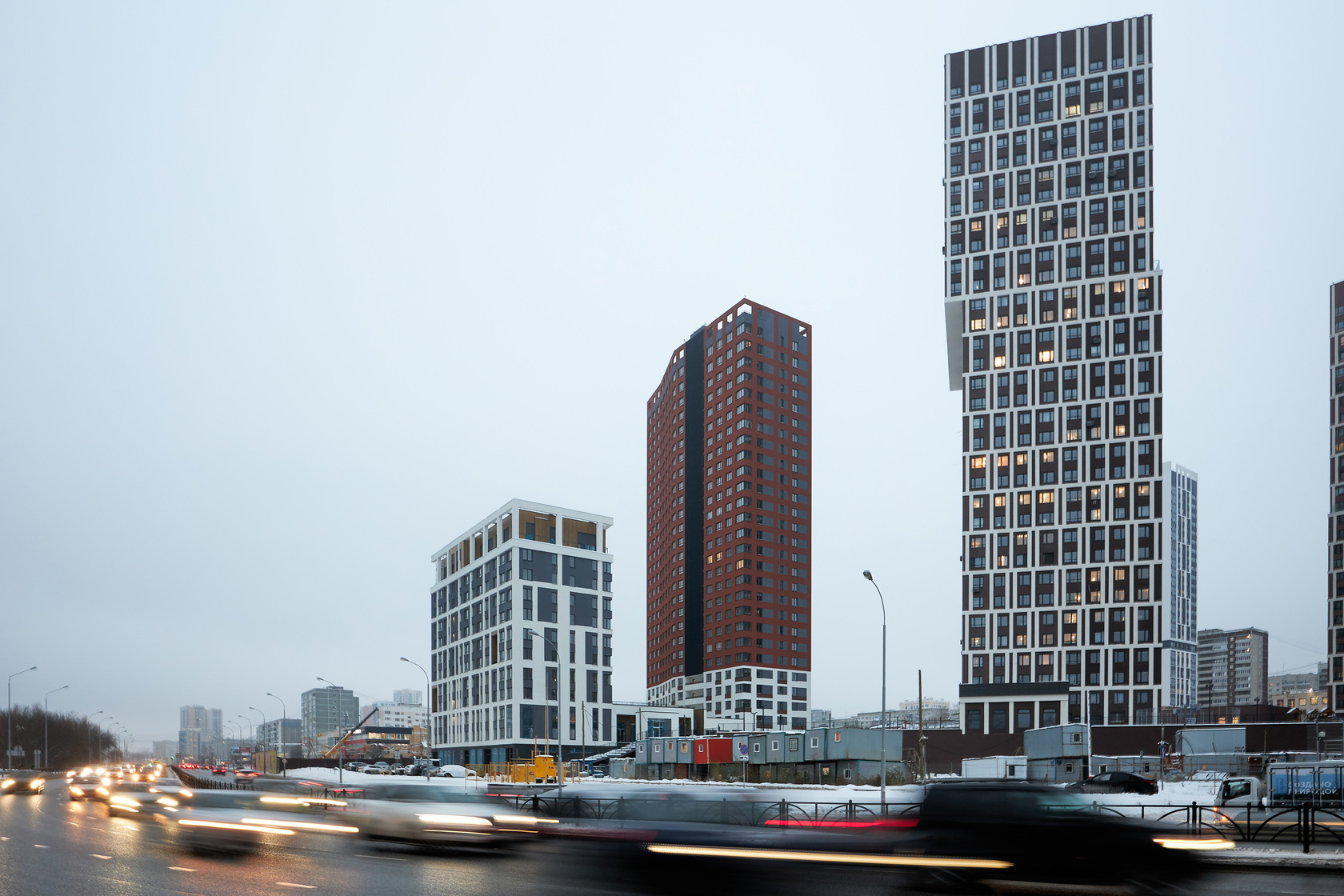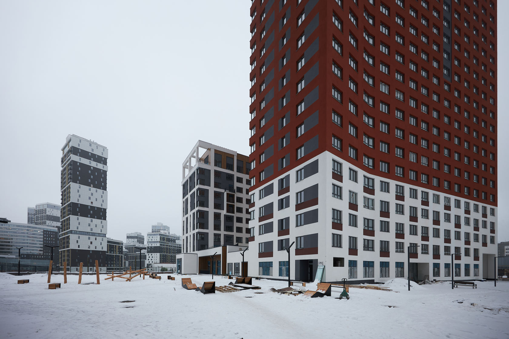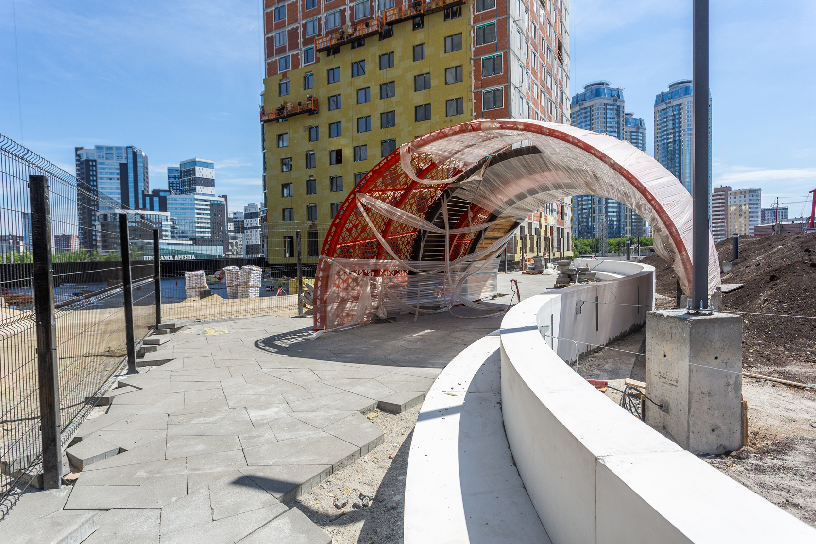 Возводим монолитные конструкции 15 этажа первого дома. Выполняем кирпичную кладку стен на 9–11 этажах. Возводим монолитные конструкции стен подземной части дома и паркинга. Выполнили котлован третьего жилого дома. Забиваем сваи третьего дома.