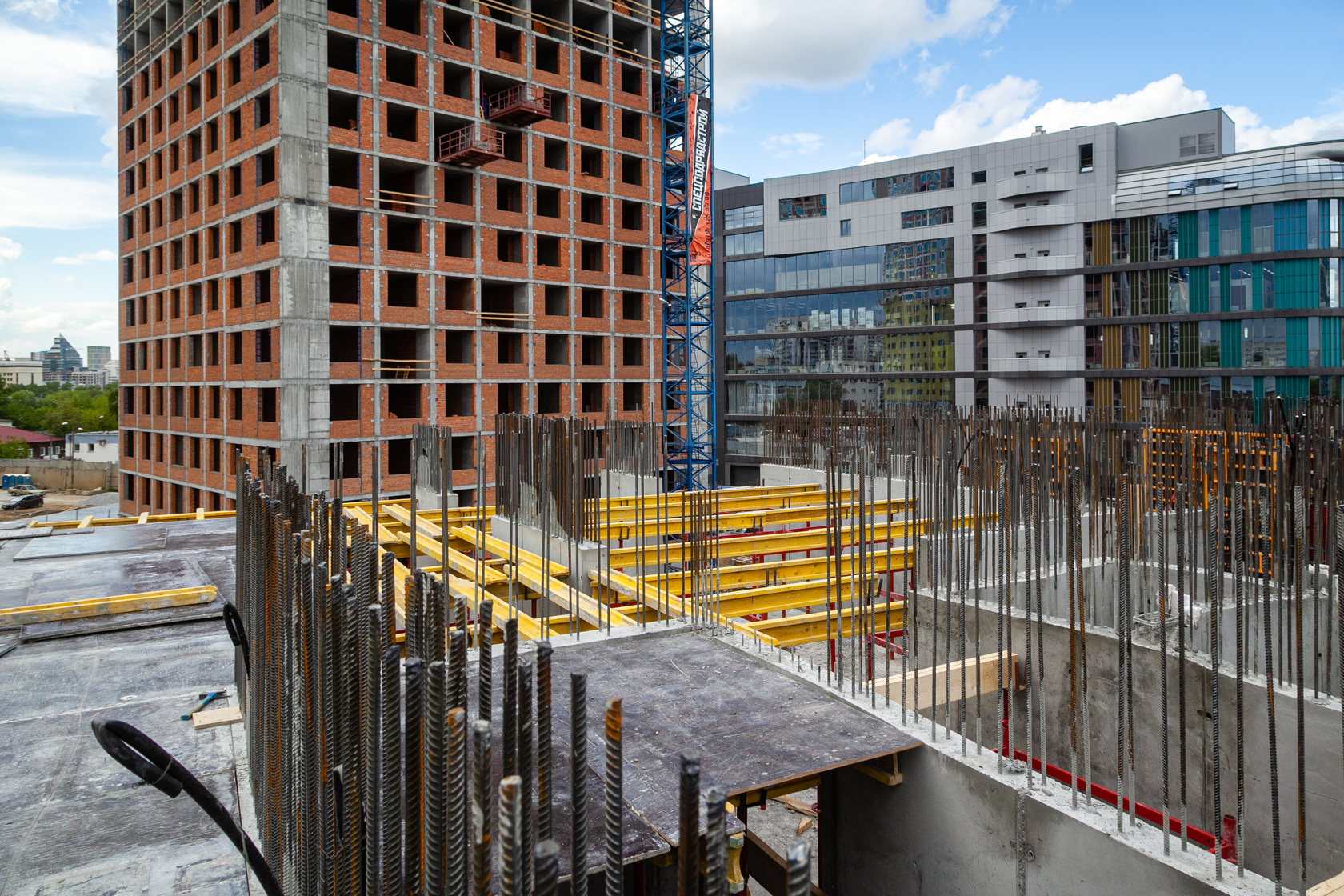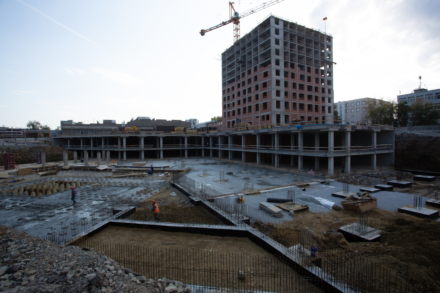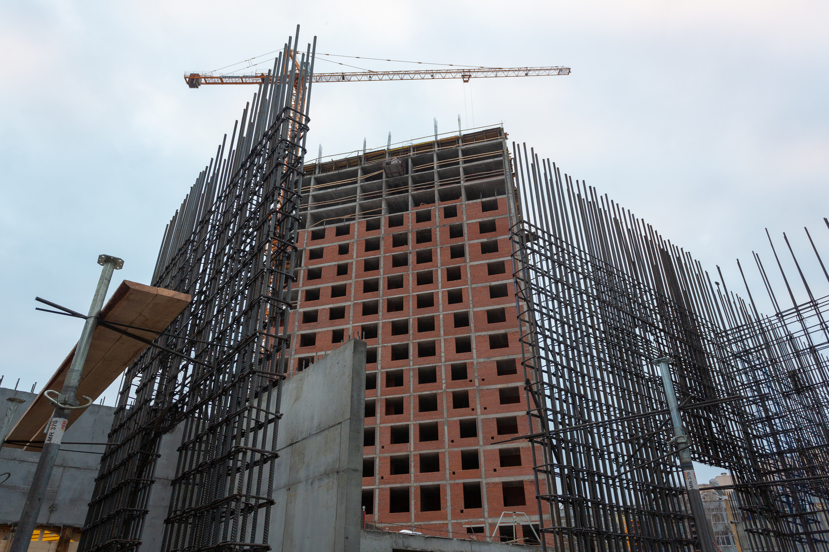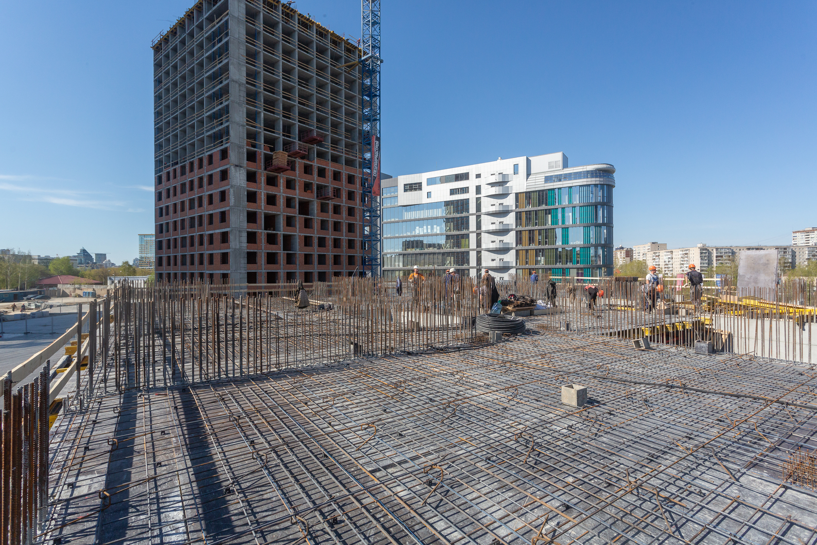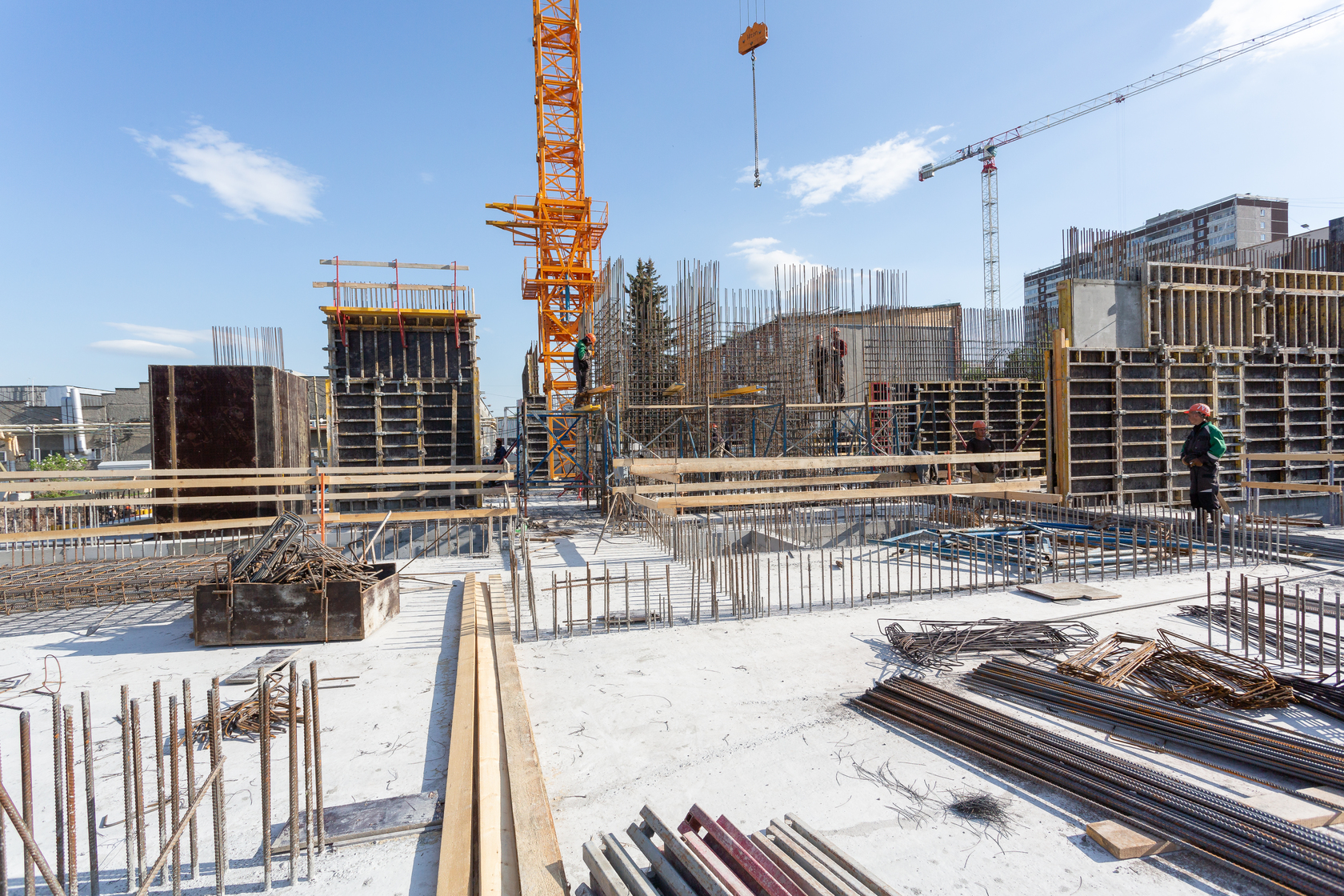 Выполняем монолитные конструкции 14 этажа первого дома. Выполняем кирпичную кладку стен на 7–9 этажах. Выполняем монолитные конструкции стен подземной части дома и стен паркинга.