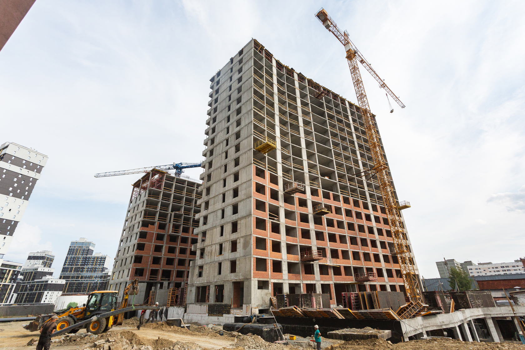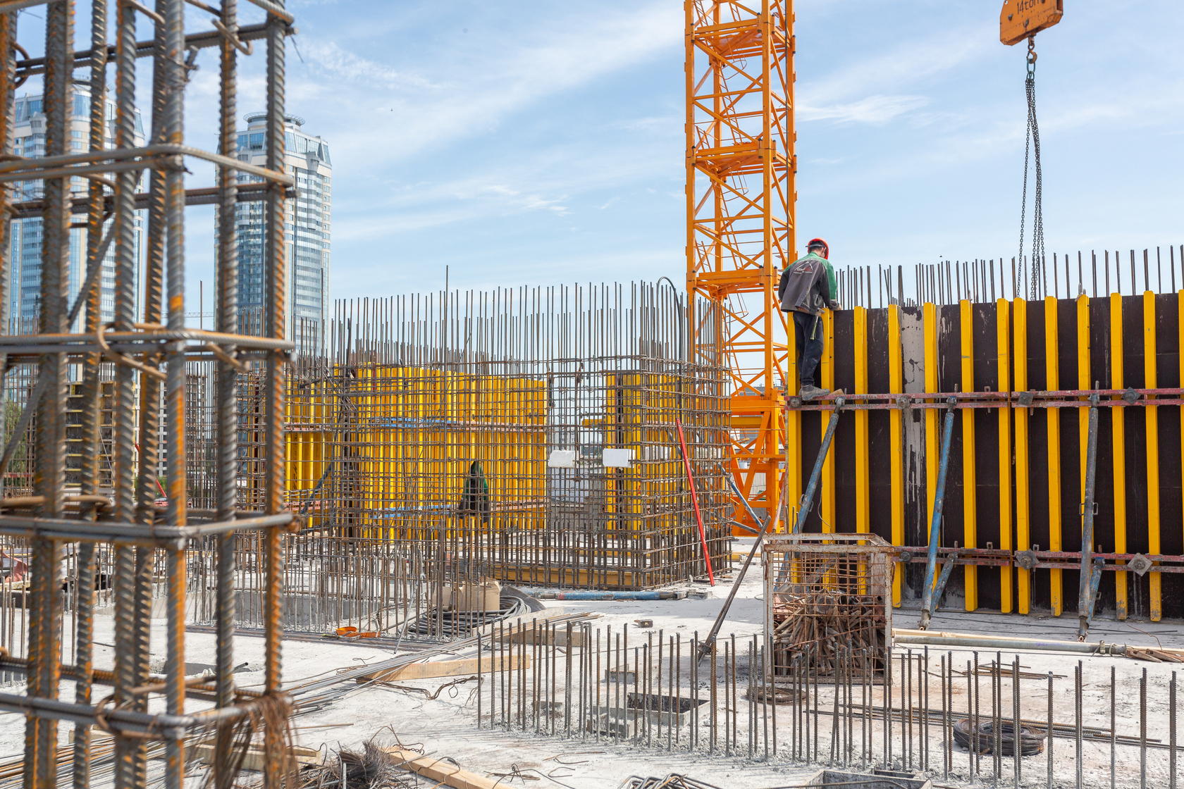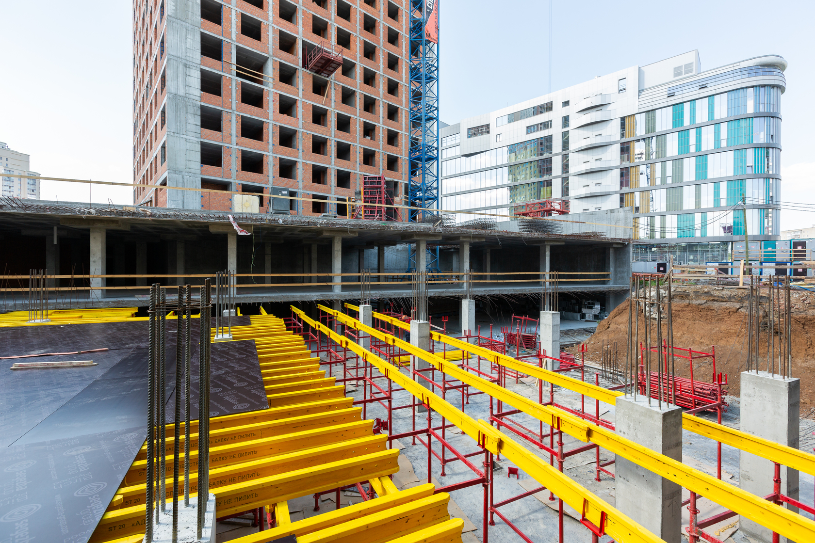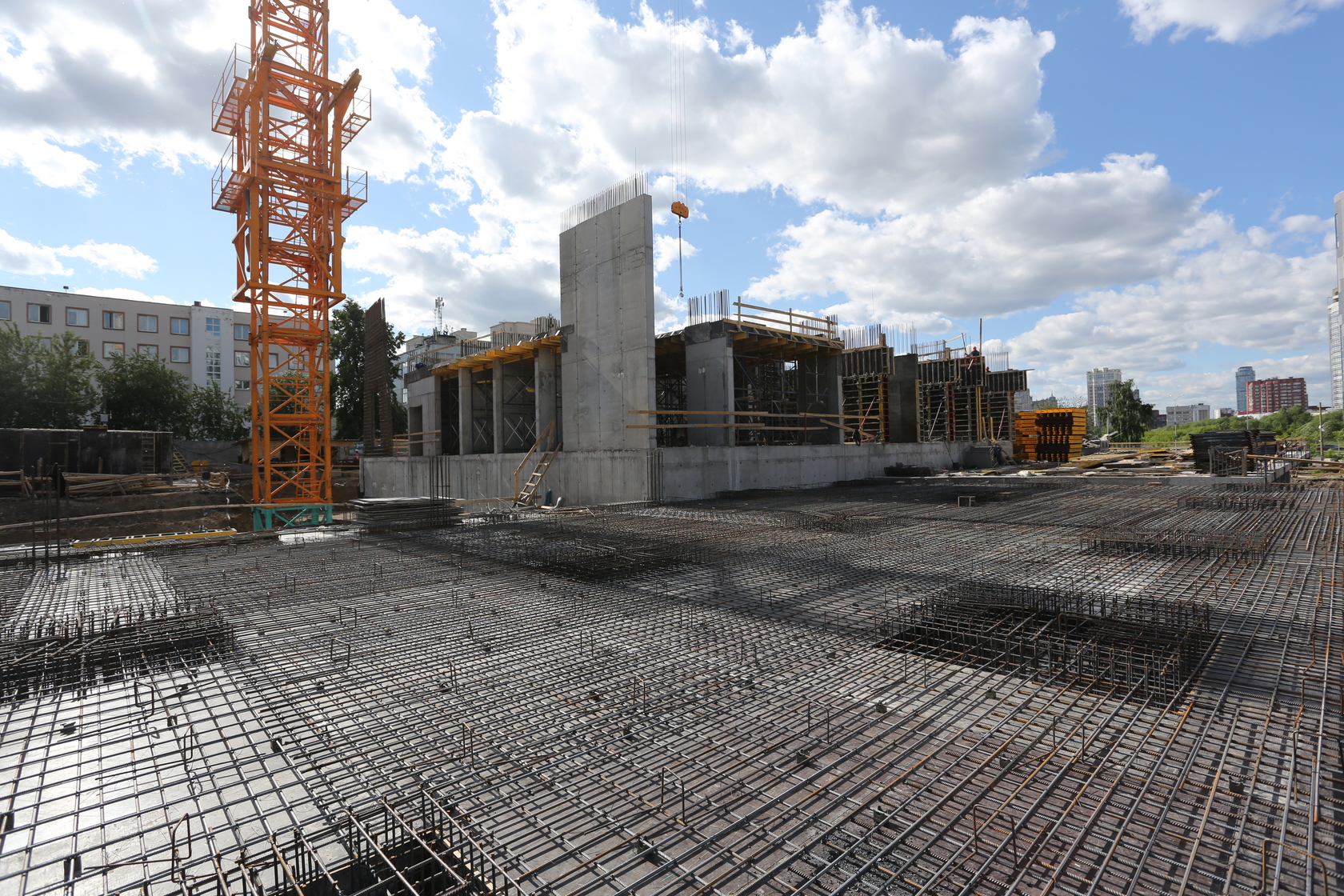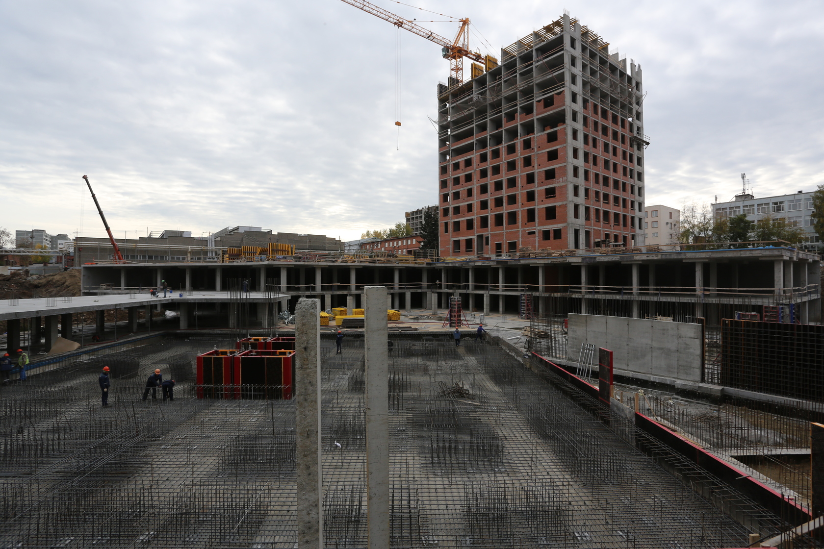 Выполняем монолитные конструкции 14 этажа первого дома. Выполняем кирпичную кладку стен на 7–9 этажах. Выполняем монолитные конструкции стен подземной части дома и стен паркинга.