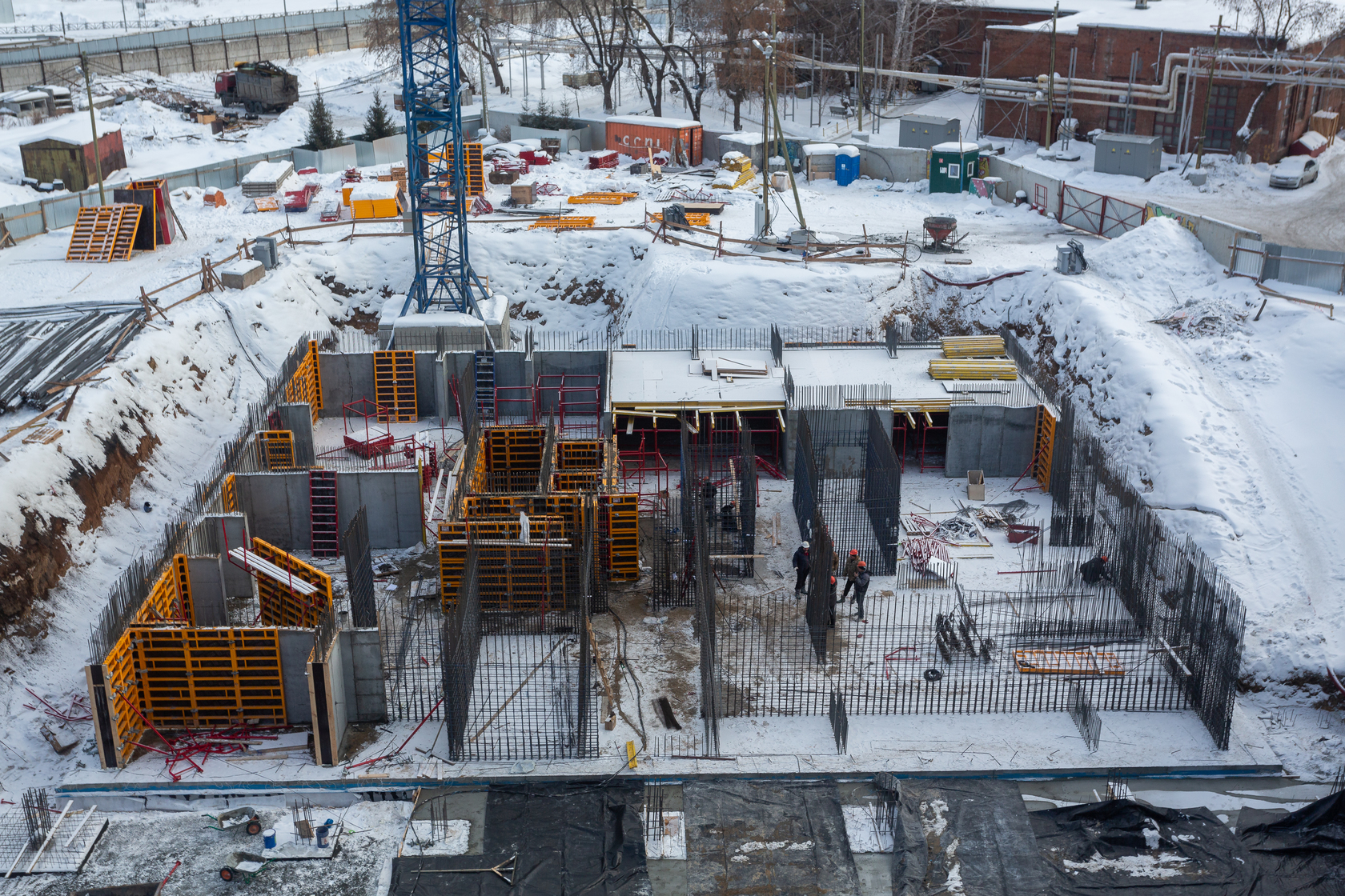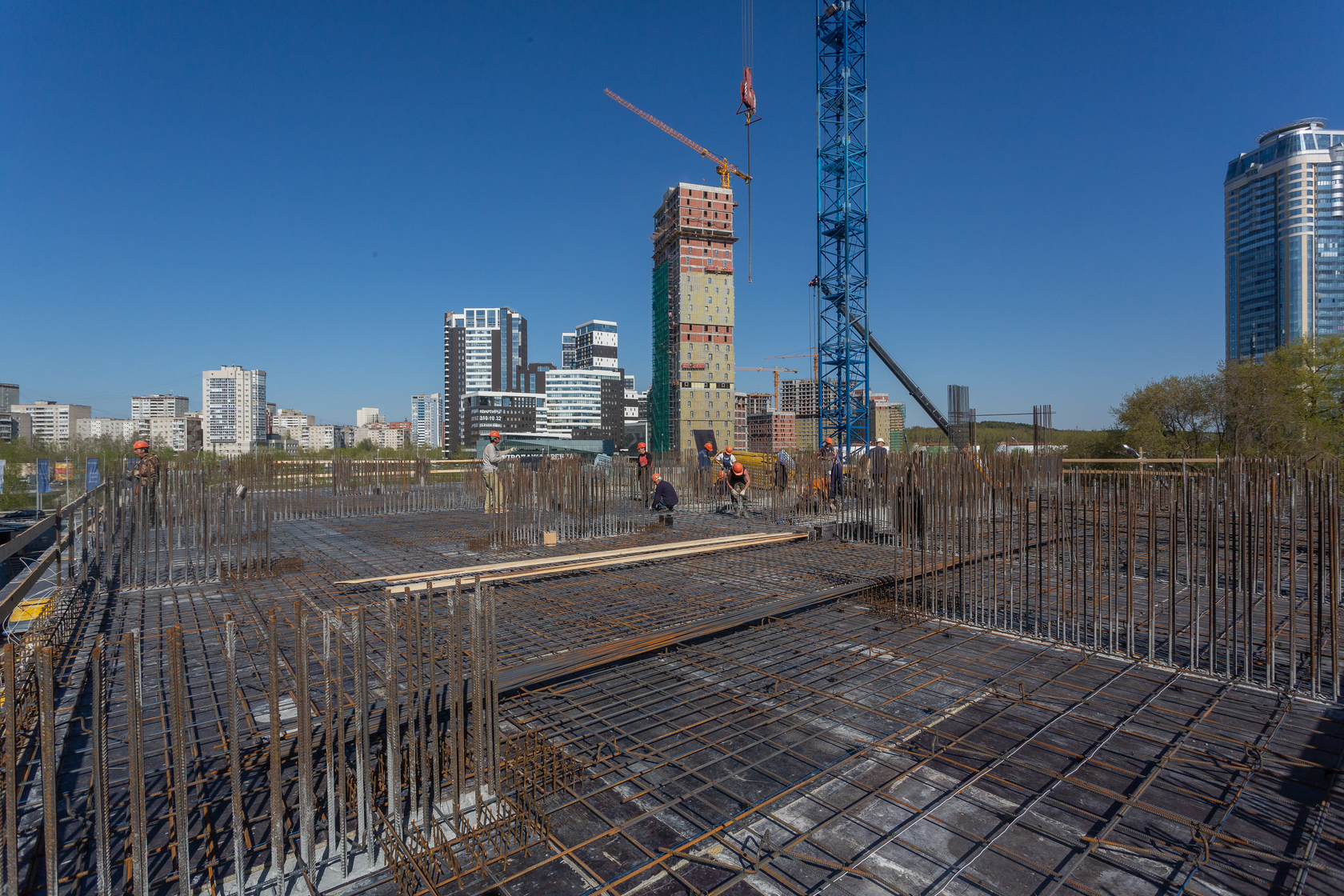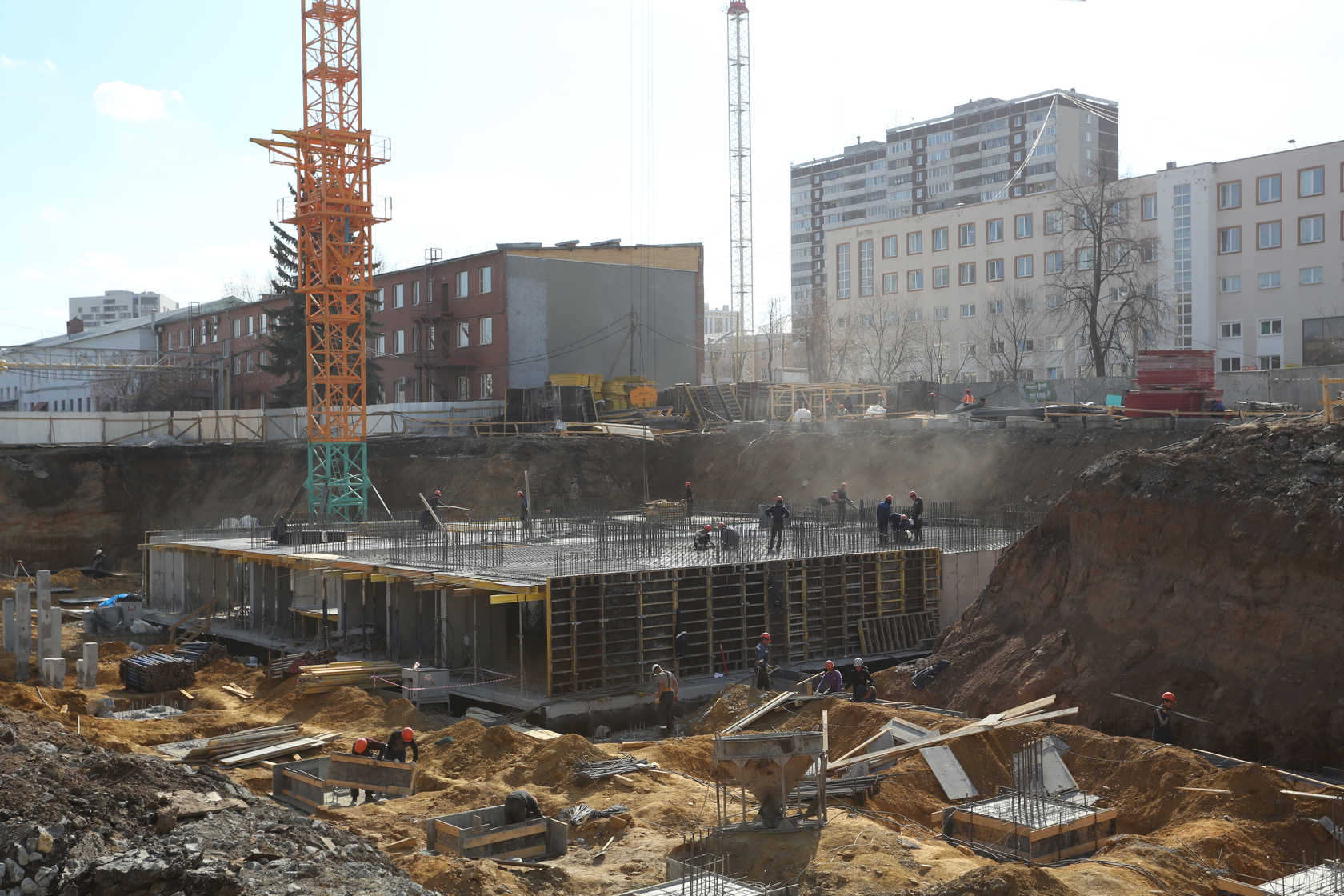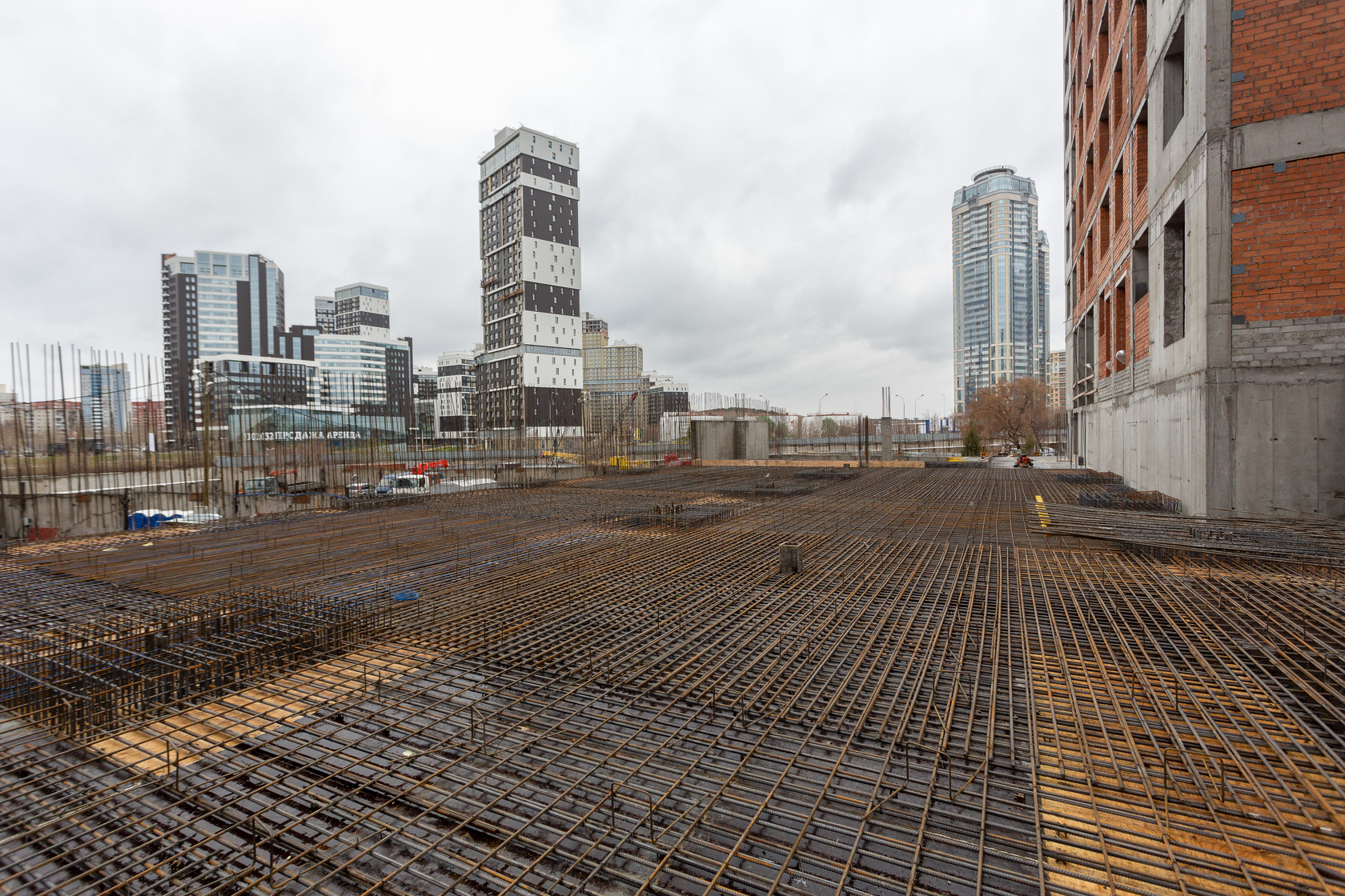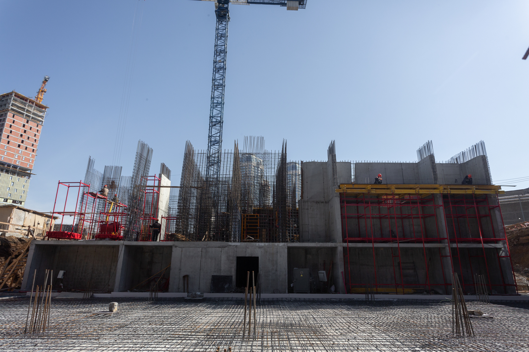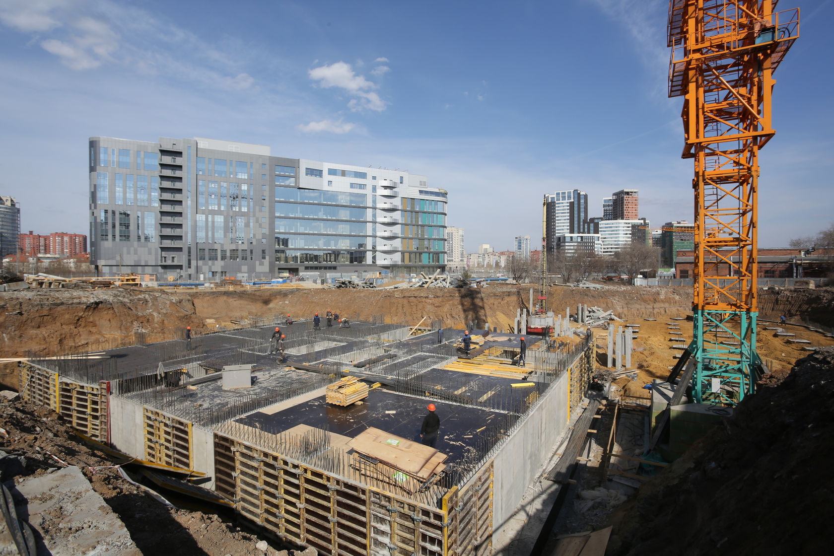 Выполняем монолитные конструкции 14 этажа первого дома. Выполняем кирпичную кладку стен на 7–9 этажах. Выполняем монолитные конструкции стен подземной части дома и стен паркинга.