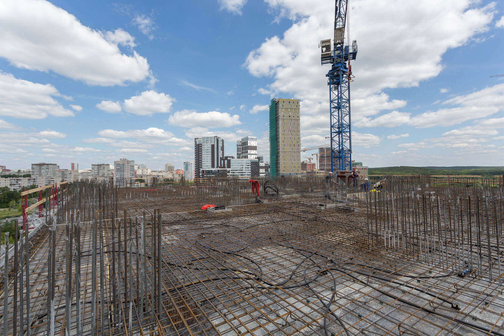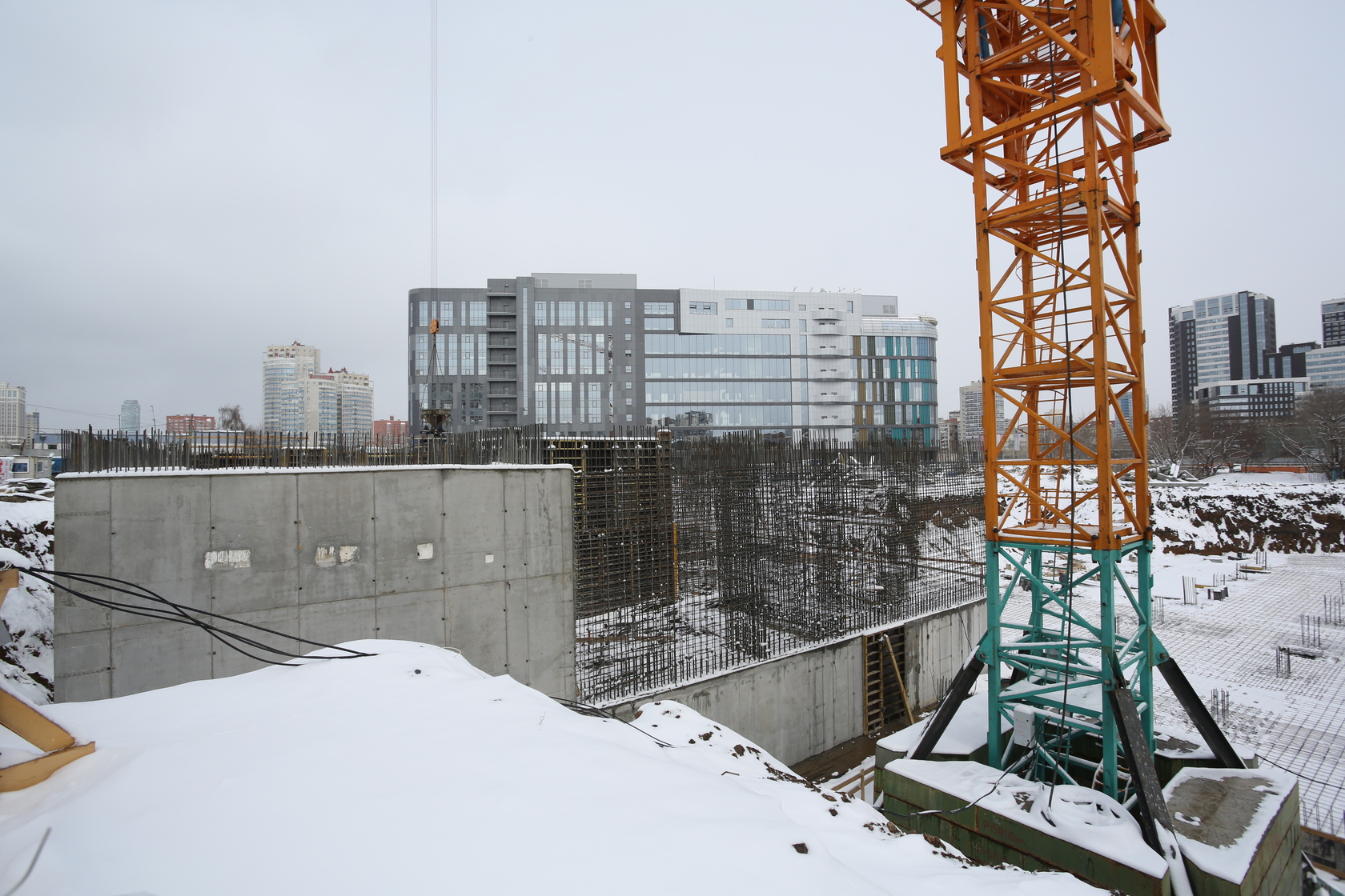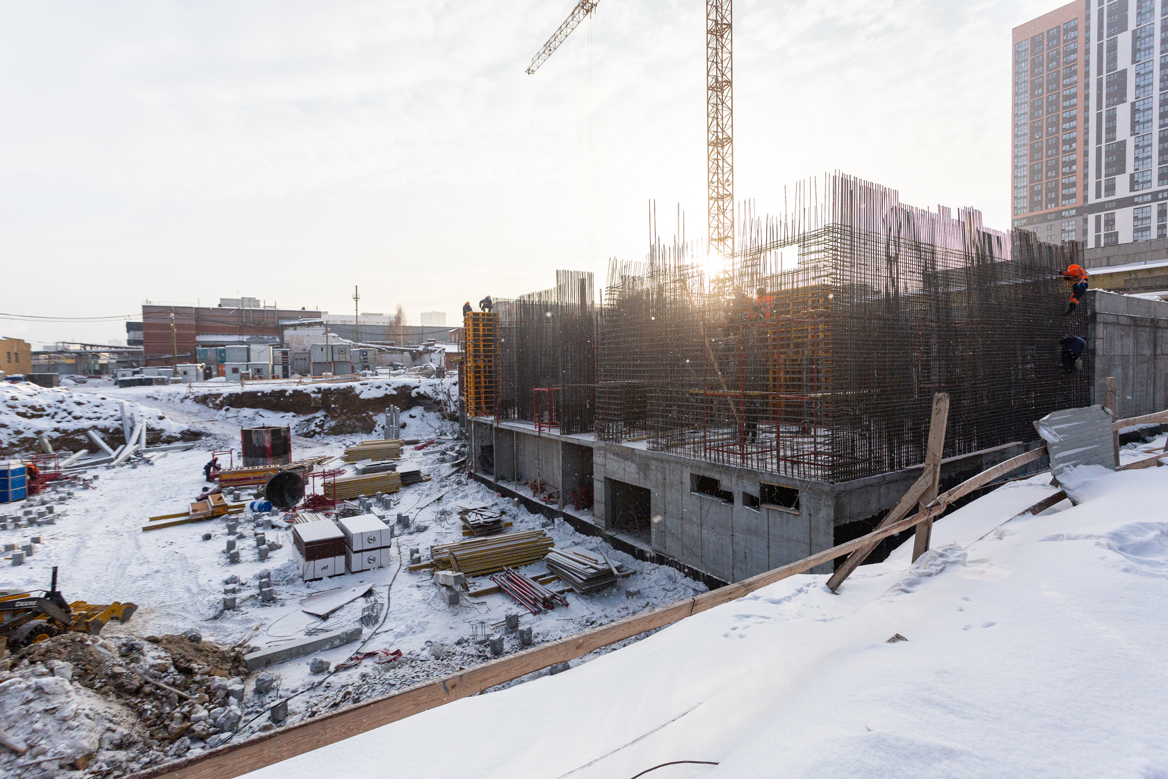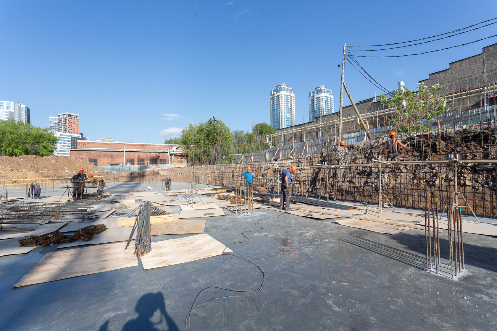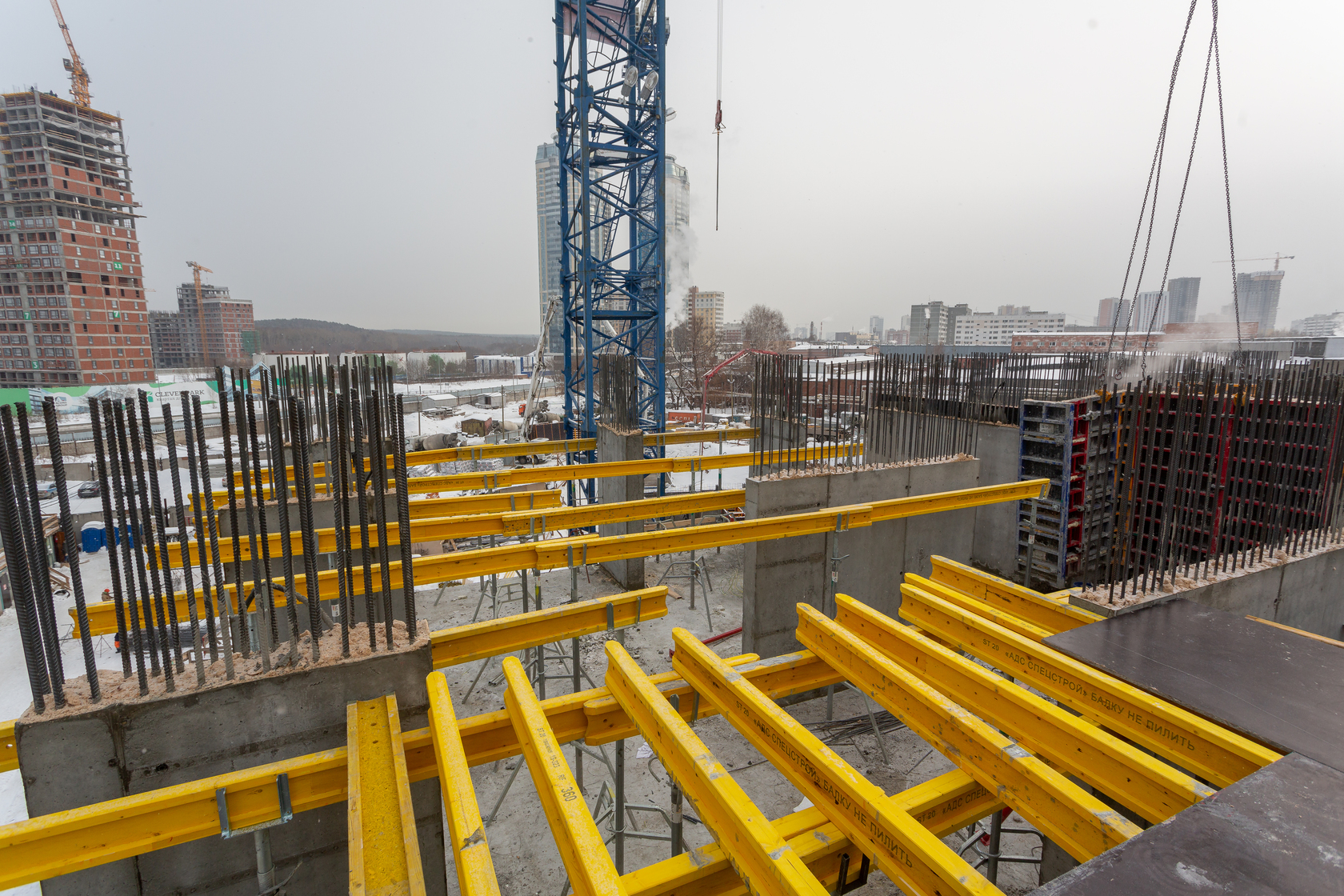 Выполняем монолитные конструкции 14 этажа первого дома. Выполняем кирпичную кладку стен на 7–9 этажах. Выполняем монолитные конструкции стен подземной части дома и стен паркинга.