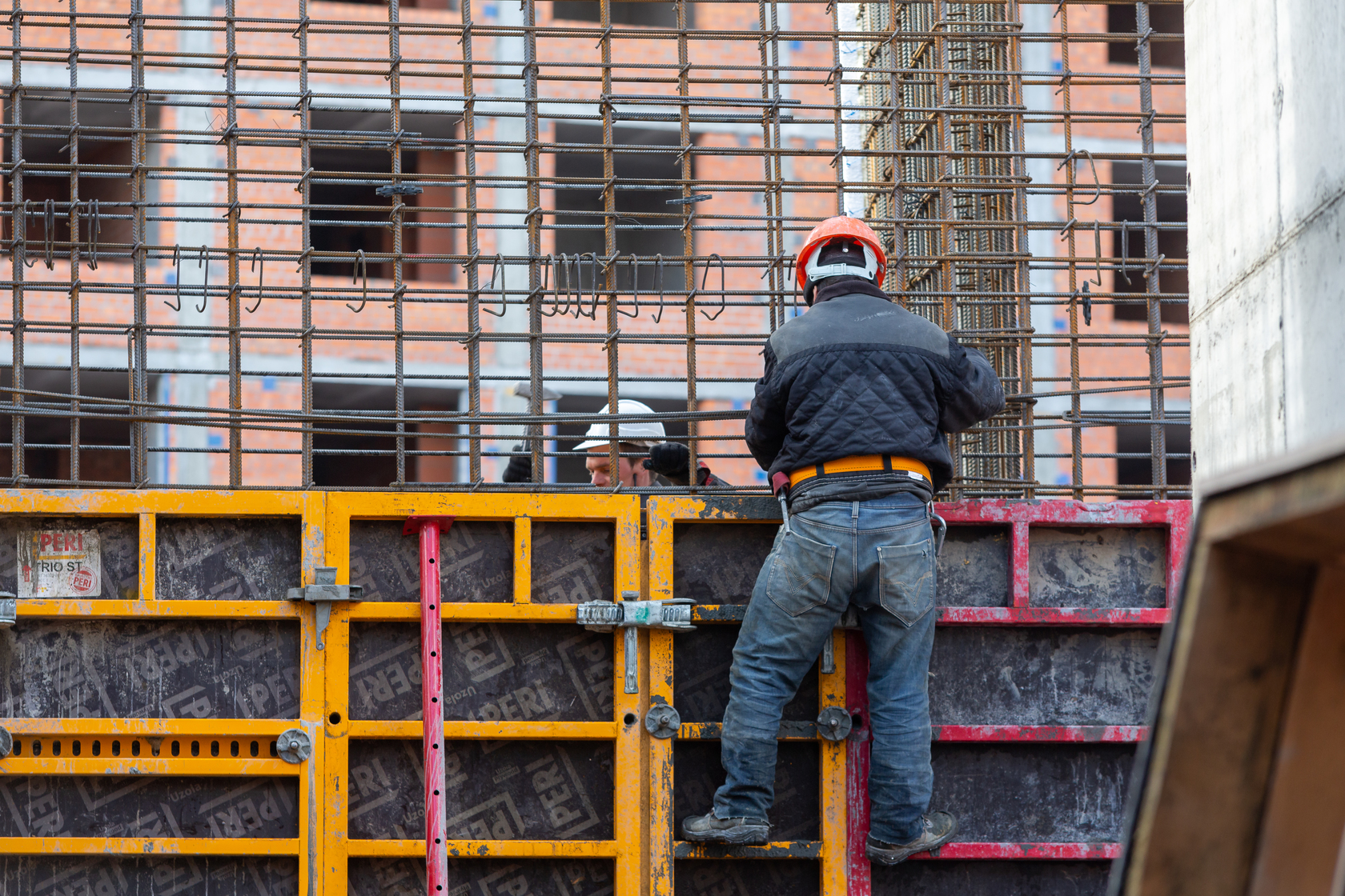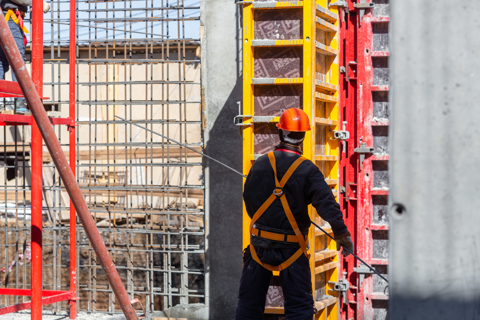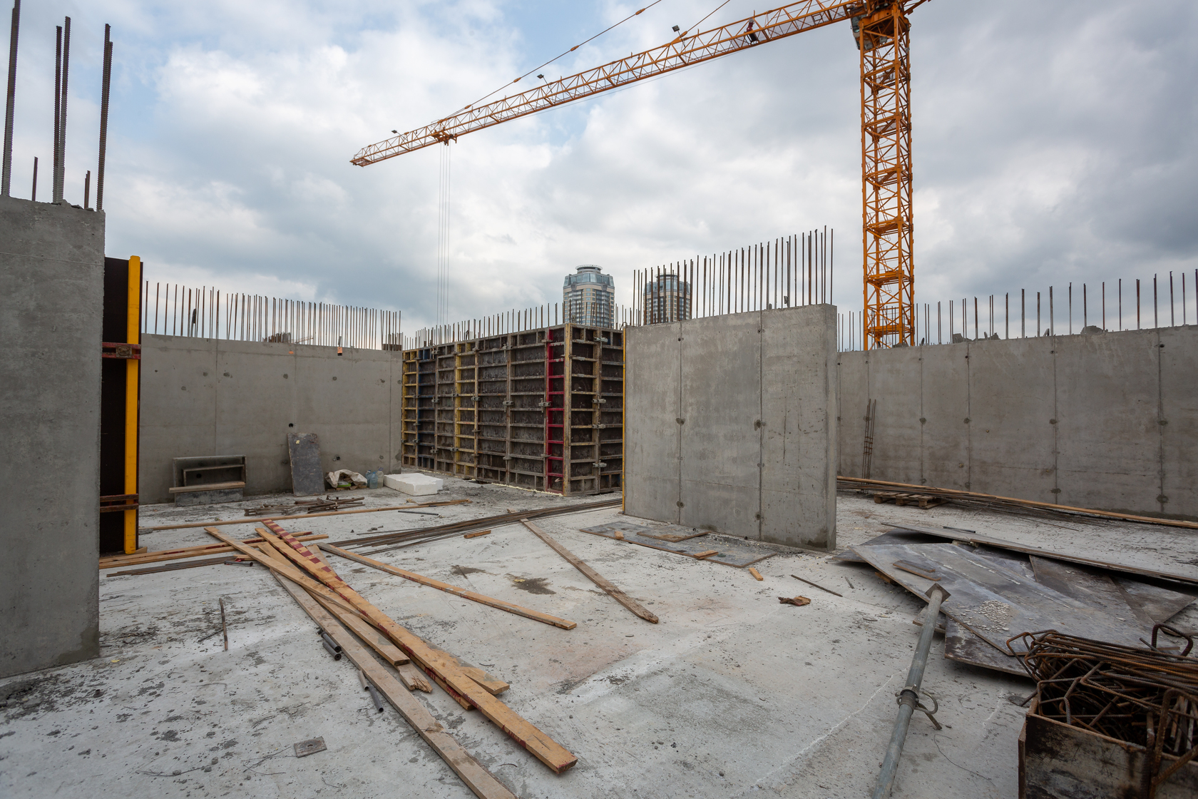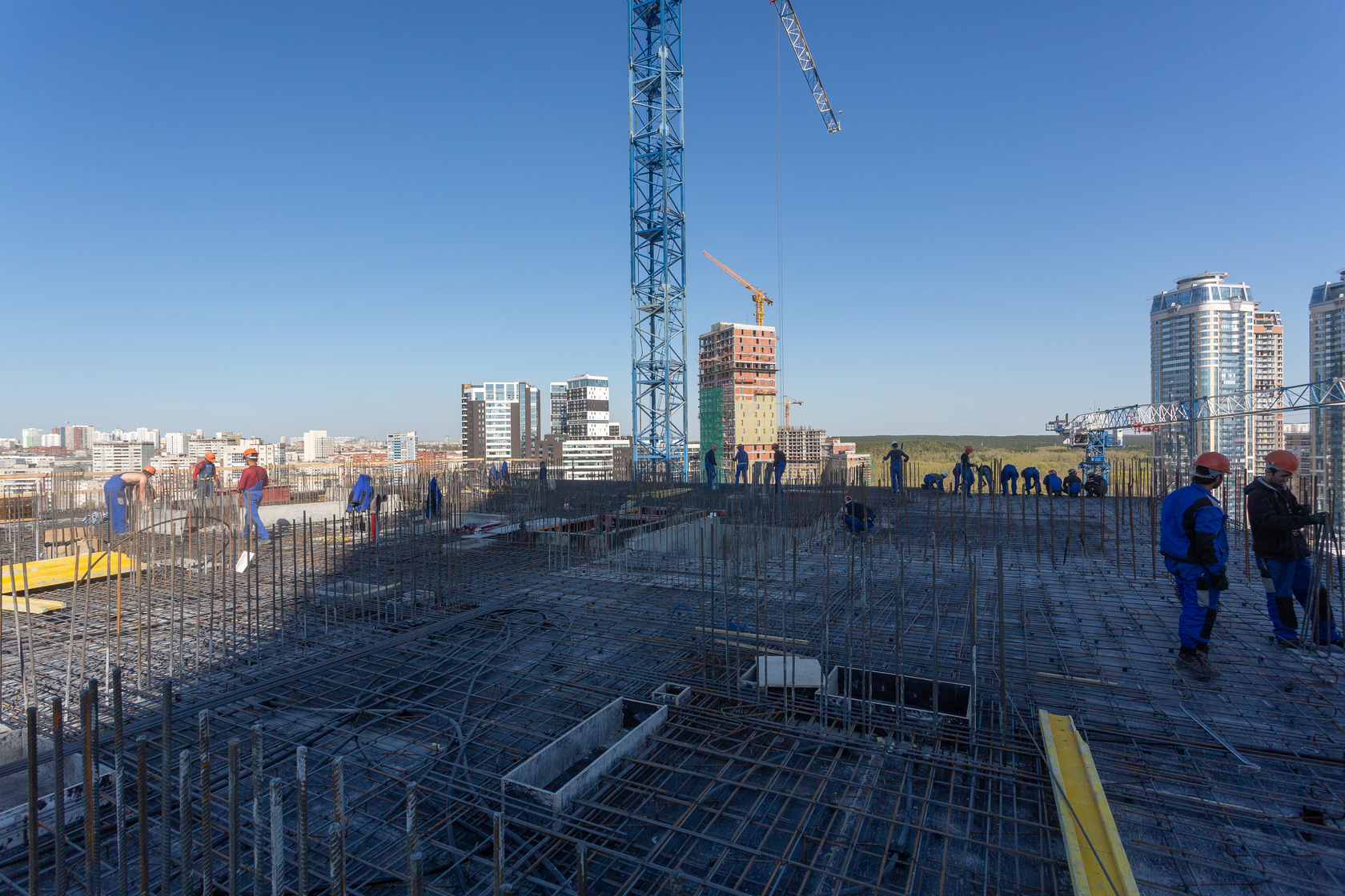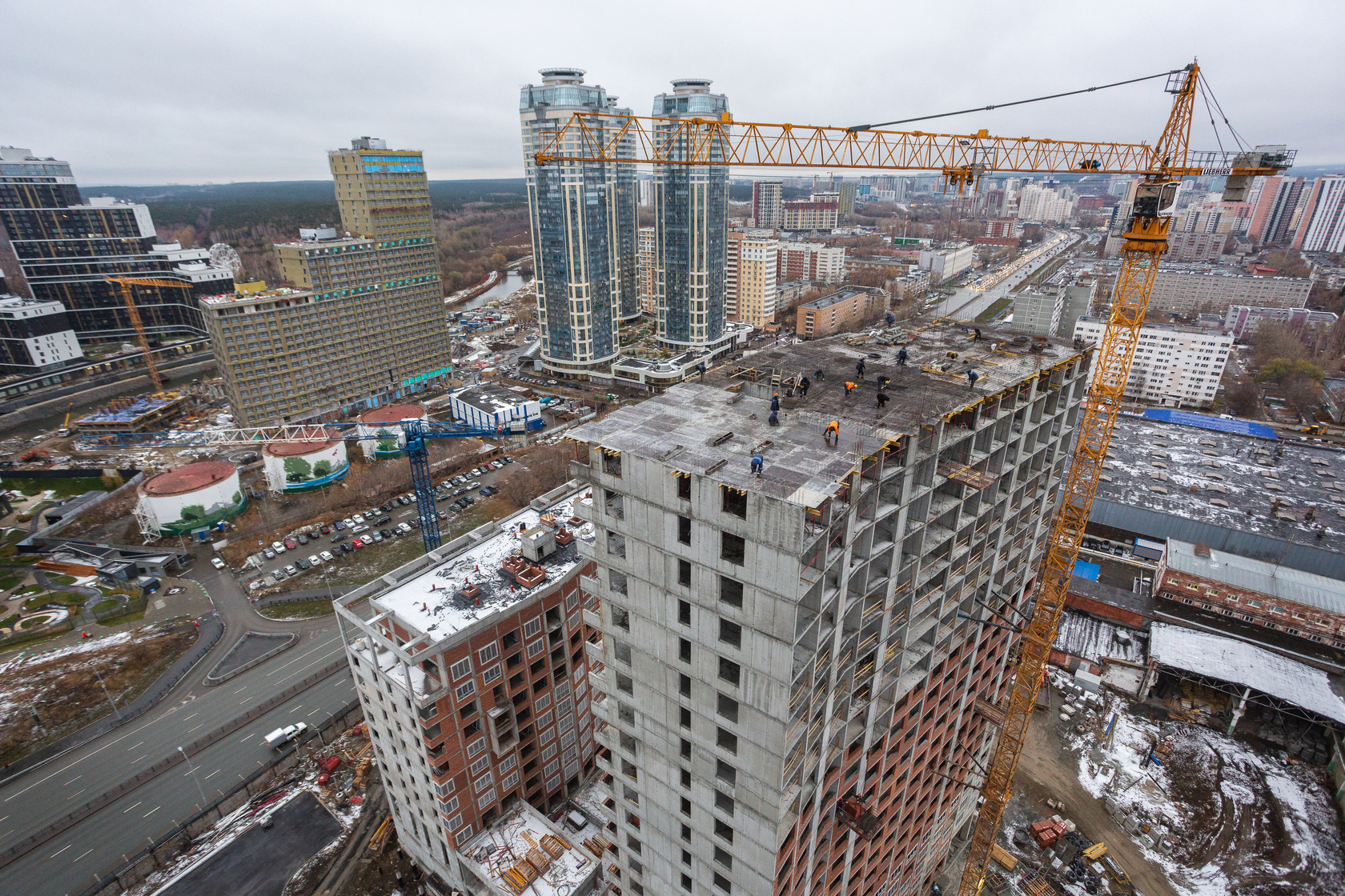 Выполняем монолитные конструкции 14 этажа первого дома. Выполняем кирпичную кладку стен на 7–9 этажах. Выполняем монолитные конструкции стен подземной части дома и стен паркинга.