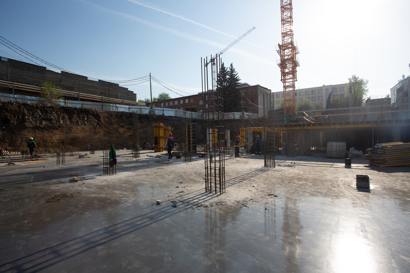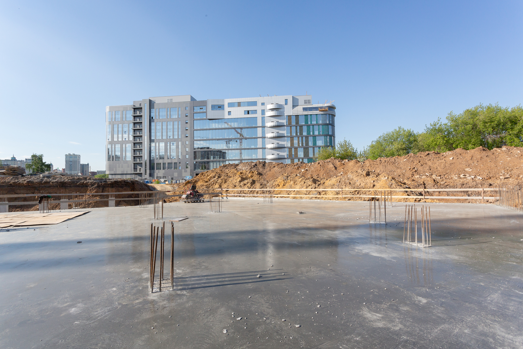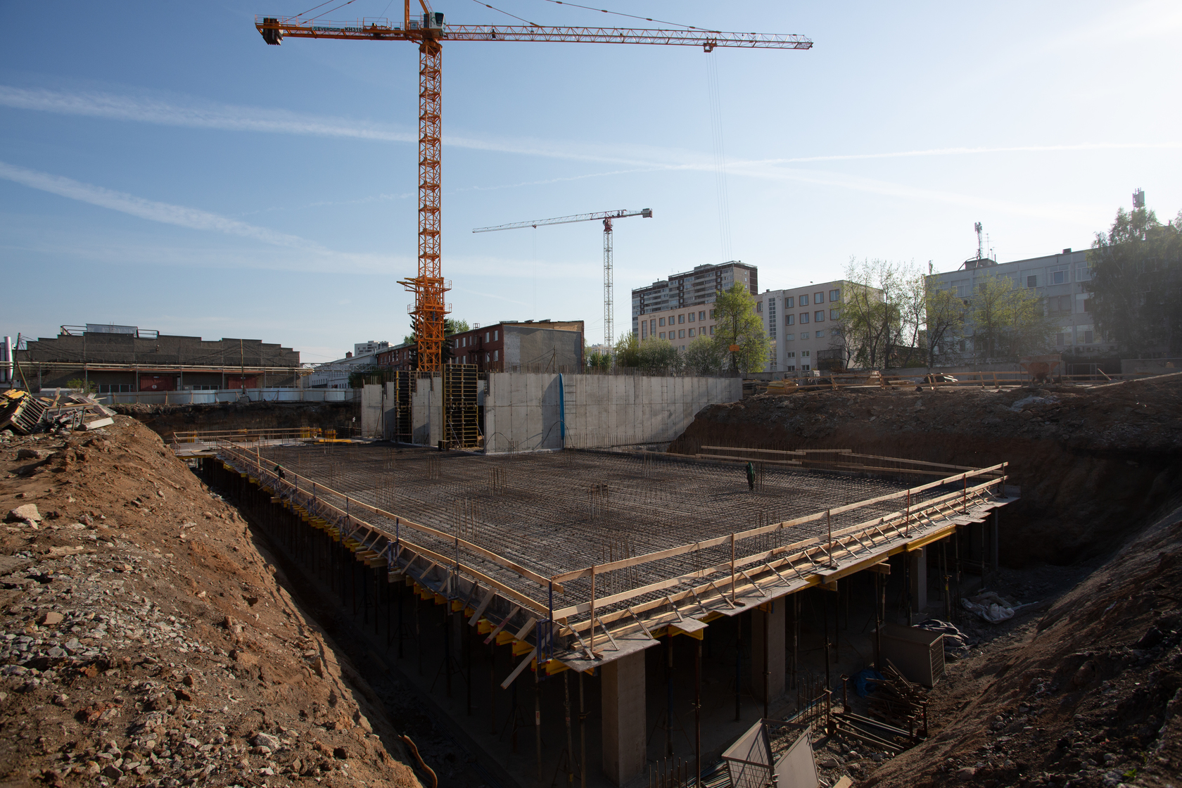 Готова фундаментная плита первого дома, возводим вертикальные и горизонтальные конструкции подземной части. Выполняем фундамент и вертикальные конструкции паркинга.