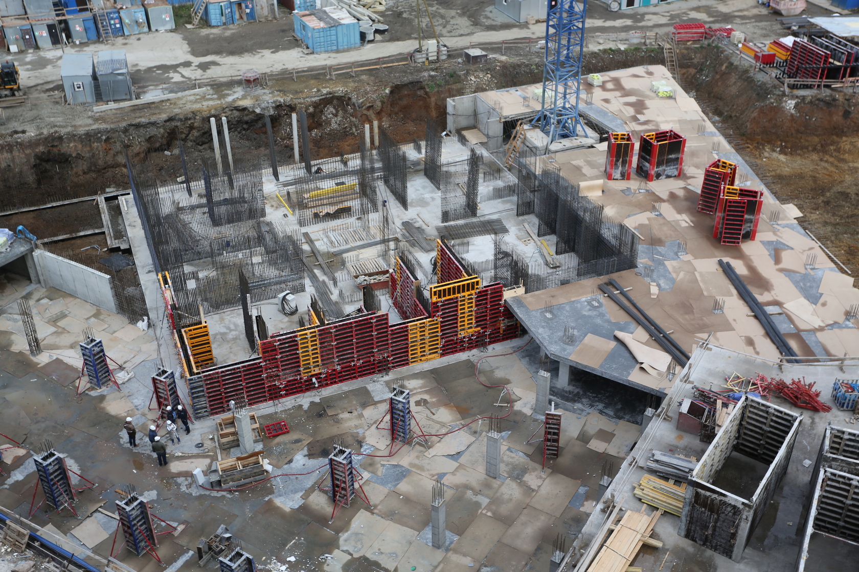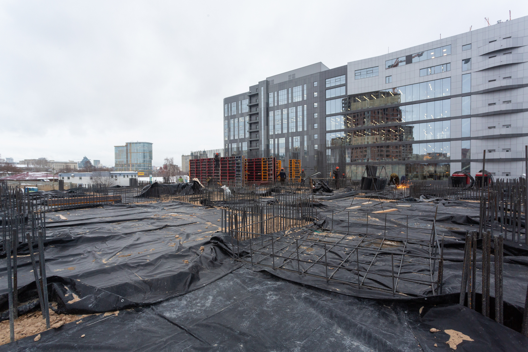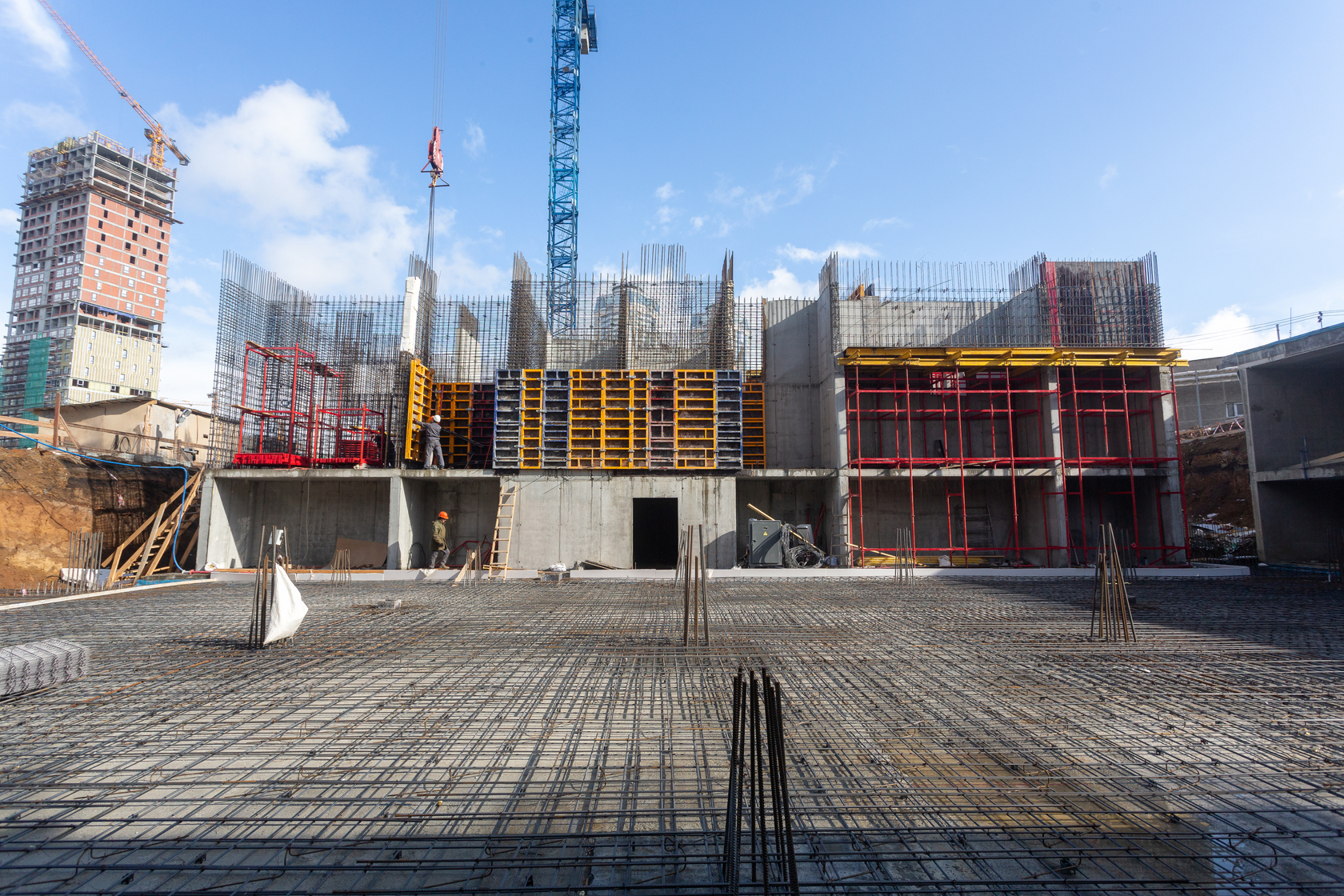 Готова фундаментная плита первого дома, возводим вертикальные и горизонтальные конструкции подземной части. Выполняем фундамент и вертикальные конструкции паркинга.