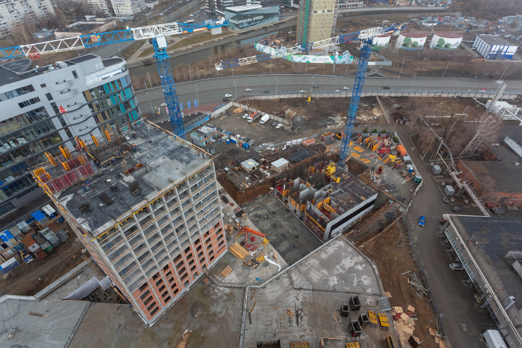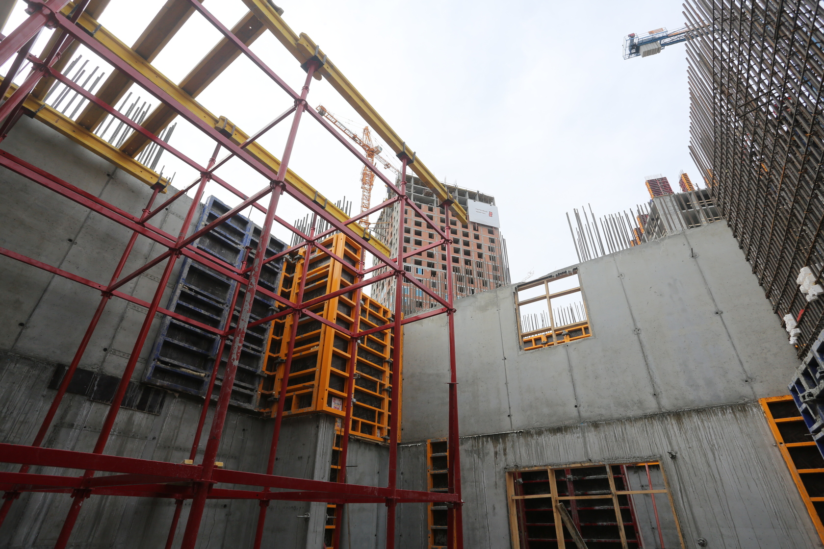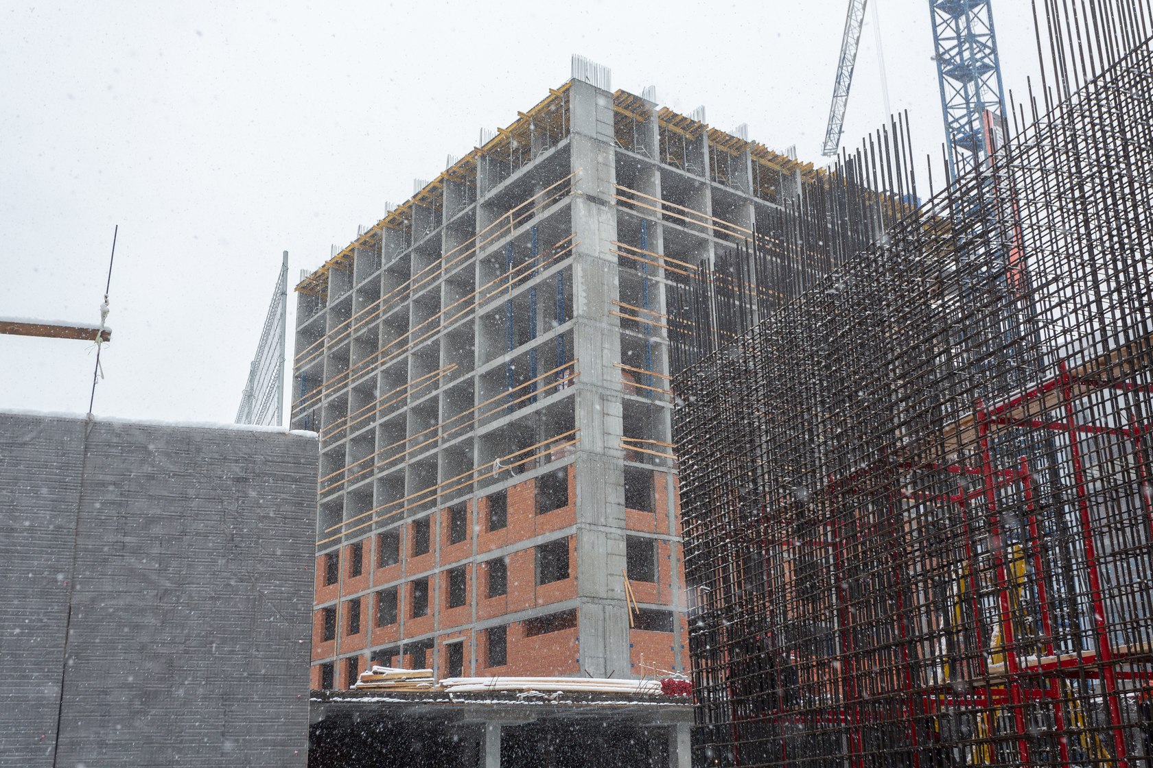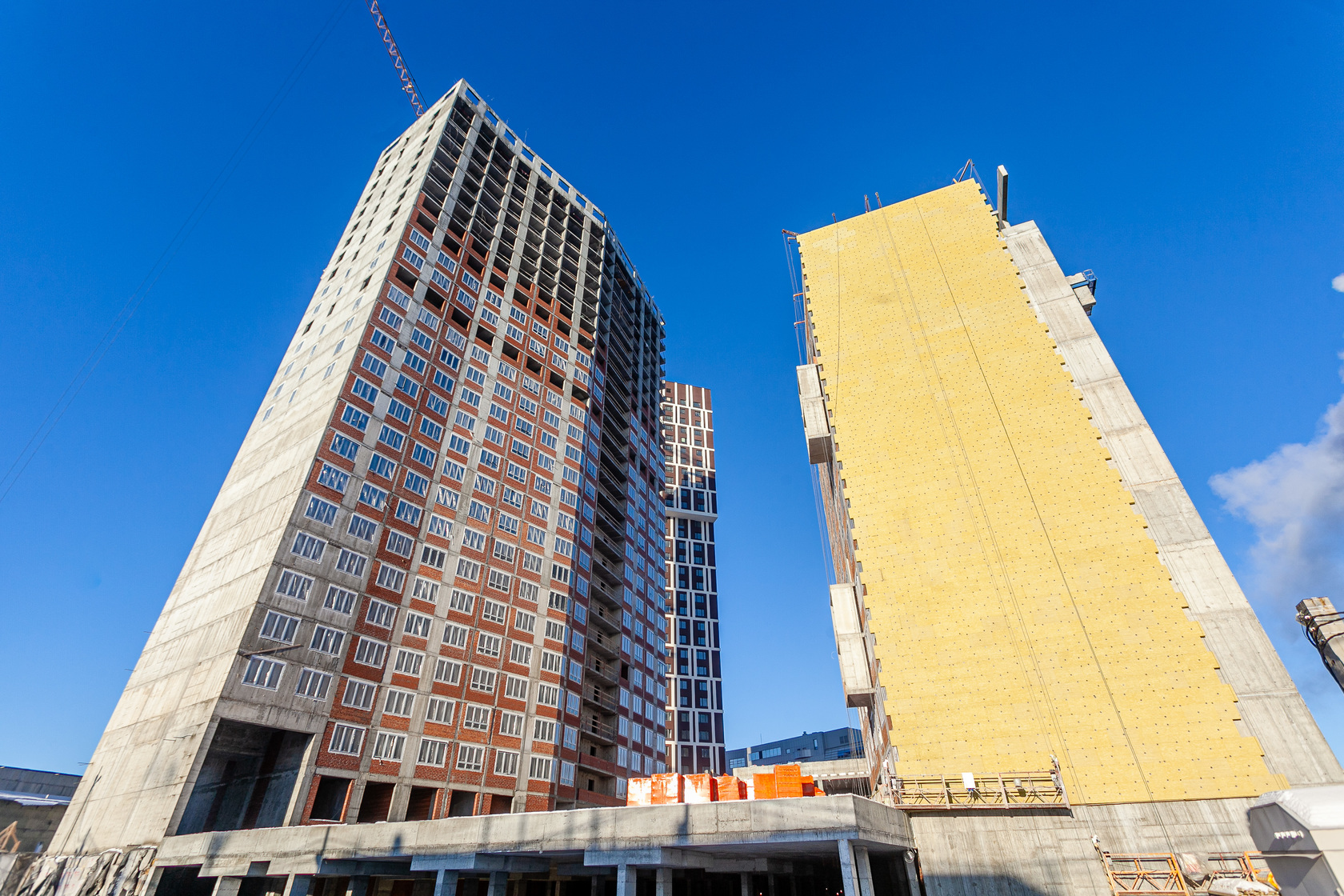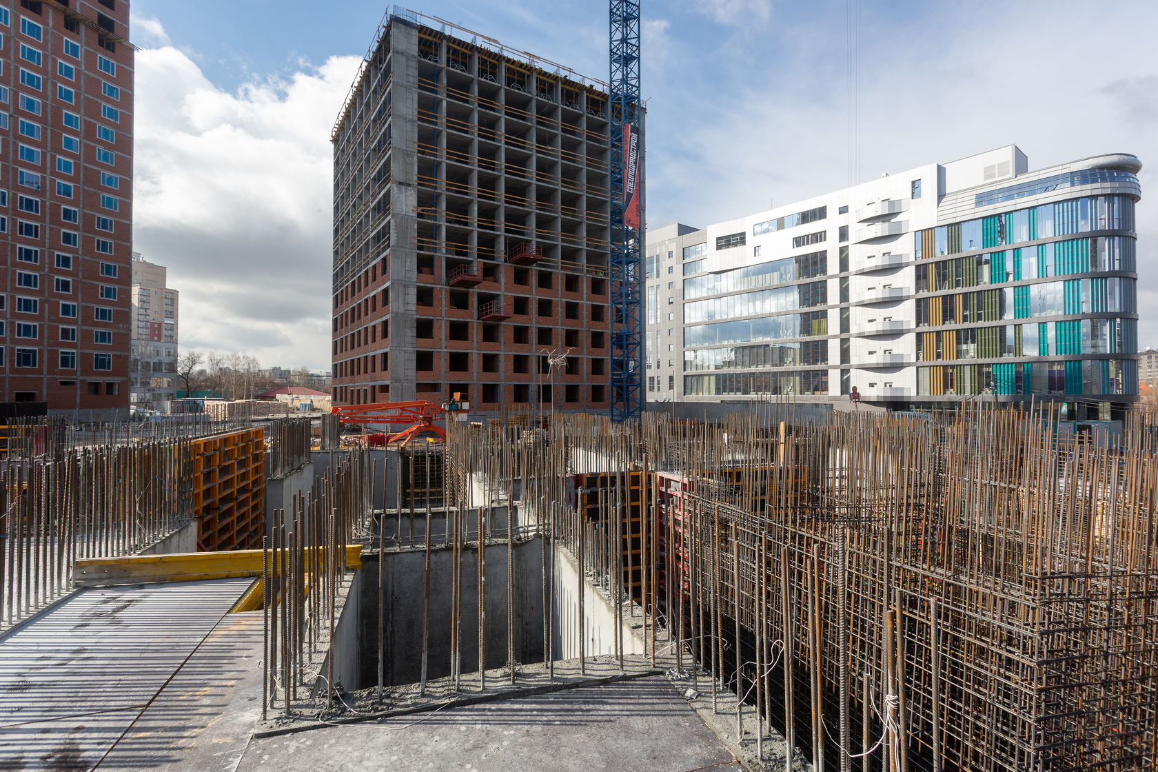 Выполняем монолитные конструкции 12 этажа первого дома. Выполняем кирпичную кладку стен на 5–8 этажах. Забито 100 процентов свай. Выполняем монолитные конструкции стен подземной части дома и стен паркинга.