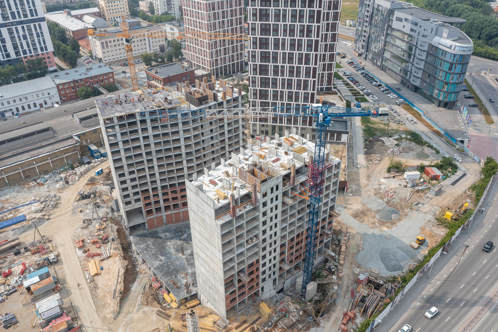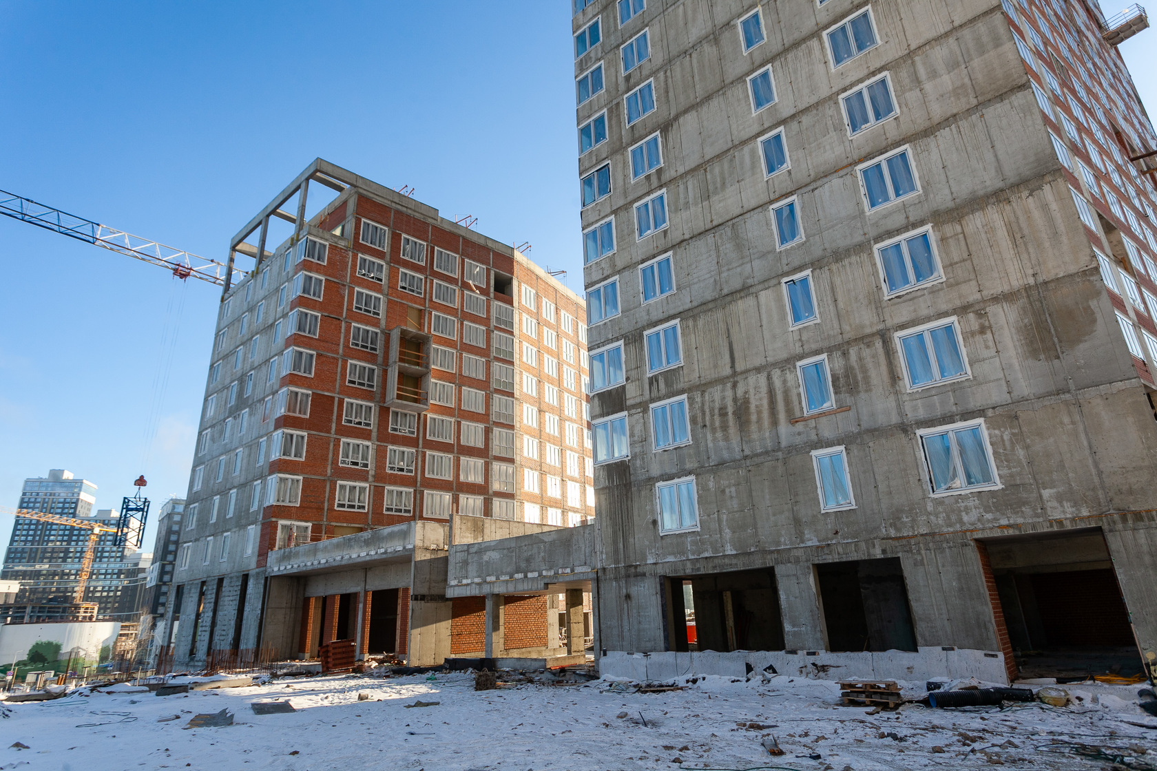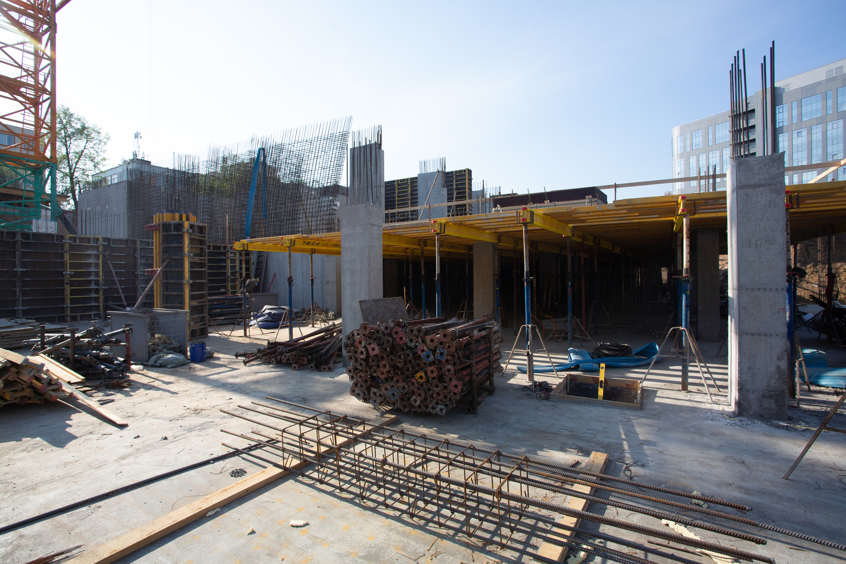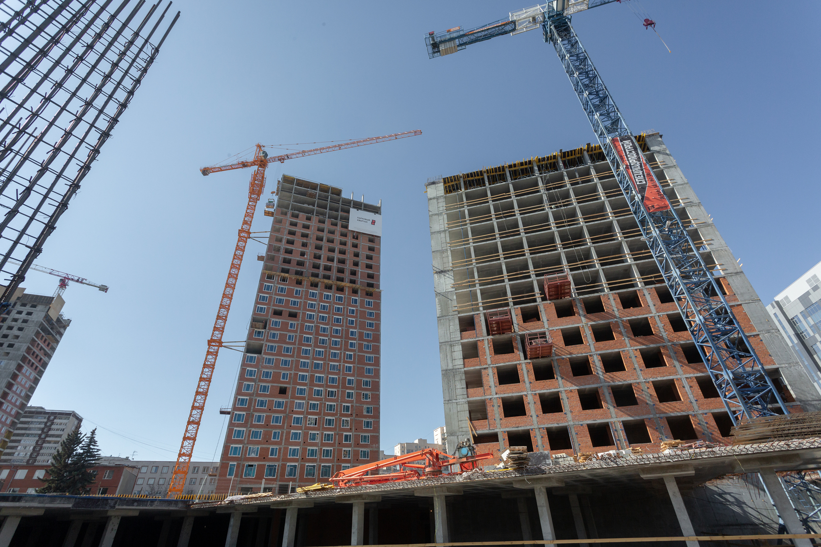 Выполняем монолитные конструкции 12 этажа первого дома. Выполняем кирпичную кладку стен на 5–8 этажах. Забито 100 процентов свай. Выполняем монолитные конструкции стен подземной части дома и стен паркинга.