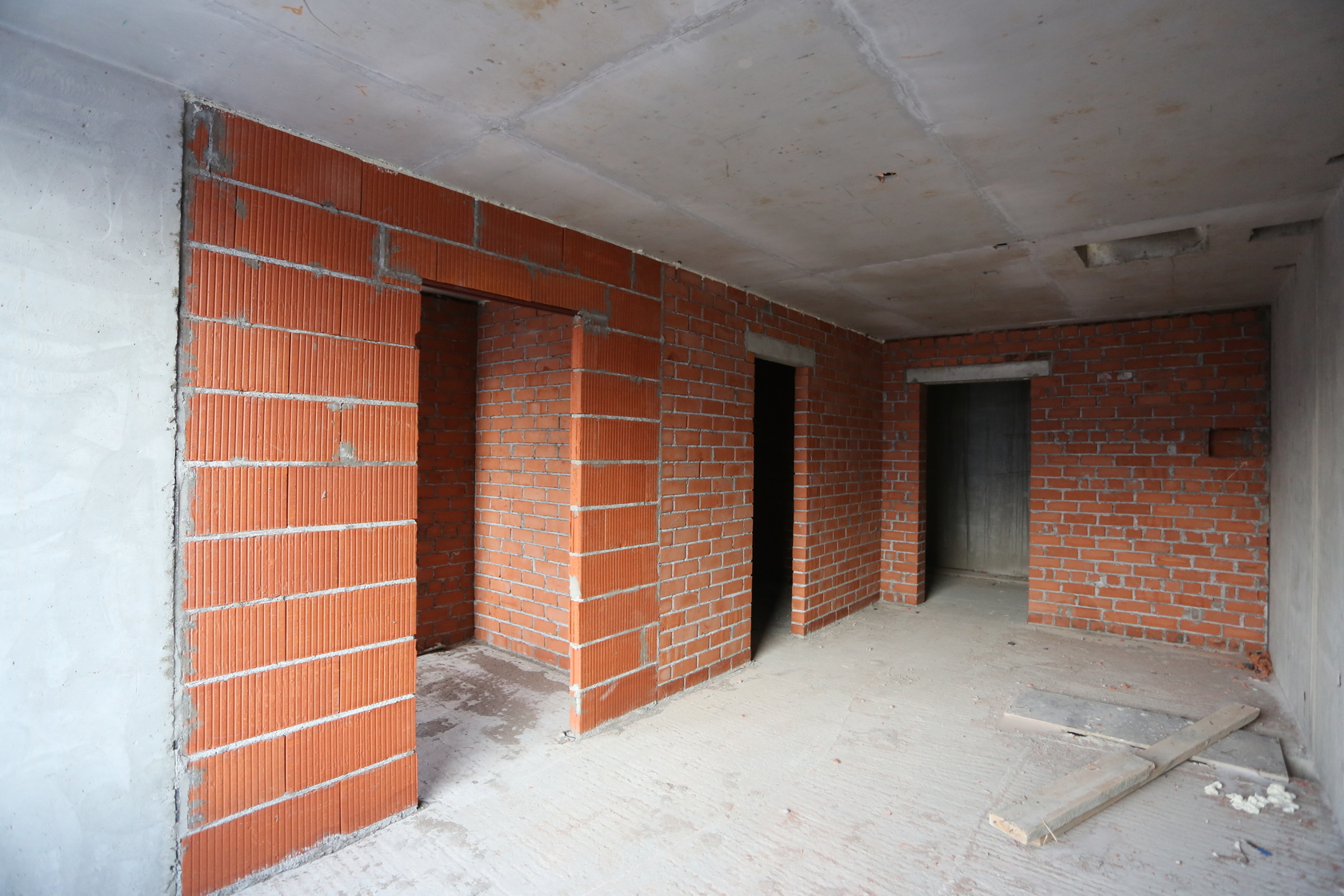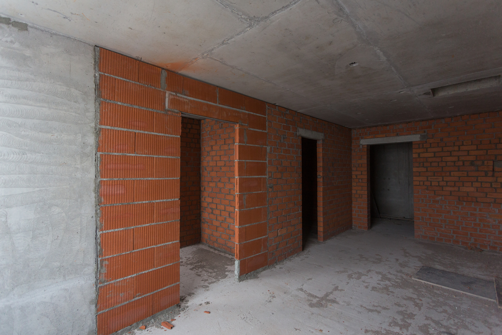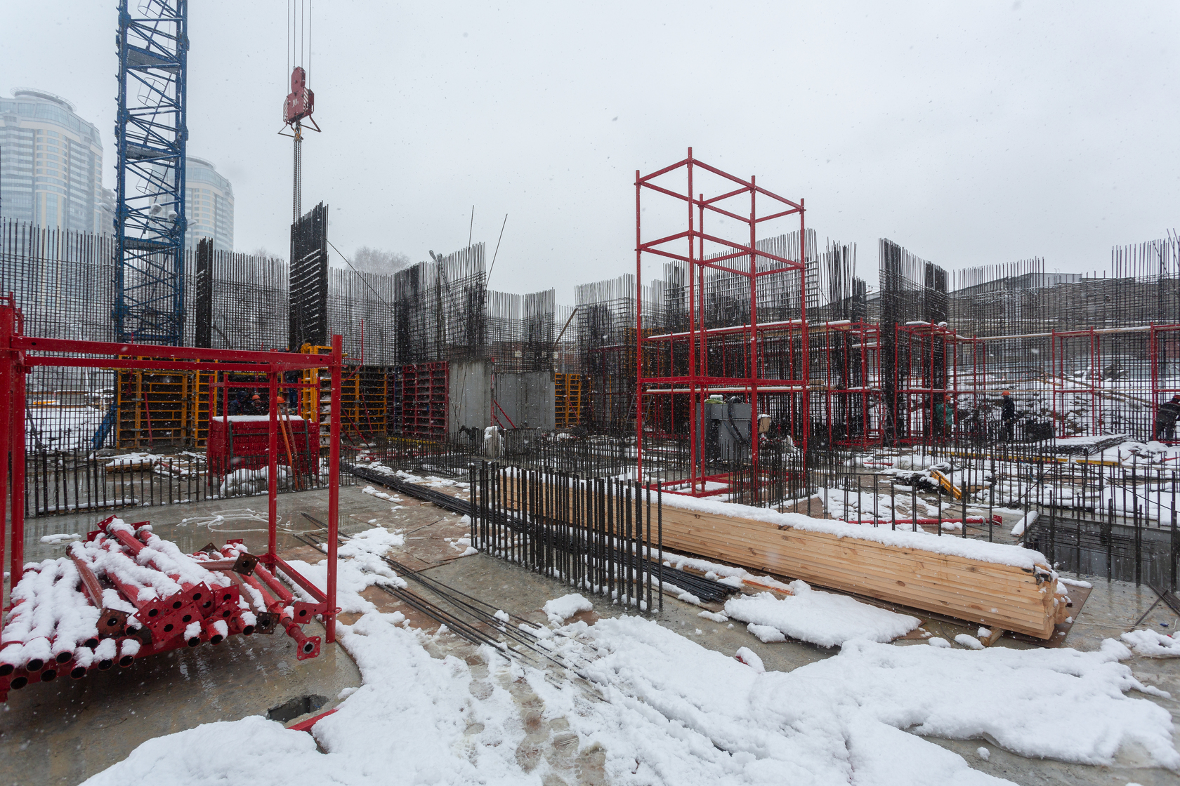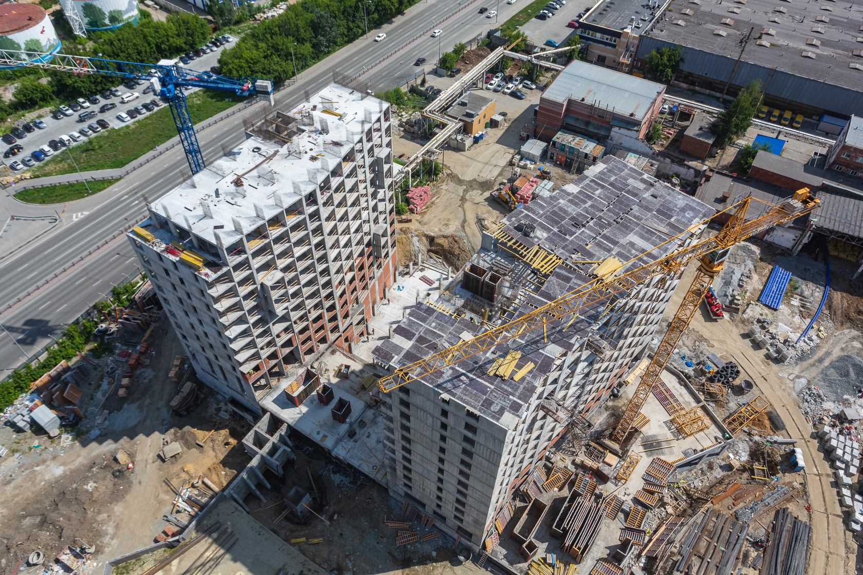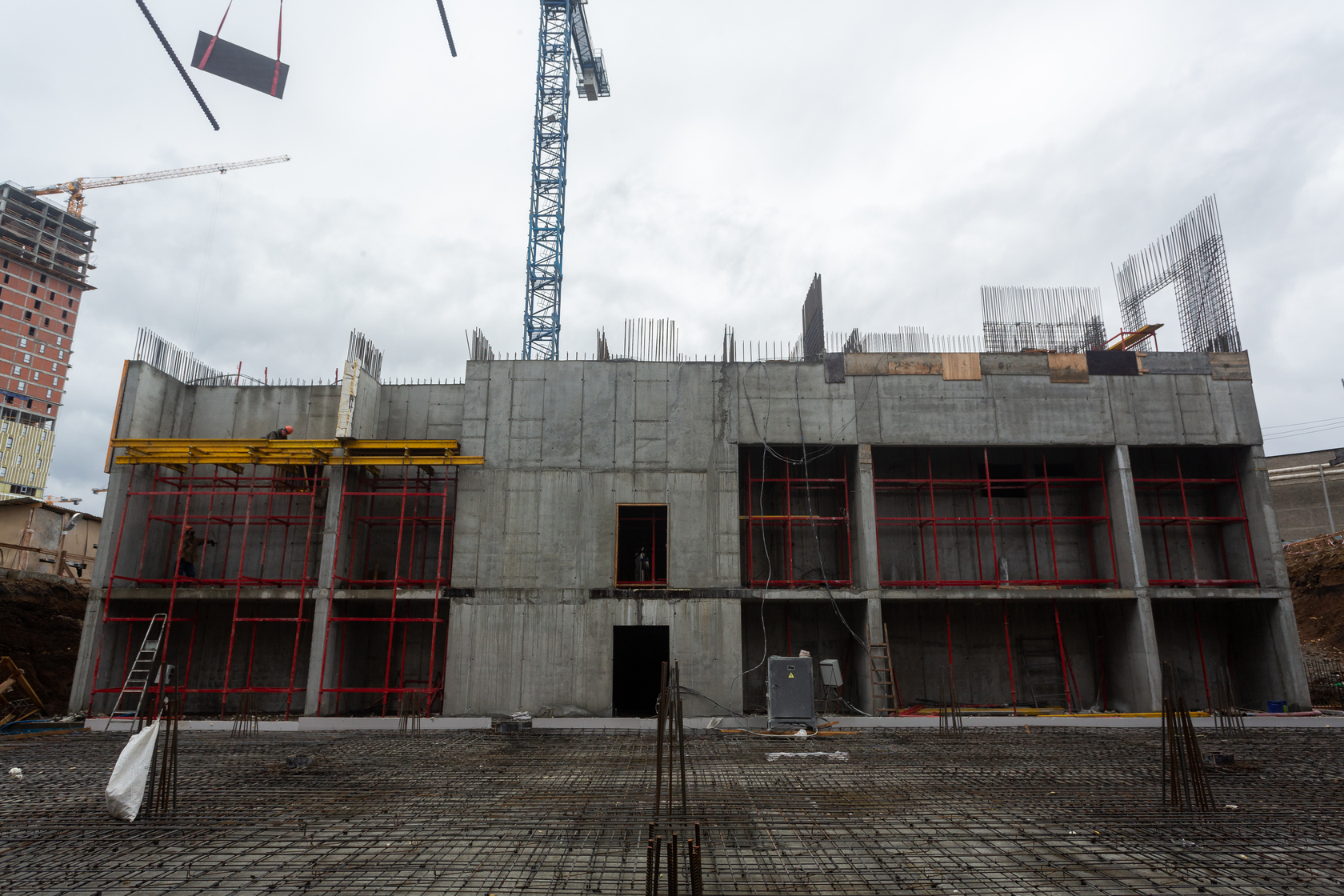 Выполняем монолитные конструкции 12 этажа первого дома. Выполняем кирпичную кладку стен на 5–8 этажах. Забито 100 процентов свай. Выполняем монолитные конструкции стен подземной части дома и стен паркинга.