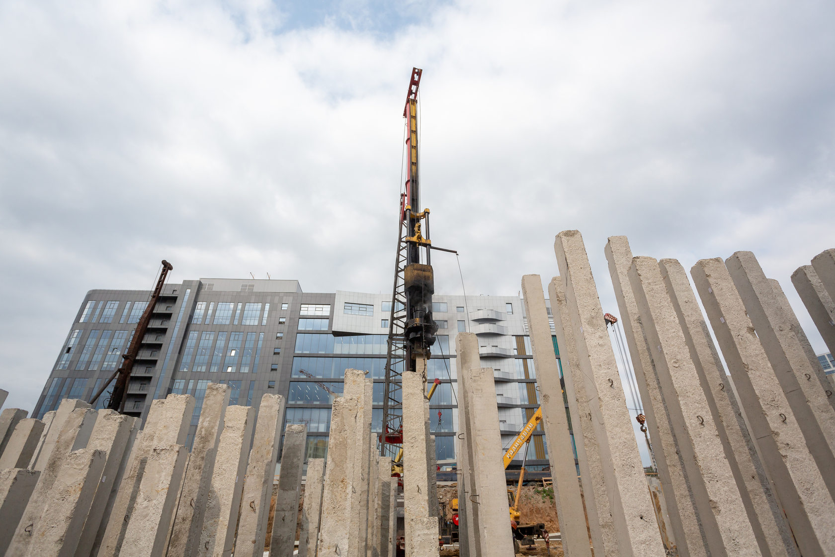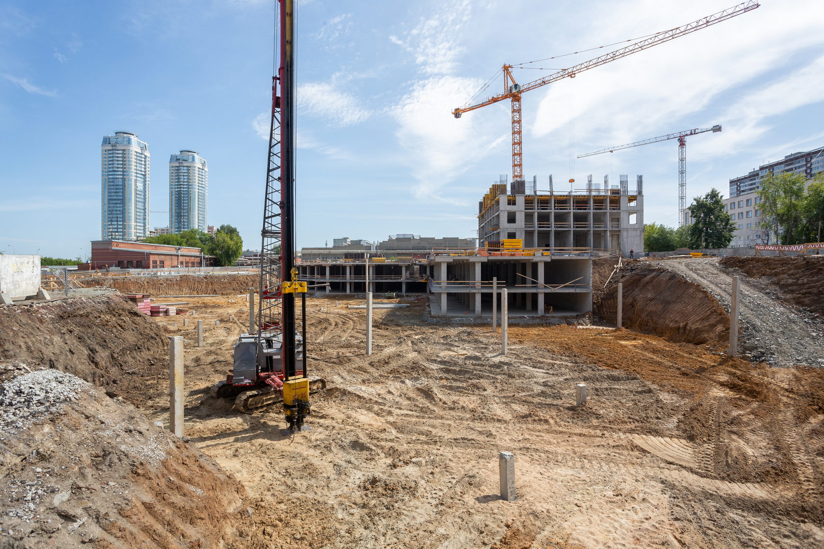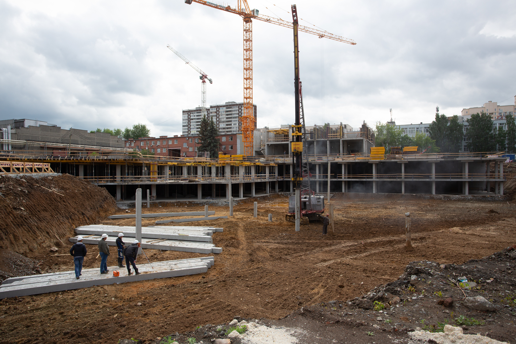 Выполняем монолитные конструкции четвёртого этажа первого жилого дома. Забиваем сваи второго жилого дома.
