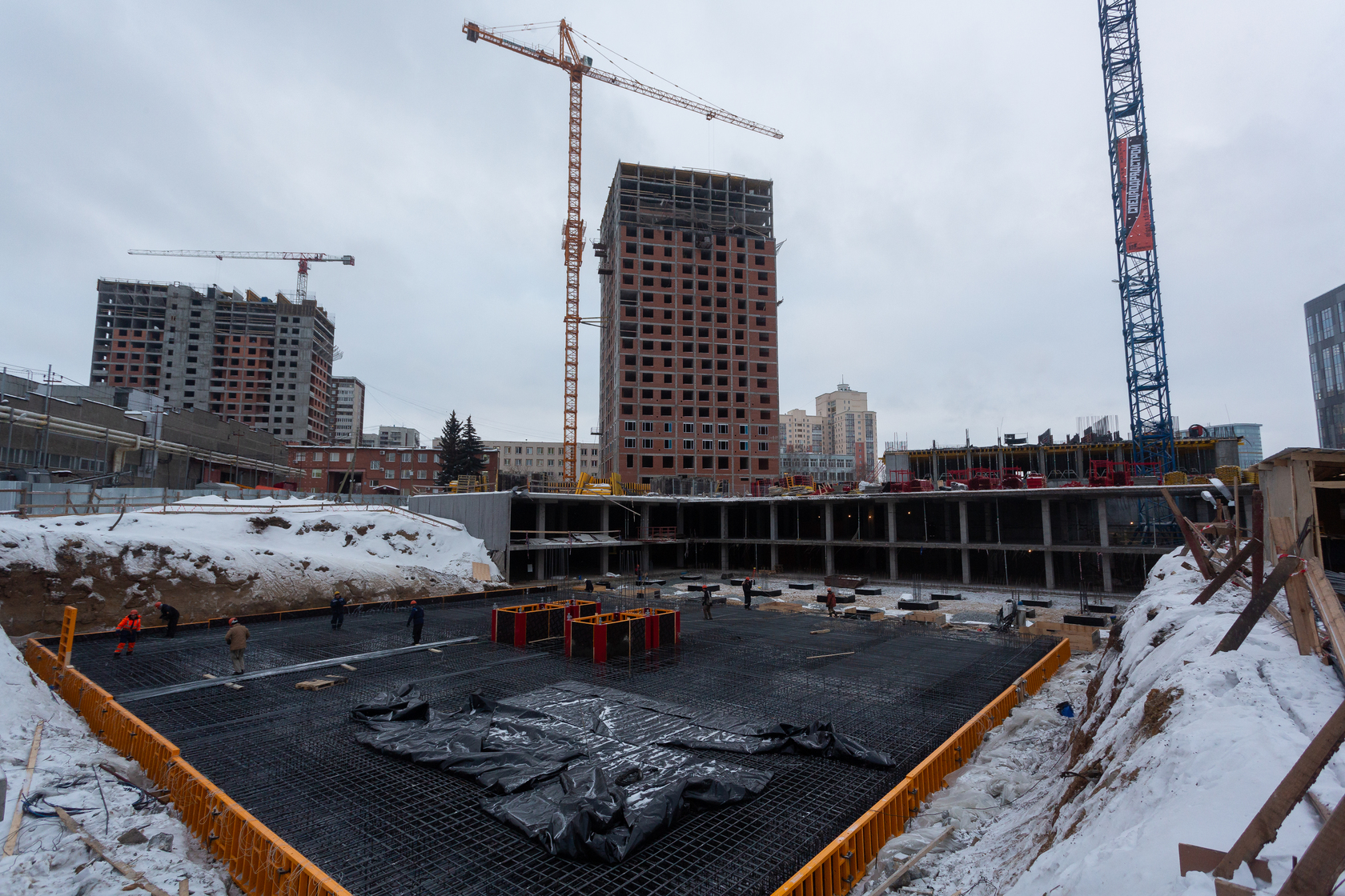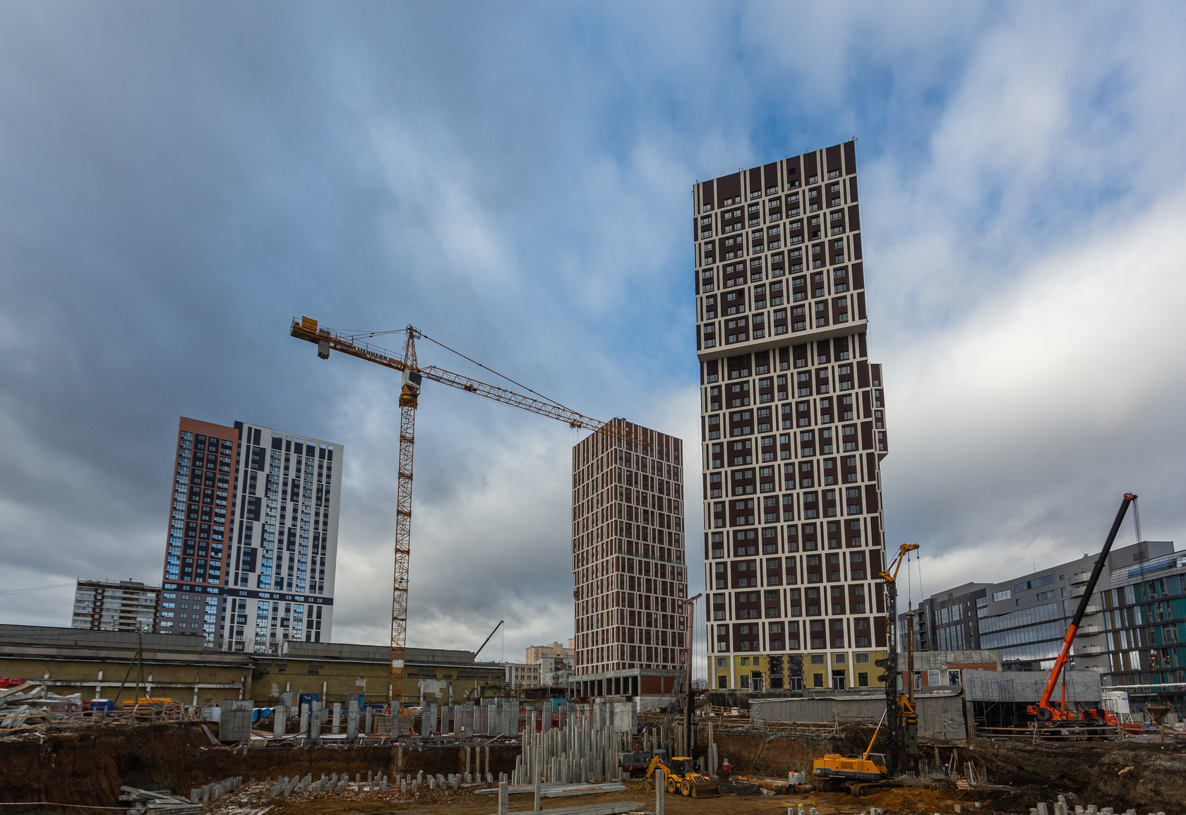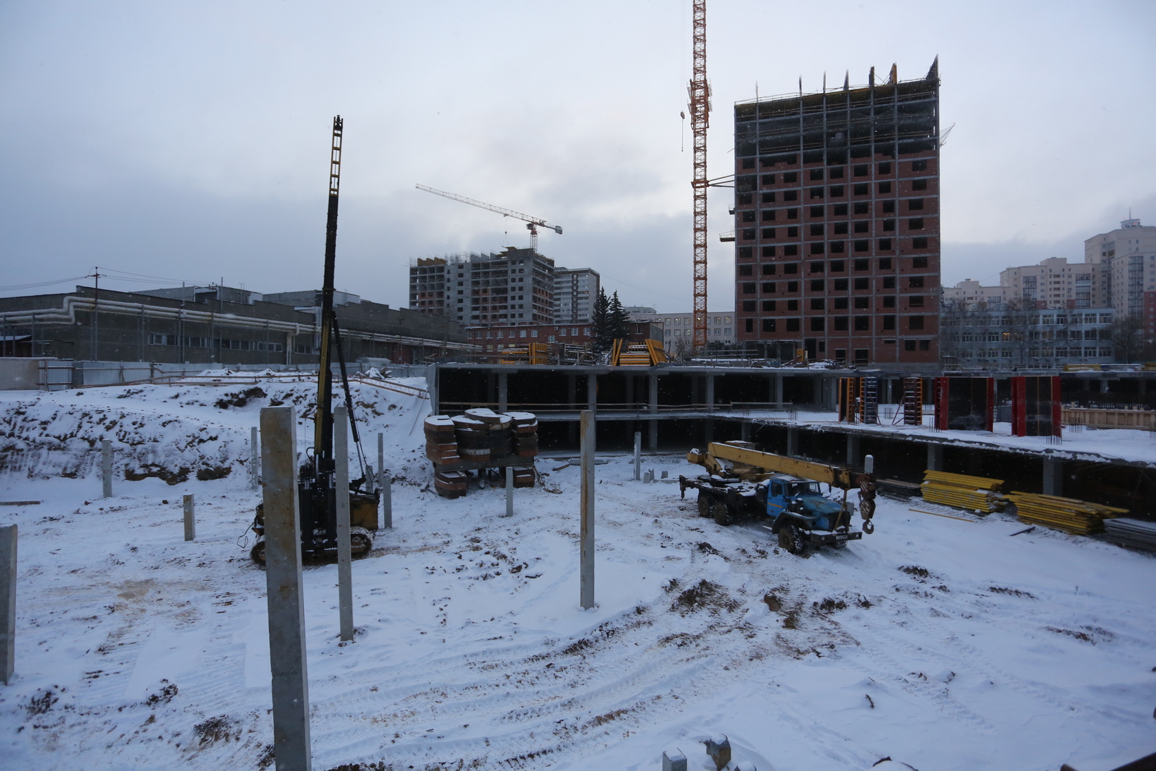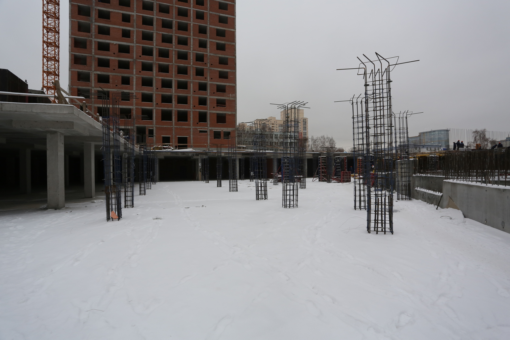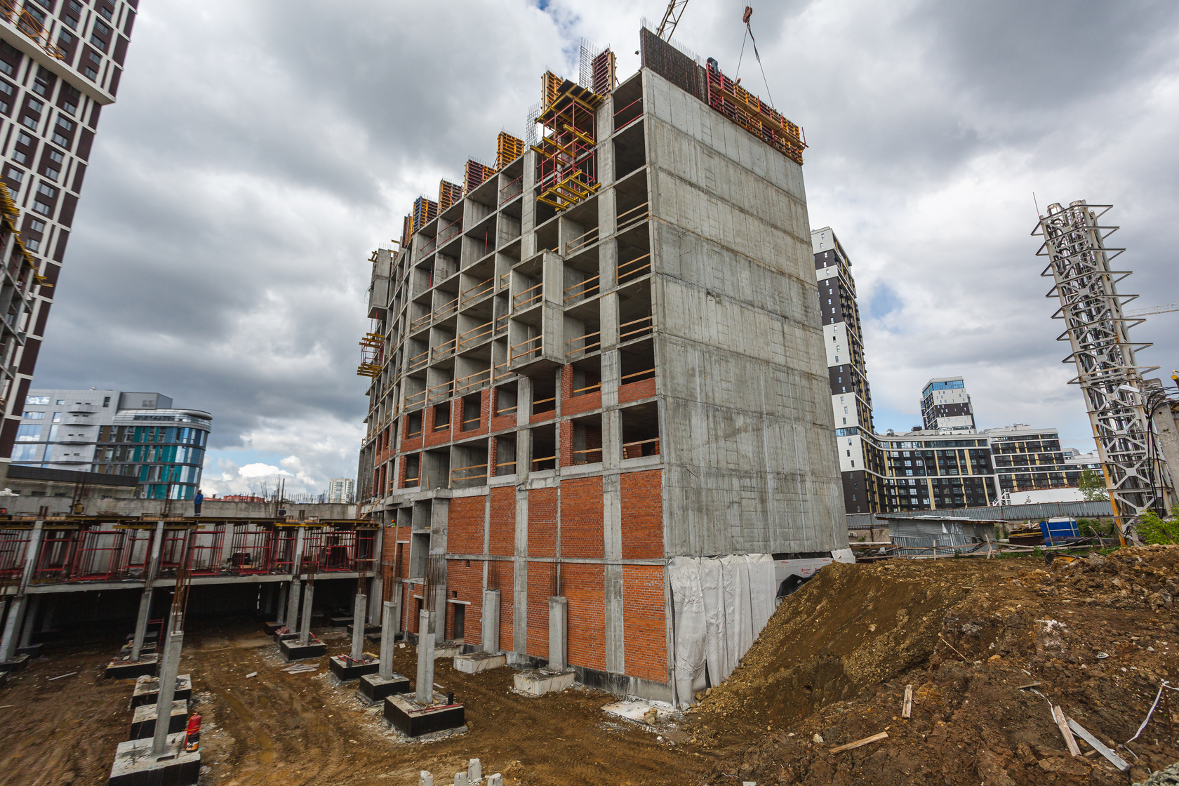 Возводим монолитные конструкции 16 этажа первого дома. Выполняем кирпичную кладку стен на 11–13 этажах. Возводим монолитные конструкции стен подземной части дома и паркинга. Выполнили котлован третьего жилого дома. Забиваем сваи третьего дома.