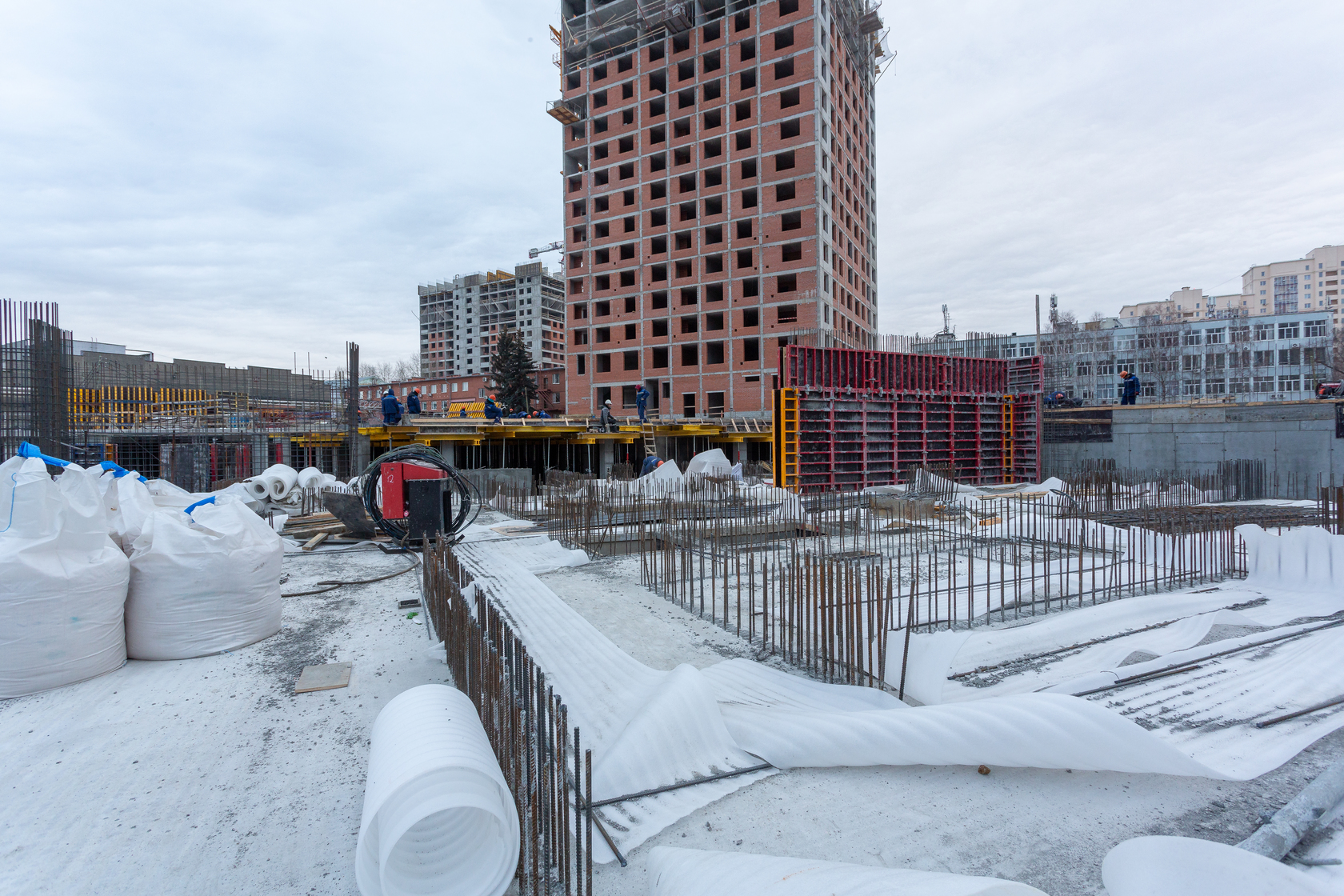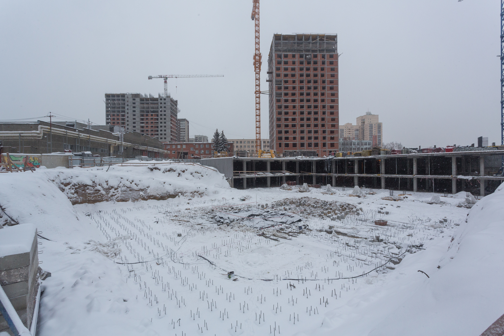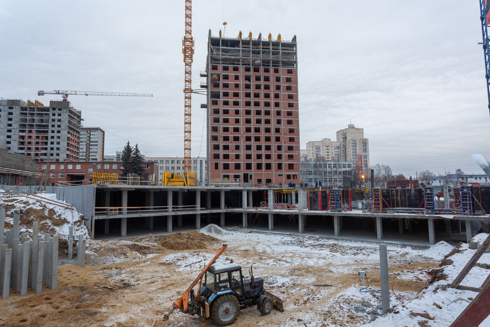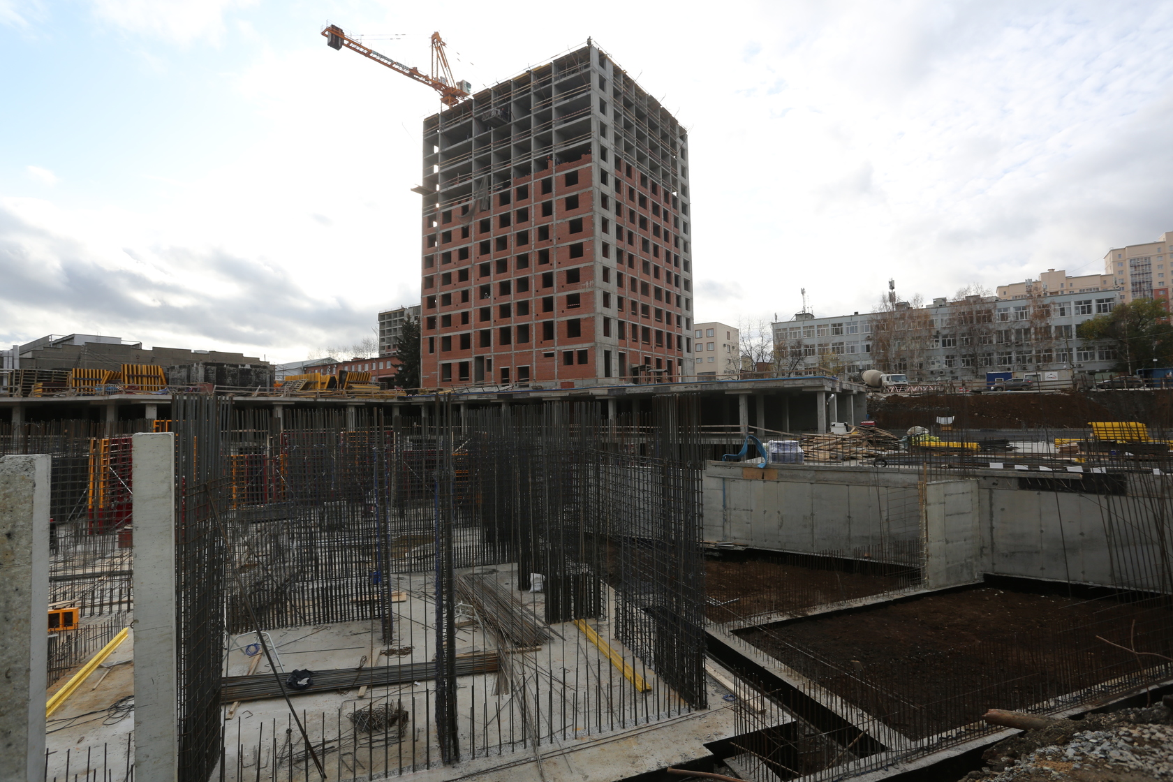 Возводим монолитные конструкции 16 этажа первого дома. Выполняем кирпичную кладку стен на 11–13 этажах. Возводим монолитные конструкции стен подземной части дома и паркинга. Выполнили котлован третьего жилого дома. Забиваем сваи третьего дома.